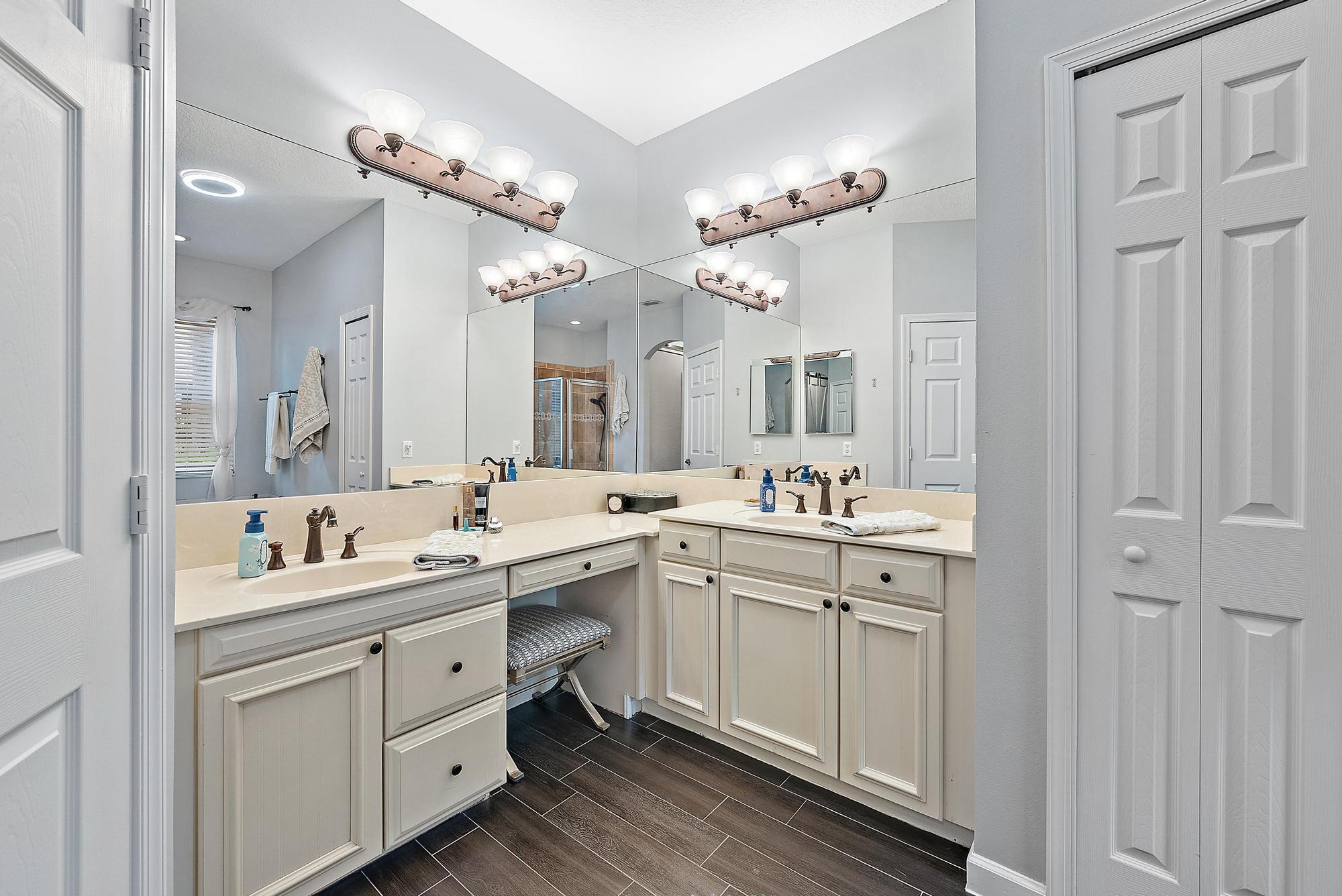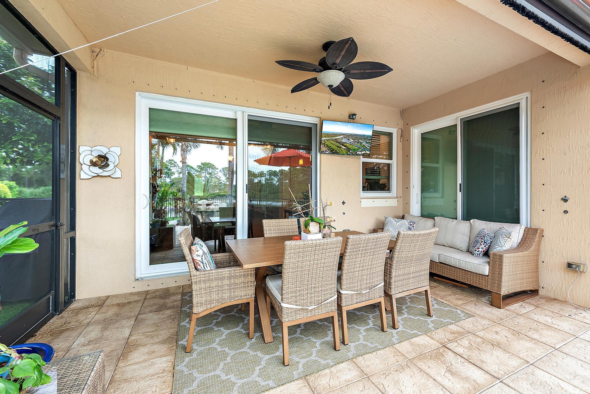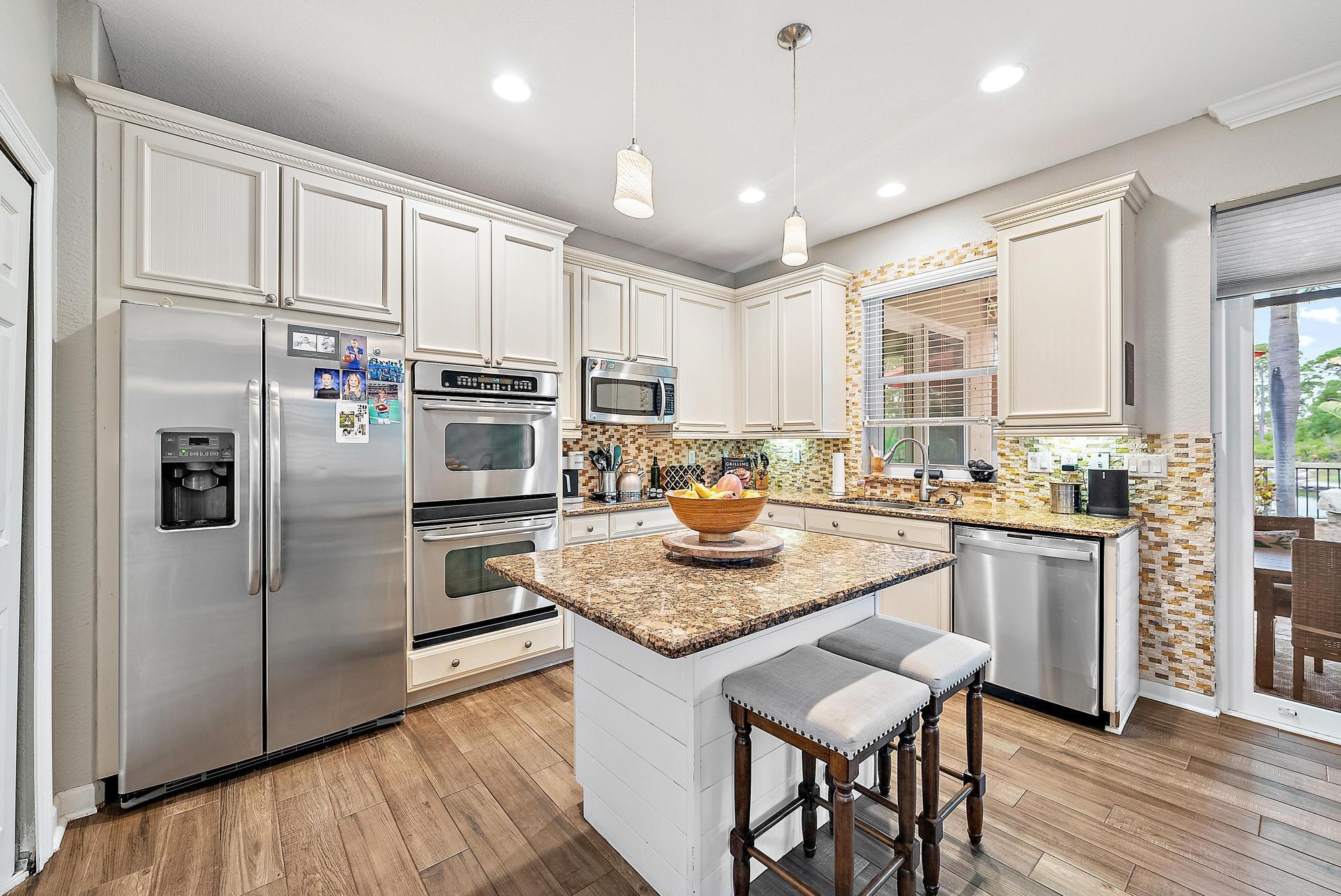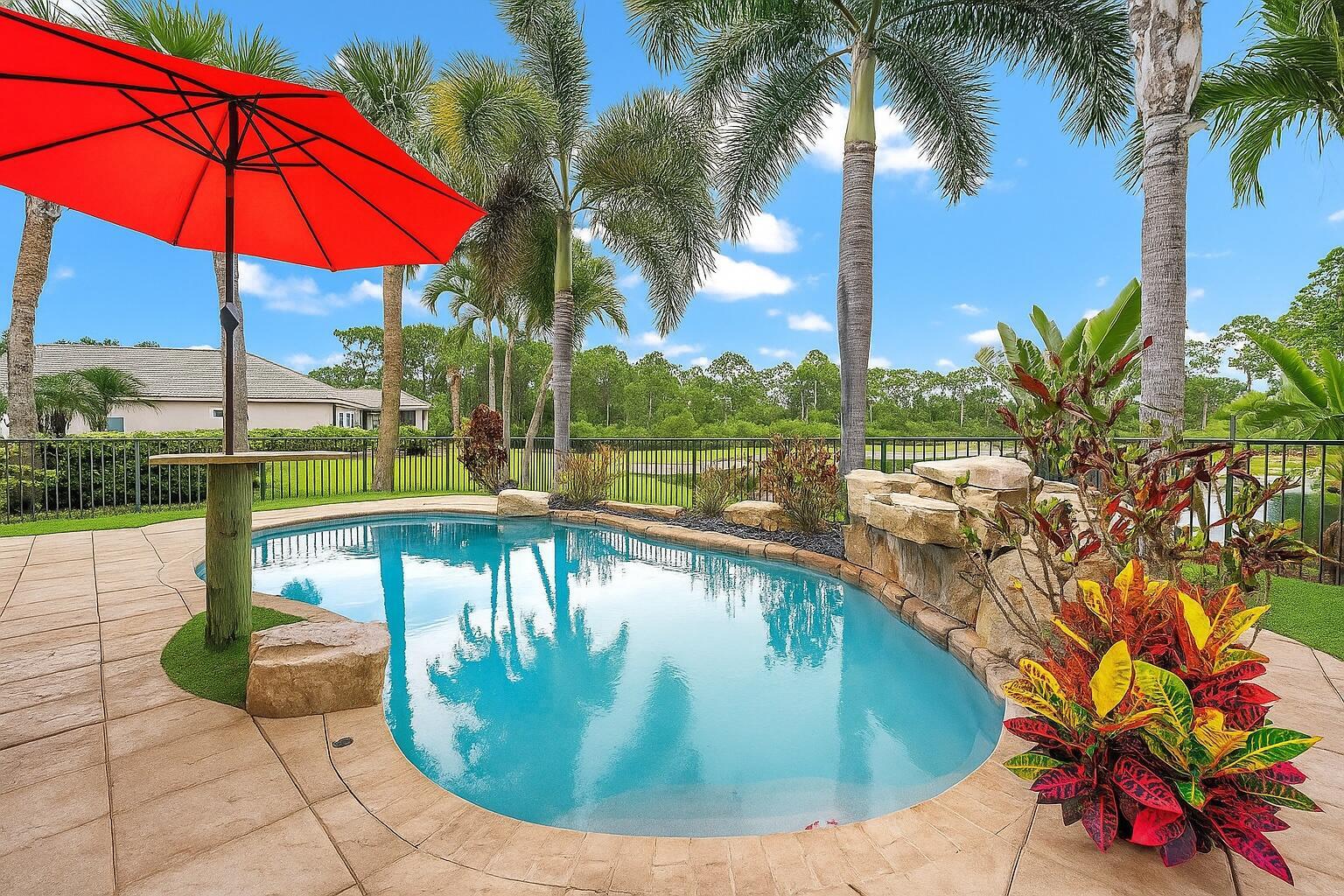Experience LUXURY living in this stunning 4-bedroom, 3.5 bath pool home located in the sought-after Oaks of Hobe Sound. This beautifully designed lakefront residence offers the perfect combination of style, functionality, and peace of mind. Step inside to soaring 20-foot ceilings and an abundance of natural light. Features include a custom electric fireplace, wood-look porcelain tile throughout the main level, and IMPACT windows. The gourmet kitchen is complete with stainless appliances, double ovens, 42'' wood cabinetry, a center cook island, granite counters, and a picturesque window overlooking the pool and lake. The first floor primary suite is a true retreat, offering direct access through sliding doors to the pool, perfect for a peaceful morning dip or evening swim under the stars.