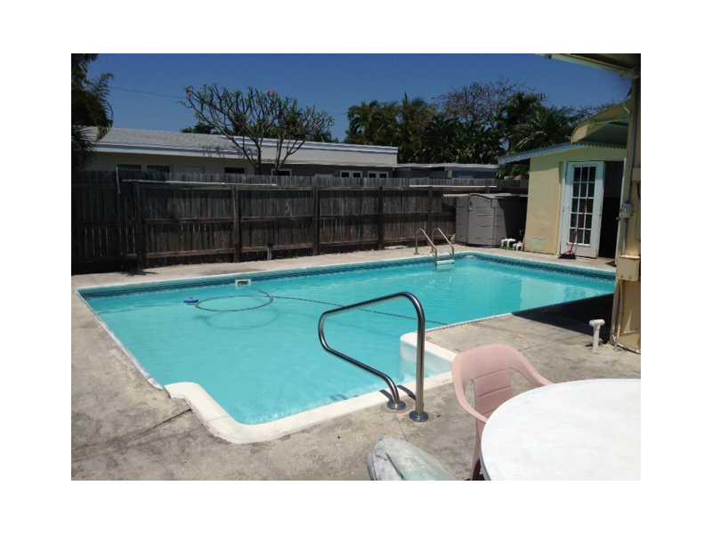 BANK ON THE MARKET - CALL LISTING OFFICE TO SHOW. Fantastic location close to Federal Hwy, beaches & shopping. Florida Charmer with circular driveway and one car carport. Open kitchen to living area. Family room has door leading to a roofed, screened in patio. Vaulted ceilings. New breaker electrical panel. Spacious yard with privacy fence and in ground pool. Separate building with water and electricity (has washer and dryer). Great opportunity to be in a fantastic neighborhood. Sold as-is.