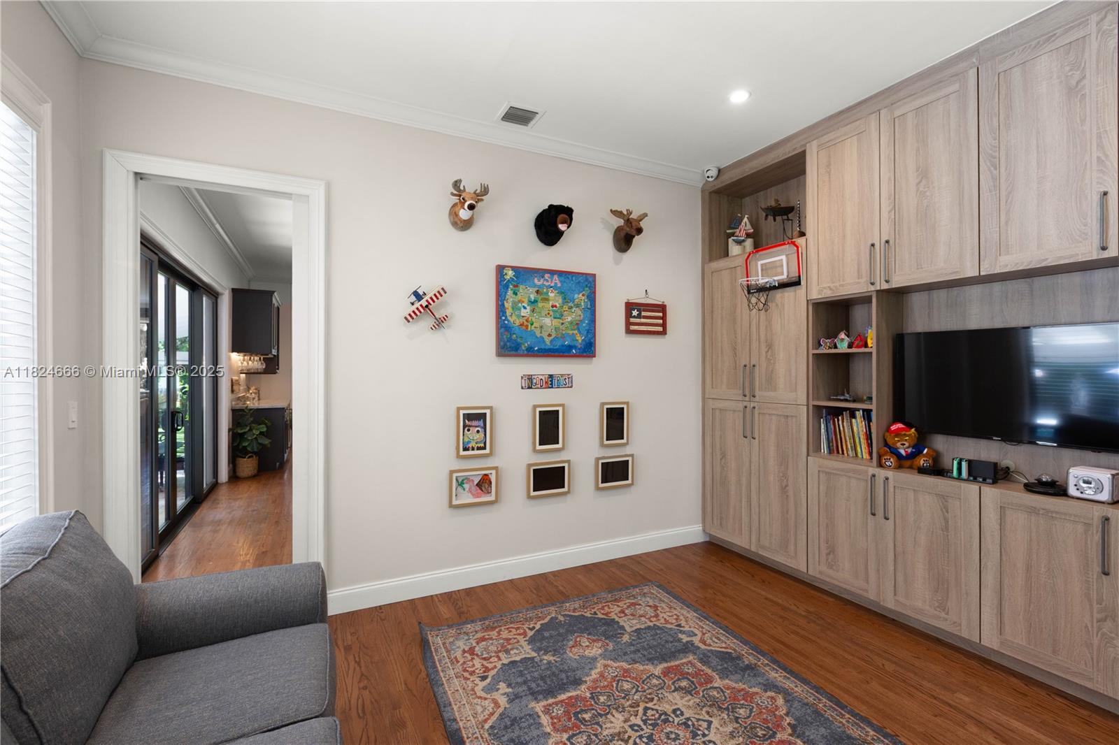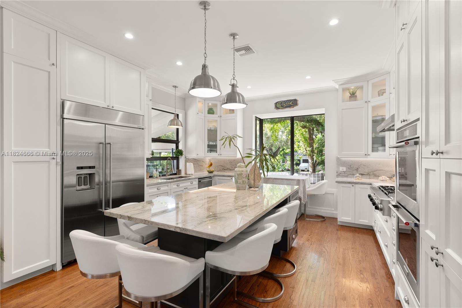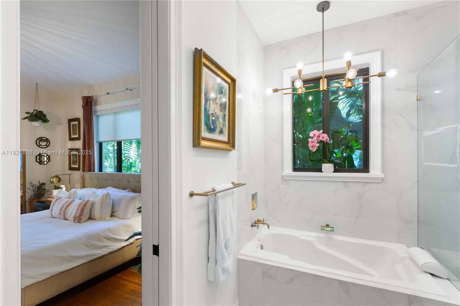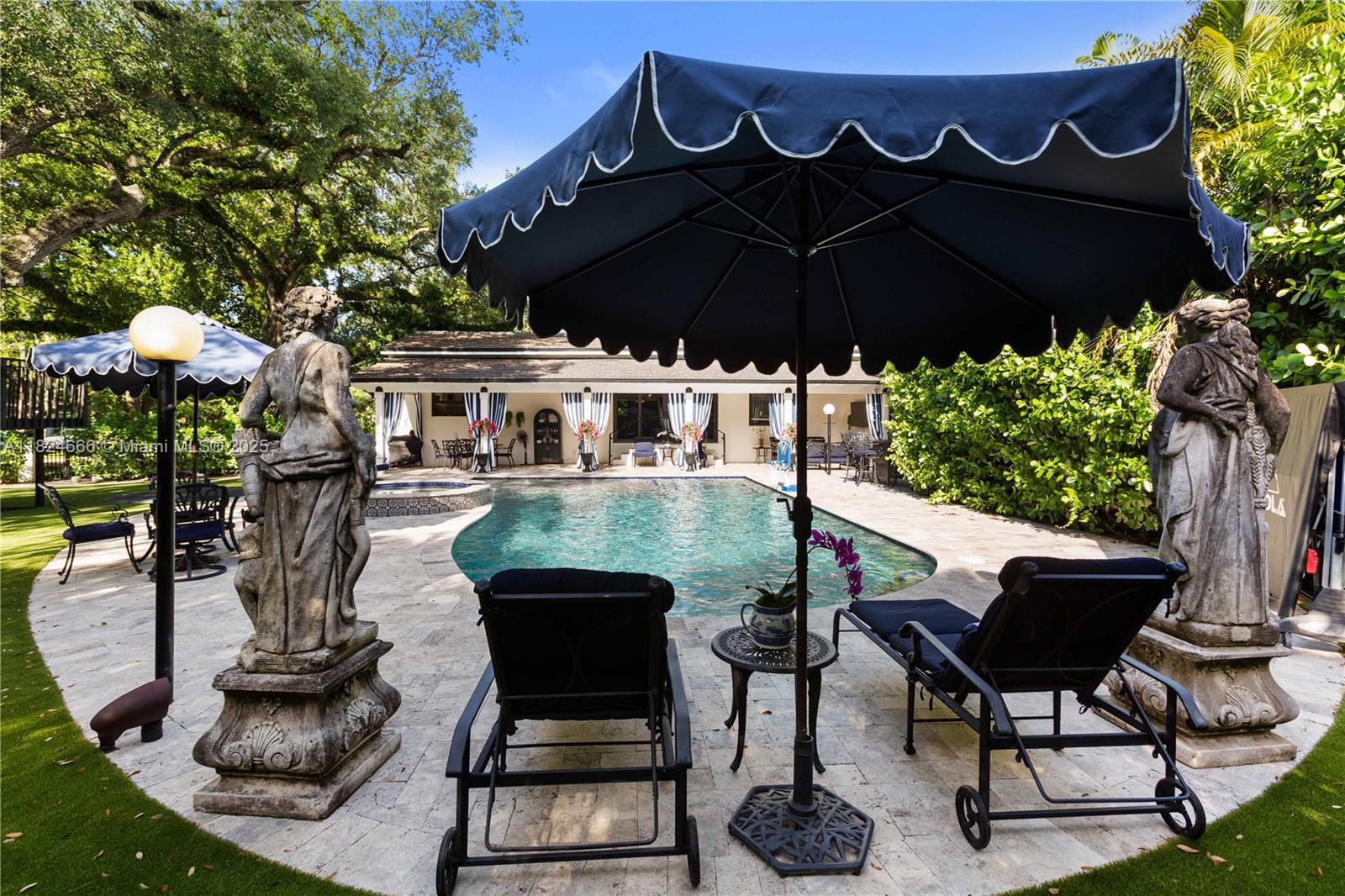 This is your chance to own and live in a Coral Gables legacy home. Nestled on almost half an acre with majestic mature oak trees, this fully renovated home features high ceilings and hardwood floors throughout. The kitchen offers high-end stainless steel appliances, a 6-burner gas stove, and natural stone tops and backsplash. The 4-bedroom/3-bath + den main house is complemented by a 1-bedroom/1-bath in-law quarters with private entrance and walkway access to parking. The primary bedroom opens to a second private patio and garden. Enjoy a heated Diamond Brite pool, hot tub, covered terrace, new AstroTurf, and Sonos outdoor speakers. All plumbing, electrical, roof, impact windows, and doors are new. Two-car garage and plenty of parking. Don’t miss this rare opportunity!