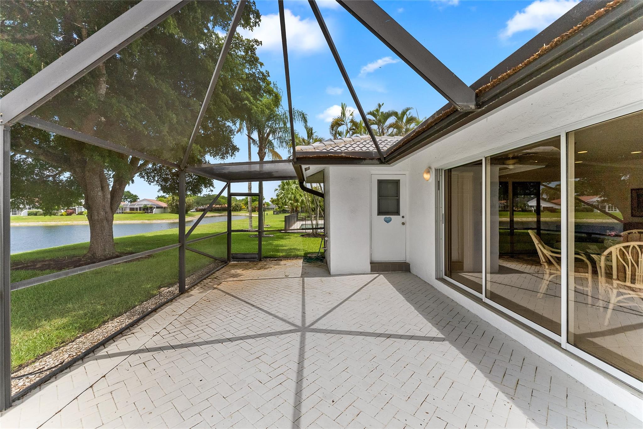Desirable split floorplan with panoramic lake and golf views in coveted Boca Woods Country Club. A prime canvas for a new buyer to renovate to suit, the home features an expansive waterfront pool and patio, grand circular drive, dedicated golf cart garage entry, and water views from all living areas and the primary suite; 17 year old roof, recently inspected by roofer and any/all tiles cracked or worn replaced with brand new tiles. 2 AC units - one is brand new, just replaced and new impact kitchen window. BWCC offers grand scale club offerings, in an intimate 645 home community. The reimagined, modern new club features two 18-hole course, spa , pickleballl, tennis, and top tier social and dining. Mandatory Golf Equity Membership of $120,000 to be paid 10 days prior to closing.