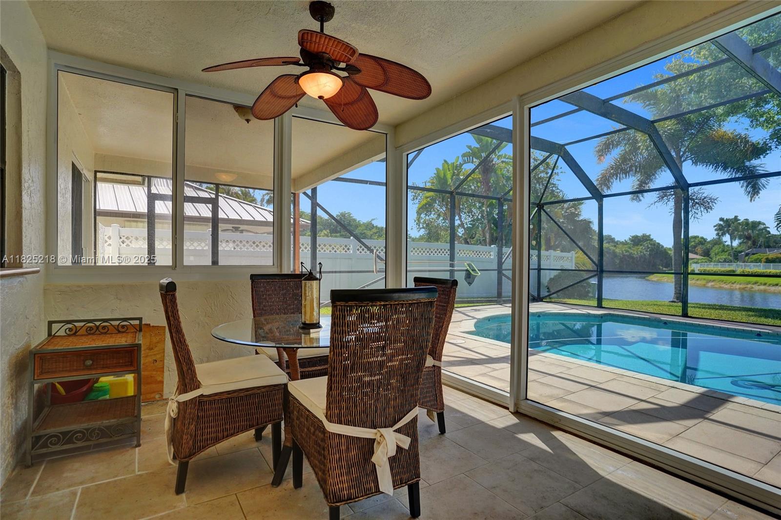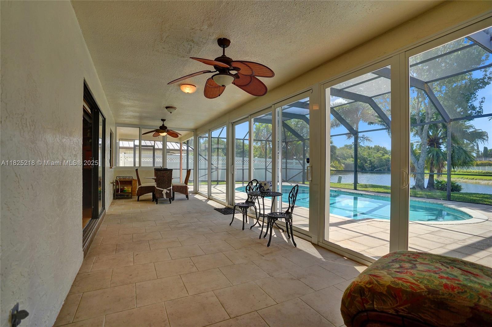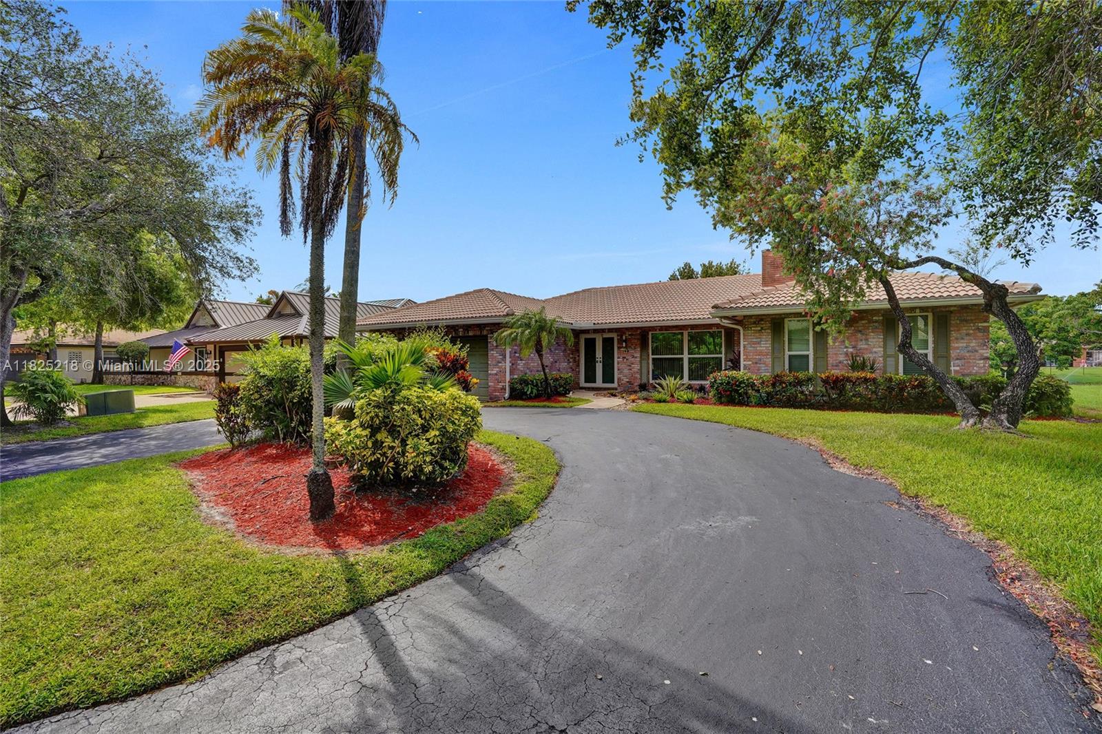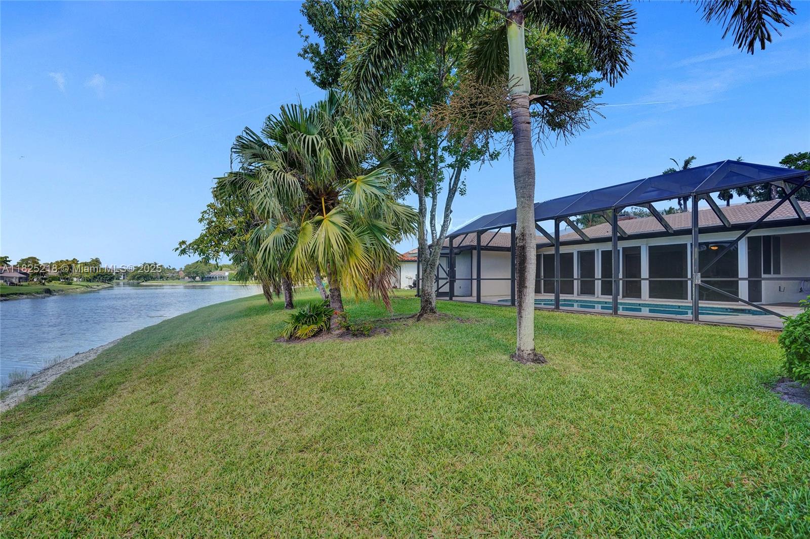 Vaulted ceilings accent open living spaces in the main living areas, built-in bookcases flanking a fireplace! Formal dining room currently used for a cozy TV space. Attractive hood over cooktop, granite countertops & full backsplash, crown molding on cabinets, stainless steel appliances! Patio off of the sitting area. The oversized laundry room includes abundant cabinets, folding space, a tankless water heater, LG washer & GE dryer. Most bedrooms with wood floors & one used as a office is tiled.The primary suite featuress a walk-in closet & updated bath. Enjoy serene triple water views across from a park off of the screened-in pool with a beautifully tiled deck & cabana bath access. Enclosed sunroom! Full impact windows, tile & wood flooring. Circular drive this must-see home with no HOA!