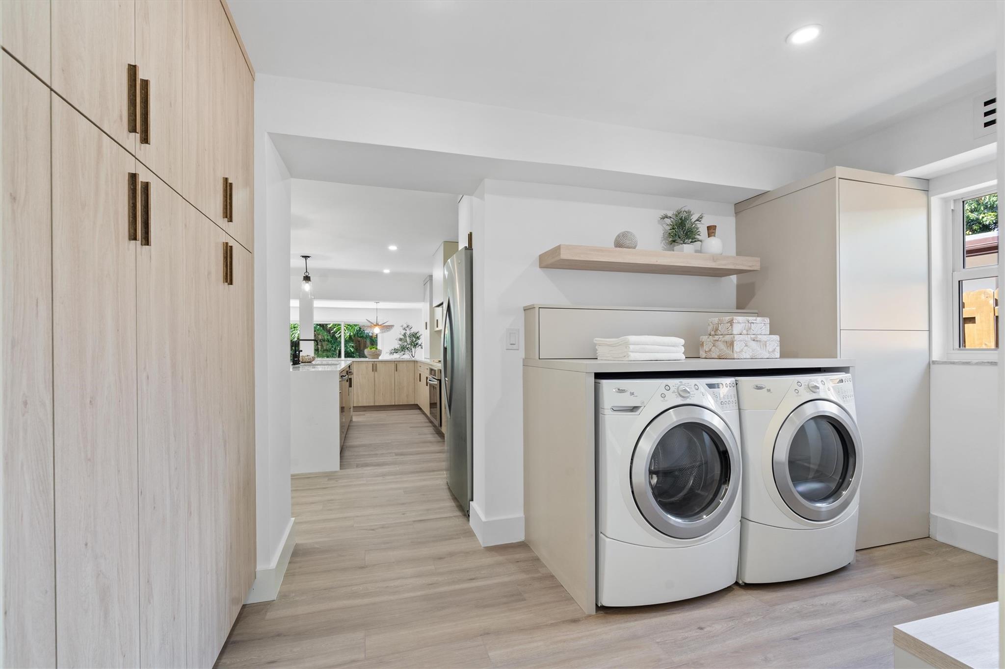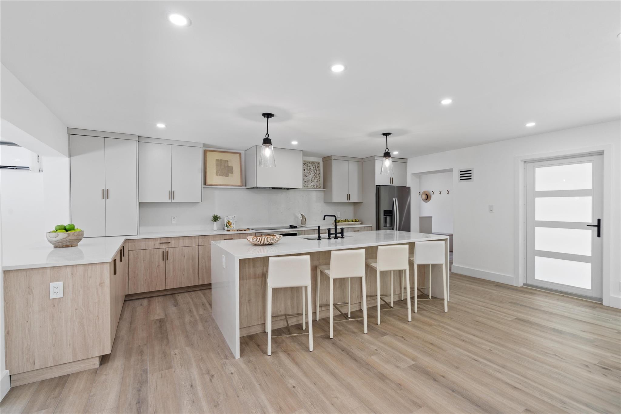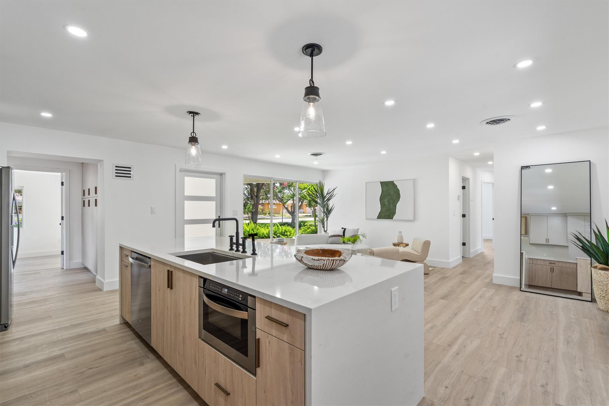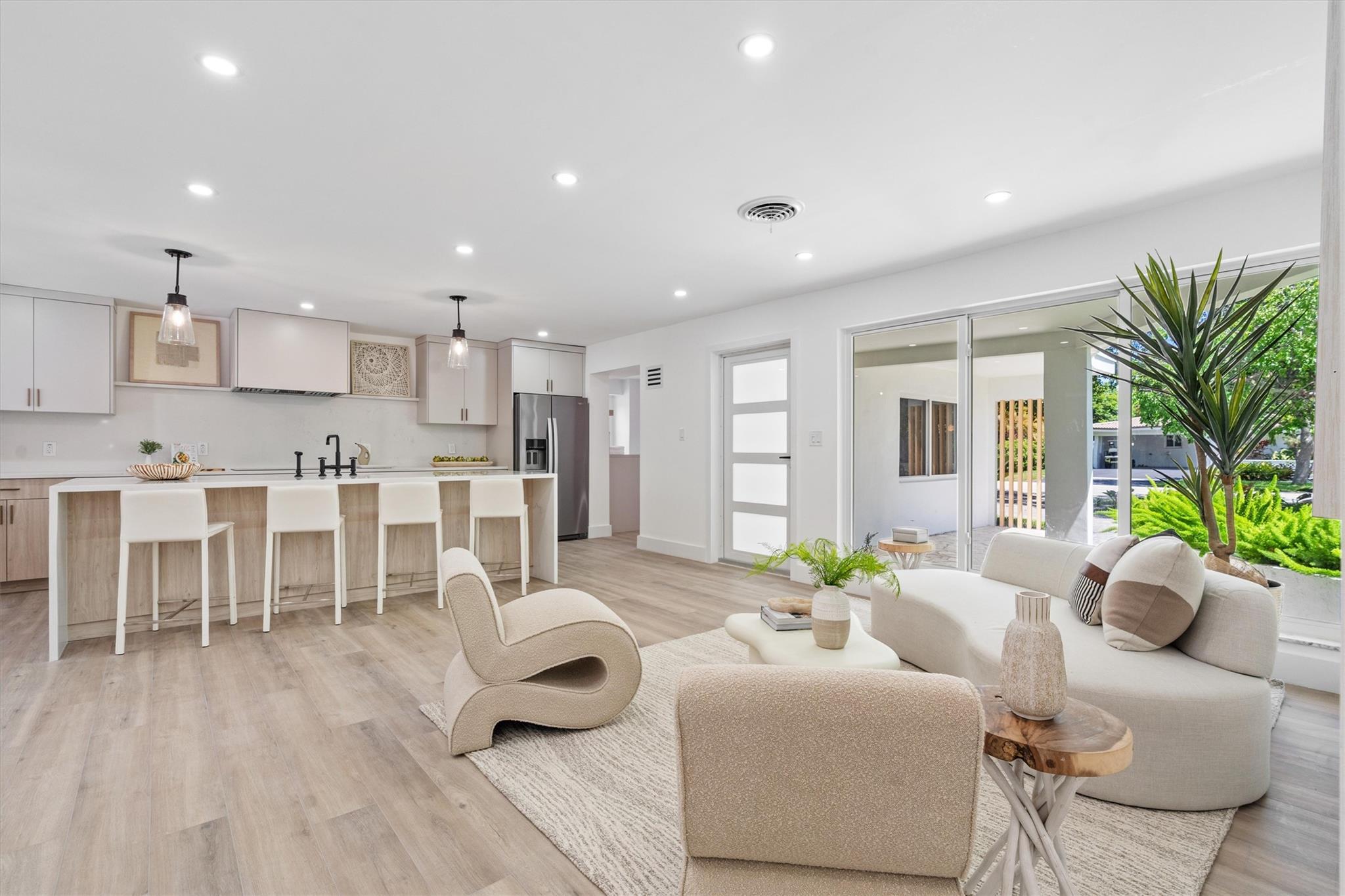 A thoughtfully renovated mid-century modern home with a bright, breezy South Florida aesthetic. This stunning property offers exceptional curb appeal and a professionally designed interior. The spacious, open-concept kitchen was expanded to include a large island and custom cabinetry—ideal for entertaining. Beautiful new impact sliding doors lead to a generous back patio and landscaped yard. Enjoy peace of mind with a new roof, new A/C systems, and all-new impact windows and doors. Every inch of this home has been carefully reimagined for comfort, style, and everyday living. Highly Rated Public & Private Schools - Minutes To Restaurants, Beach, Shopping, & Hospitals.