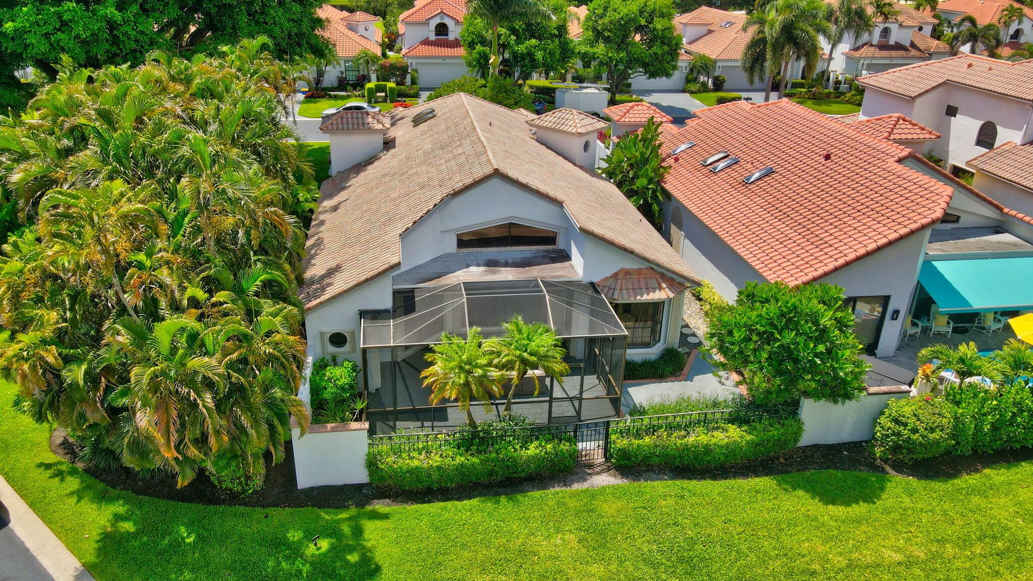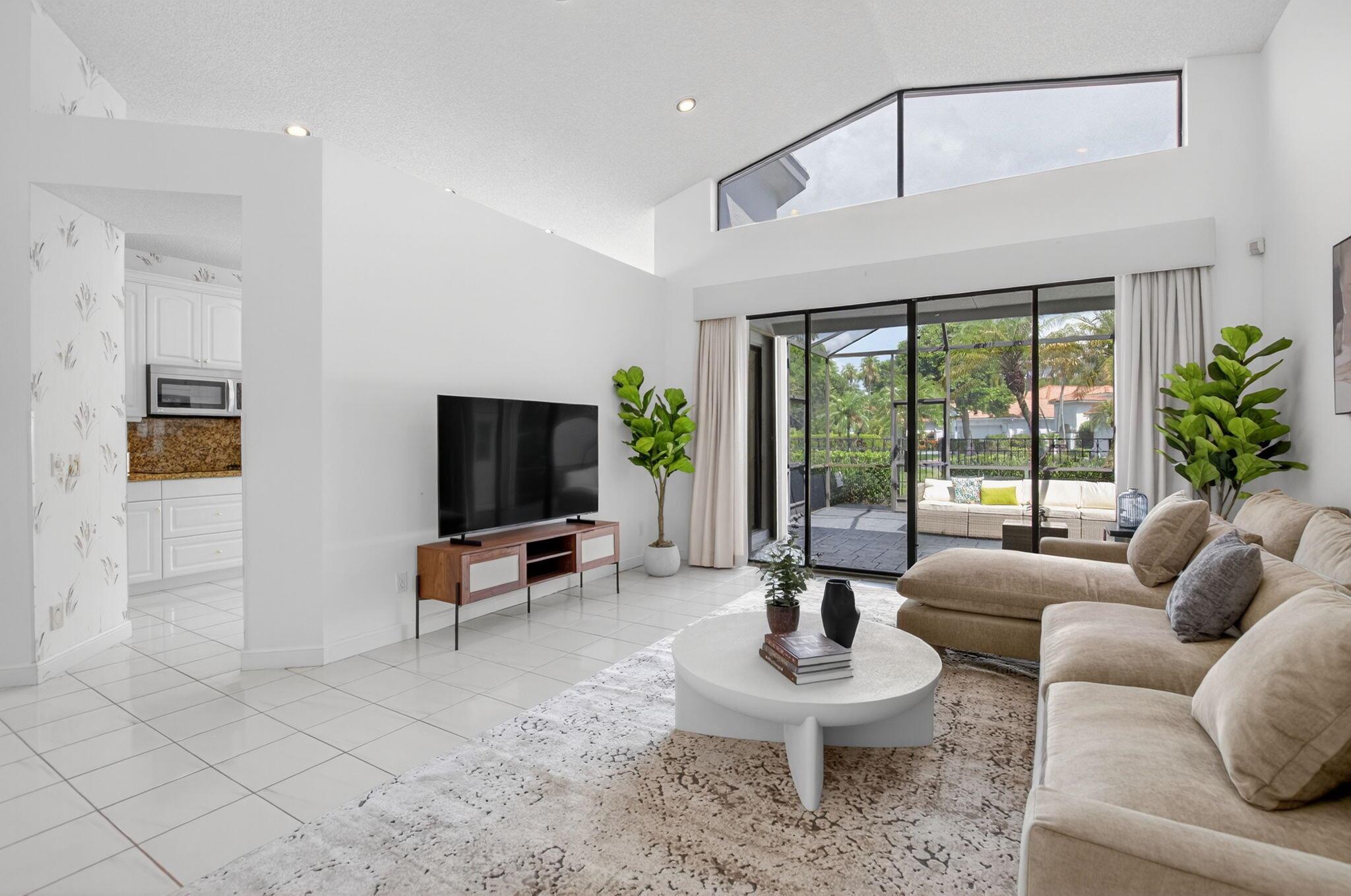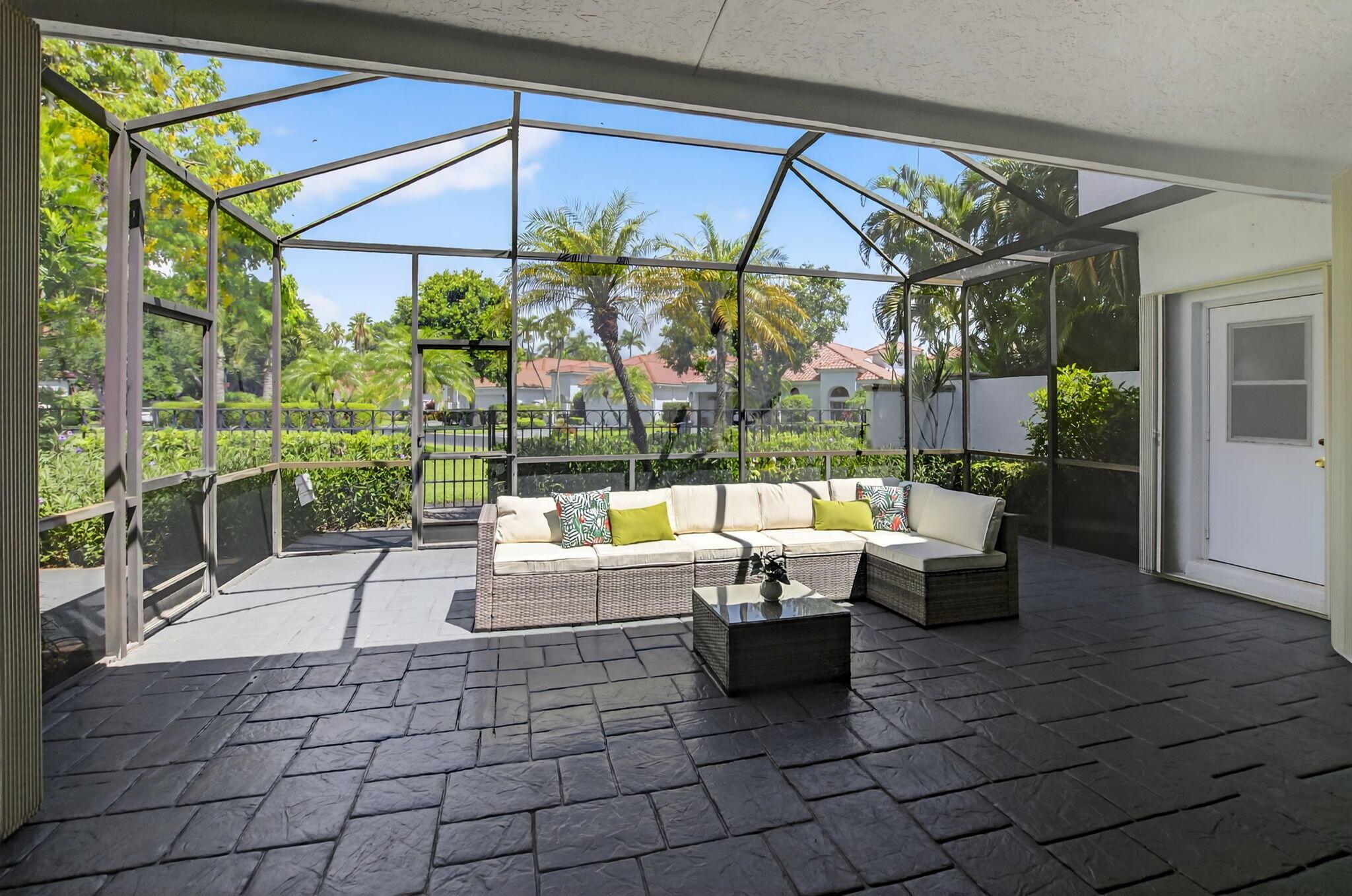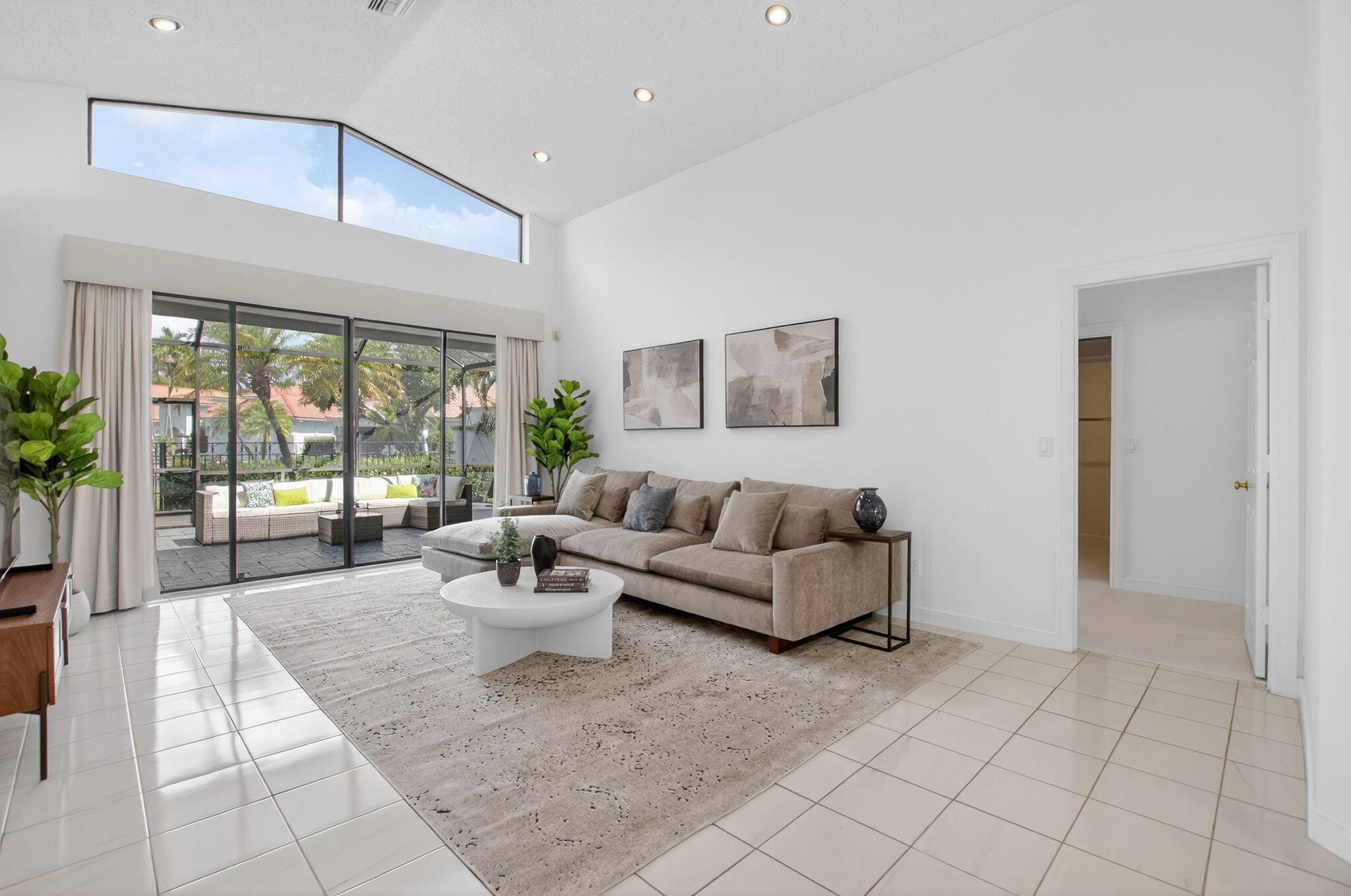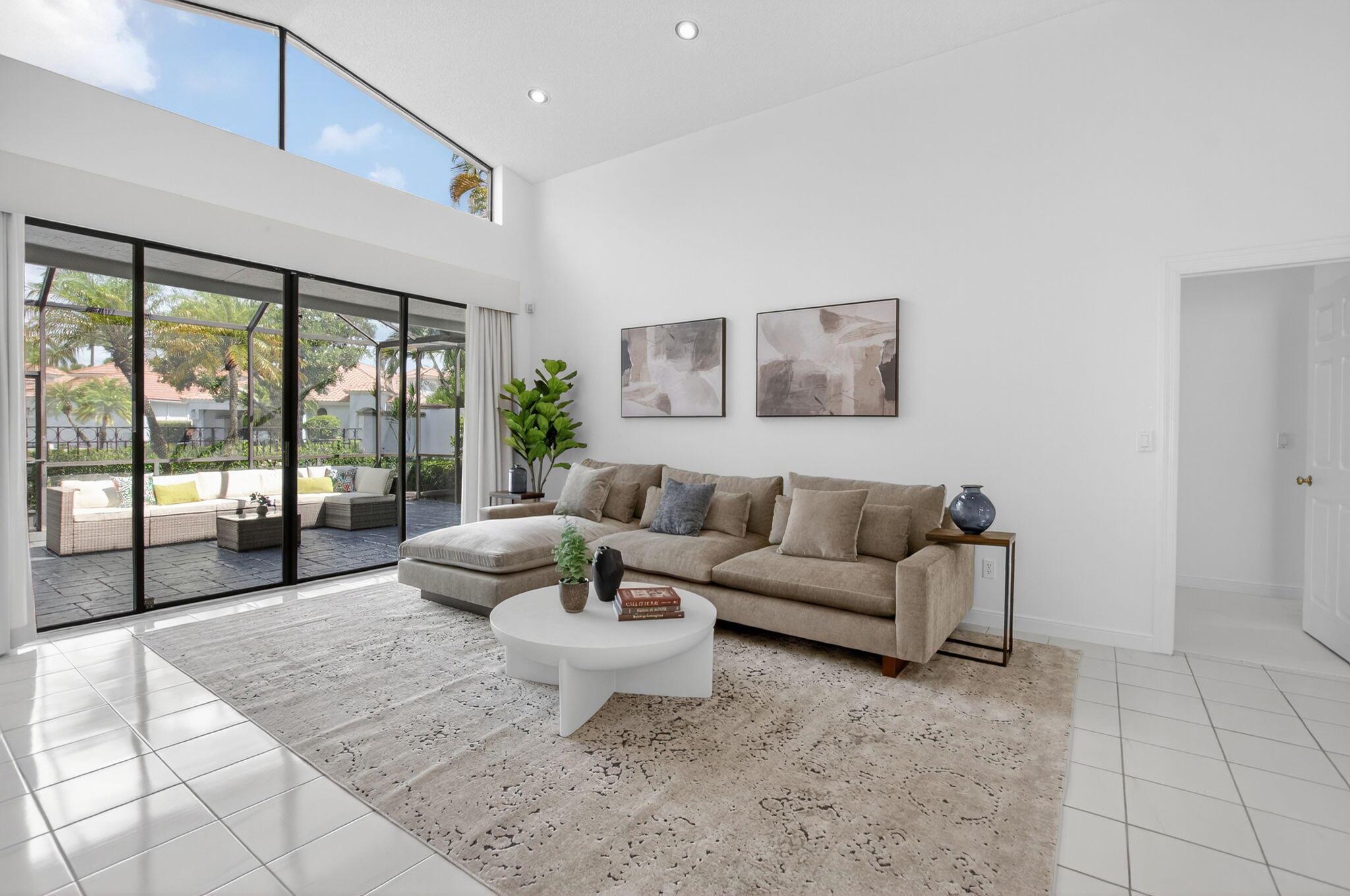 Charming light-filled single family home offering 3 real bedrooms with 2.5 baths. 2300 Sf. Located in BROKEN SOUND COUNTRY CLUB which is a Mandatory Membership Club. ''A rated School District. Expansive living room features soaring ceilings and double height windows and doors that open to a 500 sf screened in patio surrounded by mature greenery. The spacious eat-in-kitchen is nestled within a large bay window area that floods the space with light and garden views. A separate large dining area offers direct access to a second outdoor patio.The split bedroom layout ensures privacy for all. The oversized primary suite is set apart on one side of the home and includes a large walk in closet and a nice sized second closet. There is an oversized primary bathroom.