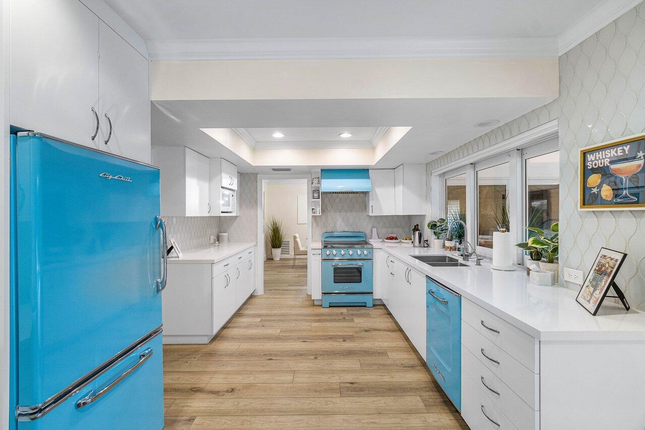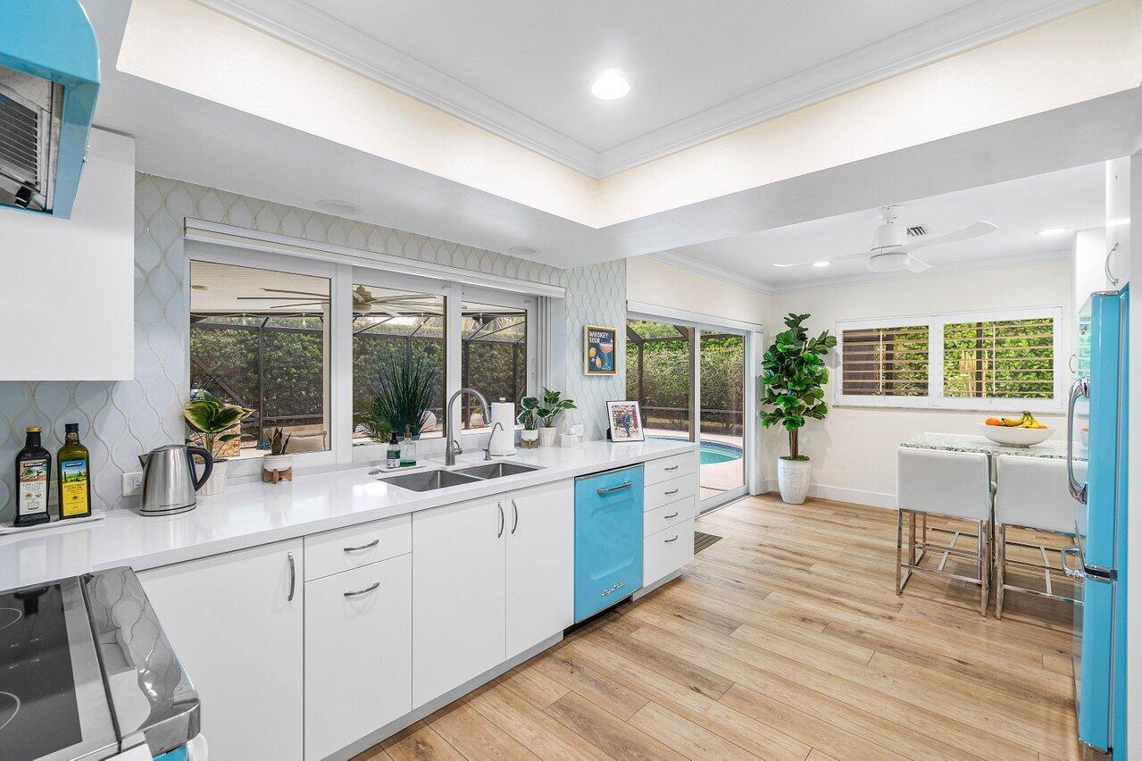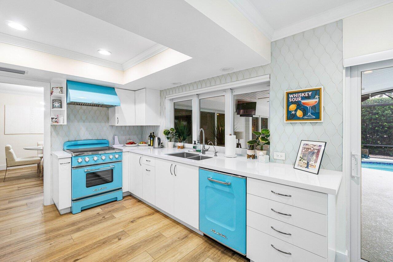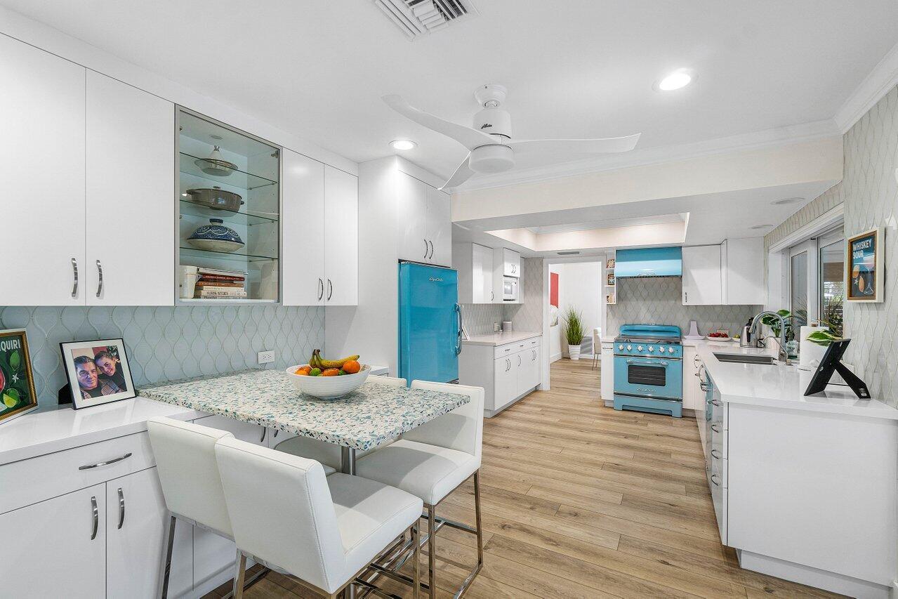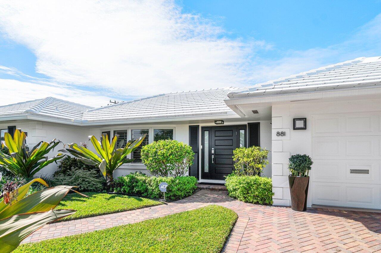 Welcome to this beautifully renovated mid-century modern gem, nestled in the highly sought-after Camino Gardens community of East Boca Raton. Thoughtfully designed and impeccably maintained, this home features a desirable split-bedroom floor plan and offers the perfect blend of timeless character and modern elegance. The light-filled interior includes a spacious great room, formal dining area, cozy breakfast nook, and an interior utility room equipped with a premium Asko washer and dryer. The chef's kitchen is a true showpiece, featuring white quartz countertops, Big Chill appliances including an induction cooktop, custom cabinetry, a sleek glass backsplash, and designer lighting that adds both function and flair. Peace of mind comes standard with full HURRICANE protection, including