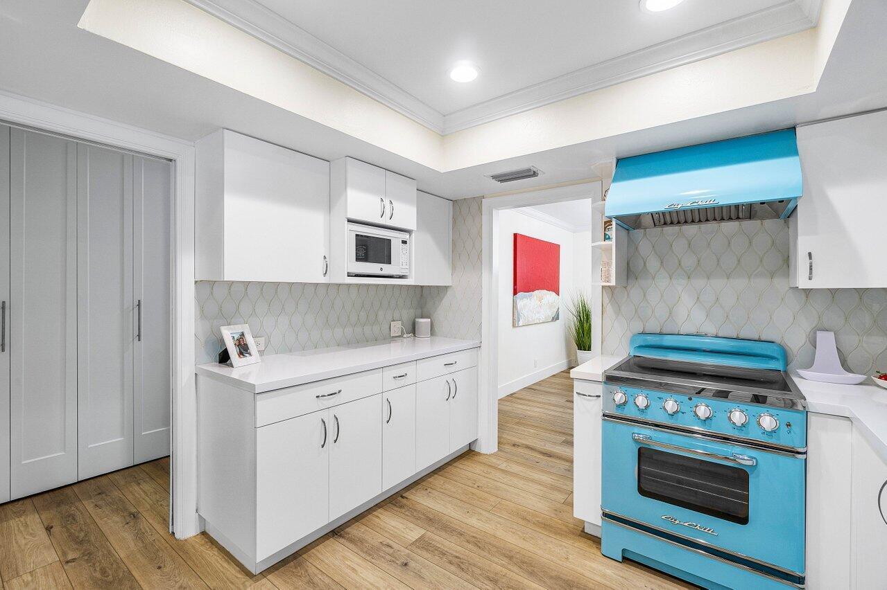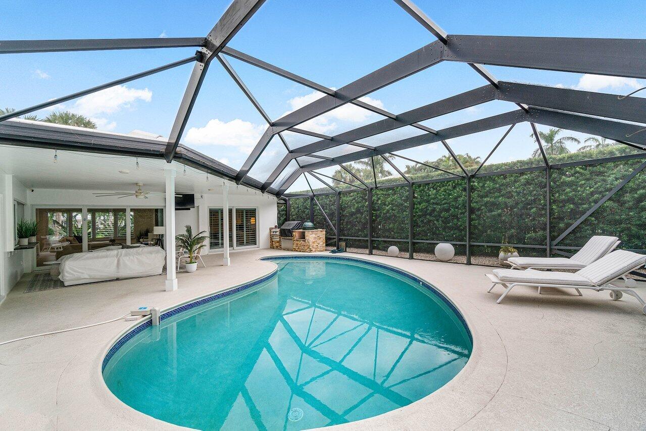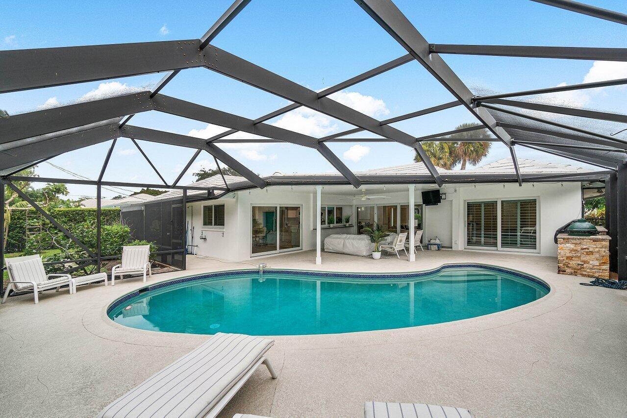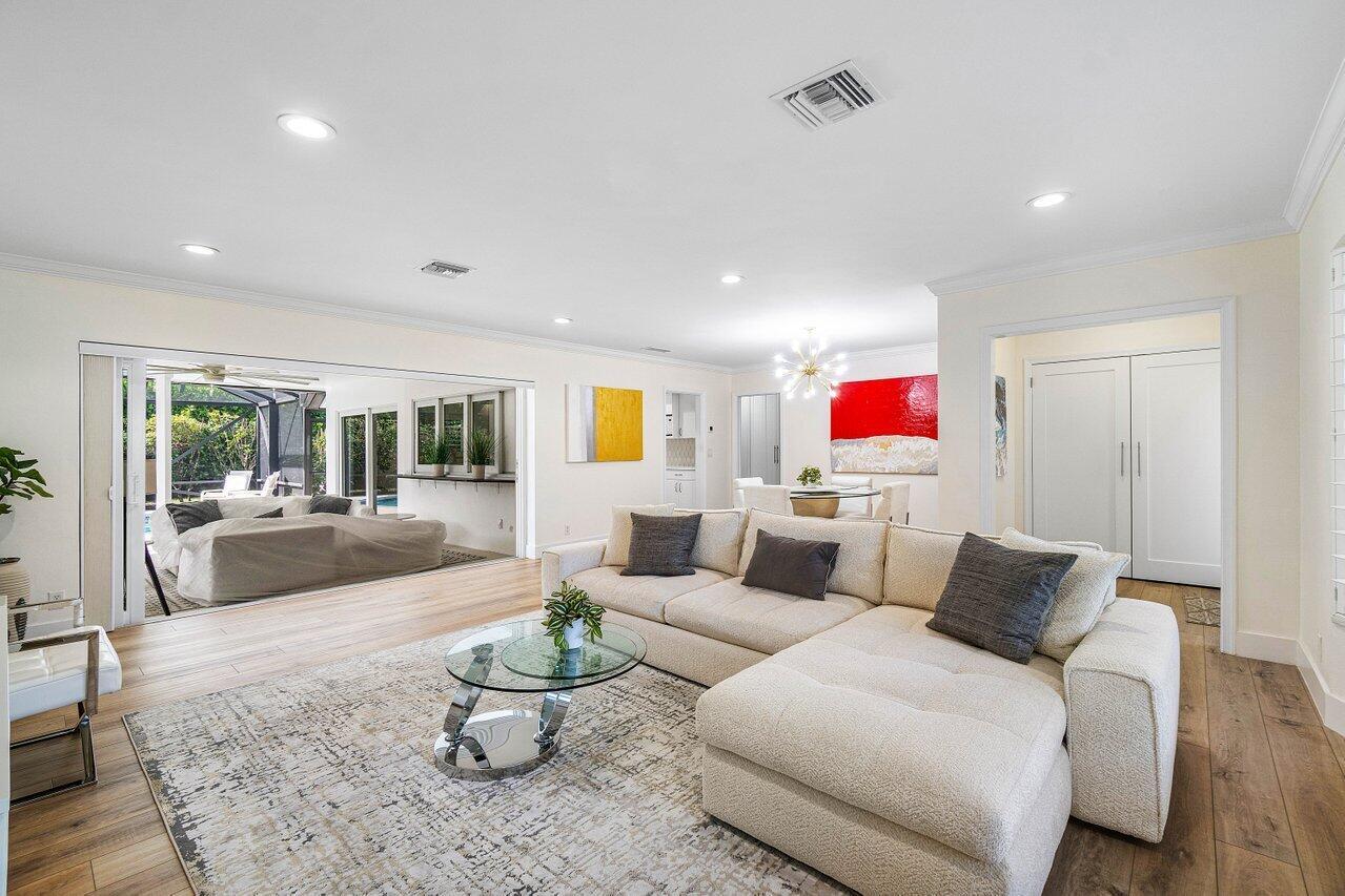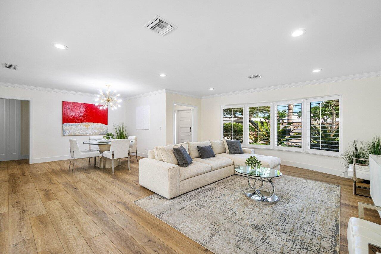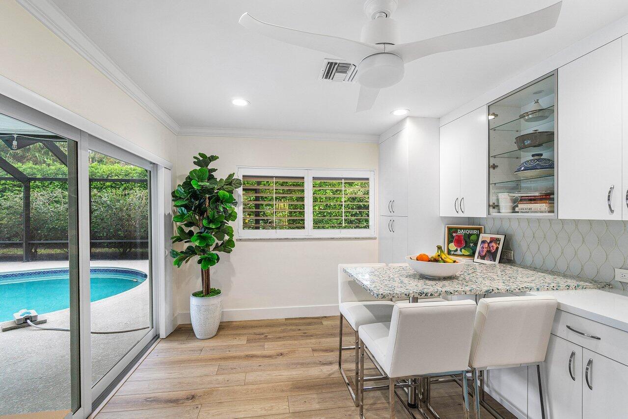 Welcome to this beautifully renovated mid-century modern gem, nestled in the highly sought-after Camino Gardens community of East Boca Raton. Thoughtfully designed and impeccably maintained, this home features a desirable split-bedroom floor plan and offers the perfect blend of timeless character and modern elegance. The light-filled interior includes a spacious great room, formal dining area, cozy breakfast nook, and an interior utility room equipped with a premium Asko washer and dryer. The chef's kitchen is a true showpiece, featuring white quartz countertops, Big Chill appliances including an induction cooktop, custom cabinetry, a sleek glass backsplash, and designer lighting that adds both function and flair. Peace of mind comes standard with full HURRICANE protection, including
