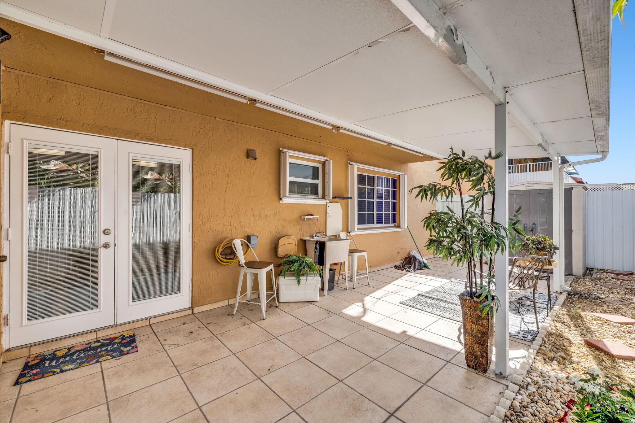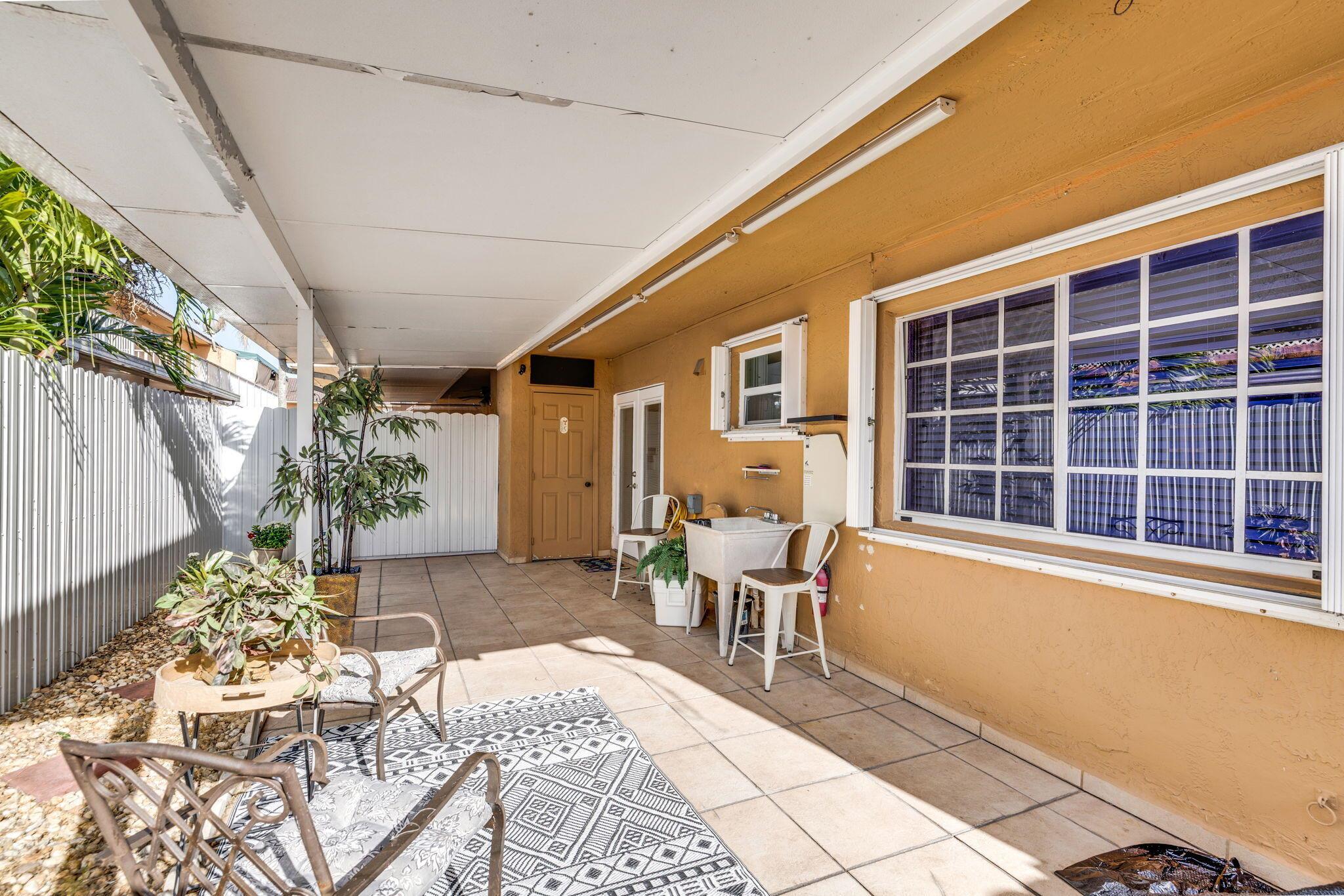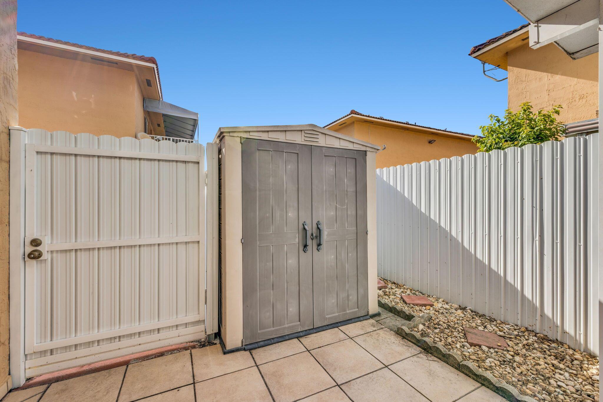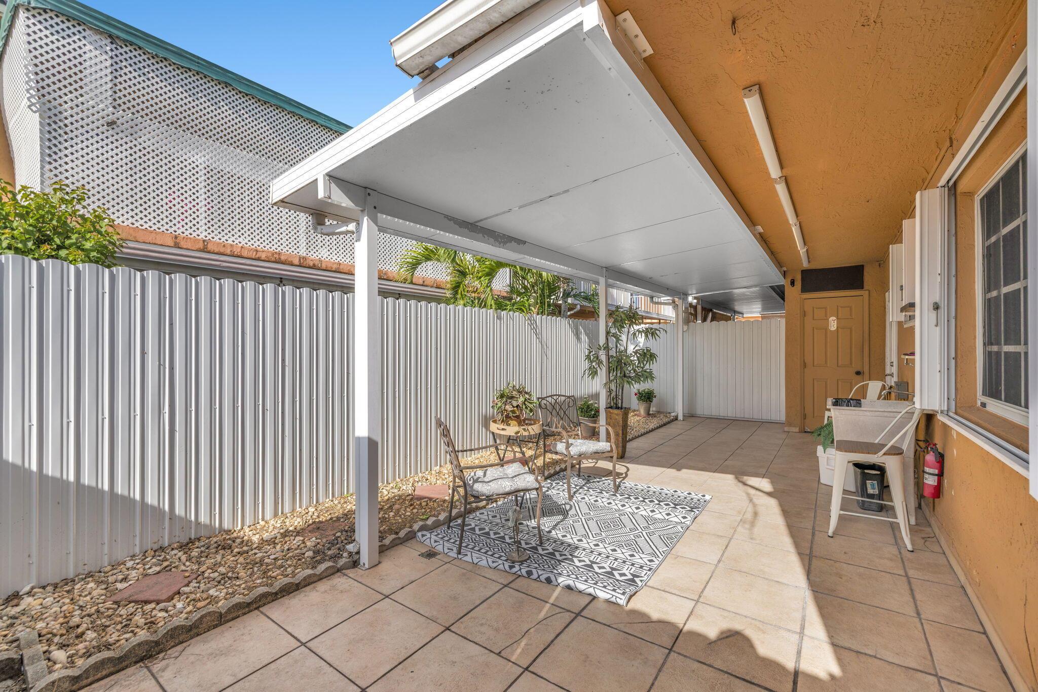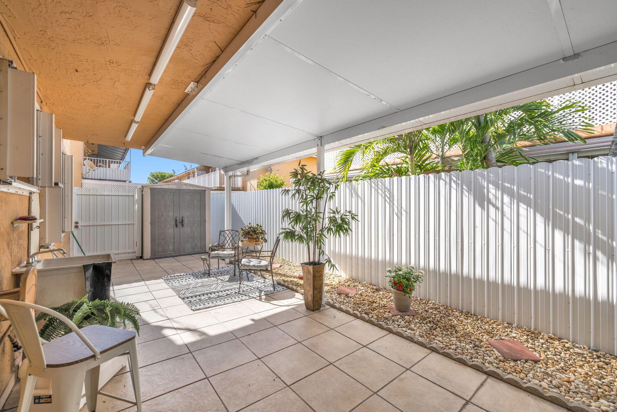 Excellent 2/2 well-maintained and move-in ready corner unit. Trendy and cute 2/2 with many extras. Boasts light finish built-in custom cabinetry throughout kitchen and dining areas, beautifully remodeled bathrooms, Indoor laundry room includes washer and dryer. Small office space, and extra indoor storage Spacious outdoor courtyard for entertaining. HOA fees include maintenance of common areas, lawn and exterior maintenance. 2 parking spaces, plus guest parking area. Small outside shed for extra outdoor storage. Accordion hurricane shutters on all windows.