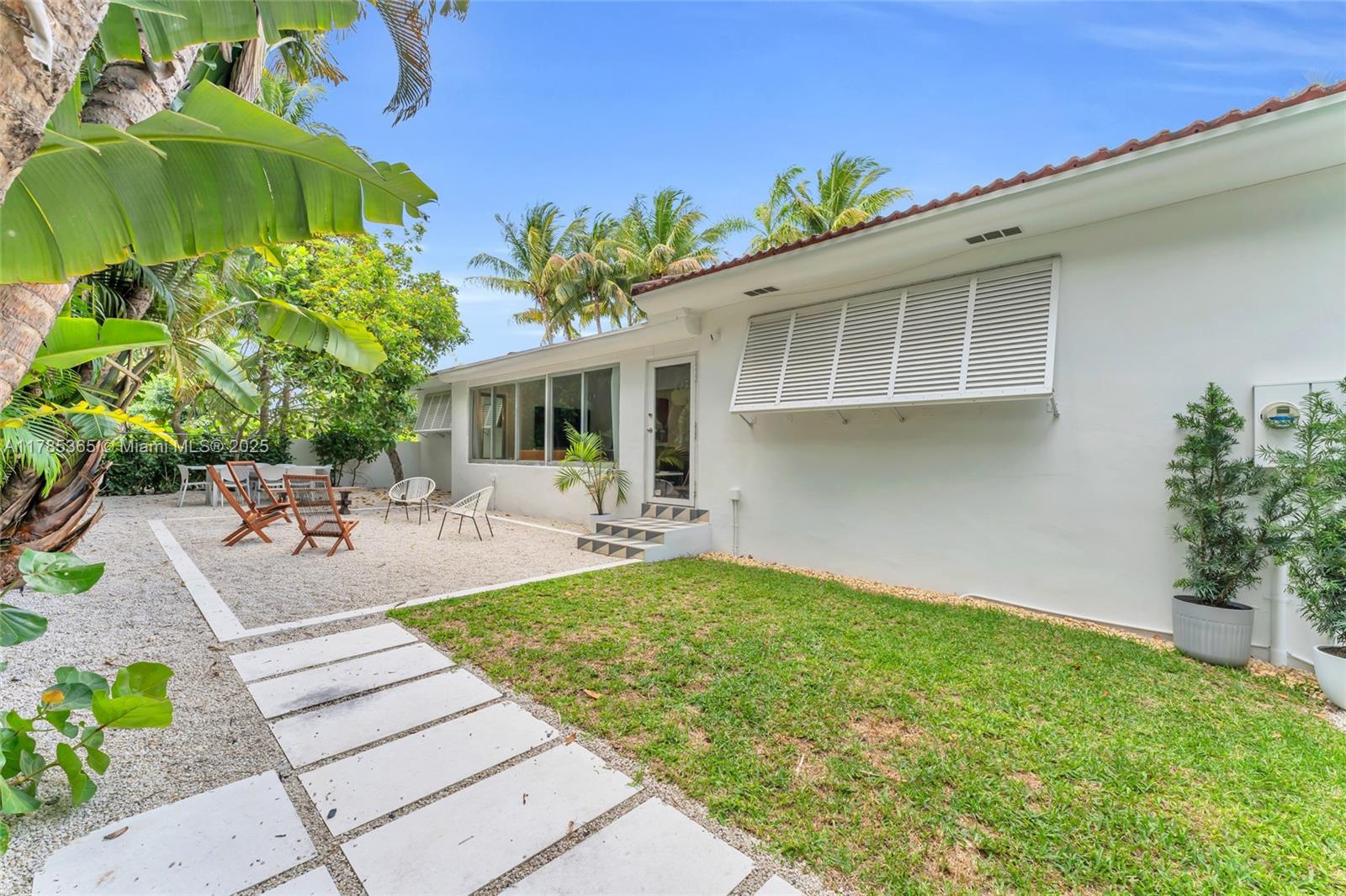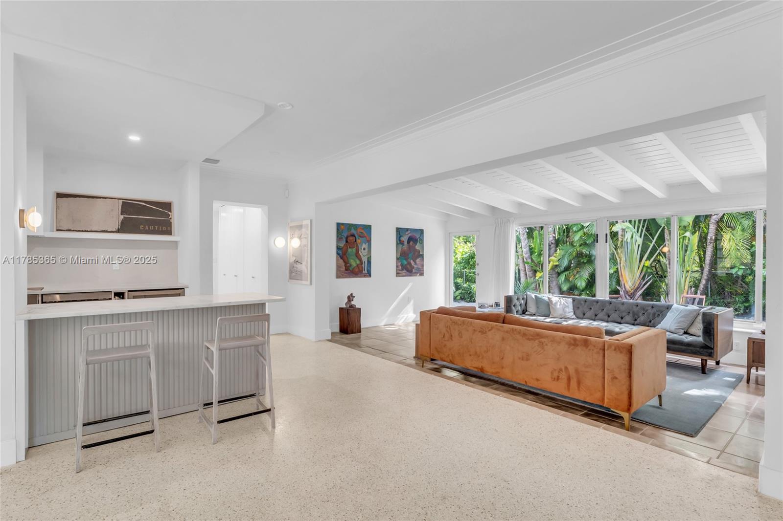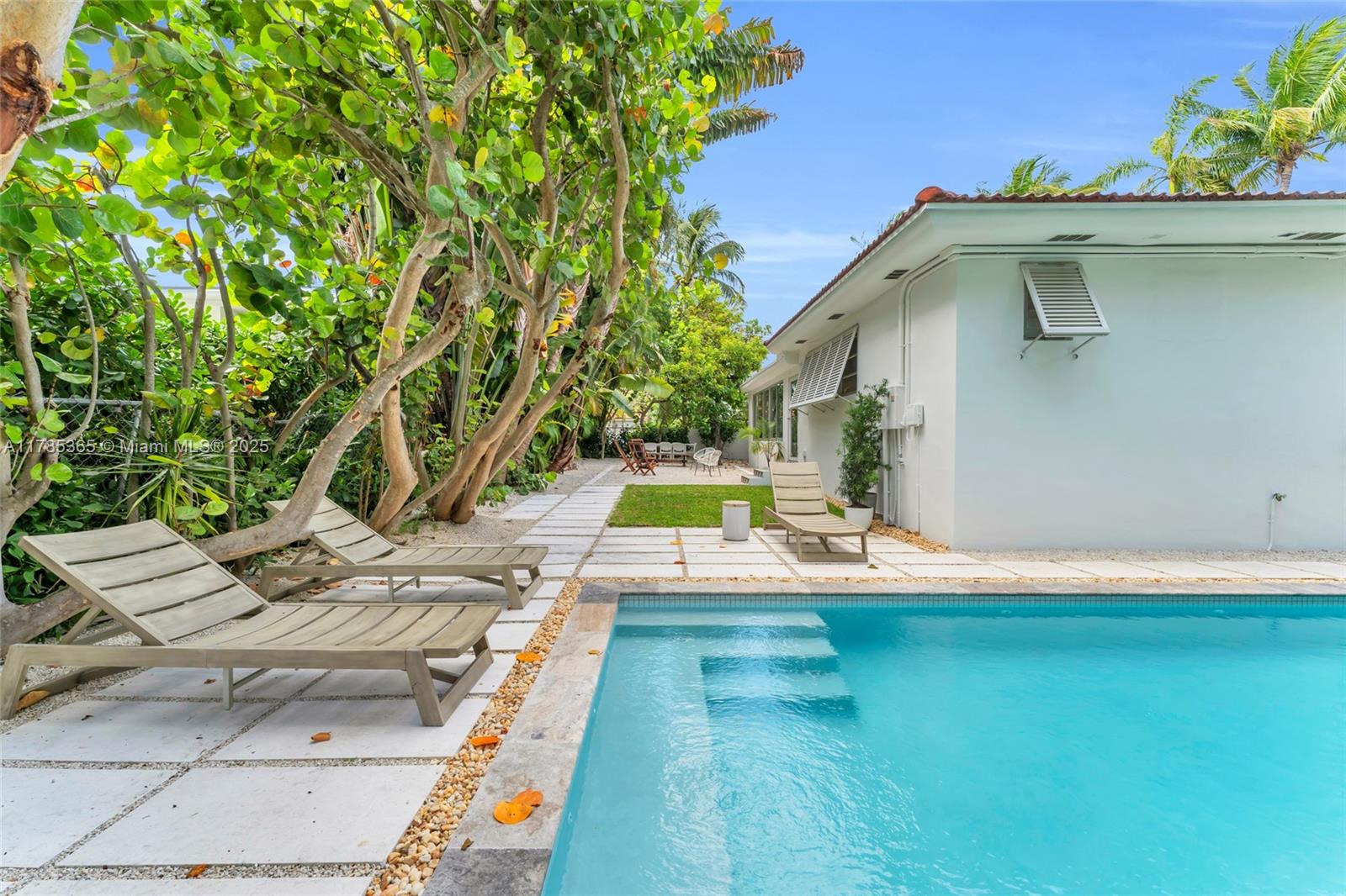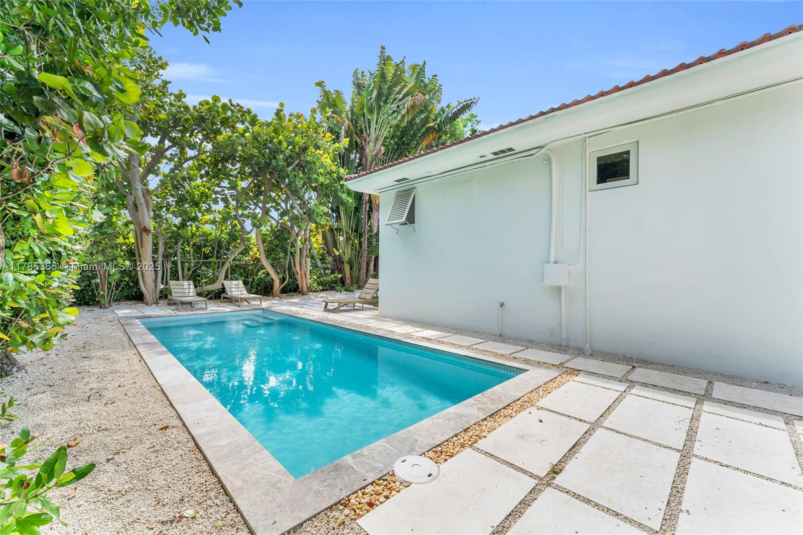 Architect-remodeled 2-bed, 3-bath home in Miami Shores Estates, set on a private corner lot at the end of two no-outlet streets. A peaceful retreat blending vintage charm and modern design, with original terrazzo floors, high-end finishes, and seamless flow to a lush garden with brand-new pool. The finished garage functions as an art studio/office. Corner lot allows for generous parking—2 spaces in front and 2–4 in the driveway. The kitchen features all new, high-end appliances. Every detail reflects thoughtful care. A rare and special home.