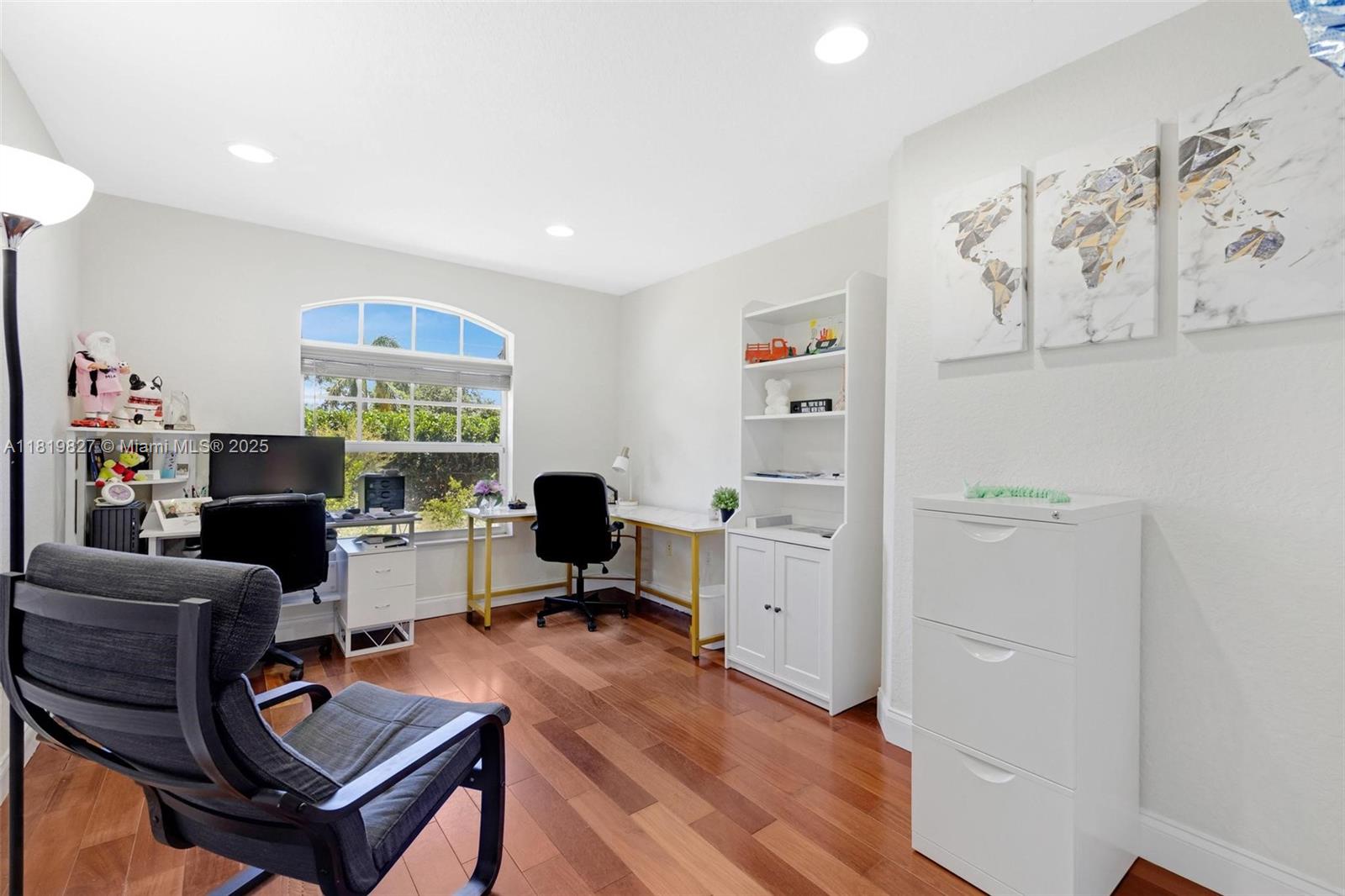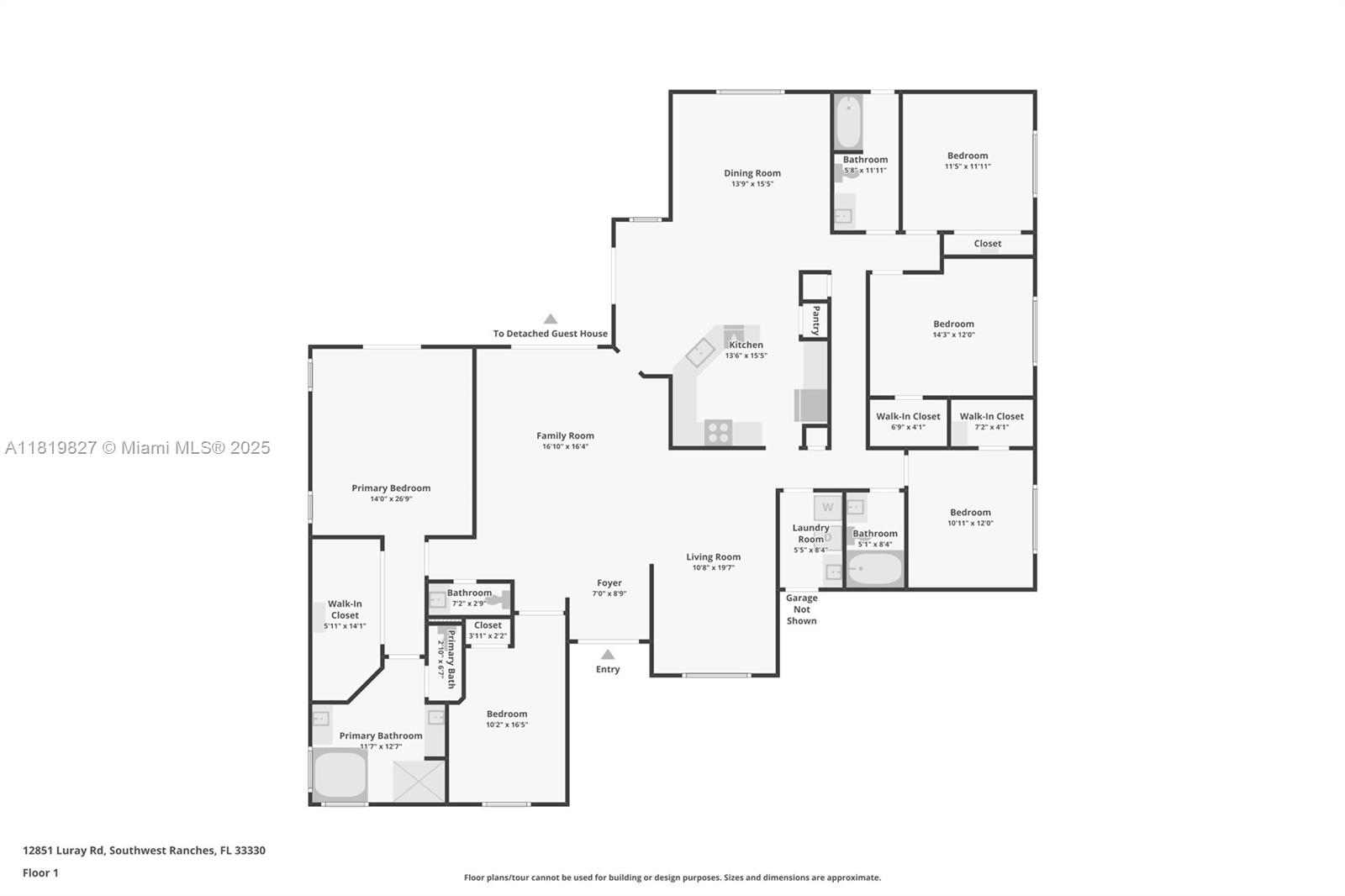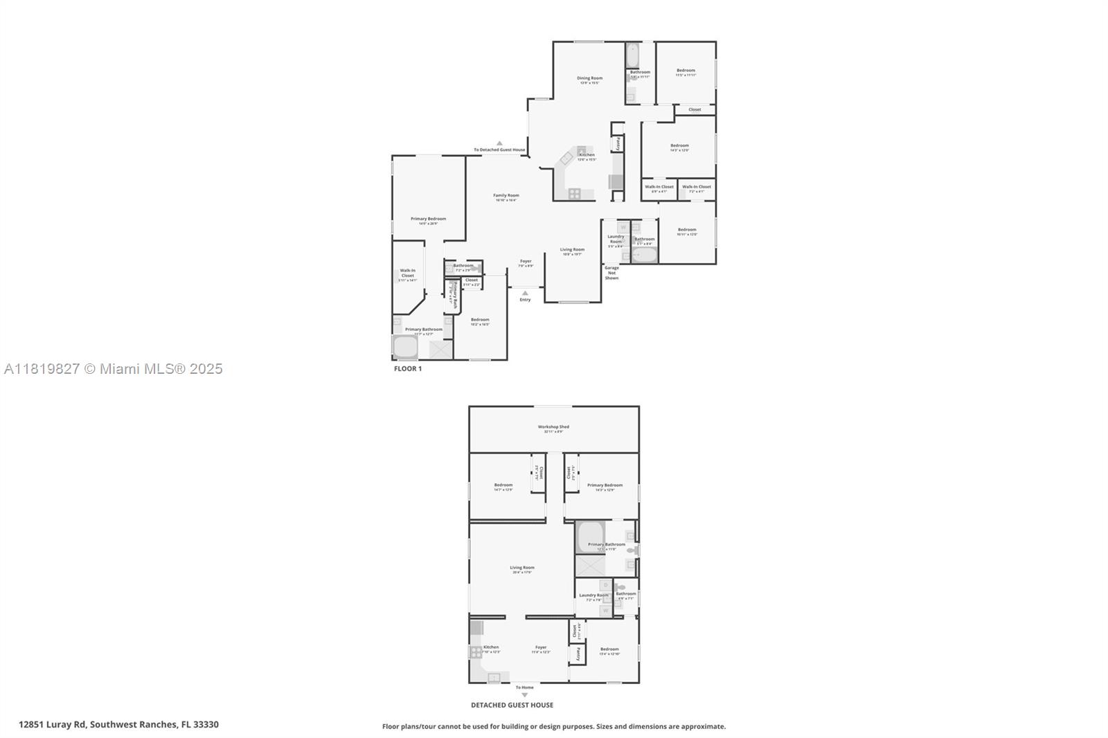 Fully fenced and gated 2.2-acre estate in equestrian-friendly Southwest Ranches. 5-bedroom residence plus a separate 2-bedroom guest house-ideal for multi-gen living, a home office, rental income, etc. The main home offers 3,000+ living sq ft, volume ceilings, abundant natural light, 2-car garage, and expansive driveway. The detached, updated guest house boasts 1,300+ sq ft, a storage room, private laundry, and a 3-seat jacuzzi. Property features new A/C systems, new water heaters, new well pumps and water filtration systems. Newly installed municipal water line directly across the property, makes city water connection optional instead of the area's typical well water. No overhead power lines running through the property.Agricultural exemption with citrus, tropical, and exotic fruit trees.