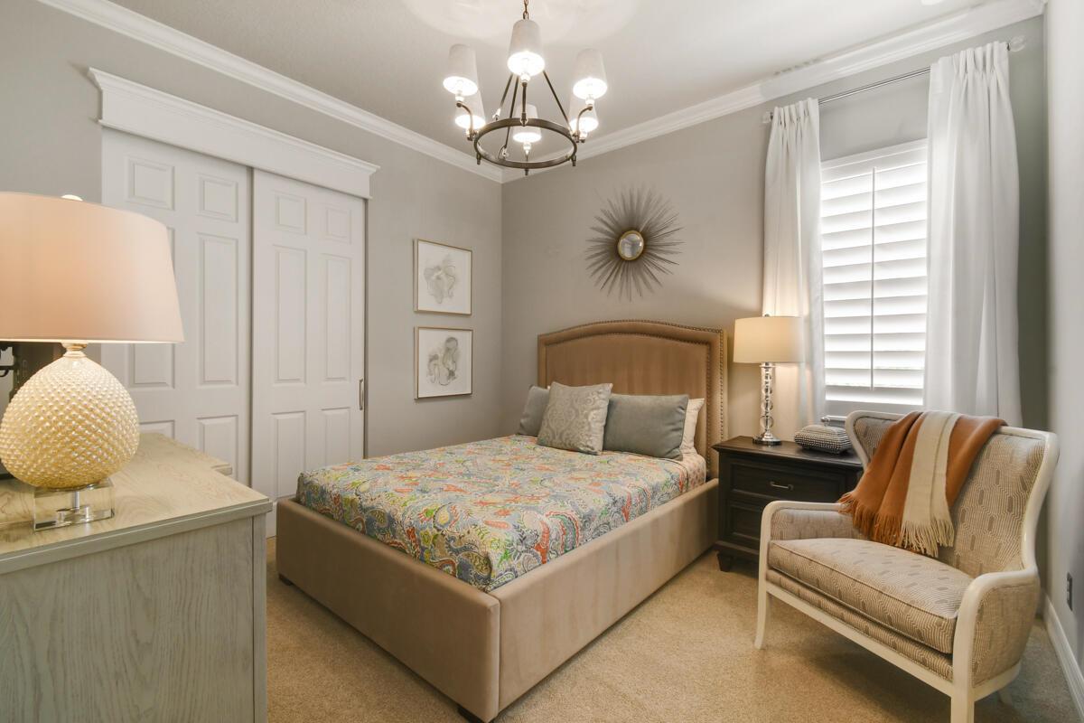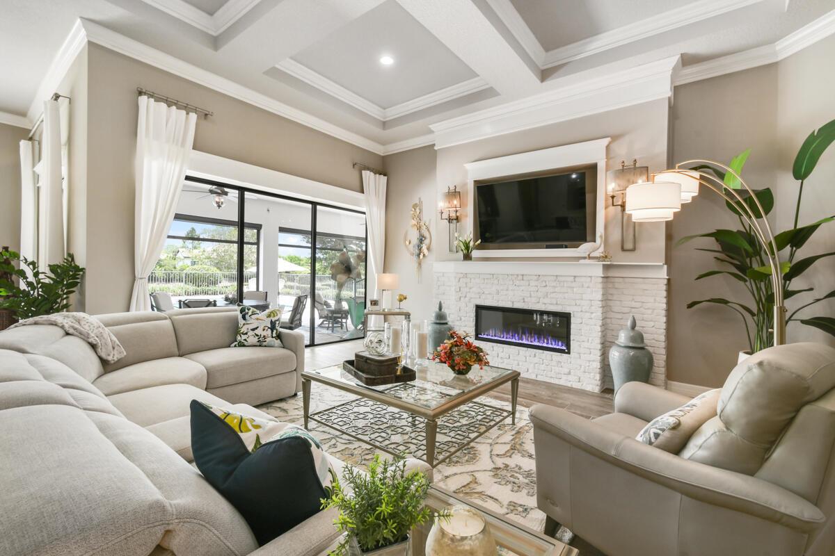 Elegance and thoughtful design come together in this exceptional residence located in the prestigious gated community of Copperleaf. Positioned on a beautifully landscaped 0.4-acre lakefront lot, this 4-bedroom, 3-bath Clubview model offers 3,089 square feet of sophisticated living space and a rare 3-car air-conditioned garage. The home's interiors are defined by timeless finishes and curated details: coffered ceilings, crown molding, wood accent walls, stone features, and plantation shutters. The expansive great room flows seamlessly into a gourmet kitchen outfitted with KitchenAid and LG appliances, custom cabinetry, a glass tile backsplash, and an oversized island ideal for gathering. Designed for elevated everyday living, the split-bedroom floor plan ensures privacy when needed, but