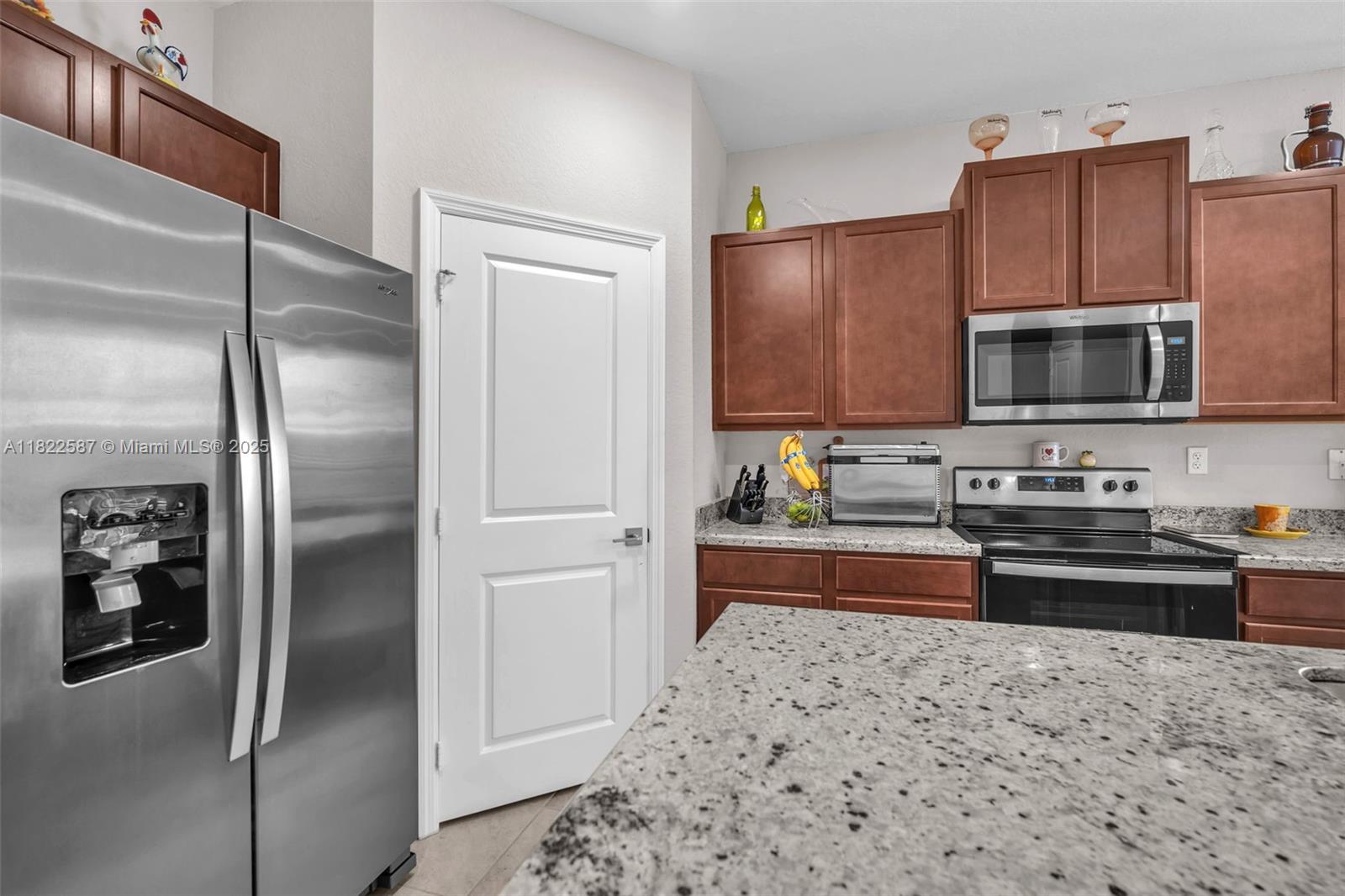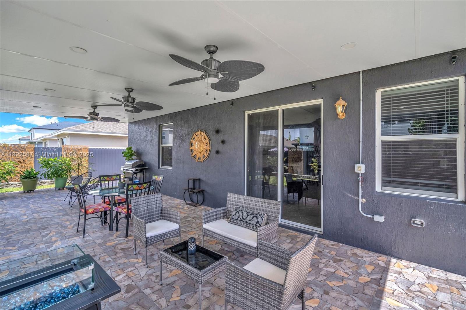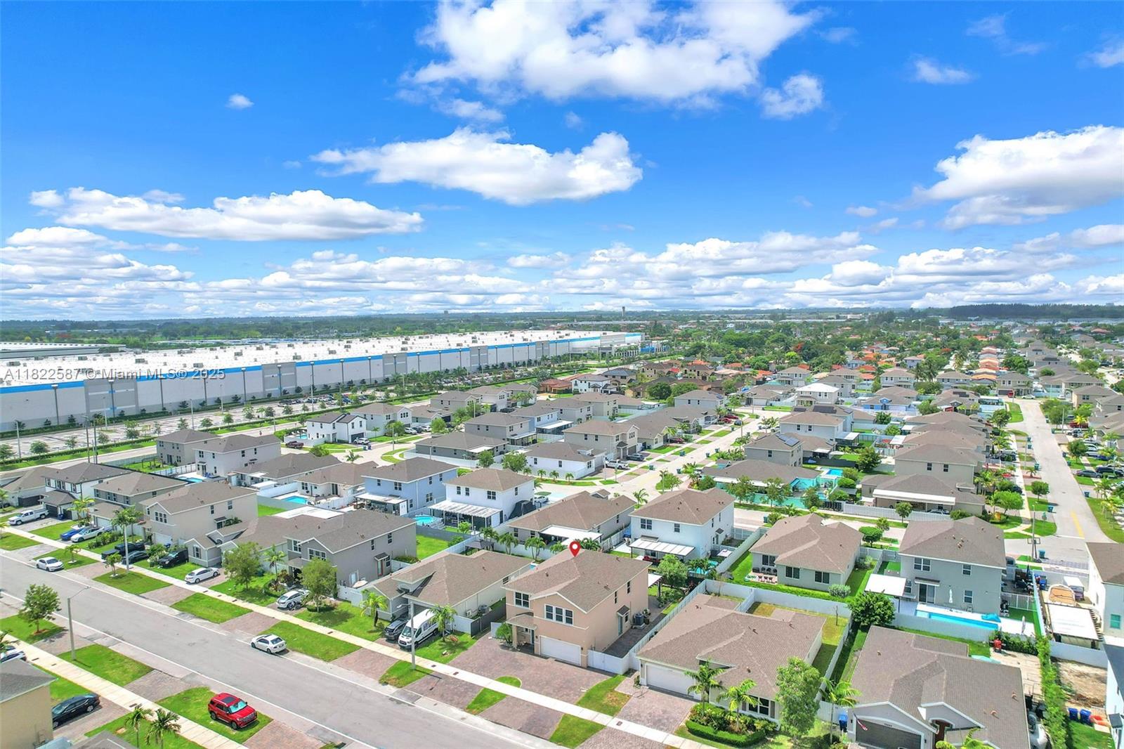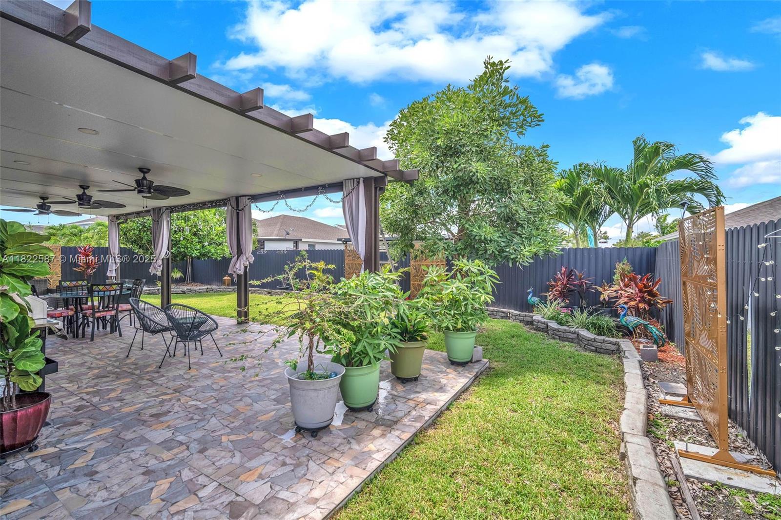 Beautiful 2-story Homestead home with 2-car garage, small porch, and inviting foyer. The open living and dining areas are perfect for entertaining family and friends. The island kitchen includes a double-door refrigerator, stove, microwave, garbage disposal, and ample cabinet space for all your cooking needs. Downstairs features a half bath, attic storage, and small walk-in closet with shelving. Upstairs has carpet throughout, a spacious loft with closet, laundry room, three bedrooms, and a master suite with walk-in closet, double sinks, shower, and separate tub. Guest bath offers double sinks and tub/shower. The backyard includes patio, pavers, grassy area, small garden, and three ceiling fans for outdoor comfort and relaxation. Separate in-law or guest-entry on the side of house.