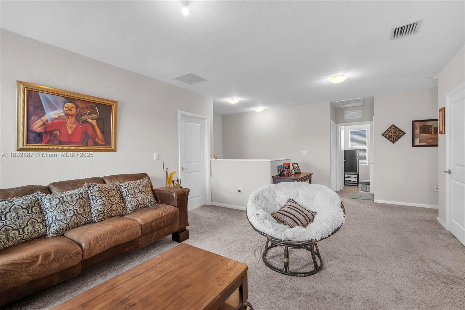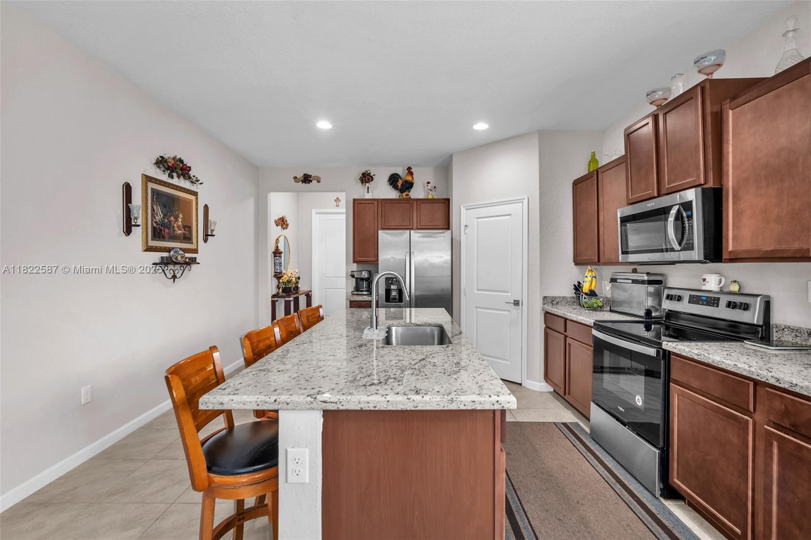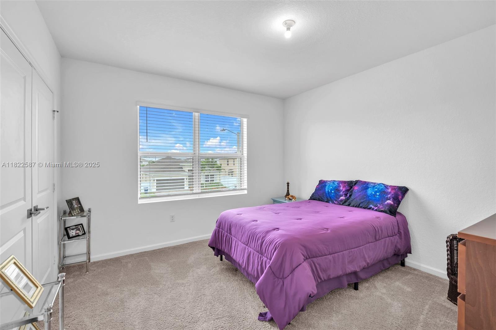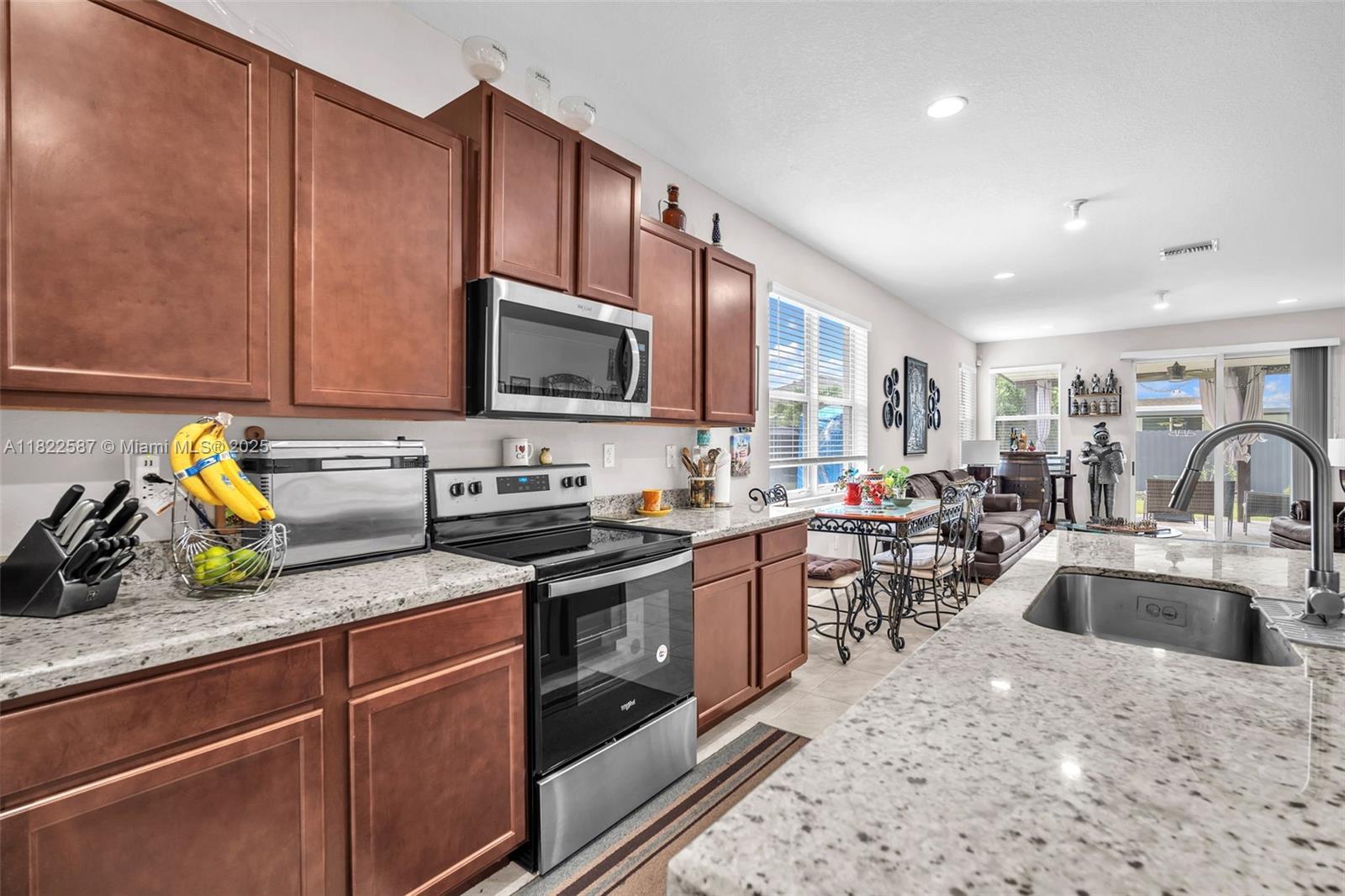 Beautiful 2-story Homestead home with 2-car garage, small porch, and inviting foyer. The open living and dining areas are perfect for entertaining family and friends. The island kitchen includes a double-door refrigerator, stove, microwave, garbage disposal, and ample cabinet space for all your cooking needs. Downstairs features a half bath, attic storage, and small walk-in closet with shelving. Upstairs has carpet throughout, a spacious loft with closet, laundry room, three bedrooms, and a master suite with walk-in closet, double sinks, shower, and separate tub. Guest bath offers double sinks and tub/shower. The backyard includes patio, pavers, grassy area, small garden, and three ceiling fans for outdoor comfort and relaxation. Separate in-law or guest-entry on the side of house.
