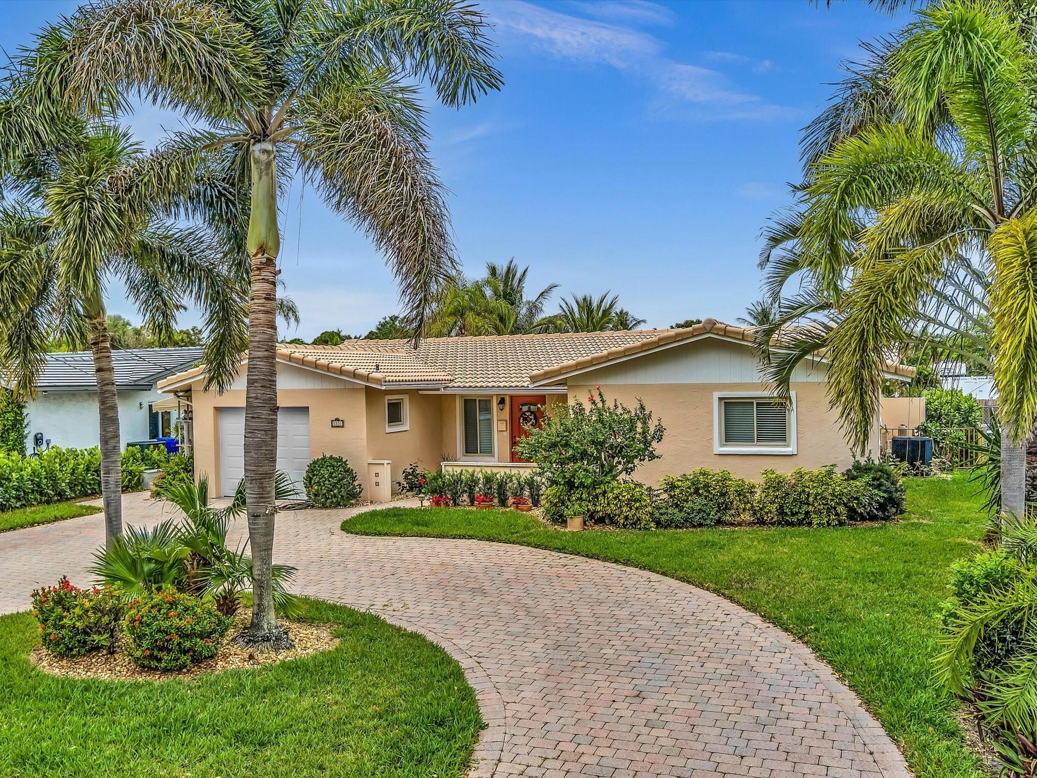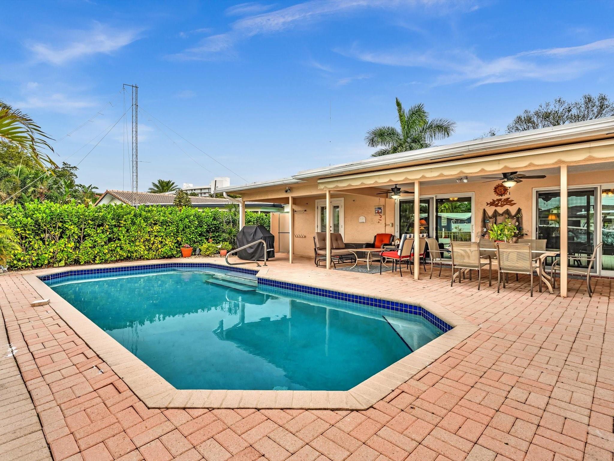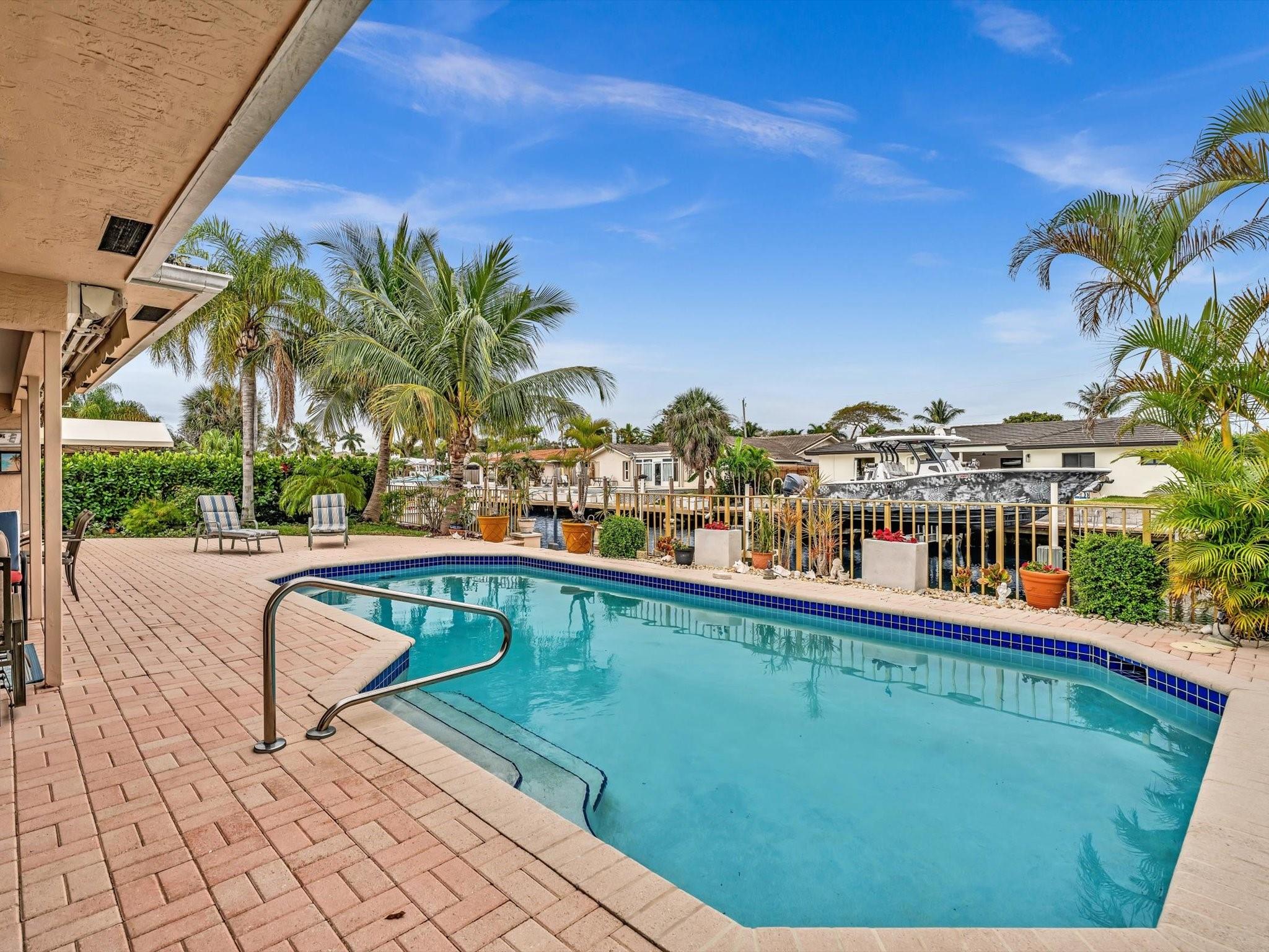 70FT OF WATERFRONT! With 3 bedrooms and 2 bathrooms, this meticulously maintained waterfront home is a short walk to the beach. Enjoy Florida's outdoor lifestyle with a saltwater pool, outdoor shower and a covered patio, ideal for relaxing or entertaining. This beautiful property has a 60ft dock, NO FIXED BRIDGES, NEW AC, and is a short boat ride to the Hillsboro Inlet. Complete with impact windows and doors (pass-through kitchen window and garage side door have shutters), located on a private cul-de-sac, and a circular driveway for ample parking. The single car garage provides additional storage, completing this perfect package. Minutes away from beautiful beaches, restaurants, shopping, parks and the Pompano Beach Pier.