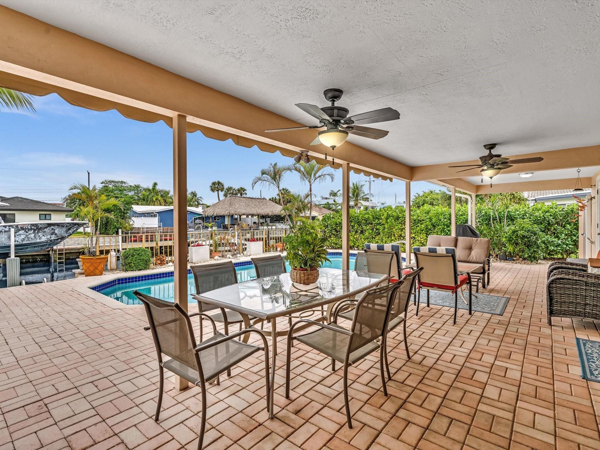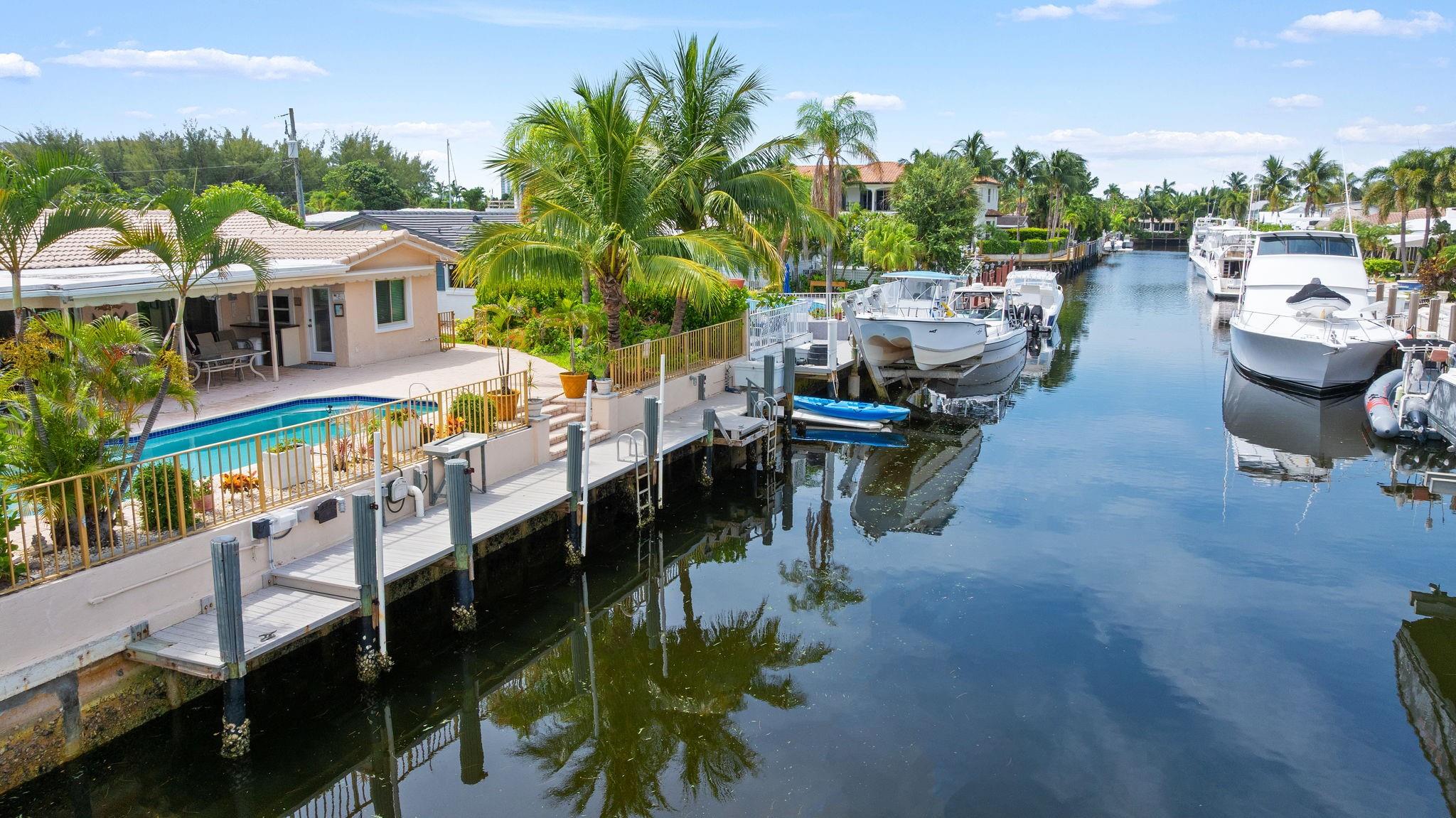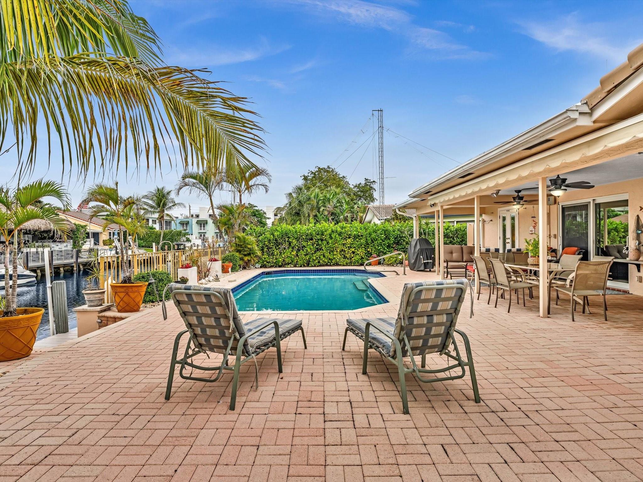 70FT OF WATERFRONT! With 3 bedrooms and 2 bathrooms, this meticulously maintained waterfront home is a short walk to the beach. Enjoy Florida's outdoor lifestyle with a saltwater pool, outdoor shower and a covered patio, ideal for relaxing or entertaining. This beautiful property has a 60ft dock, NO FIXED BRIDGES, NEW AC, and is a short boat ride to the Hillsboro Inlet. Complete with impact windows and doors (pass-through kitchen window and garage side door have shutters), located on a private cul-de-sac, and a circular driveway for ample parking. The single car garage provides additional storage, completing this perfect package. Minutes away from beautiful beaches, restaurants, shopping, parks and the Pompano Beach Pier.