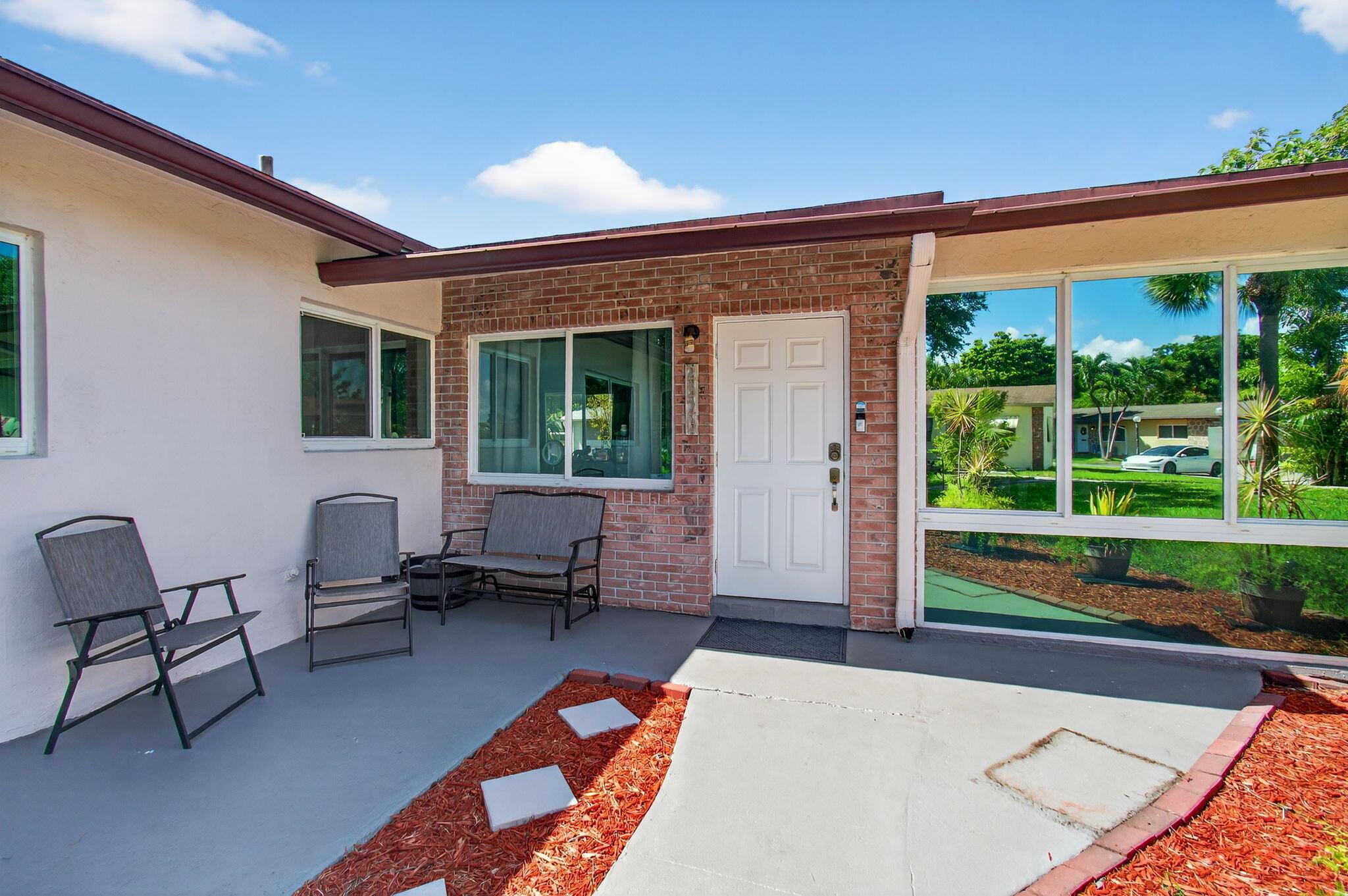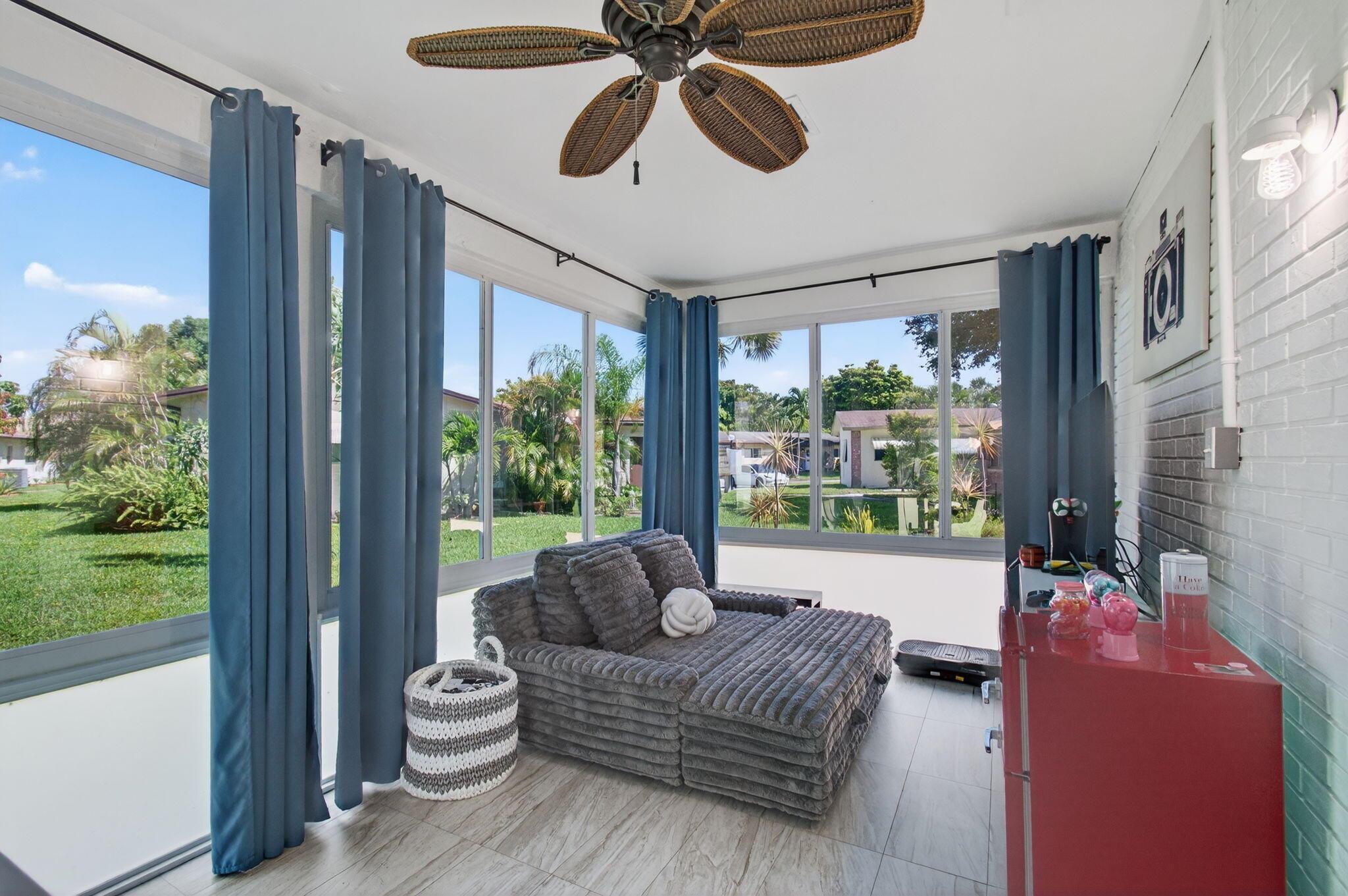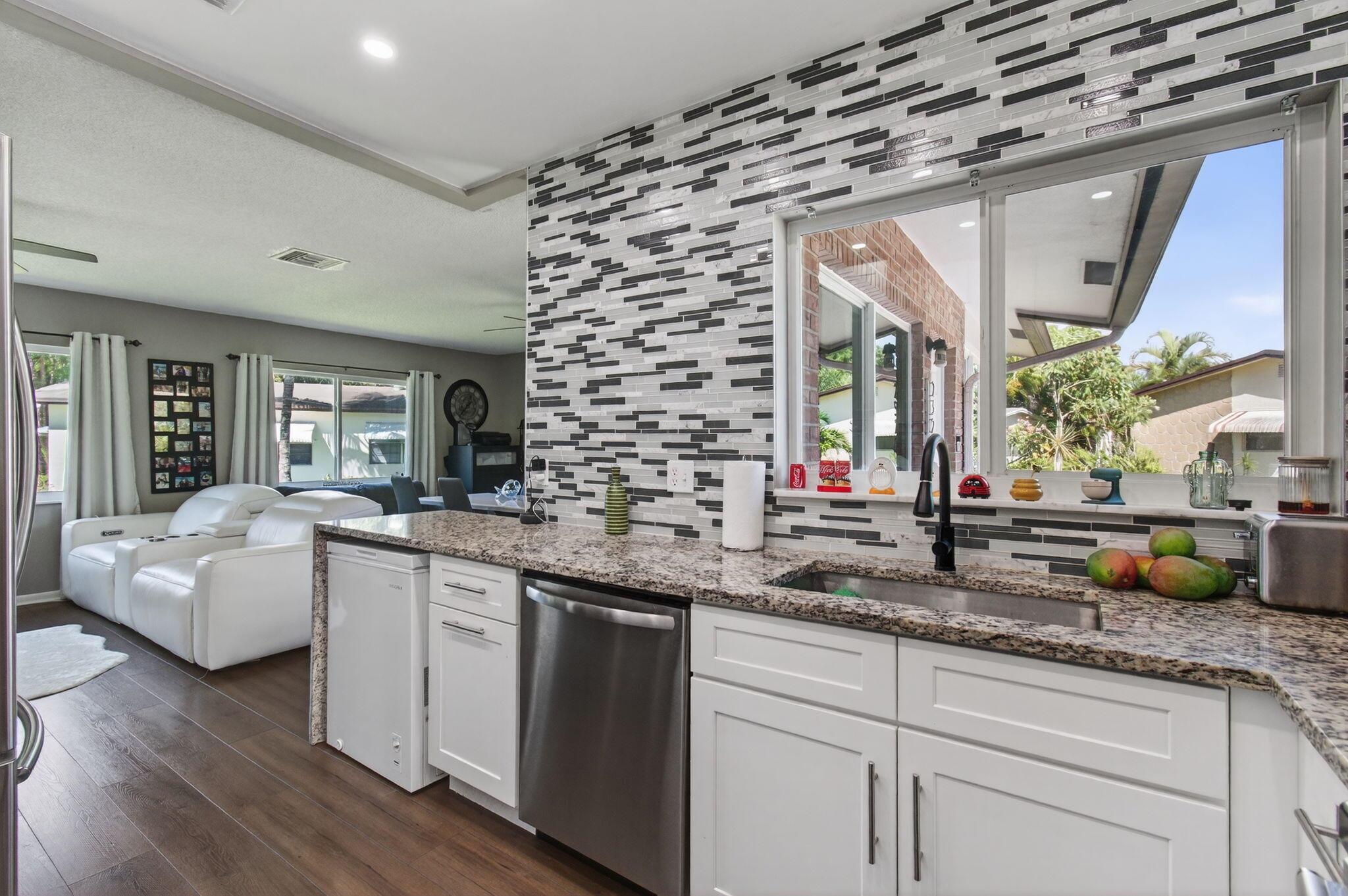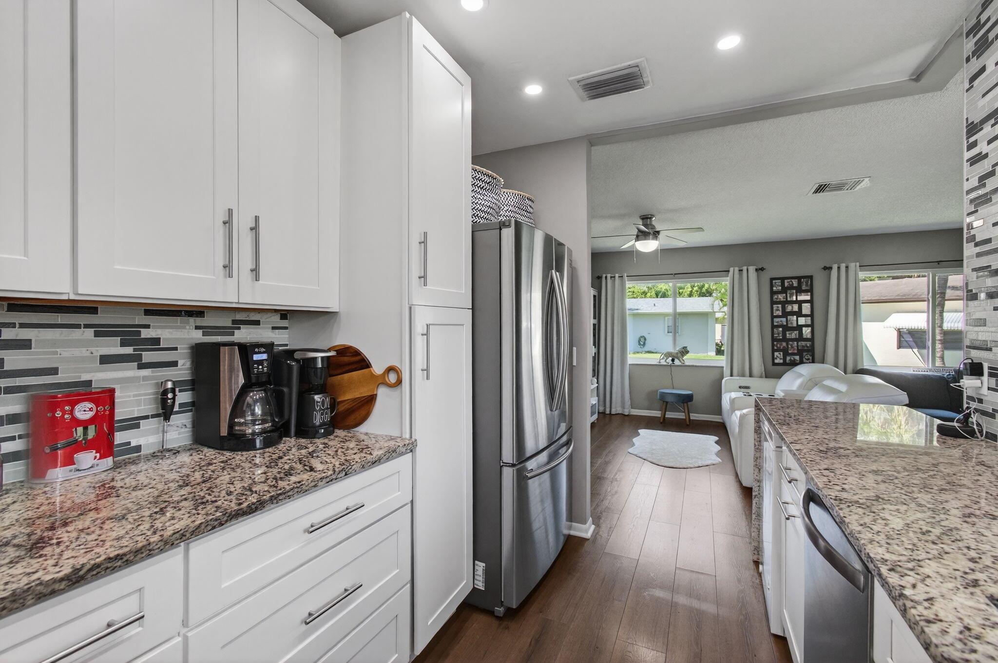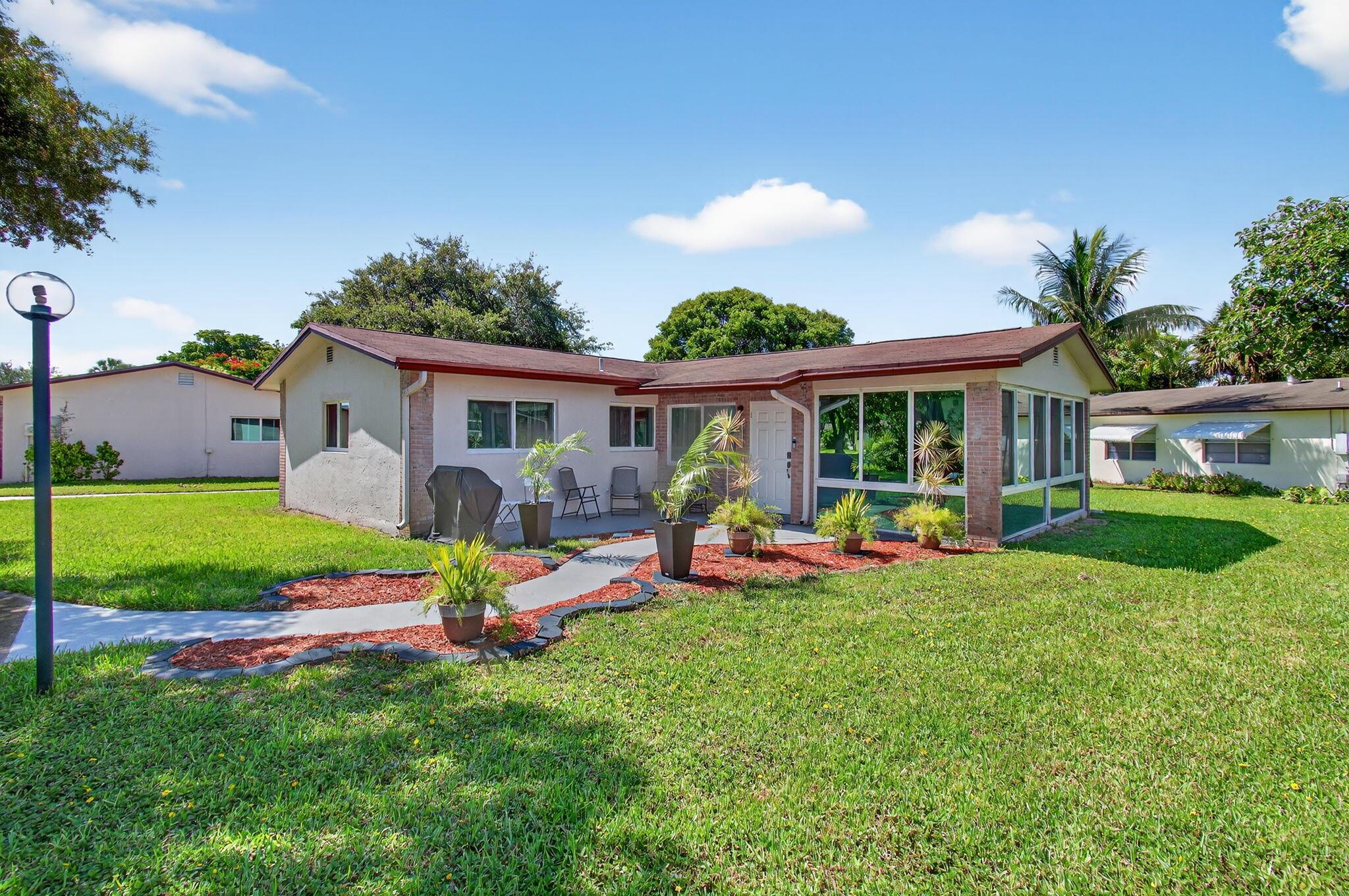 This spacious and beautifully maintained 2-bedroom + Bonus Room home offers the perfect blend of comfort and coastal charm minutes from the beach. The bright, open layout features a large, enclosed Florida room that's an ideal bonus space and can be used as a home office, den, or additional living that brings in great natural light. Enjoy a renovated kitchen with granite countertops and custom white cabinets. This home has new flooring throughout, designer fixtures, and updated bathrooms. Freshly painted inside and out. You will love the patio with lush landscaping and clean curb appeal. Major updates include NEW impact windows, A/C (2020), and appliances all within the last 5 years, making this home truly move-in ready.