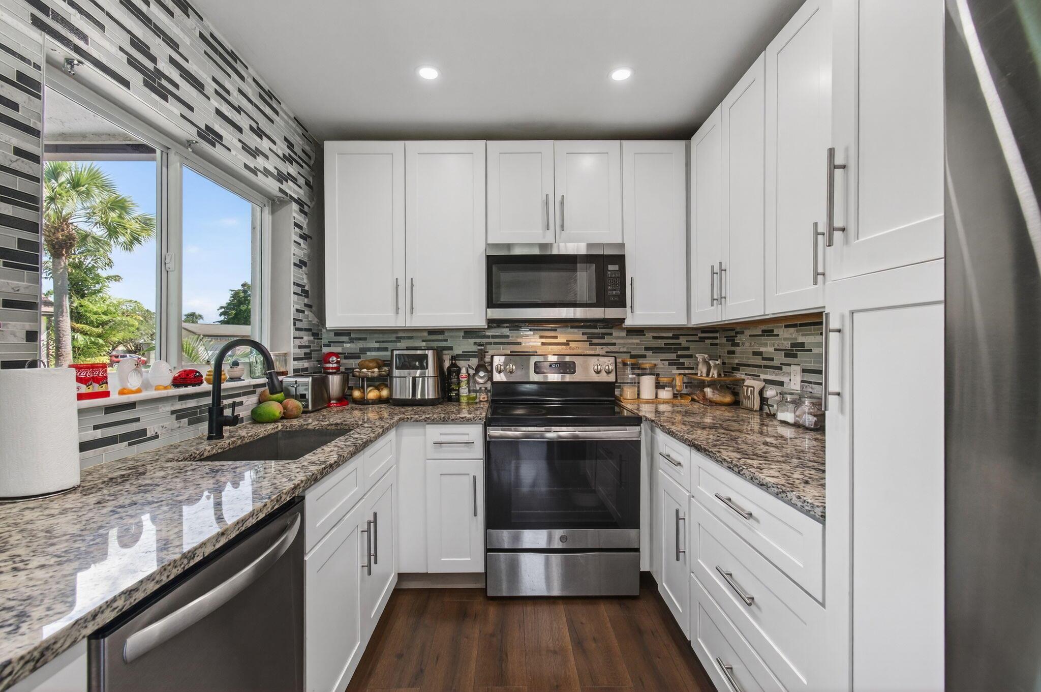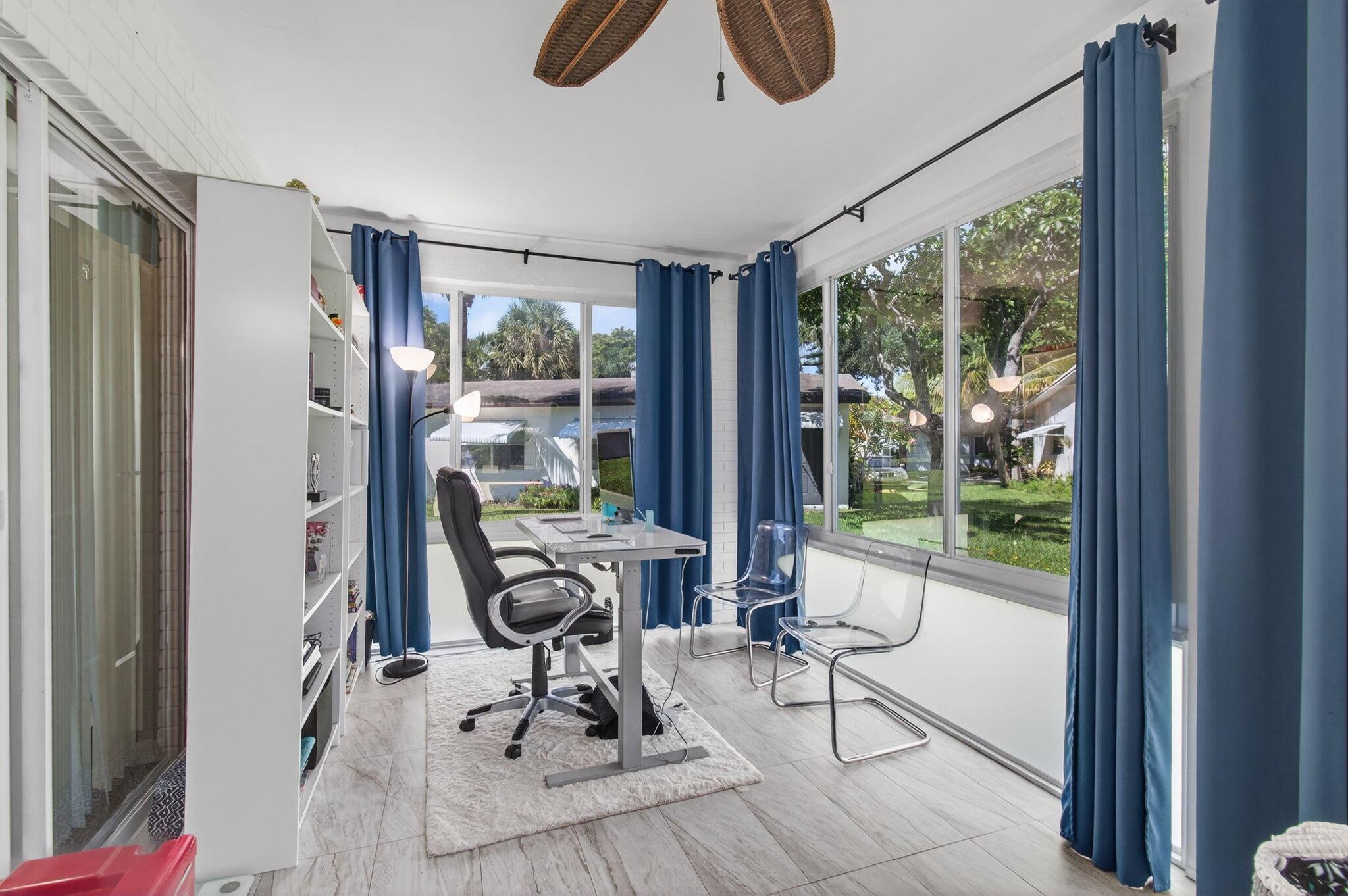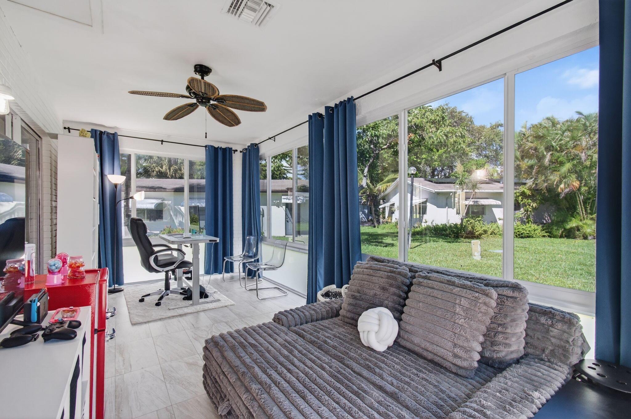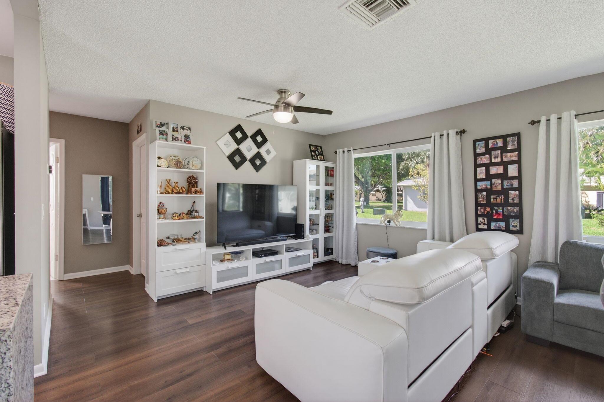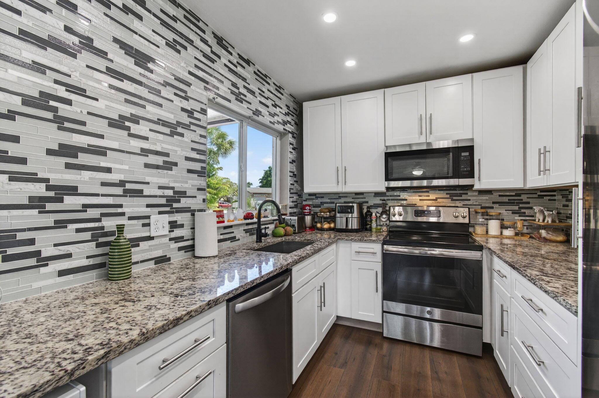 This spacious and beautifully maintained 2-bedroom + Bonus Room home offers the perfect blend of comfort and coastal charm minutes from the beach. The bright, open layout features a large, enclosed Florida room that's an ideal bonus space and can be used as a home office, den, or additional living that brings in great natural light. Enjoy a renovated kitchen with granite countertops and custom white cabinets. This home has new flooring throughout, designer fixtures, and updated bathrooms. Freshly painted inside and out. You will love the patio with lush landscaping and clean curb appeal. Major updates include NEW impact windows, A/C (2020), and appliances all within the last 5 years, making this home truly move-in ready.