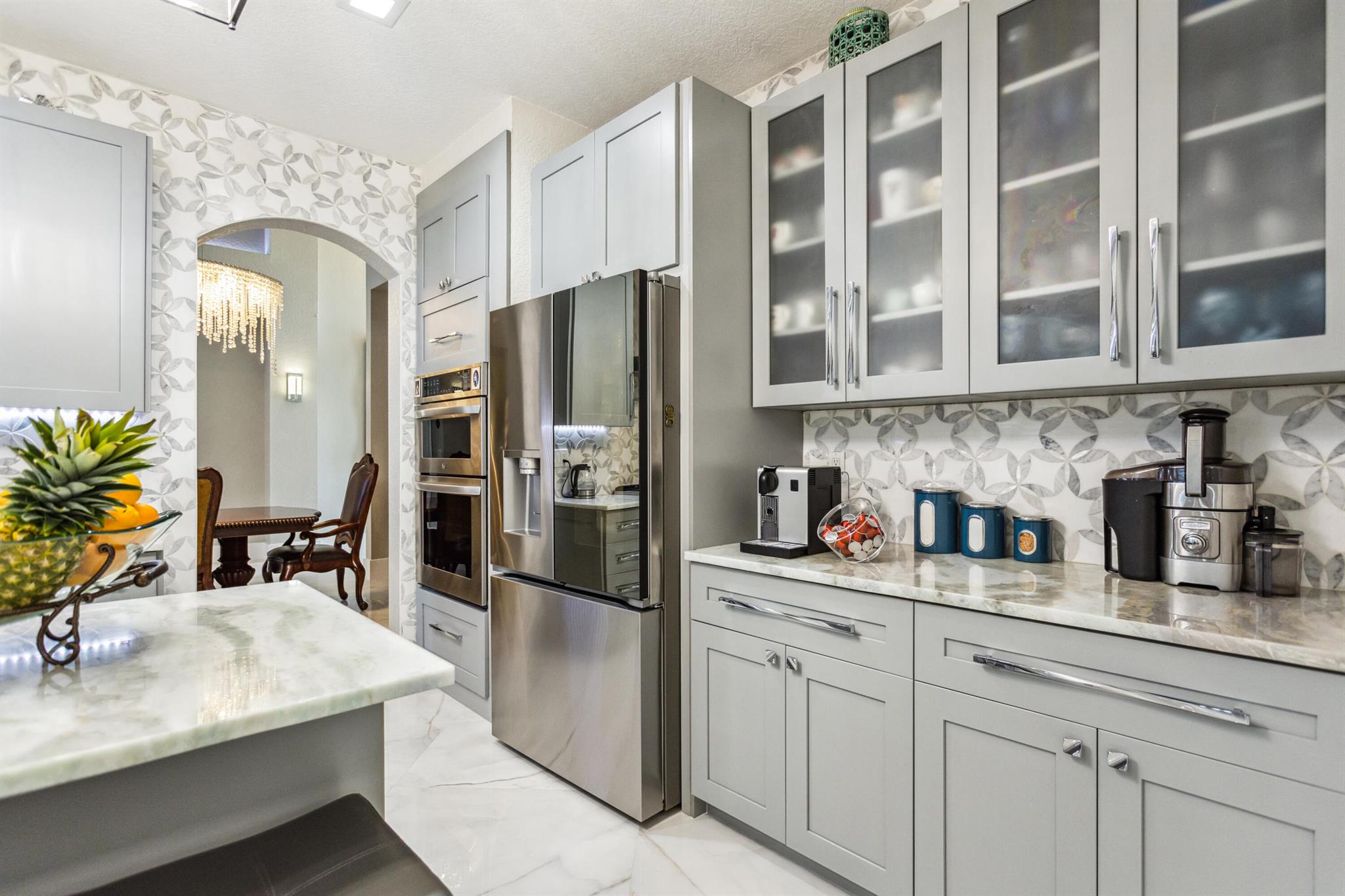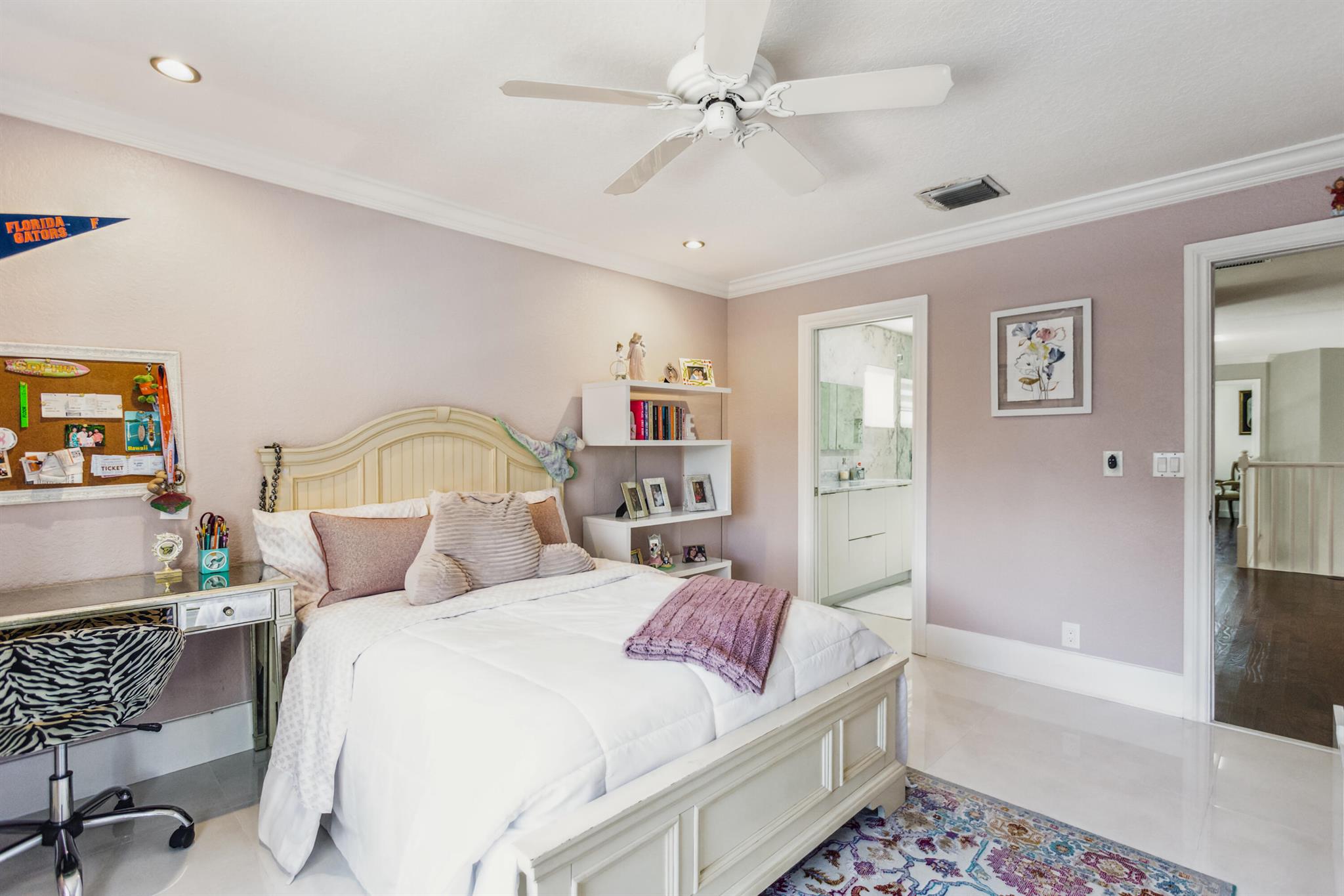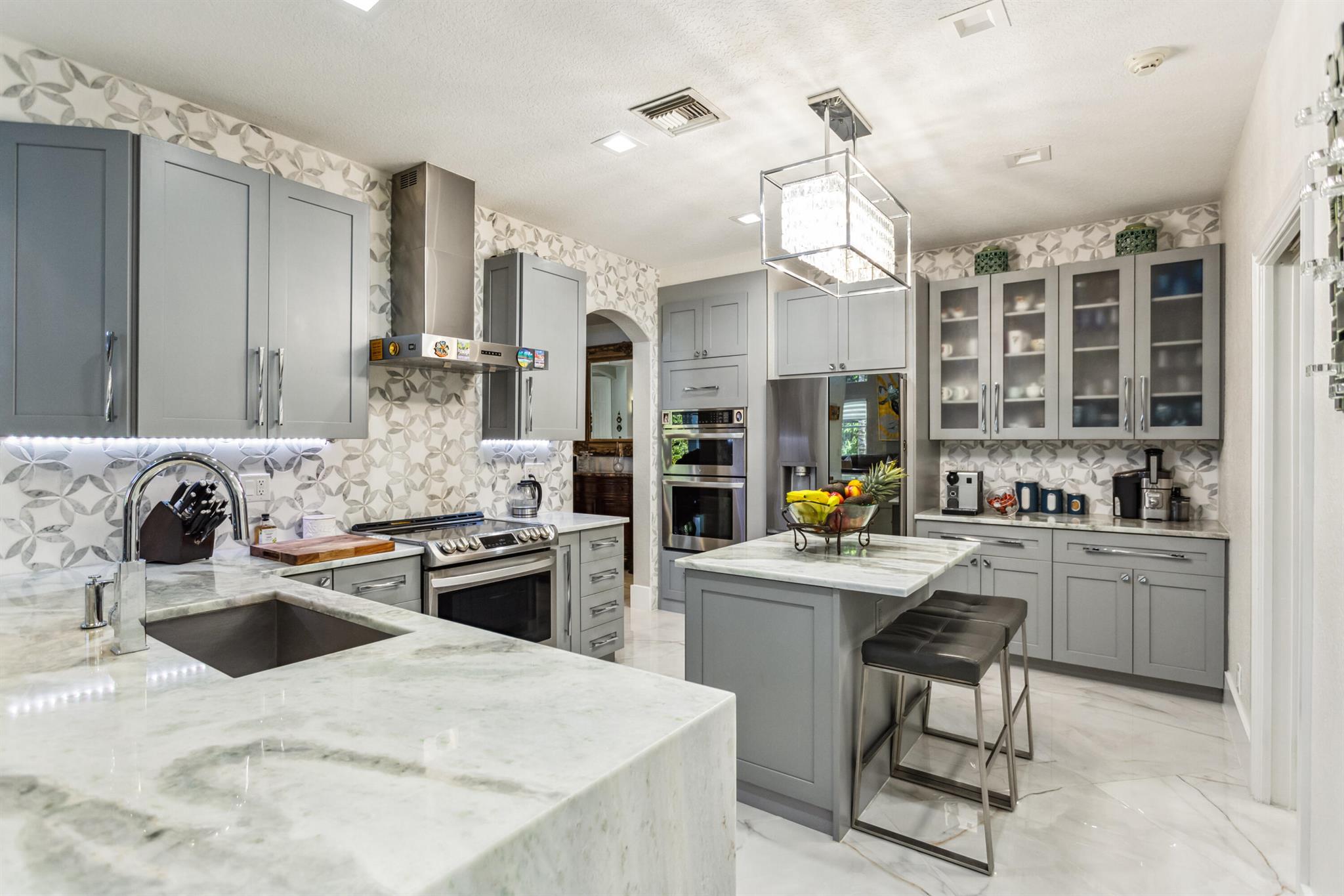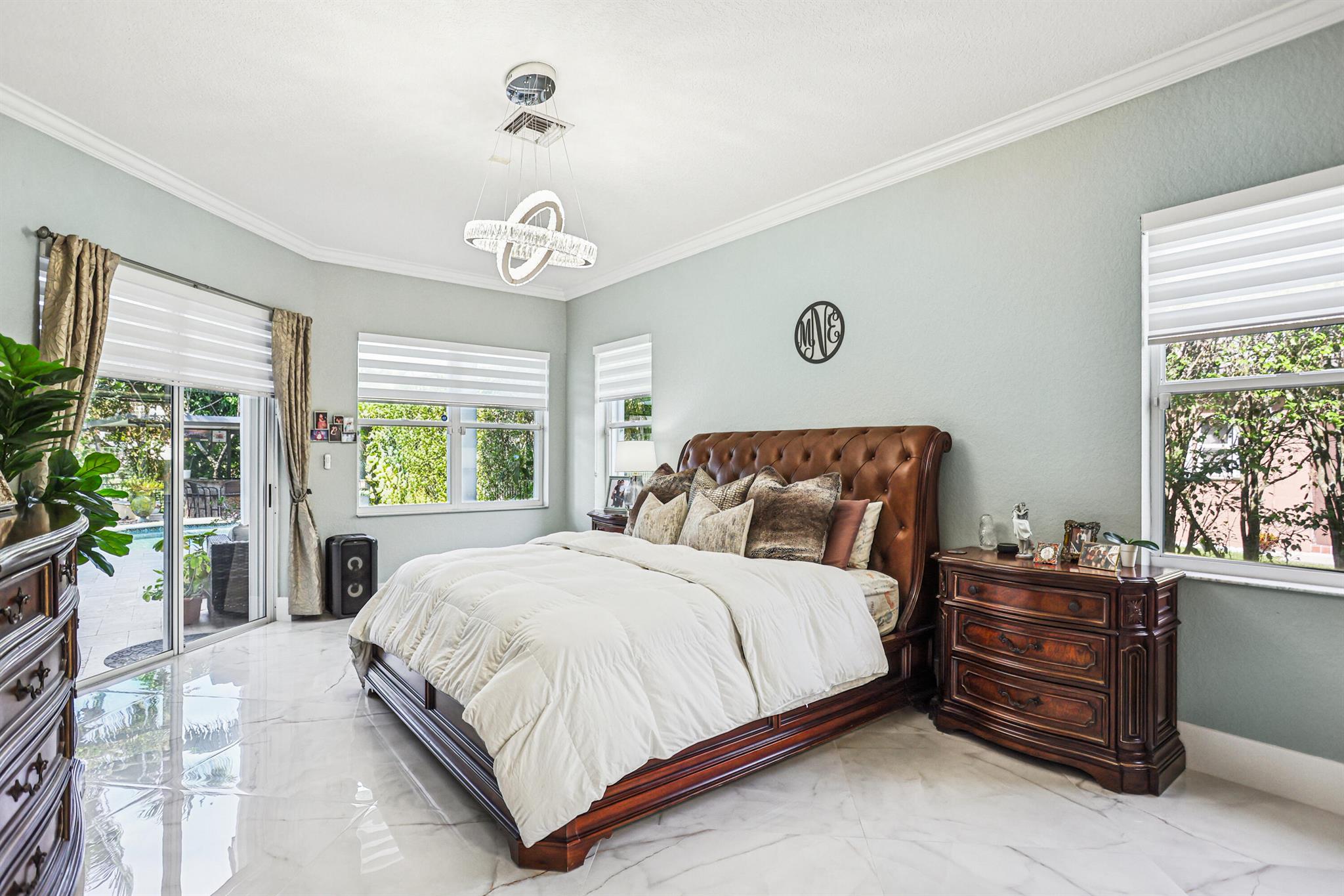 Step into timeless sophistication in this fully updated 4-bedroom + bonus room lakefront pool home in the prestigious gated community of Boca Falls. Tucked on a serene lot with no front neighbors, this residence blends luxury, comfort, and privacy. Inside, enjoy soaring ceilings, ceramic tile flooring throughout the main floor, and real wood floors upstairs. The bonus room includes a closet and offers versatility as a home office, guest suite, gym, or playroom. The chef's kitchen boasts quartzite countertops, premium appliances, and custom cabinetry. The primary suite features a spa-inspired bath and custom closets, while all bathrooms showcase upscale finishes and rainfall shower systems. Outdoors, relax or entertain by the resort-style PebbleTec pool and travertine patio.