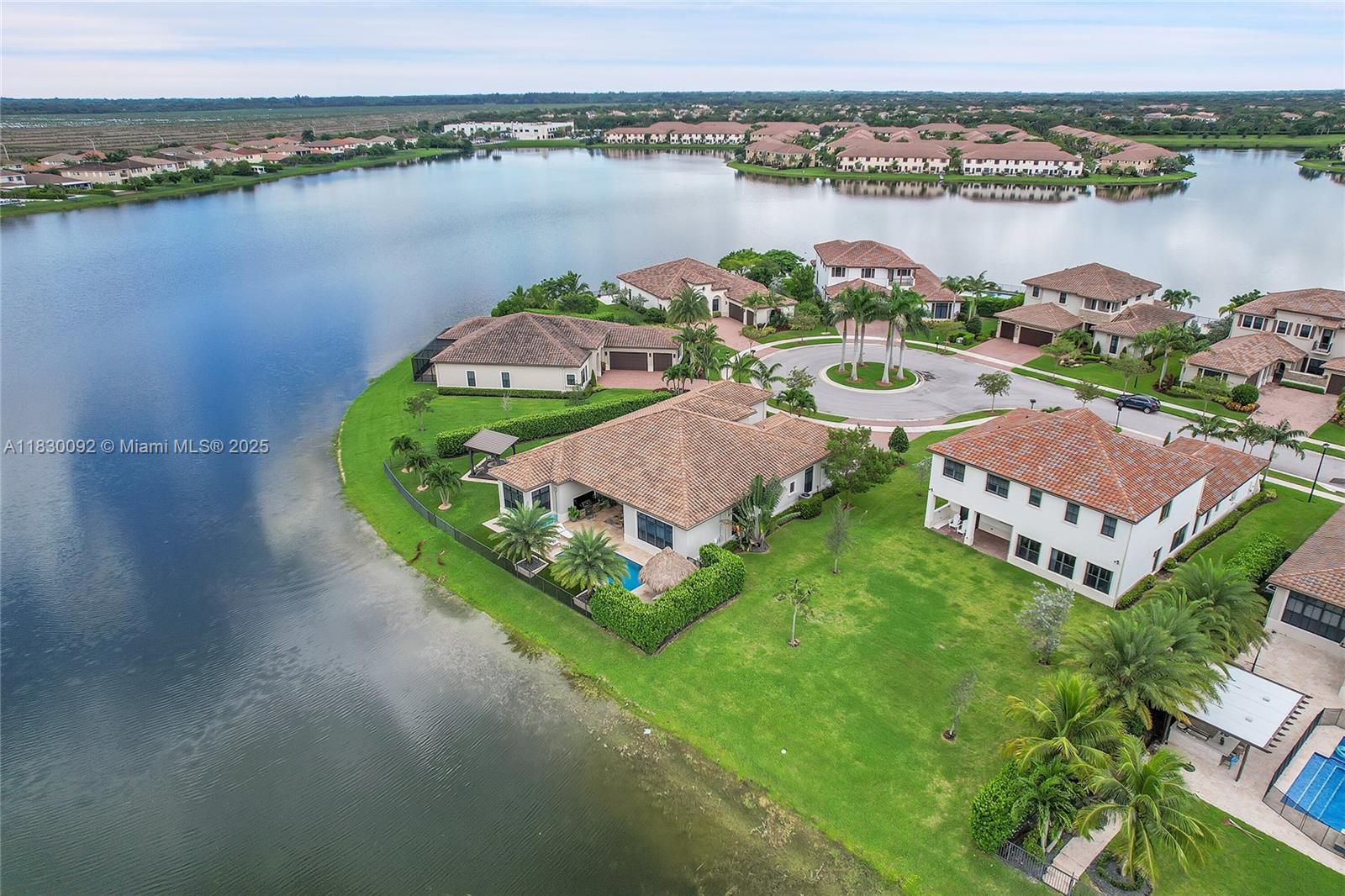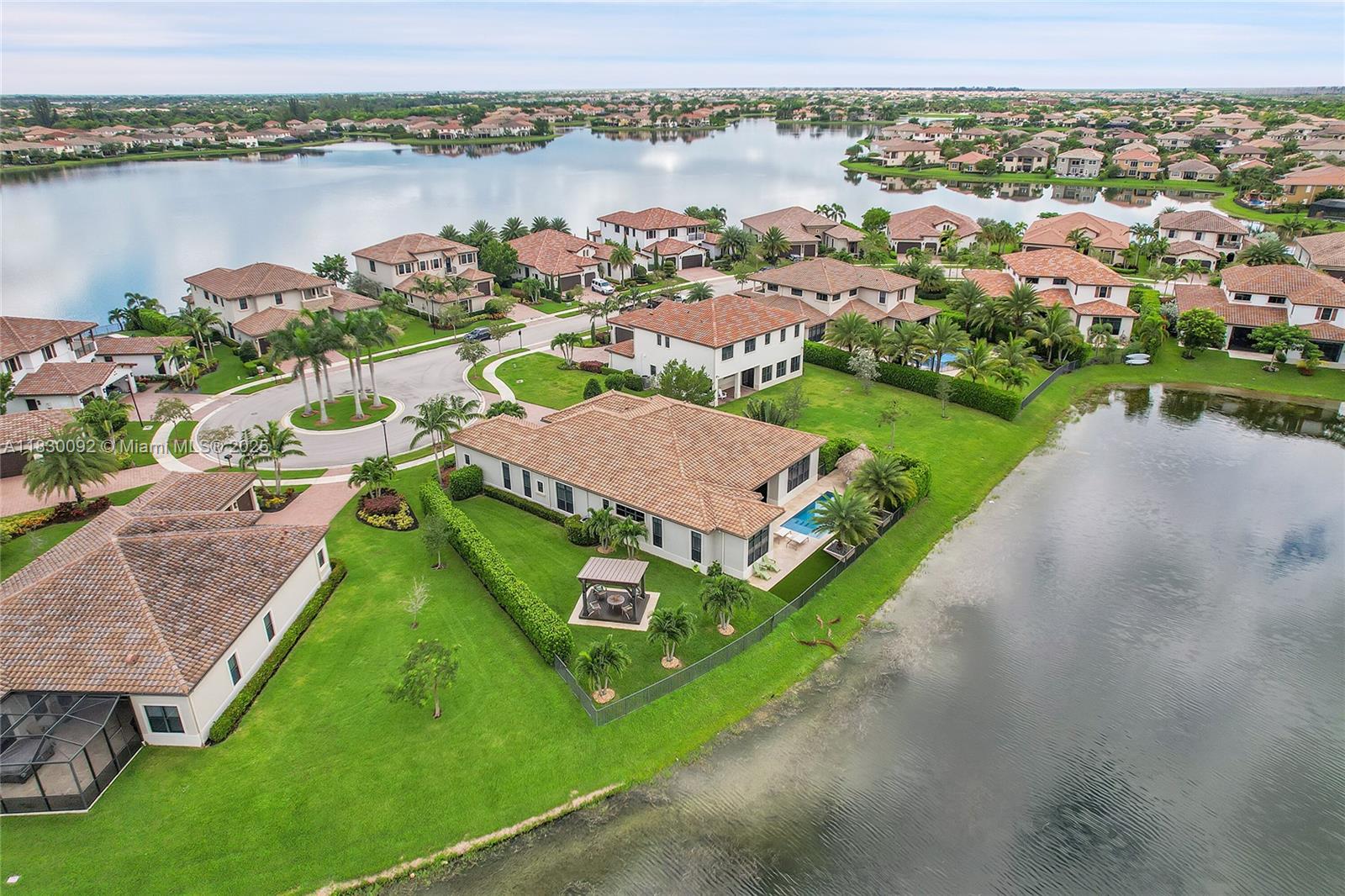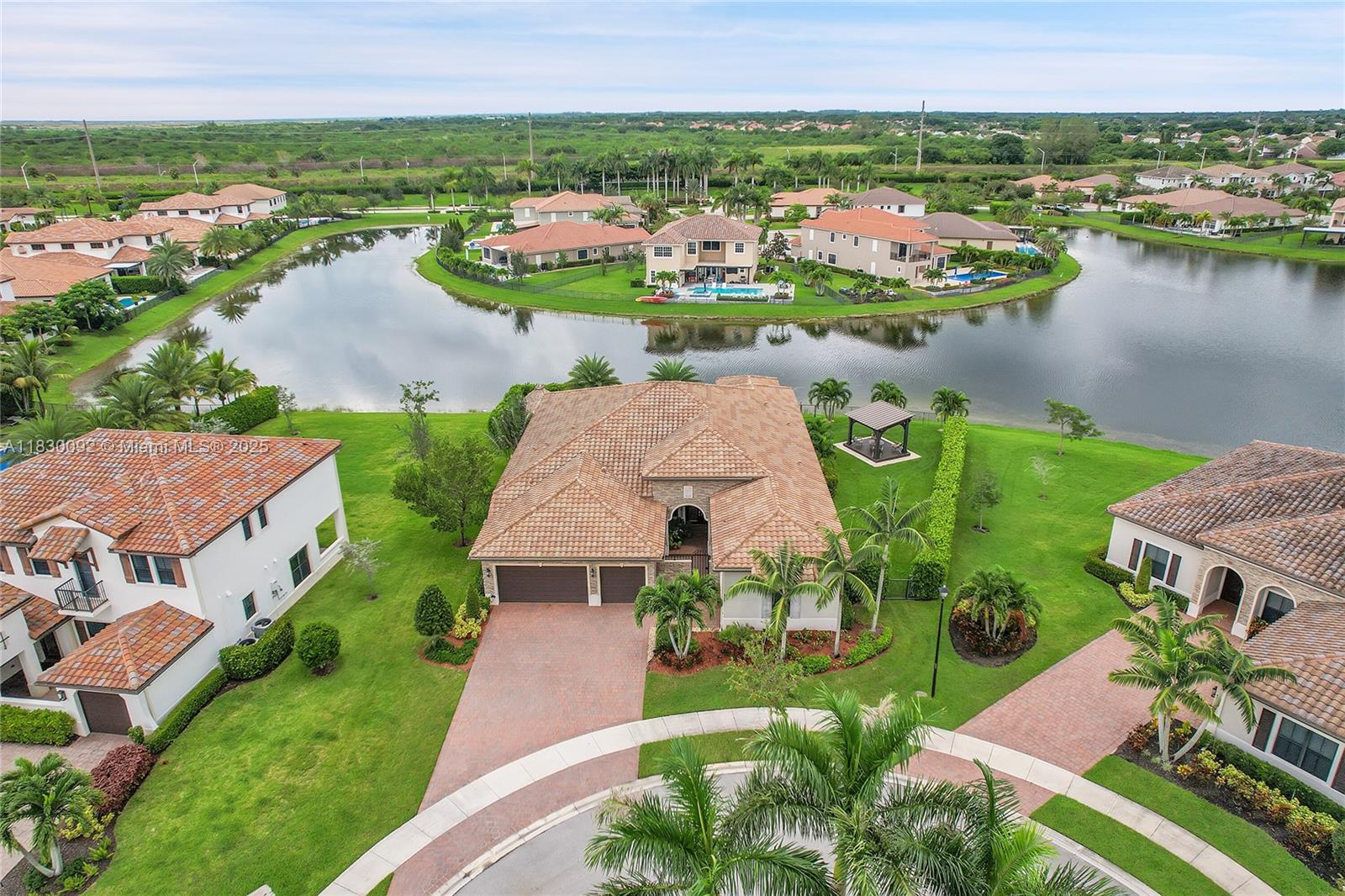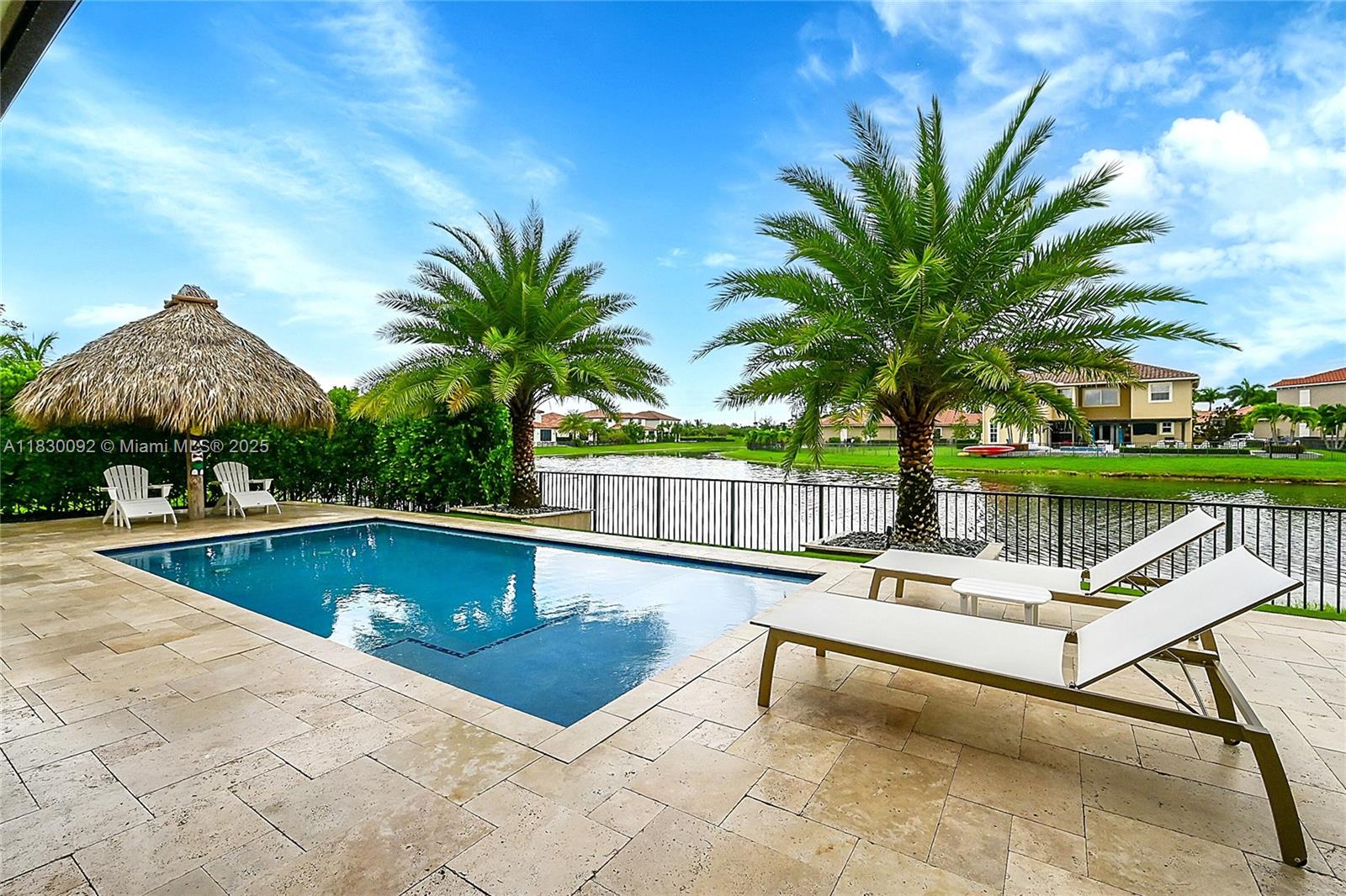 STUNNING one-story, semi-custom home on spacious, pie-shaped, cul-de-sac lot with 128ft of breathtaking water views! One of 28 premium lakefront homes built by CC Homes. This beautifully upgraded home boasts $300K of designer finishes and upgrades throughout this open concept, triple-split floor plan including soaring 12ft ceilings, high-end flooring and fixtures, plantation shutters, custom closets, electric fireplace and much more! Chef’s kitchen is perfect for entertaining or family meals. Tropical, private oasis backyard with sparkling salt pool, outdoor kitchen, tiki hut, gazebo, privacy shrubs and SWAT mosquito misting system. Exterior freshly painted in 2025! Enjoy 24/7 guard-gated security, 2 clubhouses w/resort pools, tennis/basketball courts, fitness center and more! MUST SEE!