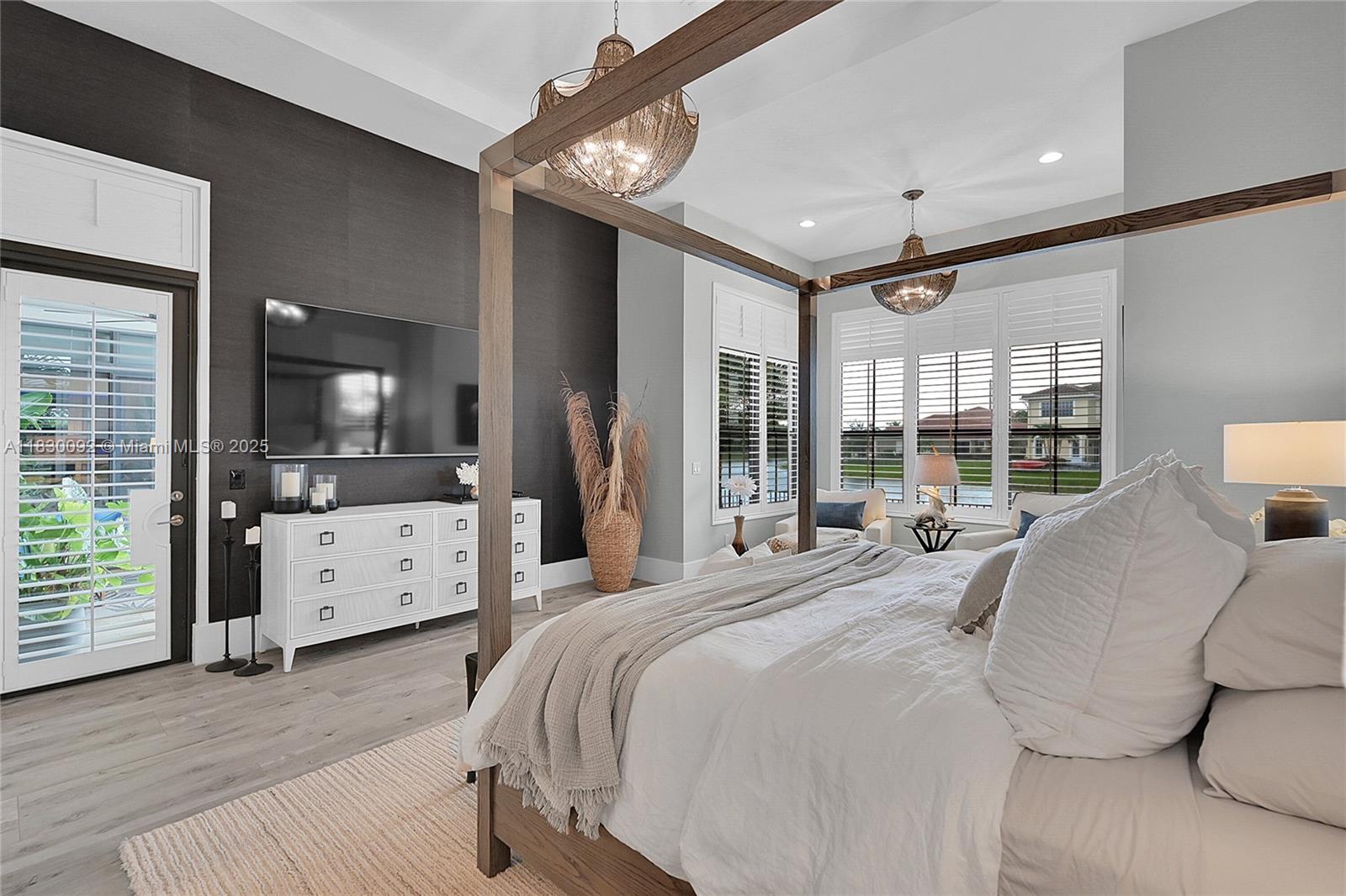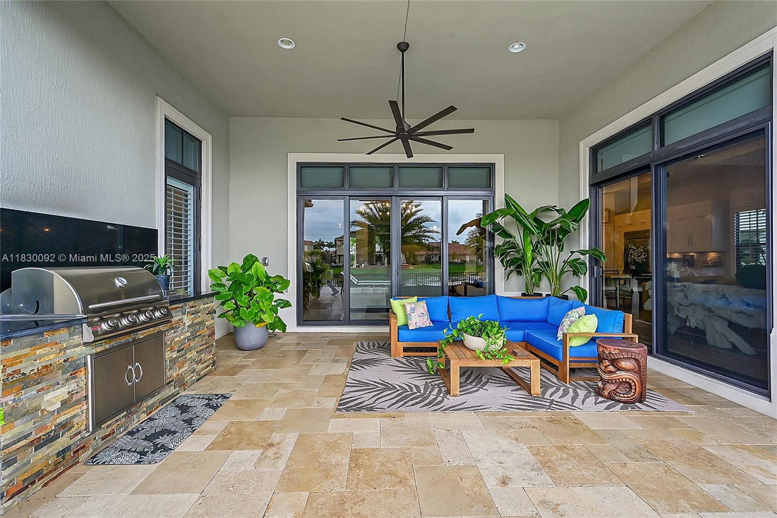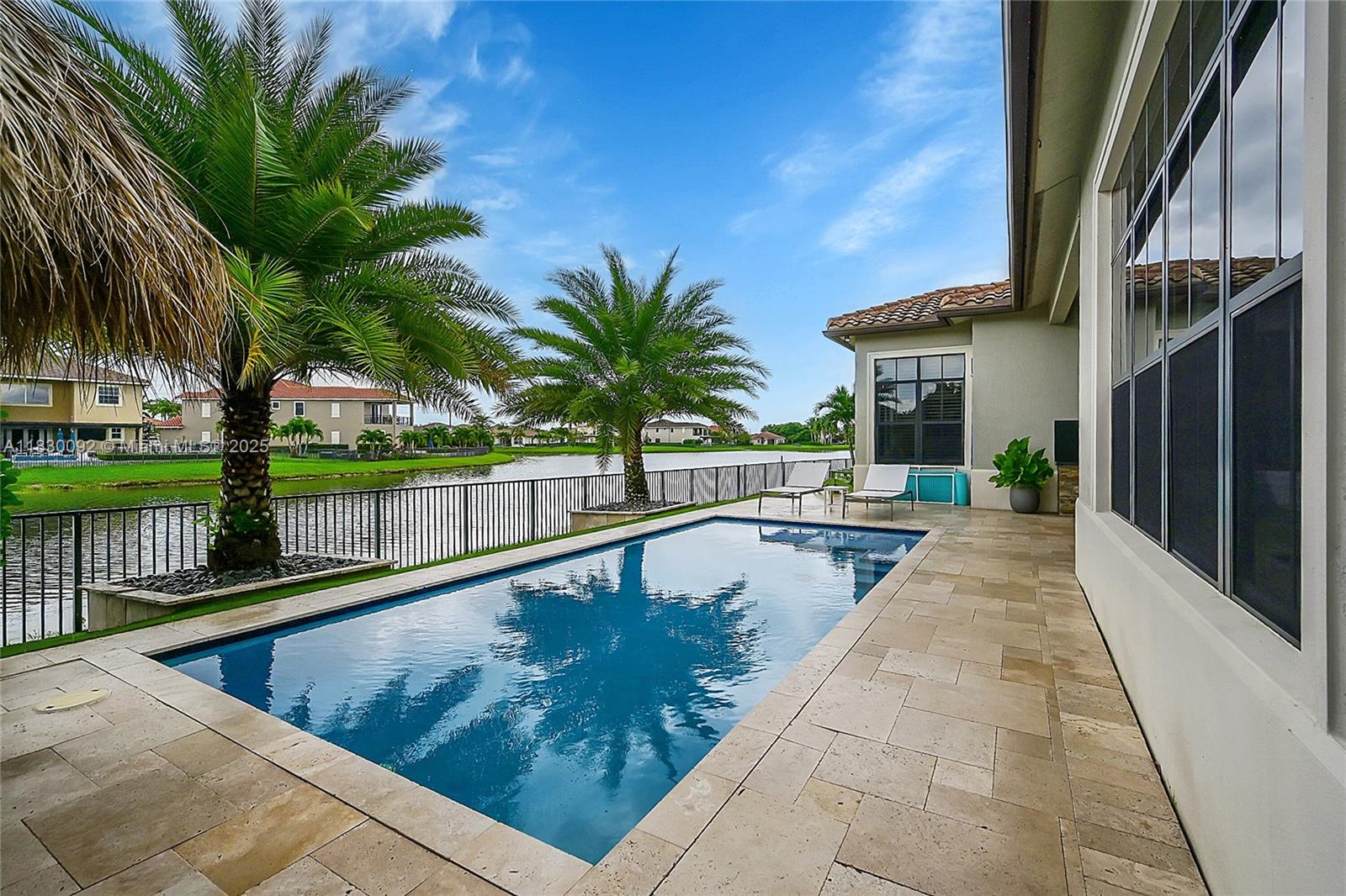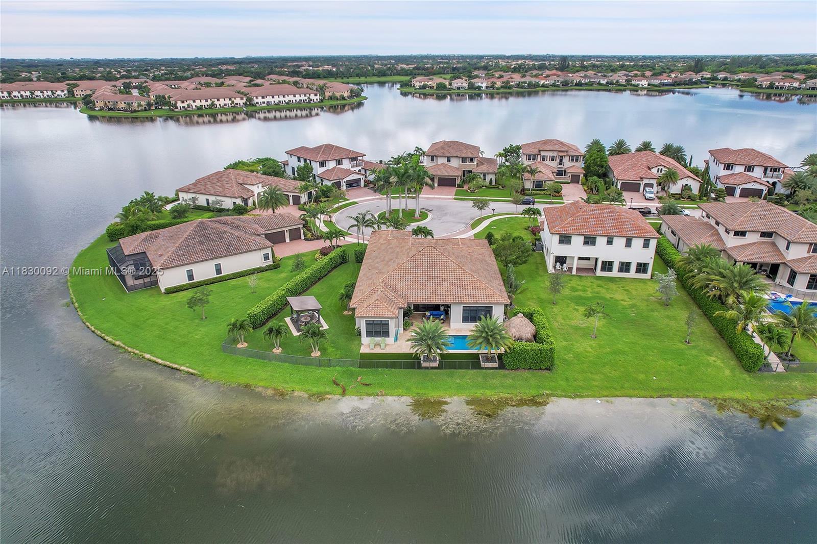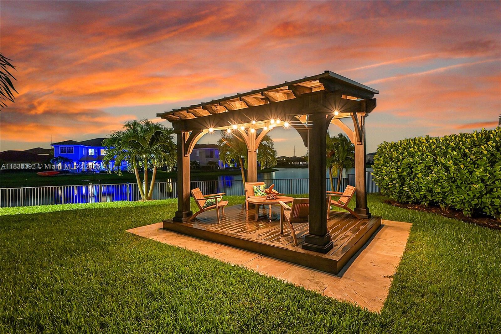 STUNNING one-story, semi-custom home on spacious, pie-shaped, cul-de-sac lot with 128ft of breathtaking water views! One of 28 premium lakefront homes built by CC Homes. This beautifully upgraded home boasts $300K of designer finishes and upgrades throughout this open concept, triple-split floor plan including soaring 12ft ceilings, high-end flooring and fixtures, plantation shutters, custom closets, electric fireplace and much more! Chef’s kitchen is perfect for entertaining or family meals. Tropical, private oasis backyard with sparkling salt pool, outdoor kitchen, tiki hut, gazebo, privacy shrubs and SWAT mosquito misting system. Exterior freshly painted in 2025! Enjoy 24/7 guard-gated security, 2 clubhouses w/resort pools, tennis/basketball courts, fitness center and more! MUST SEE!