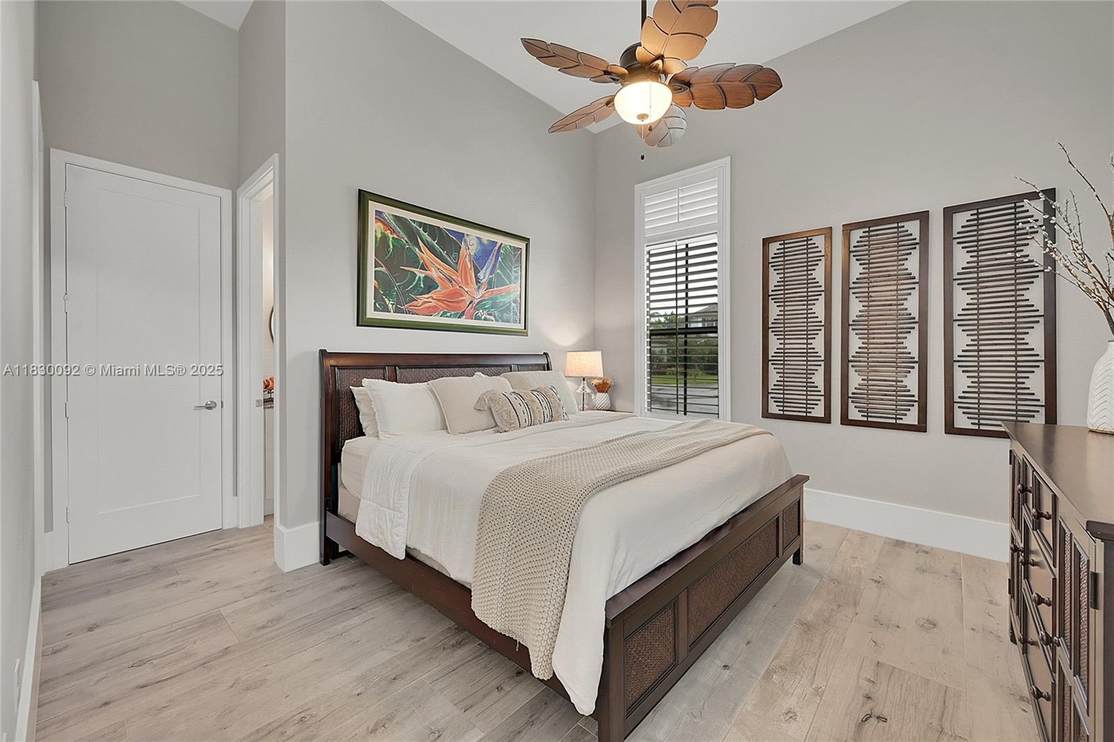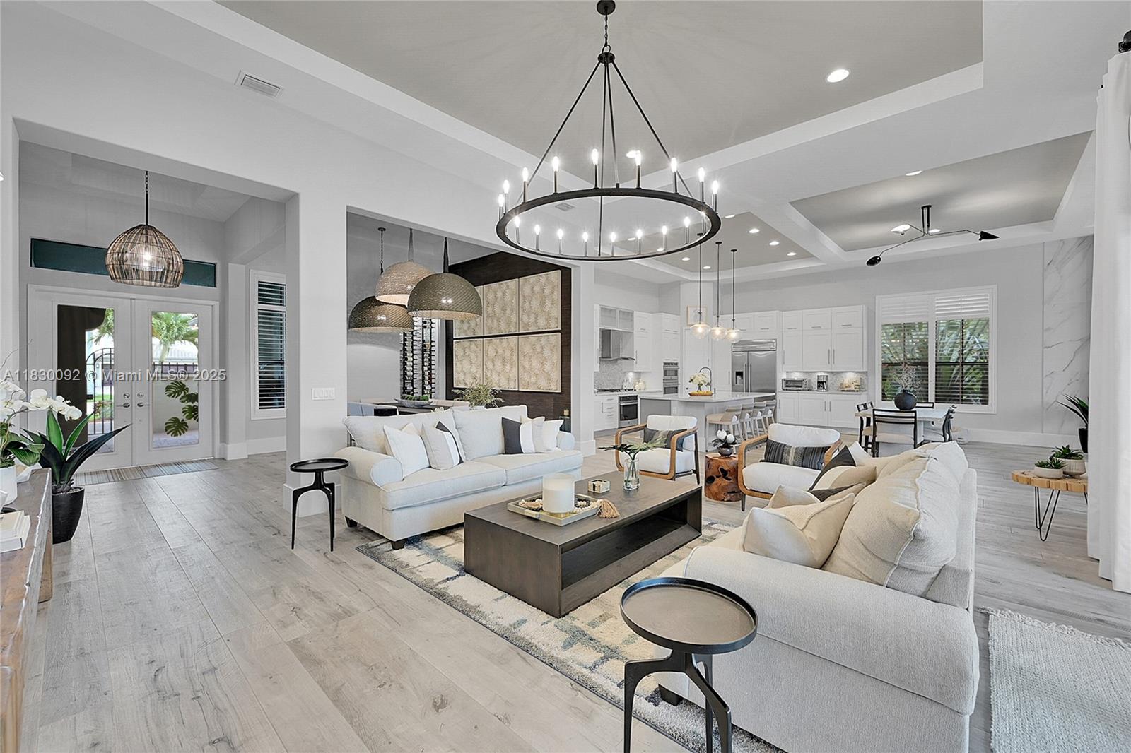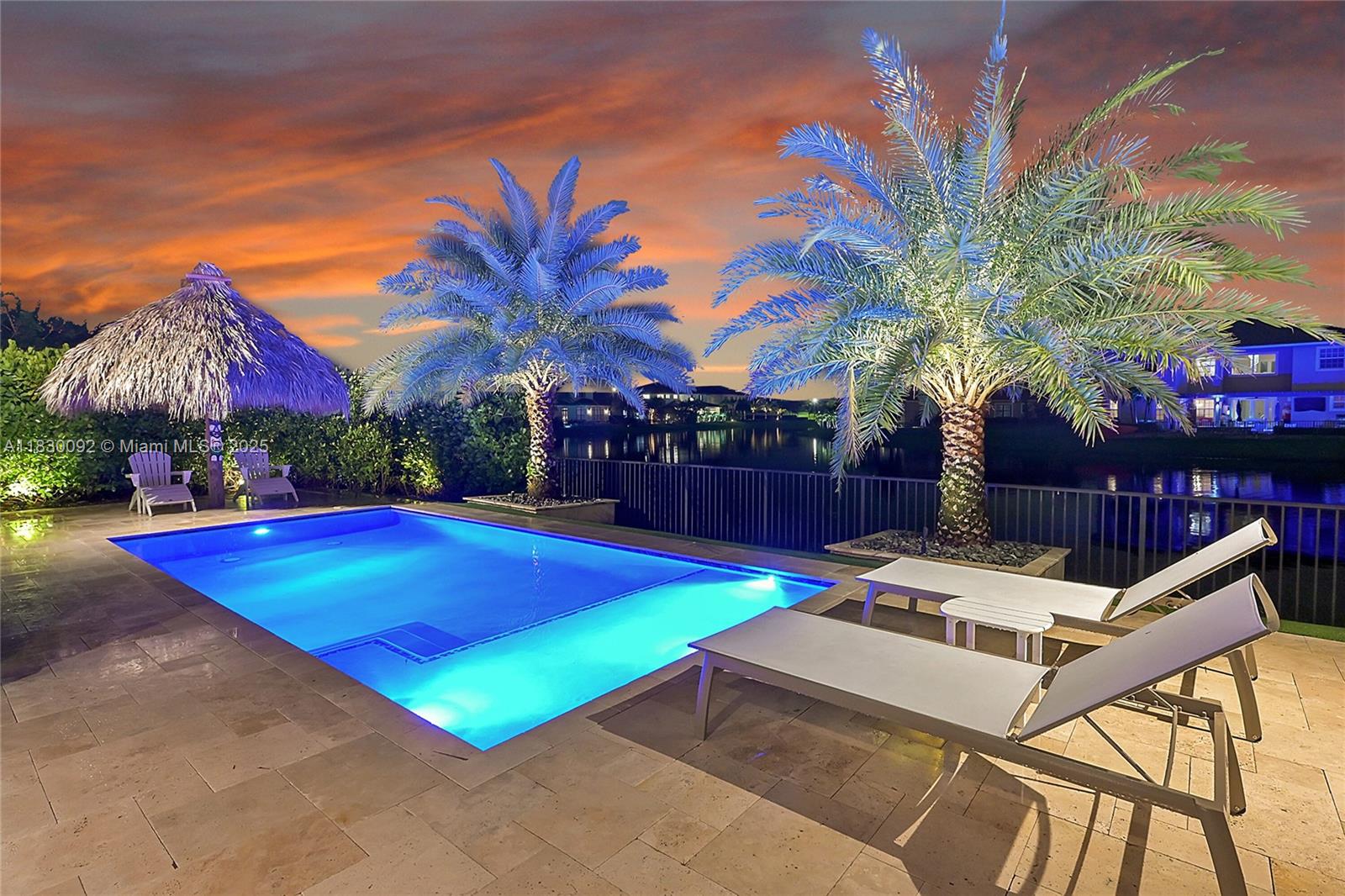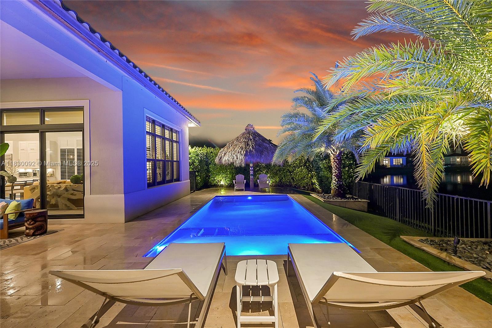 STUNNING one-story, semi-custom home on spacious, pie-shaped, cul-de-sac lot with 128ft of breathtaking water views! One of 28 premium lakefront homes built by CC Homes. This beautifully upgraded home boasts $300K of designer finishes and upgrades throughout this open concept, triple-split floor plan including soaring 12ft ceilings, high-end flooring and fixtures, plantation shutters, custom closets, electric fireplace and much more! Chef’s kitchen is perfect for entertaining or family meals. Tropical, private oasis backyard with sparkling salt pool, outdoor kitchen, tiki hut, gazebo, privacy shrubs and SWAT mosquito misting system. Exterior freshly painted in 2025! Enjoy 24/7 guard-gated security, 2 clubhouses w/resort pools, tennis/basketball courts, fitness center and more! MUST SEE!