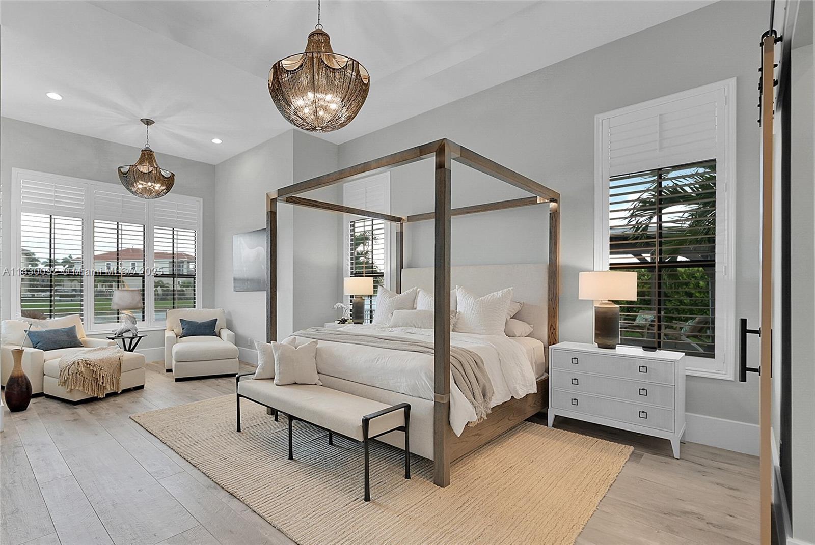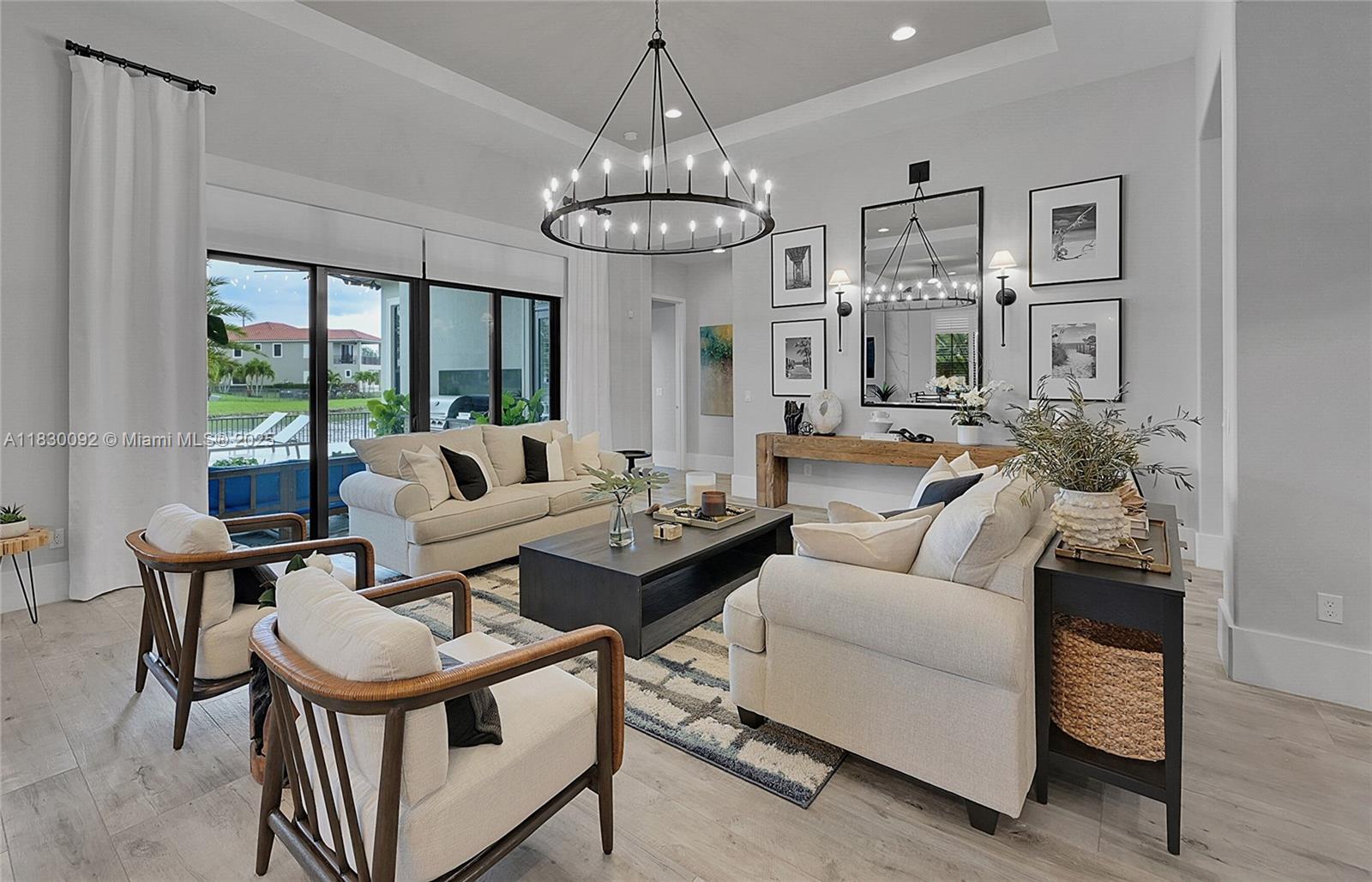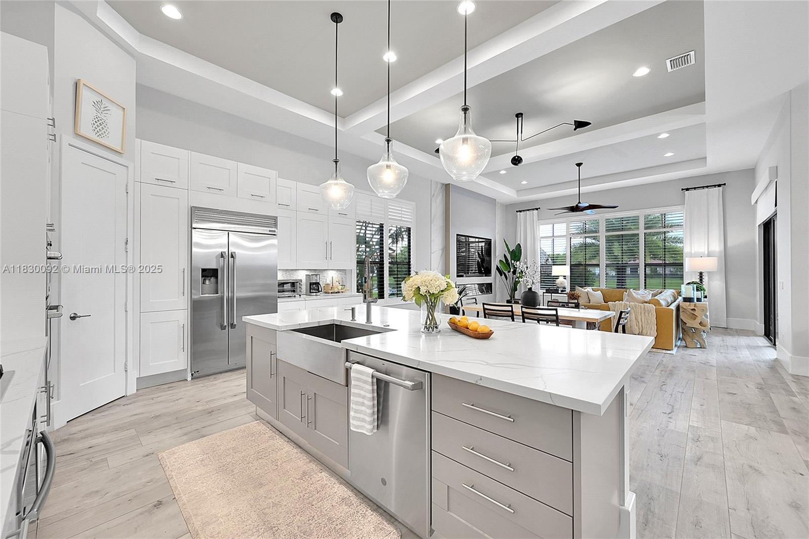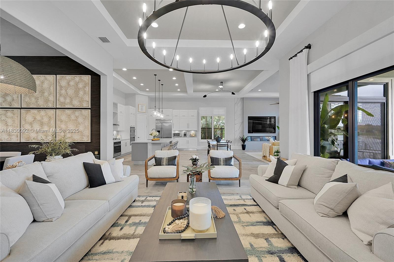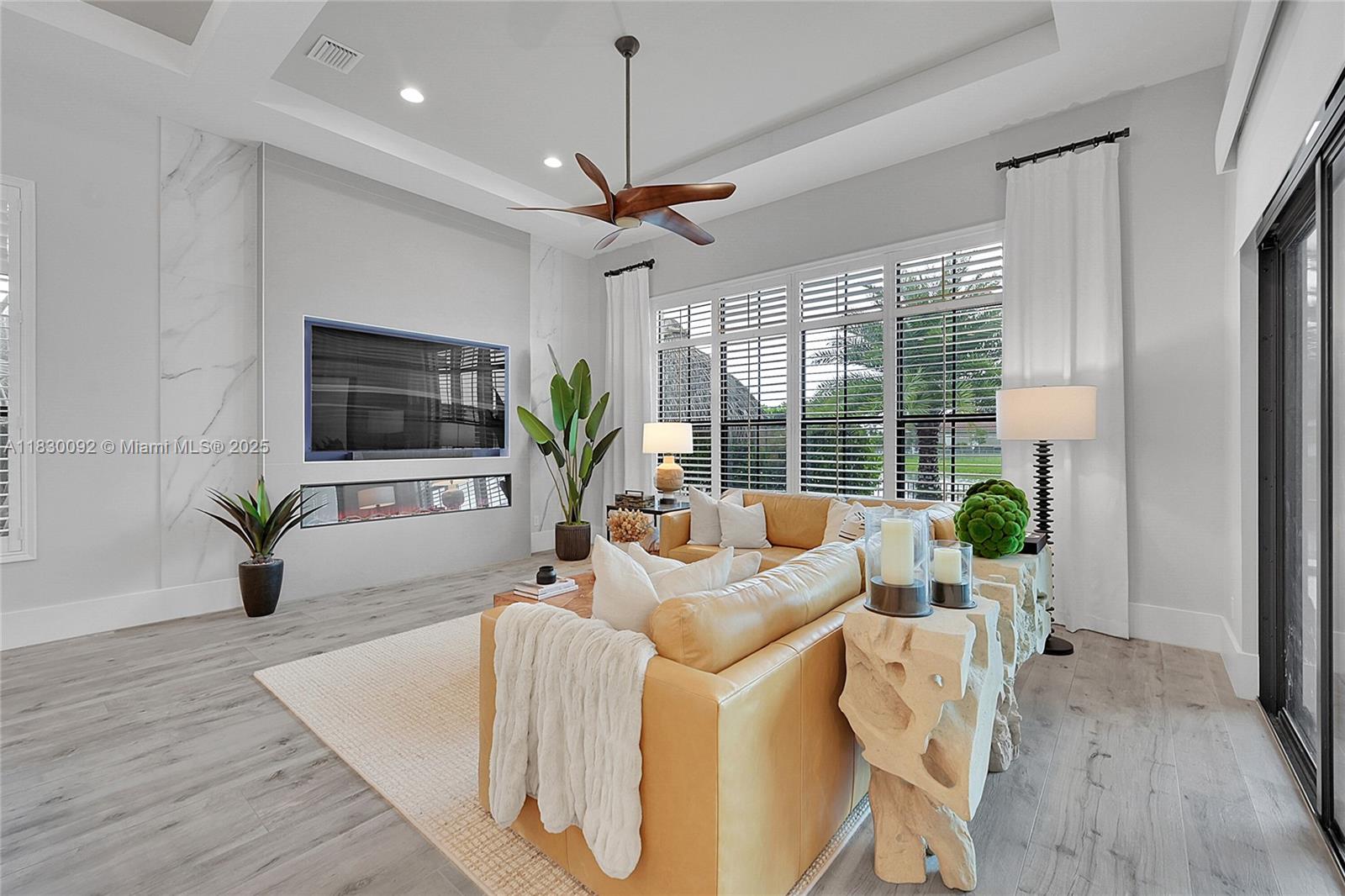 STUNNING one-story, semi-custom home on spacious, pie-shaped, cul-de-sac lot with 128ft of breathtaking water views! One of 28 premium lakefront homes built by CC Homes. This beautifully upgraded home boasts $300K of designer finishes and upgrades throughout this open concept, triple-split floor plan including soaring 12ft ceilings, high-end flooring and fixtures, plantation shutters, custom closets, electric fireplace and much more! Chef’s kitchen is perfect for entertaining or family meals. Tropical, private oasis backyard with sparkling salt pool, outdoor kitchen, tiki hut, gazebo, privacy shrubs and SWAT mosquito misting system. Exterior freshly painted in 2025! Enjoy 24/7 guard-gated security, 2 clubhouses w/resort pools, tennis/basketball courts, fitness center and more! MUST SEE!