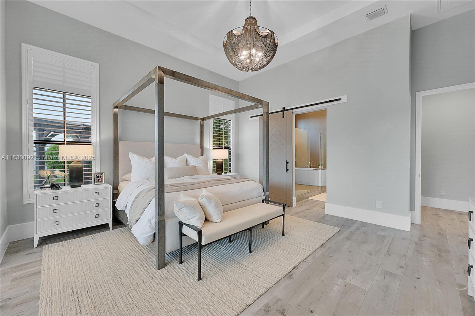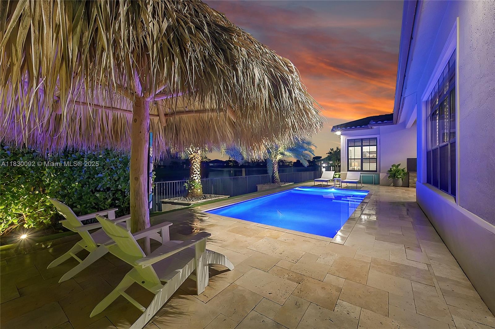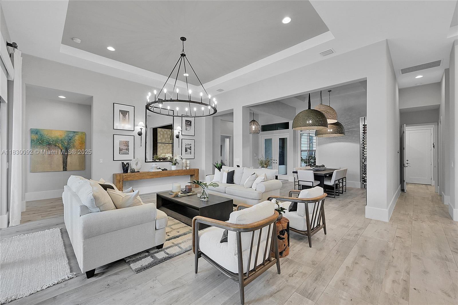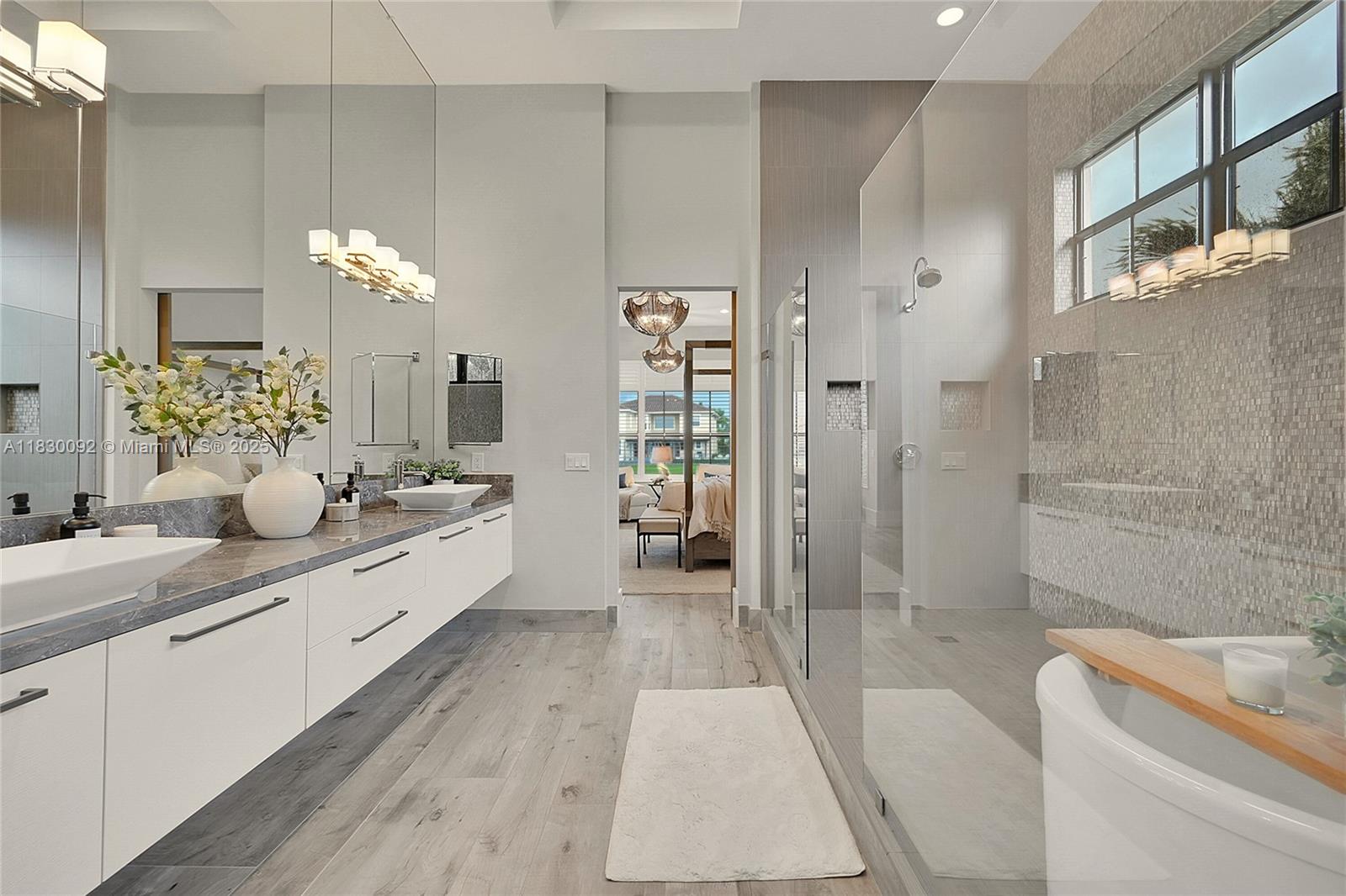 STUNNING one-story, semi-custom home on spacious, pie-shaped, cul-de-sac lot with 128ft of breathtaking water views! One of 28 premium lakefront homes built by CC Homes. This beautifully upgraded home boasts $300K of designer finishes and upgrades throughout this open concept, triple-split floor plan including soaring 12ft ceilings, high-end flooring and fixtures, plantation shutters, custom closets, electric fireplace and much more! Chef’s kitchen is perfect for entertaining or family meals. Tropical, private oasis backyard with sparkling salt pool, outdoor kitchen, tiki hut, gazebo, privacy shrubs and SWAT mosquito misting system. Exterior freshly painted in 2025! Enjoy 24/7 guard-gated security, 2 clubhouses w/resort pools, tennis/basketball courts, fitness center and more! MUST SEE!