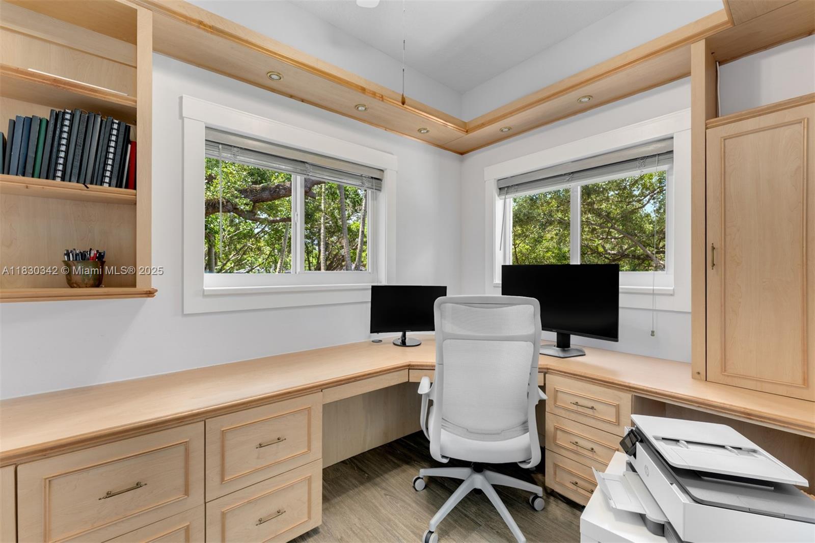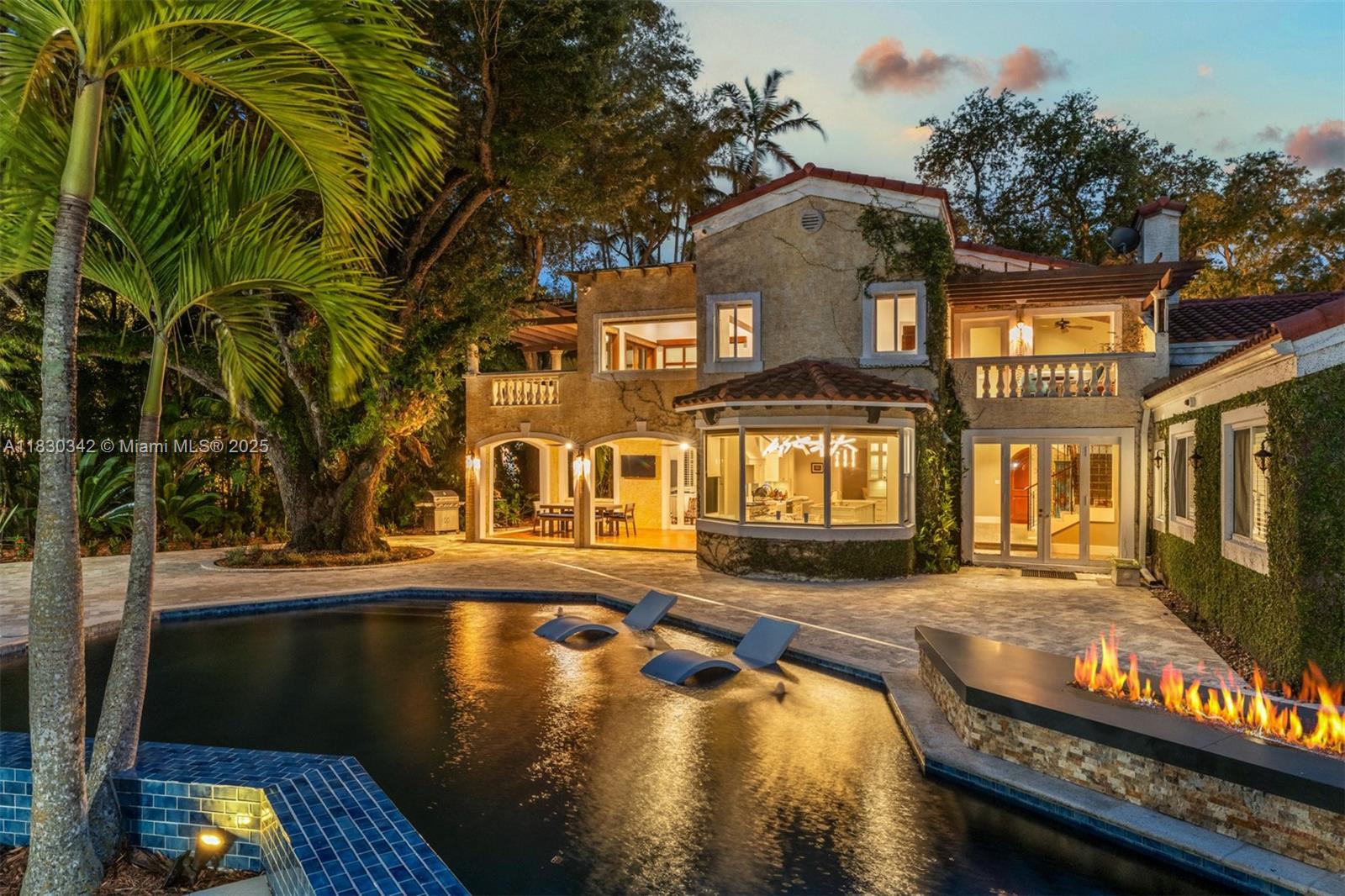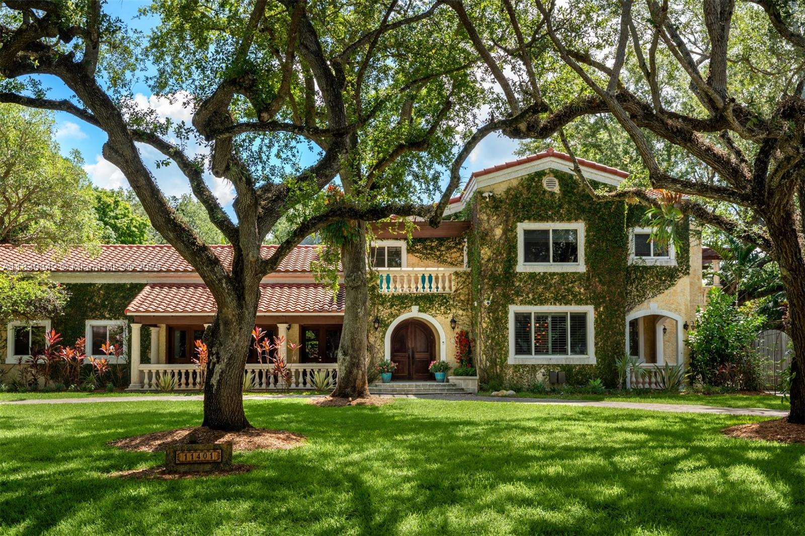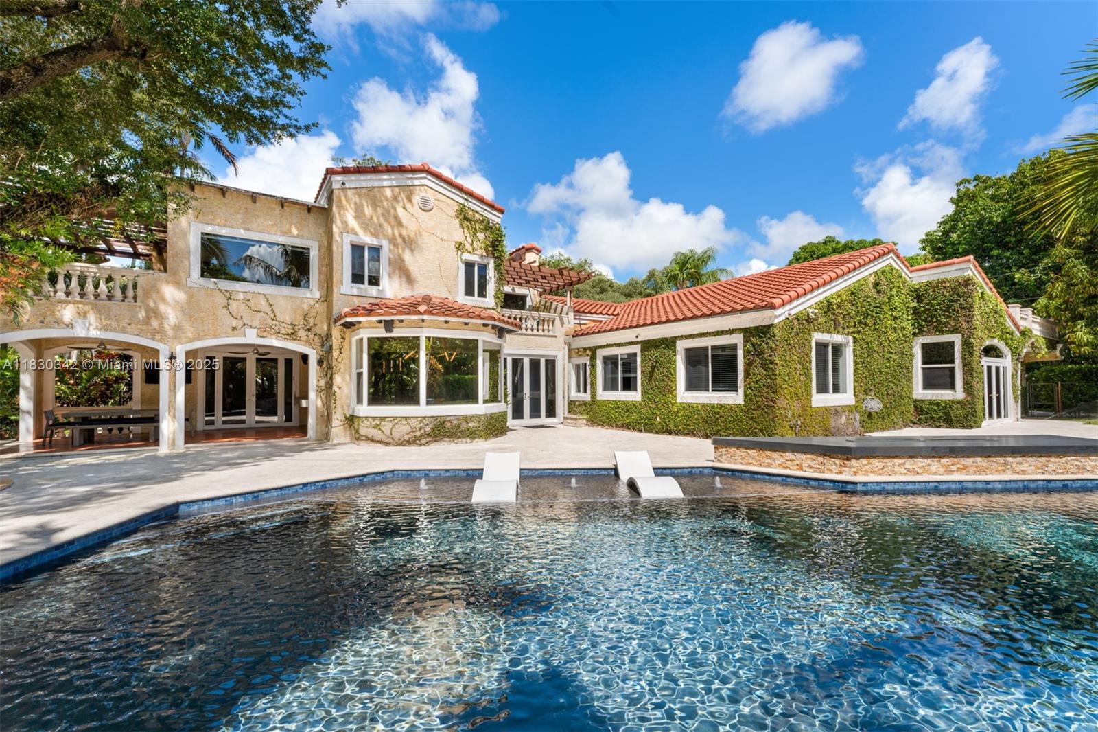 Stunning Mediterranean Revival home with ivy-covered facade on a tree-lined street in Pinecrest. This romantic estate features balconies and porches with balustrades, 6 beds, 5.5 baths including a service room. Renovated with porcelain floors, impact windows, resurfaced pool, and new clay barrel tile roof. The kitchen offers marble counters, wood cabinetry, Wolf/Subzero appliances, and a wine cellar. Breakfast area with bay window overlooks the pool/spa, lush palms, and fire pit. Upstairs primary suite has a dual shower, soaking tub, and walk-in closet. Formal living room with wet bar and wood-burning fireplace.