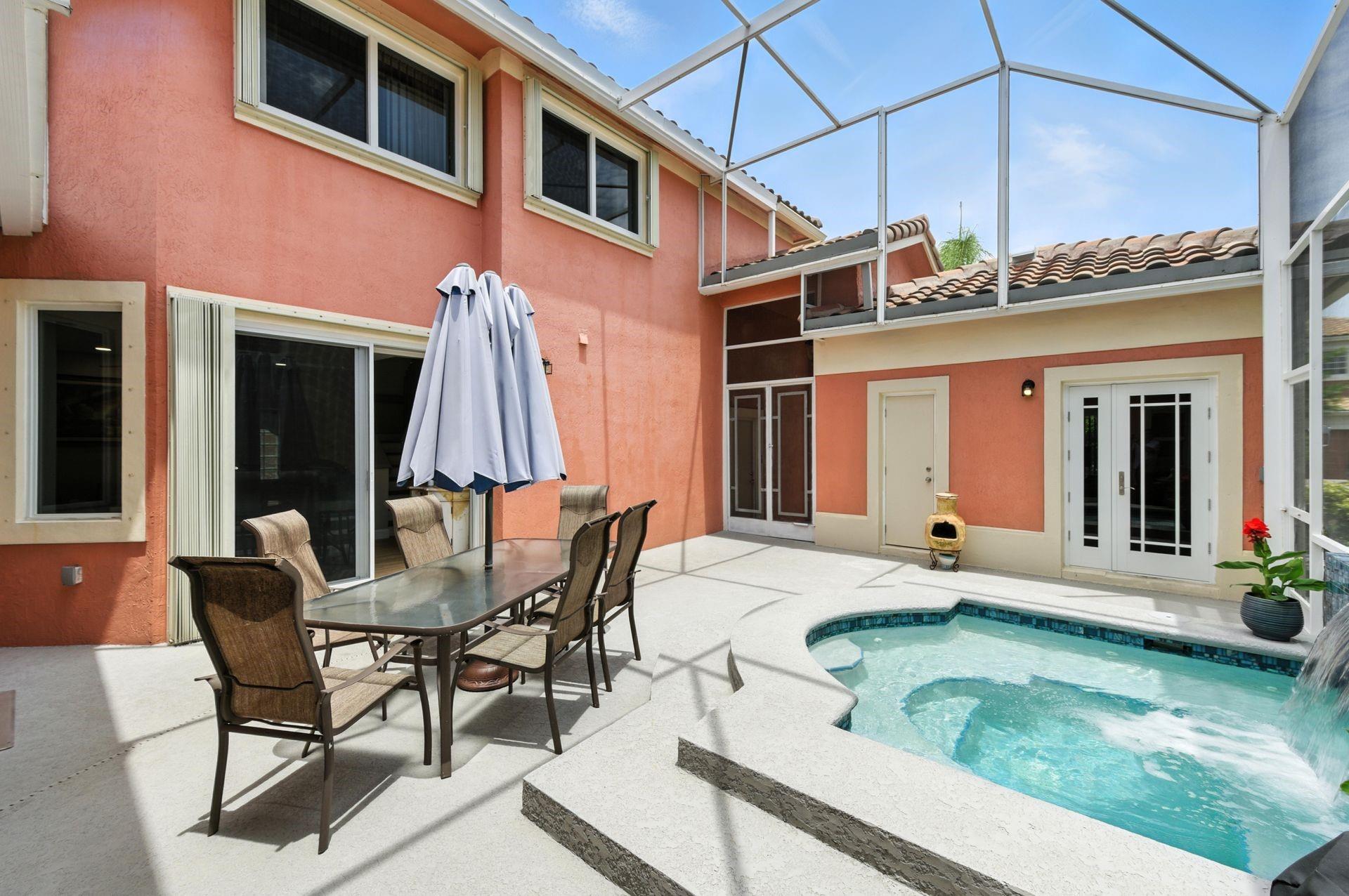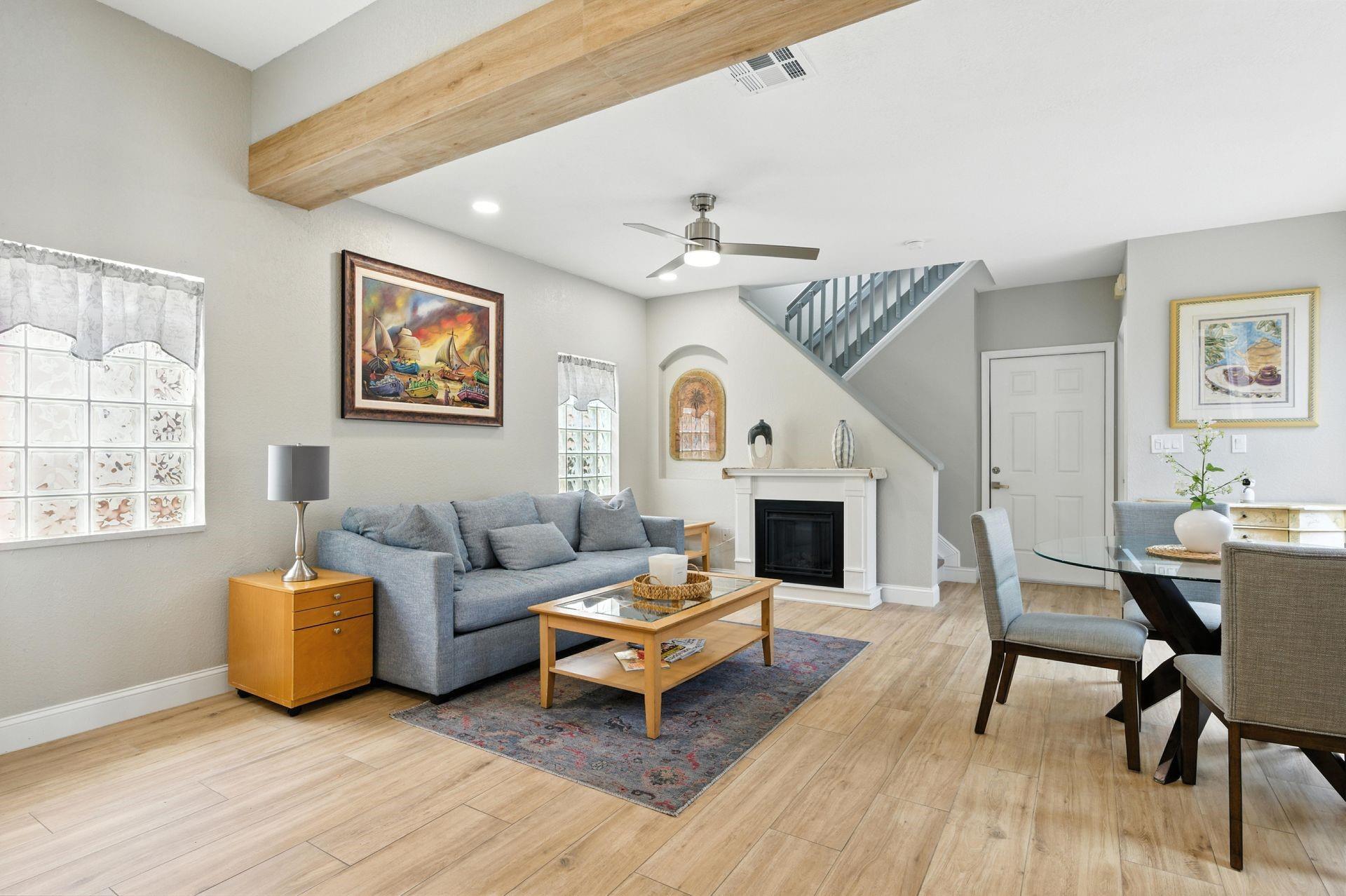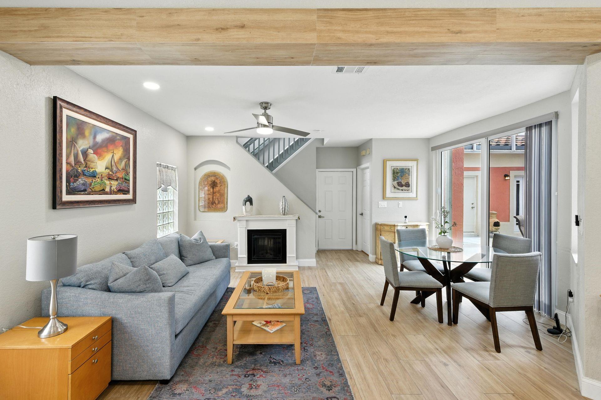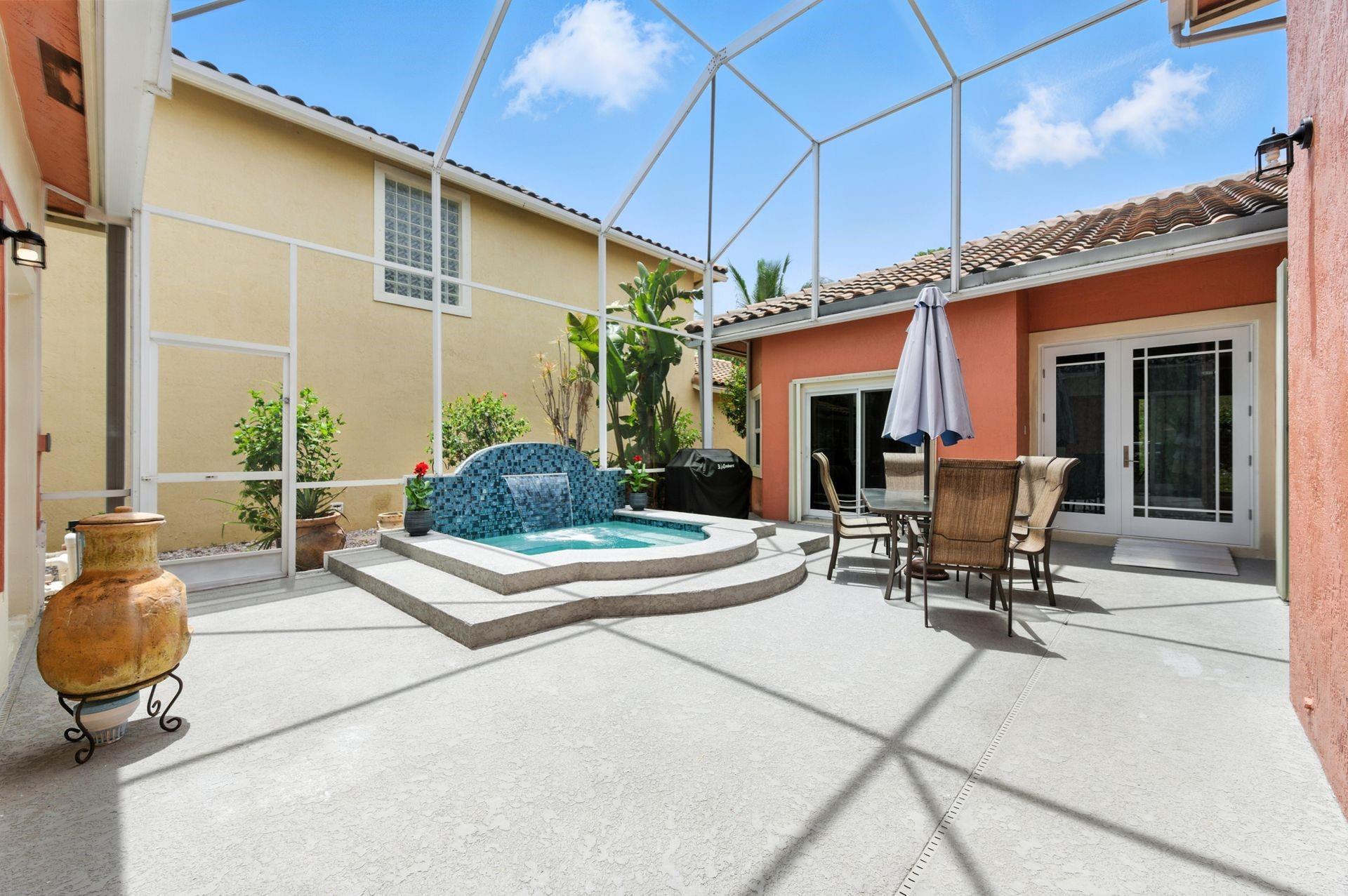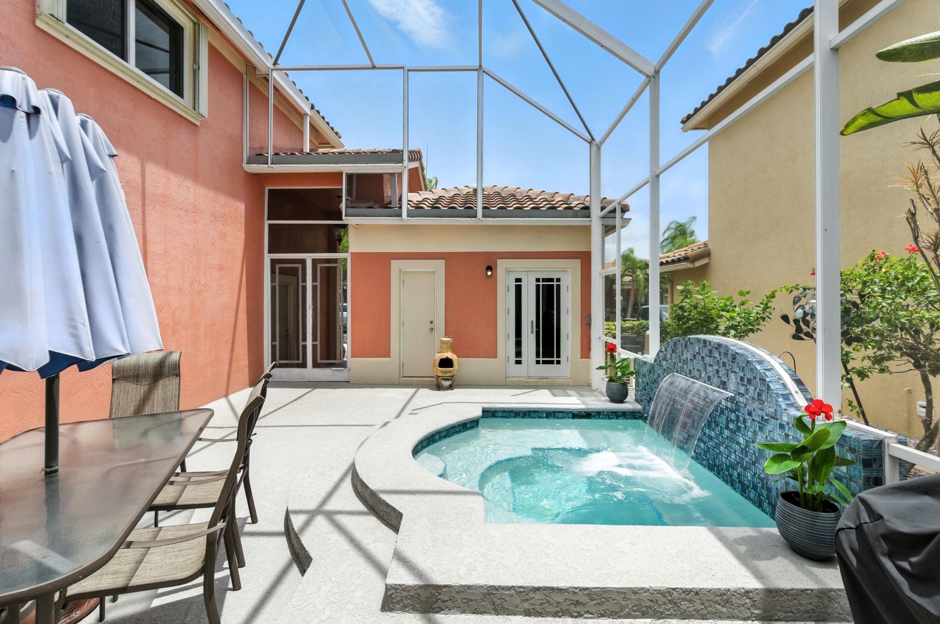 Discover this beautifully updated courtyard home offering complete privacy. The main house features 3 bedrooms, 2.5 baths, with a downstairs primary suite. A separate attached suite provides an additional bedroom and bath—perfect for guests or in-laws. Enjoy a stunning open kitchen, renovated bathrooms, and elegant tile flooring throughout. Impact windows/doors and a newer roof provide peace of mind. The courtyard boasts generous entertaining space with a plunge pool and tranquil water feature.