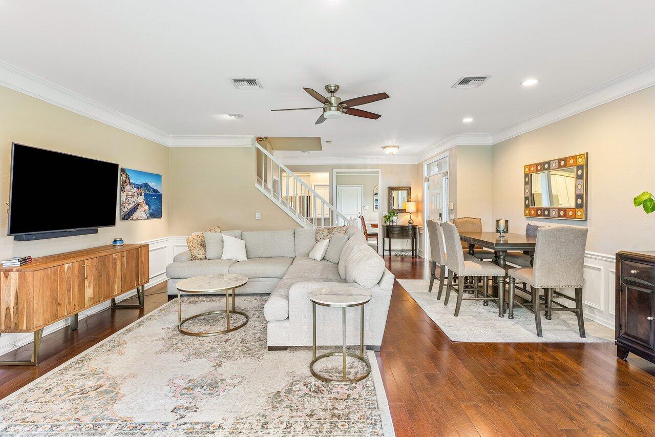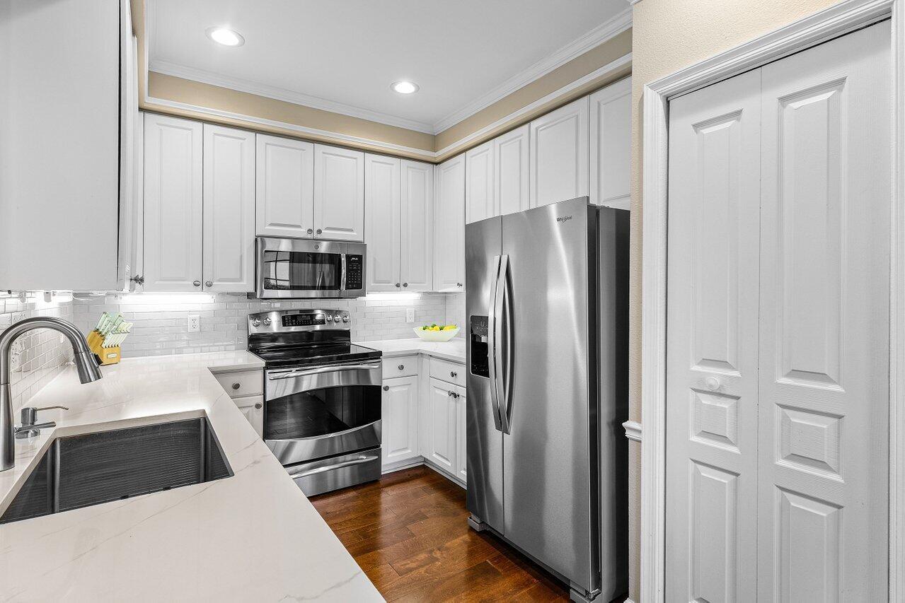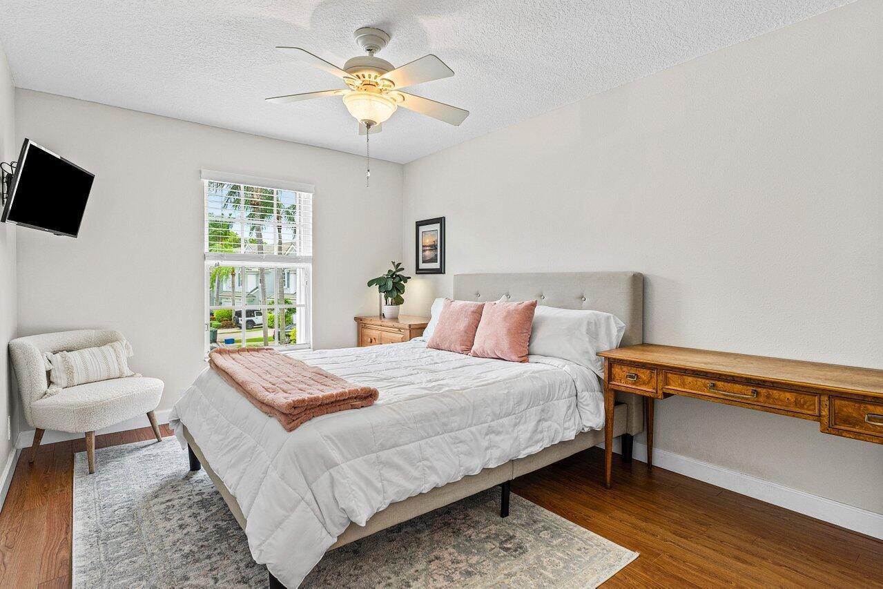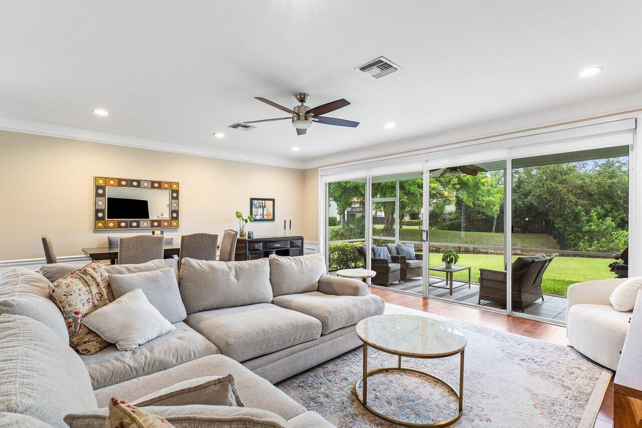 One of the Best Locations within the Community, Stylishly Updated 3 bedroom Corner Townhome w/ Southern Exposure, located just minutes from Town Center Mall, Dining, and Walking Distance to the Boca Raton Swim and Racquet Community Center. Features a Spacious 2-Car Garage with EV Charger, a Renovated Kitchen w/ Quartz Countertops, Engineered Wood Flooring throughout. The Primary Bedroom offers Vaulted Ceilings, and the Spa Inspired Bath includes a Double Vanity with Soaking Tub. Renovated Guest Bath & Powder Room, Enjoy the Covered Screened Patio with No Rear Neighbors Desirable Southern Exposure, Perfect for Entertaining. Situated in a Quiet, Gated Community and Zoned for Top-Rated Boca Raton Schools. This Townhouse Offers the Ideal blend of Style, Function, and Unbeatable Location