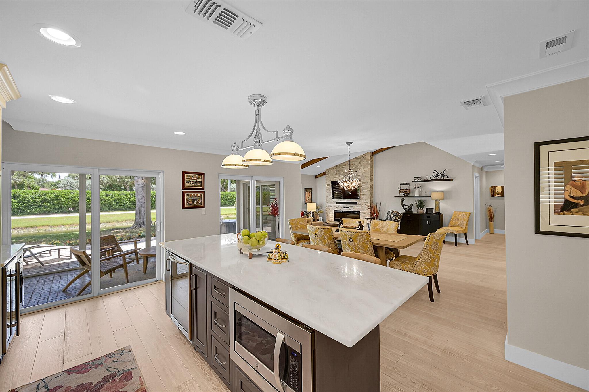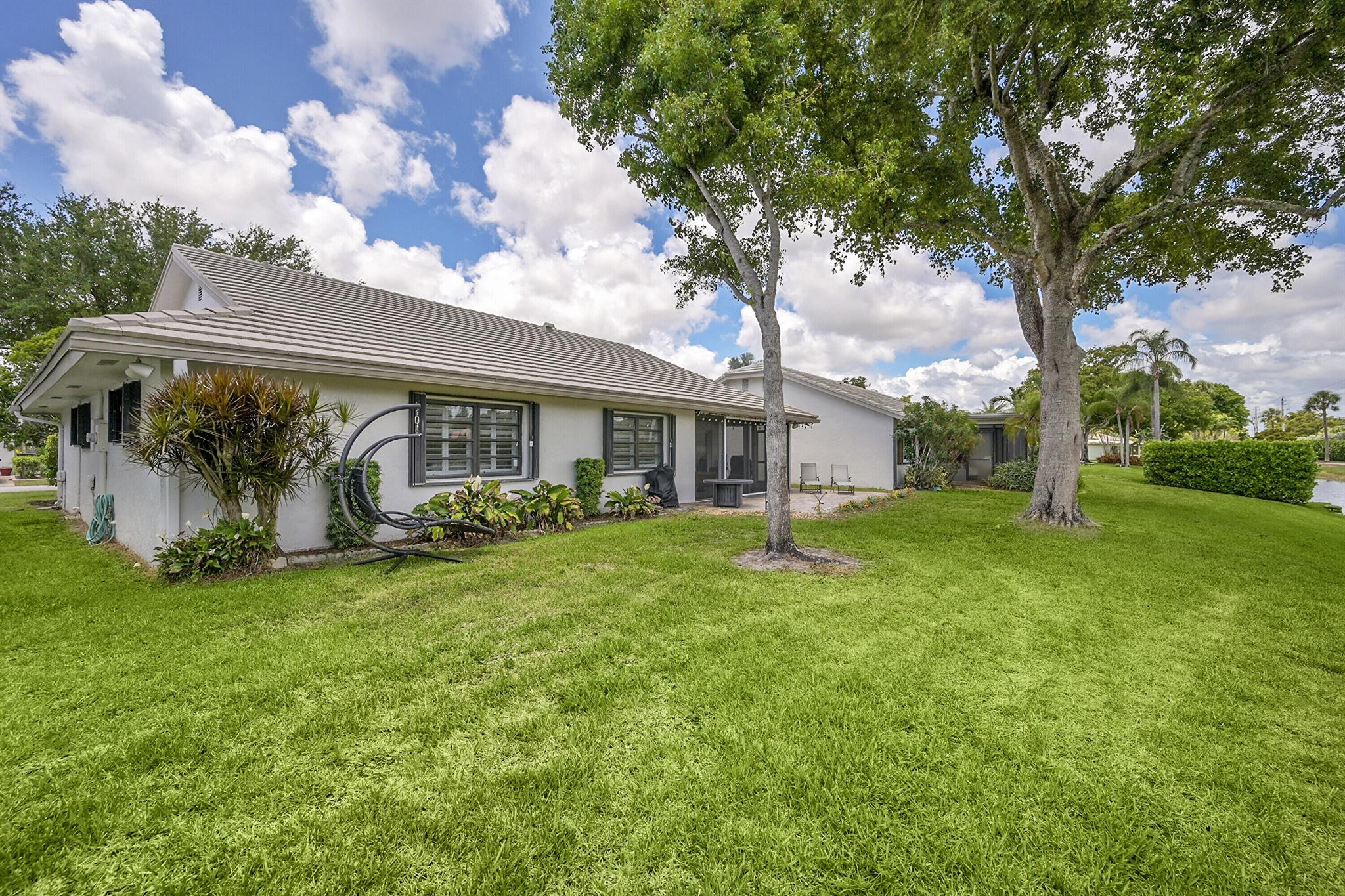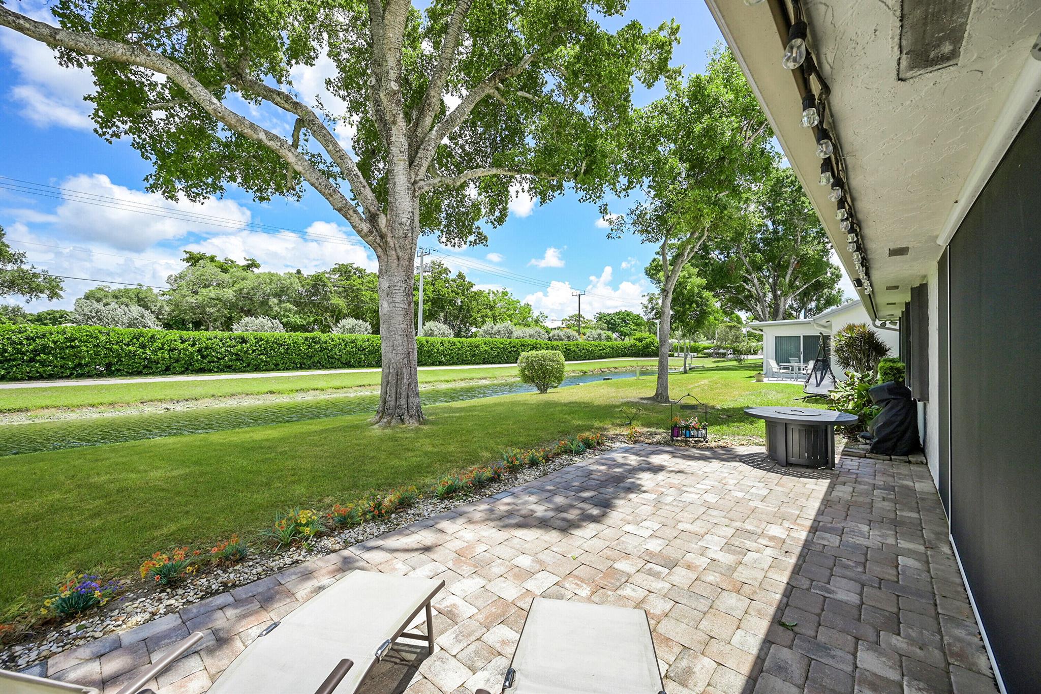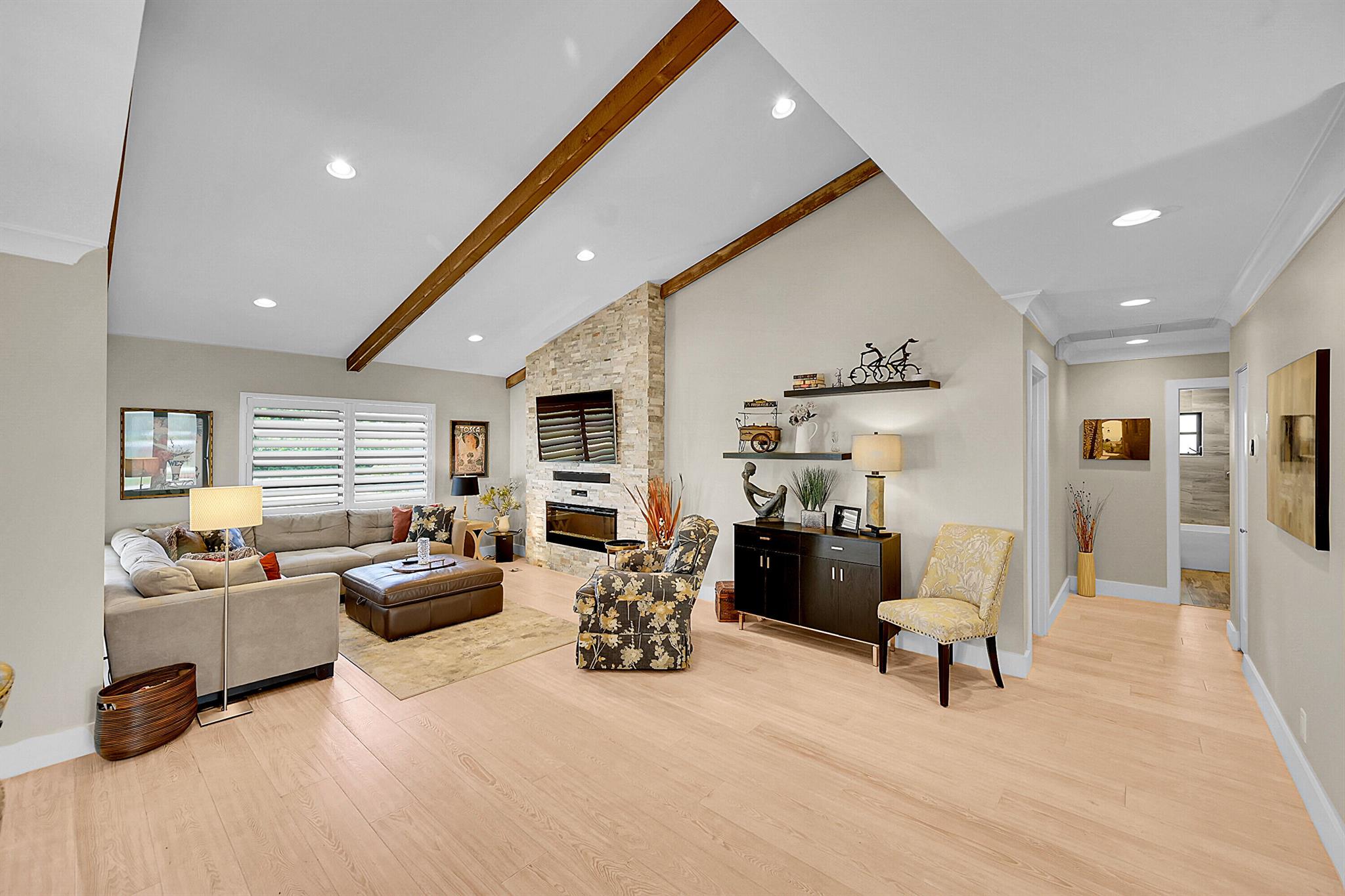 Located in the highly sought-after community of Camino Woods in central Boca Raton, this exquisitly upgraded 3-bedroom, 2-bath home offers an open living area with vaulted ceilings. The kitchen features a center island with quartz countertops, wine bar, & wine fridge. Enjoy the cozy ambiance of a decorative electric fireplace and the elegance of plantation shutters throughout, while the updated baths include a main bathroom with double sinks & a sleek glass-enclosed shower. A separate laundry room & a 2 car garage add convenience. Step outside to a paved patio & enjoy serene water views from the private backyard--perfect for relaxing or entertaining. This 55+ community is just 5 miles from the beach & has a community pool & clubhouse. HOA fee of $390 per month incl all landscaping & more