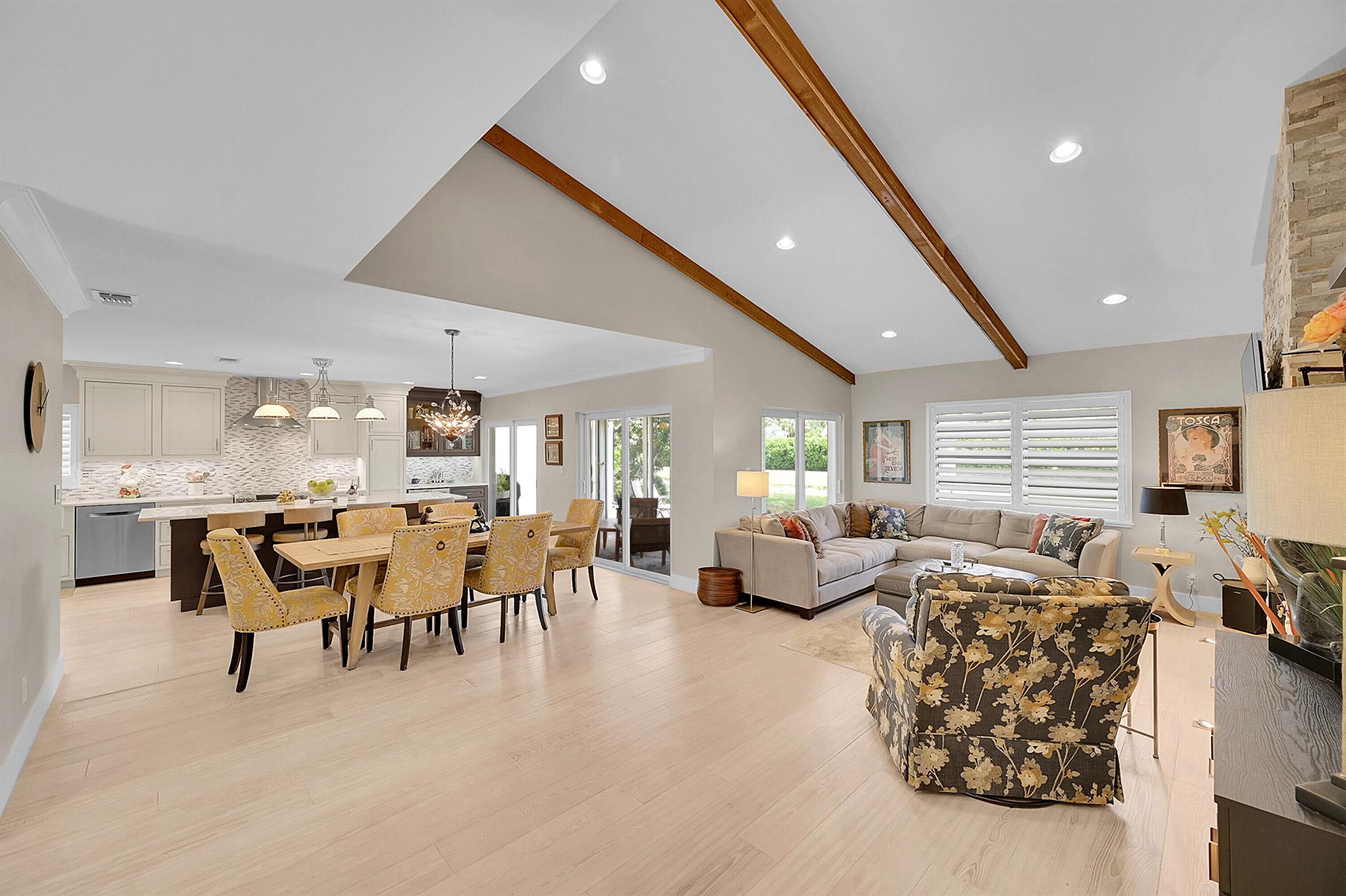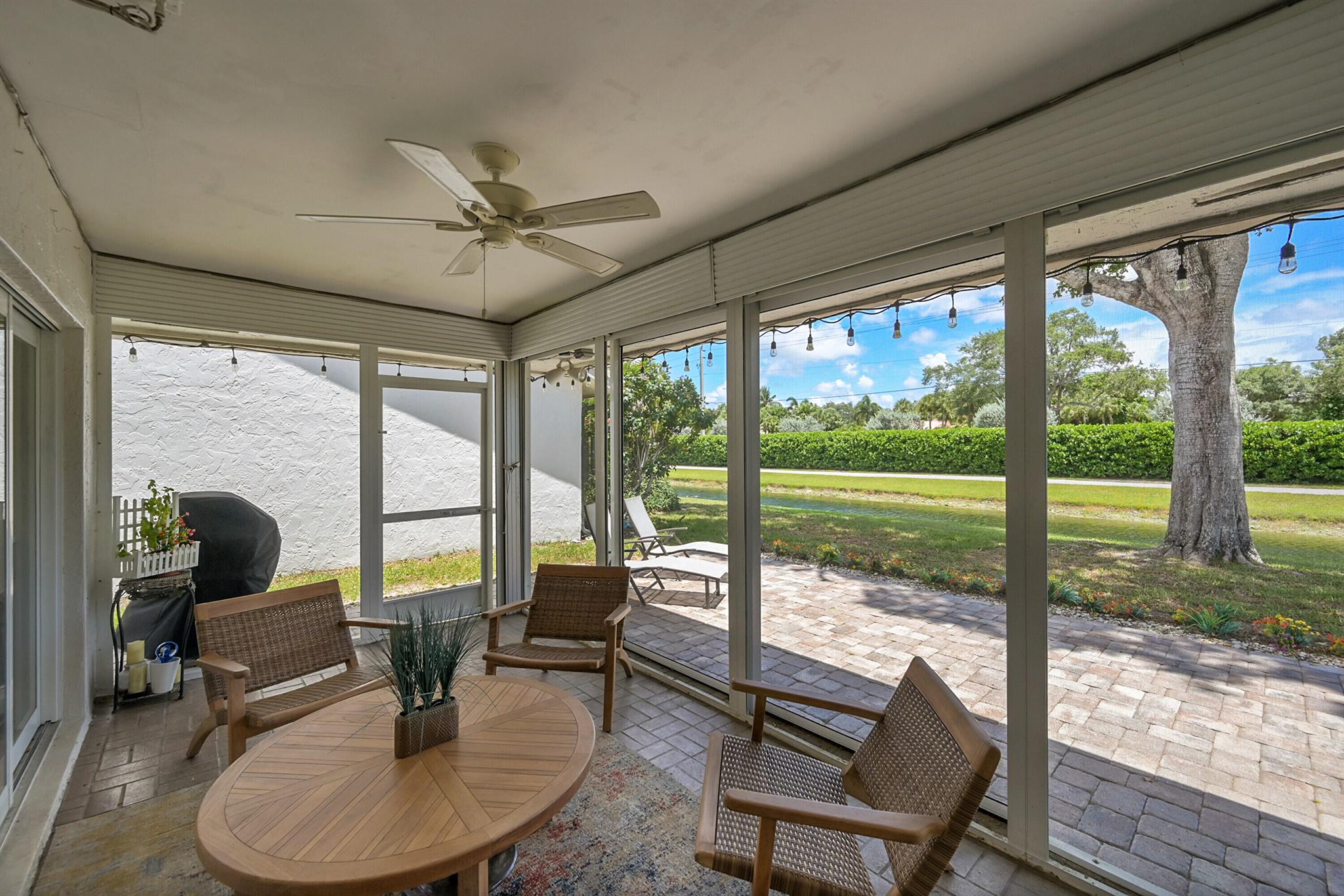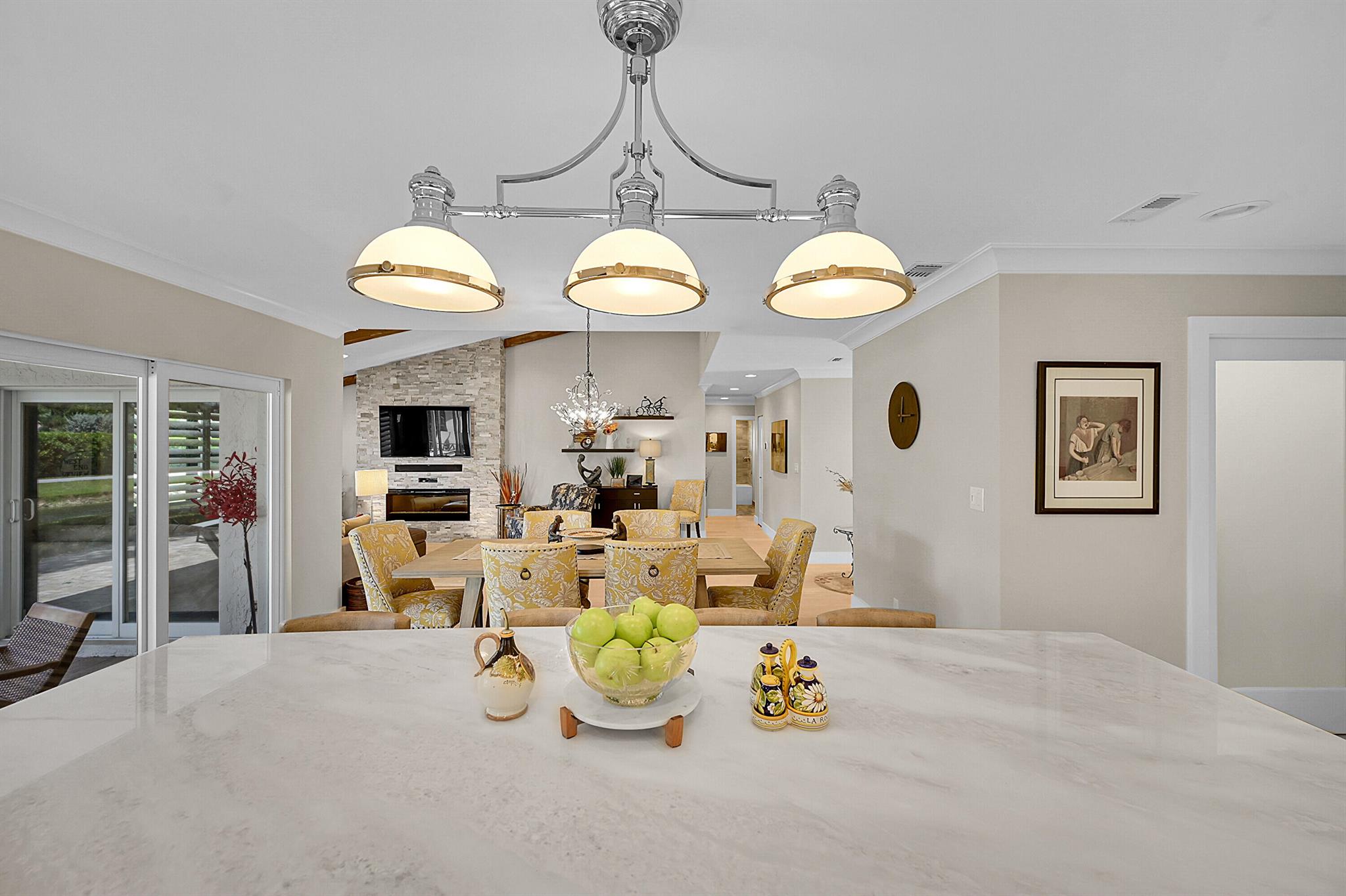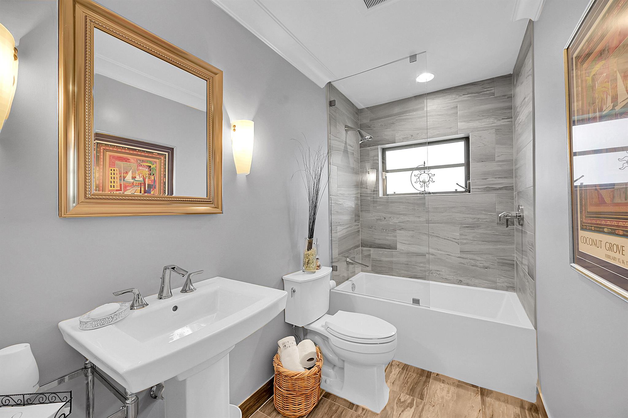 Located in the highly sought-after community of Camino Woods in central Boca Raton, this exquisitly upgraded 3-bedroom, 2-bath home offers an open living area with vaulted ceilings. The kitchen features a center island with quartz countertops, wine bar, & wine fridge. Enjoy the cozy ambiance of a decorative electric fireplace and the elegance of plantation shutters throughout, while the updated baths include a main bathroom with double sinks & a sleek glass-enclosed shower. A separate laundry room & a 2 car garage add convenience. Step outside to a paved patio & enjoy serene water views from the private backyard--perfect for relaxing or entertaining. This 55+ community is just 5 miles from the beach & has a community pool & clubhouse. HOA fee of $390 per month incl all landscaping & more