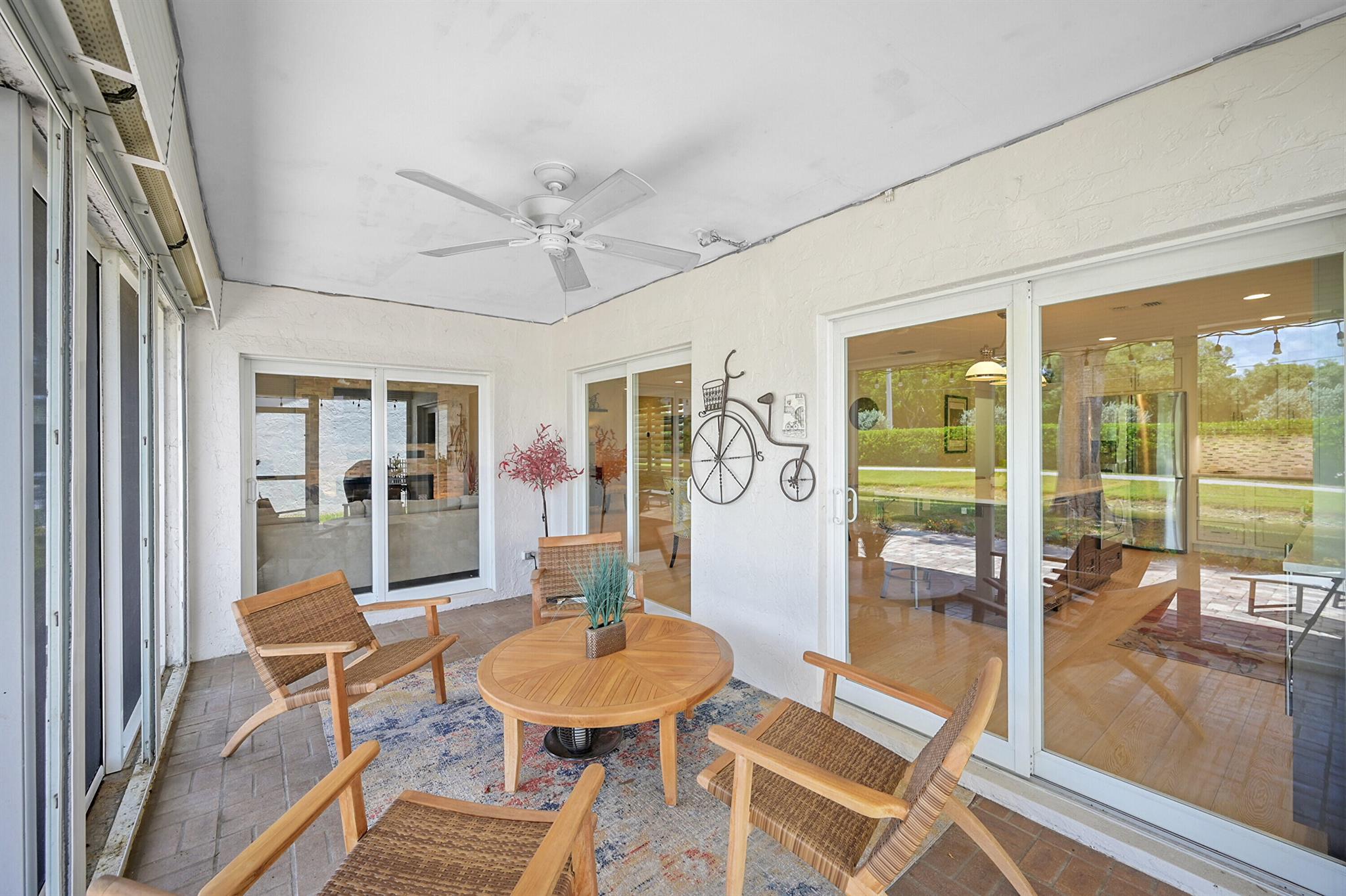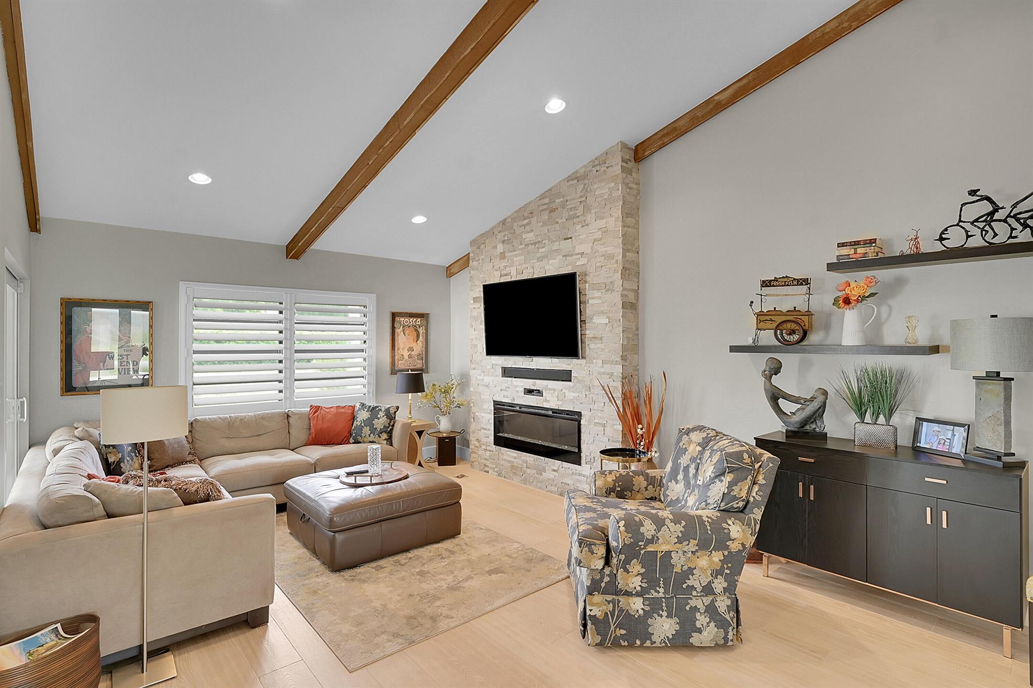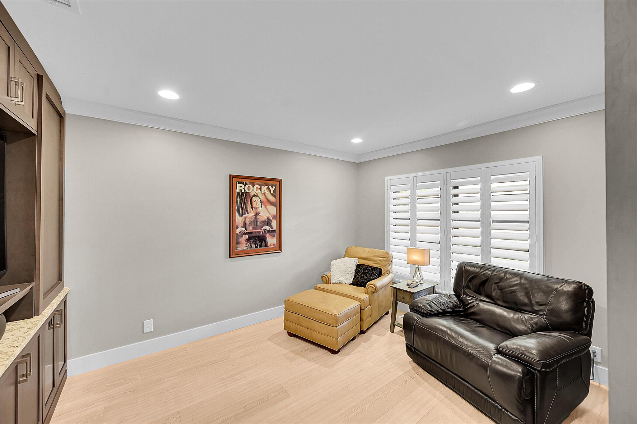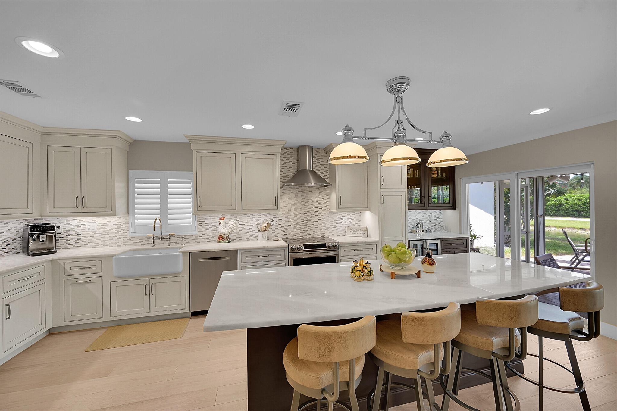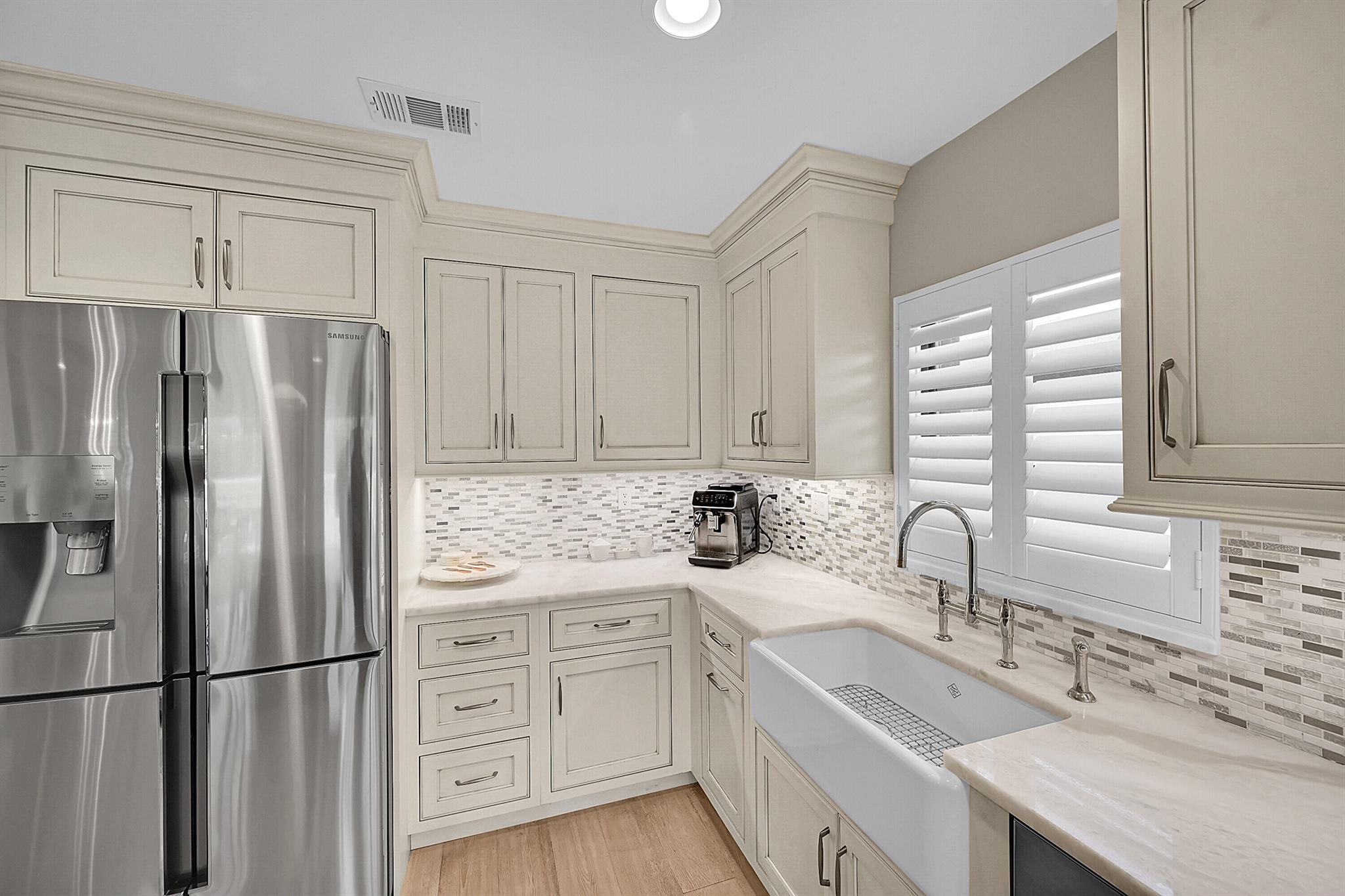Located in the highly sought-after community of Camino Woods in central Boca Raton, this exquisitly upgraded 3-bedroom, 2-bath home offers an open living area with vaulted ceilings. The kitchen features a center island with quartz countertops, wine bar, & wine fridge. Enjoy the cozy ambiance of a decorative electric fireplace and the elegance of plantation shutters throughout, while the updated baths include a main bathroom with double sinks & a sleek glass-enclosed shower. A separate laundry room & a 2 car garage add convenience. Step outside to a paved patio & enjoy serene water views from the private backyard--perfect for relaxing or entertaining. This 55+ community is just 5 miles from the beach & has a community pool & clubhouse. HOA fee of $390 per month incl all landscaping & more