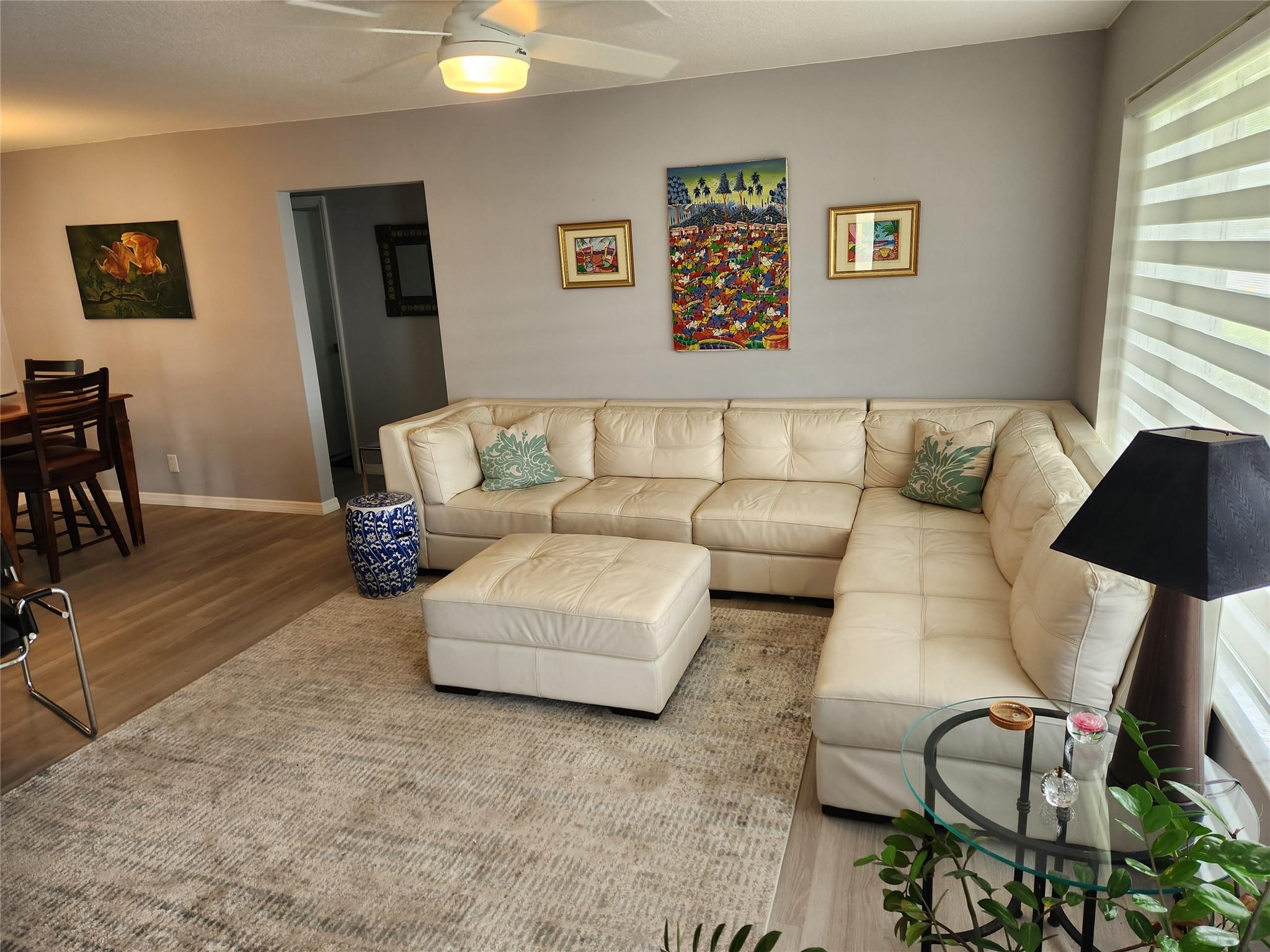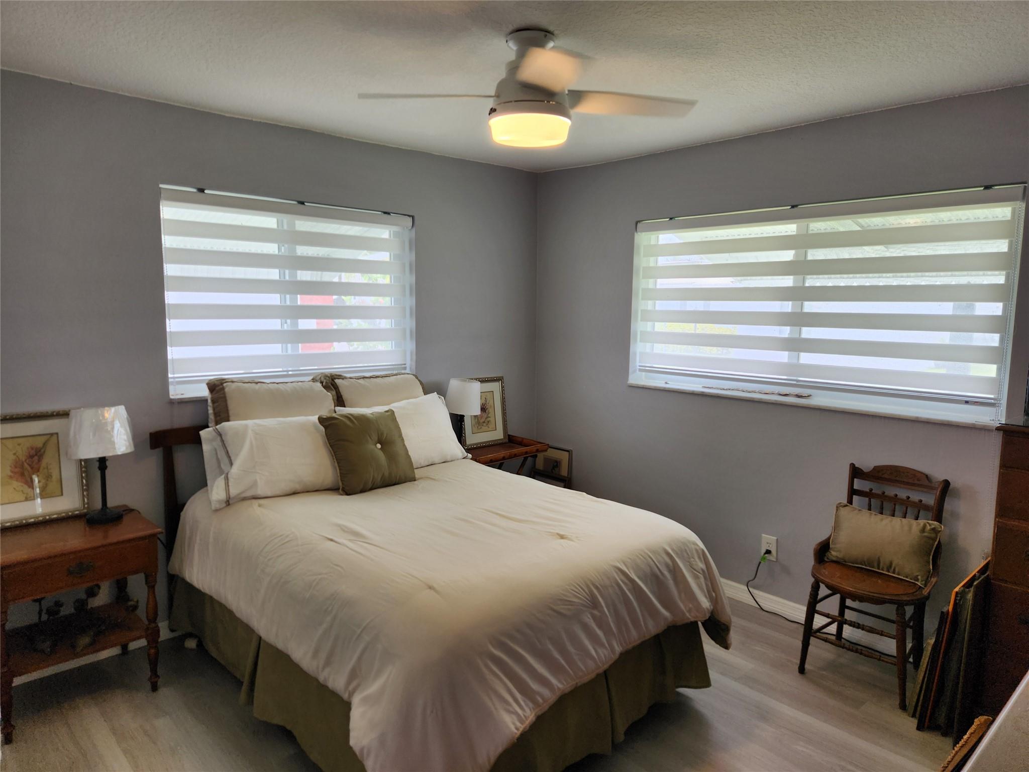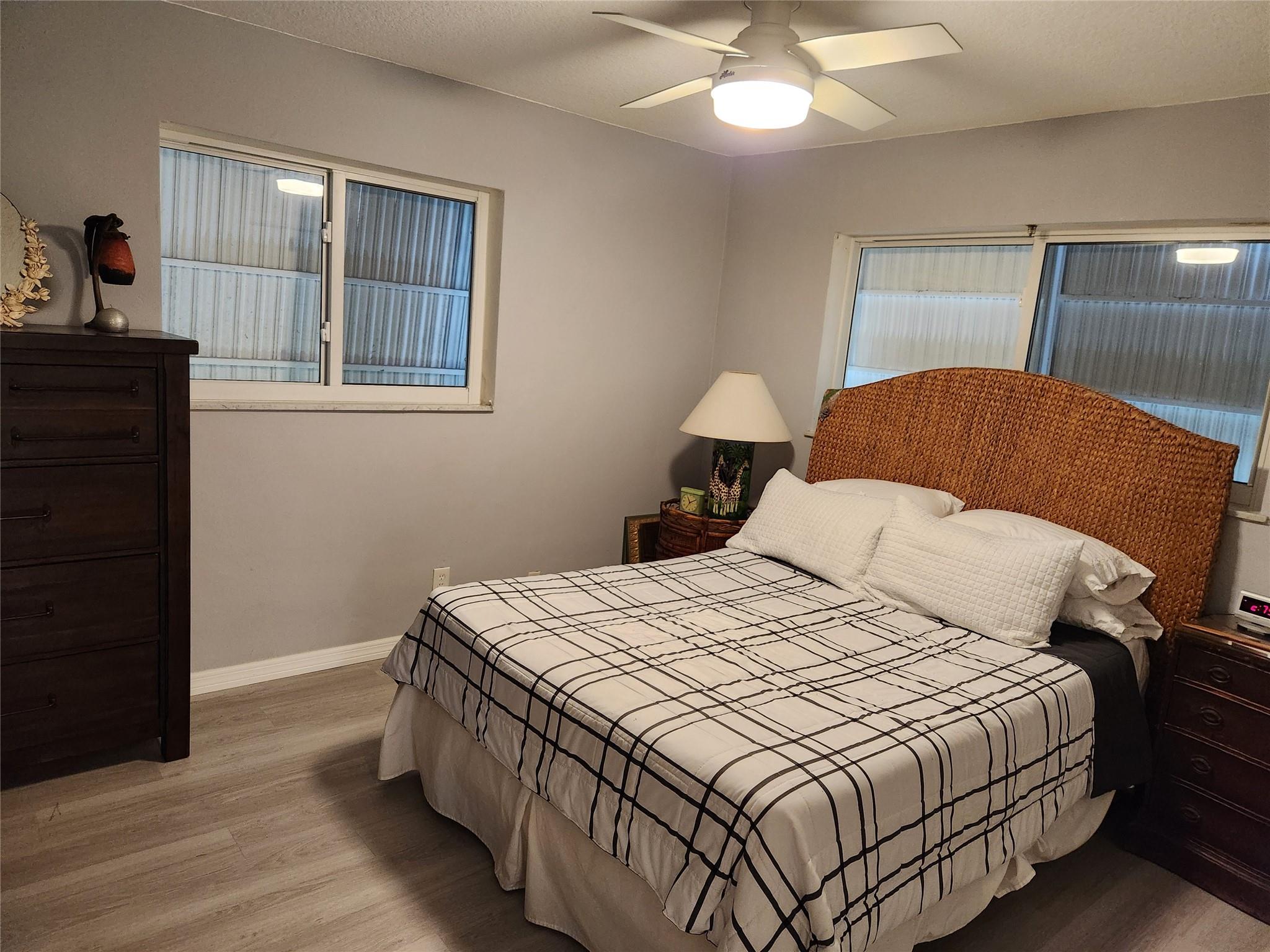 This home has been substantially updated over the past 3 yrs. New Roof, Hurricane impact windows and doors, new flooring throughout, new interior paint and interior doors. New kitchen cabinets, quartz countertops and stainless appliances. Updated bath, Primary bedroom has walk in closet. Both bedrooms have built in closet organizers. The kitchen breakfast bar opens into a sunny family room with sliding glass doors to the private patio. The Laundry area is located in the air-conditioned garage and has a second refrigerator and storage galore. The low monthly fee includes, water, sprinklers, two club houses and 2 pools, 9-hole golf course, courtesy van transportation for shopping and regular exterior painting of the home and roof. 1 yr home warranty provided by Seller.