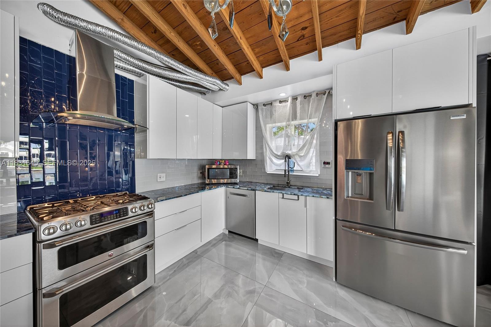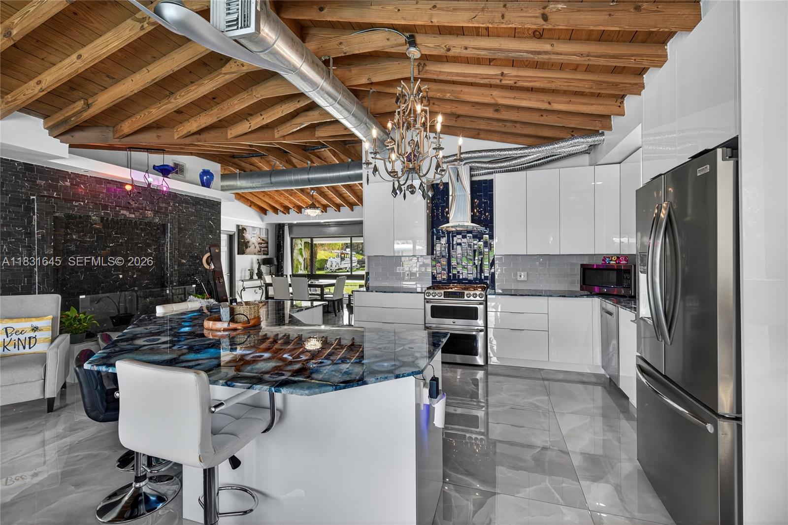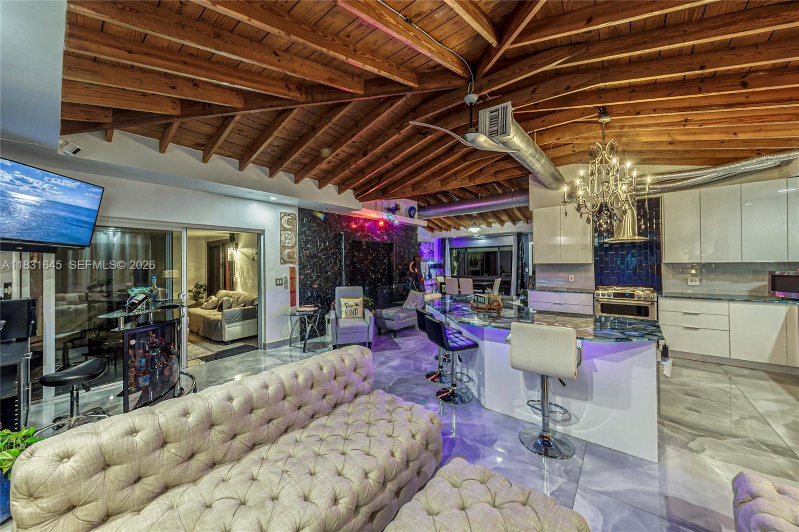 Discover a one-of-a-kind custom home in Garden Isles, where artistic design meets upscale living. This beautifully reimagined residence offers 80’ of seawall with a stunning view of a wide ocean-access canal, the perfect backdrop for entertaining or relaxing in style. Extensively remodeled, this home features open wood vaulted ceilings, large porcelain floors, an interior water wall, custom German cabinets, deep blue semi-precious agate countertops, impact windows and doors,2 outdoor living and dining areas, a heated pool, and a fully-owned, new 13.6kW solar system with a Tesla house-backup battery. The outdoors boast a large tropical tiki hut, an expansive pool deck and open backyard, and a new 80’ custom dock.Close to shopping ,dining and 8 brand-new pickleball courts at Sgt. Kip Jacoby Park. Bring your boat and family to live the ultimate Florida lifestyle. (possible seller financing offered)