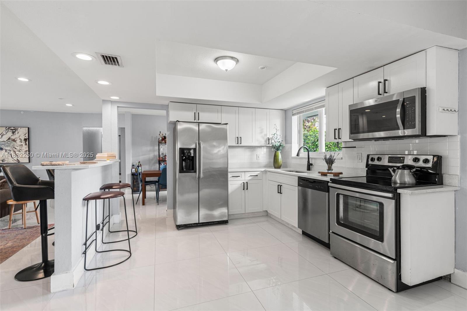Fully renovated 4 bed, 3 bath home in corner lot in Wilton Manors. Spacious and bright! 36' x 36' tile throughout. Great for entertaining, with formal and informal dining spaces. Glass enclosed showers in bathrooms. Recessed LED lighting in living room and kitchen bar. All impact windows throughout. The fourth bedroom can be used as an office or den with private street entrance off the kitchen, and 3rd bathroom in the 2-car garage. Beautiful outdoor living space with yard, built-in grill in outside patio, with plenty of additional space for entertaining. Home is great for an investor who wants to transform to a stylish income earning duplex with 2 separate entrances and ample parking including 2 car garage!