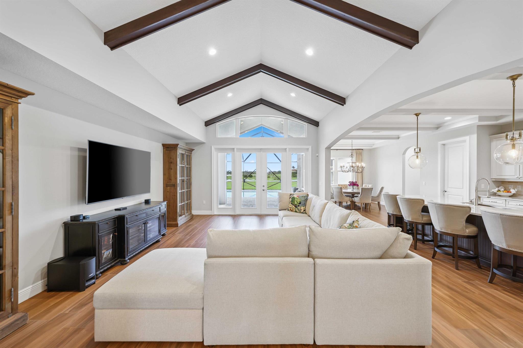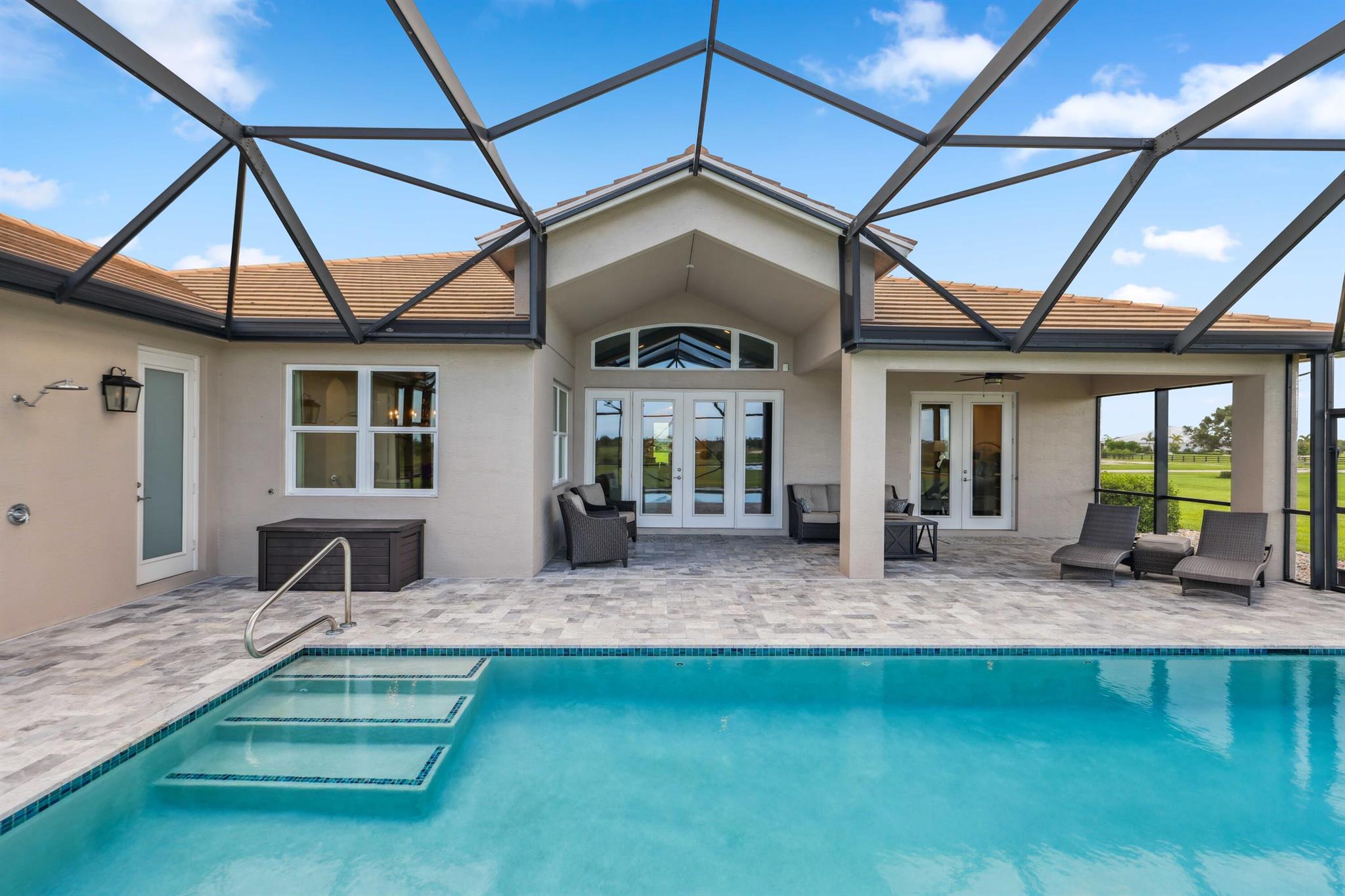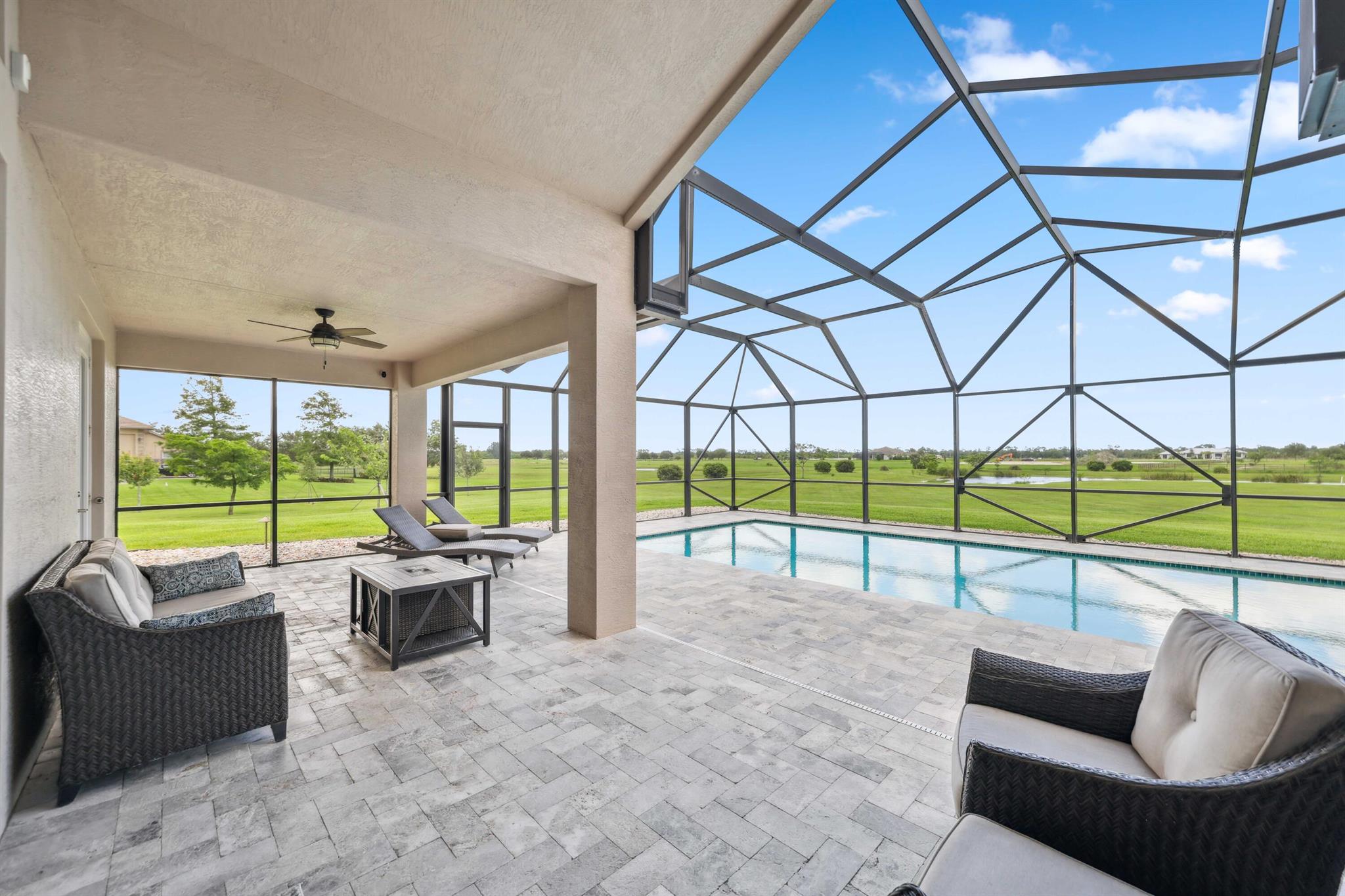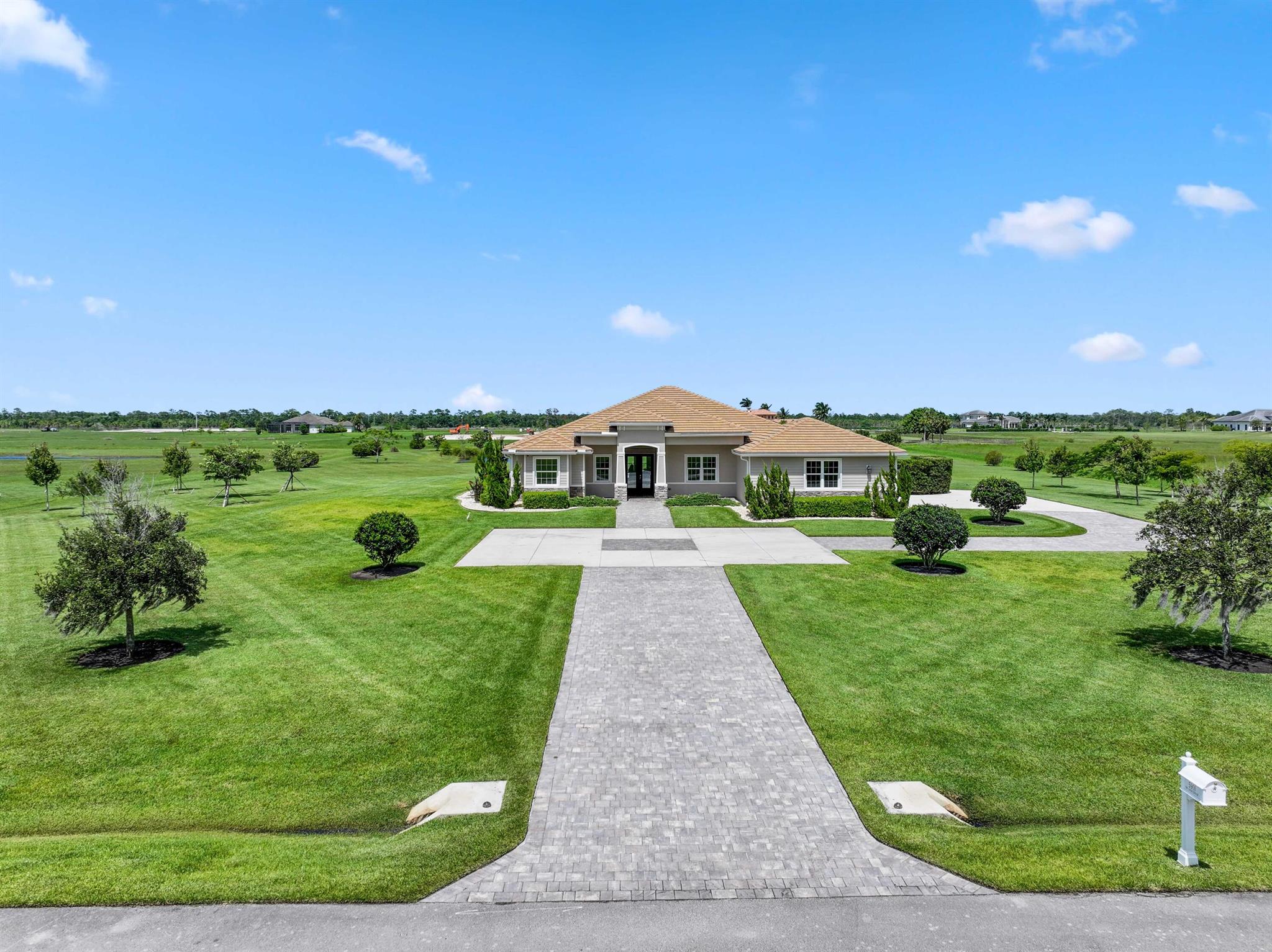 Welcome to estate living on 5 private acres in one of Martin County's most desirable neighborhoods. Built in 2019, this meticulously designed home has a flexible floor plan--currently featuring 3 bedrooms, an office, and a bonus room, with the option to easily create up to 5 bedrooms. The 3-way split design provides the perfect floor plan that is ideal for every buyer. You will experience the thoughtfully designed home from the moment you drive up. Enjoy volume ceilings and a great room with striking beams, plus a kitchen with a large island, pantry, and dining area perfect for entertaining. You will love your screened pool area overlooking the property. Energy-efficient features, impact glass, whole-house water filtration/generator, and extended 3-car garage. Equestrian friendly too.