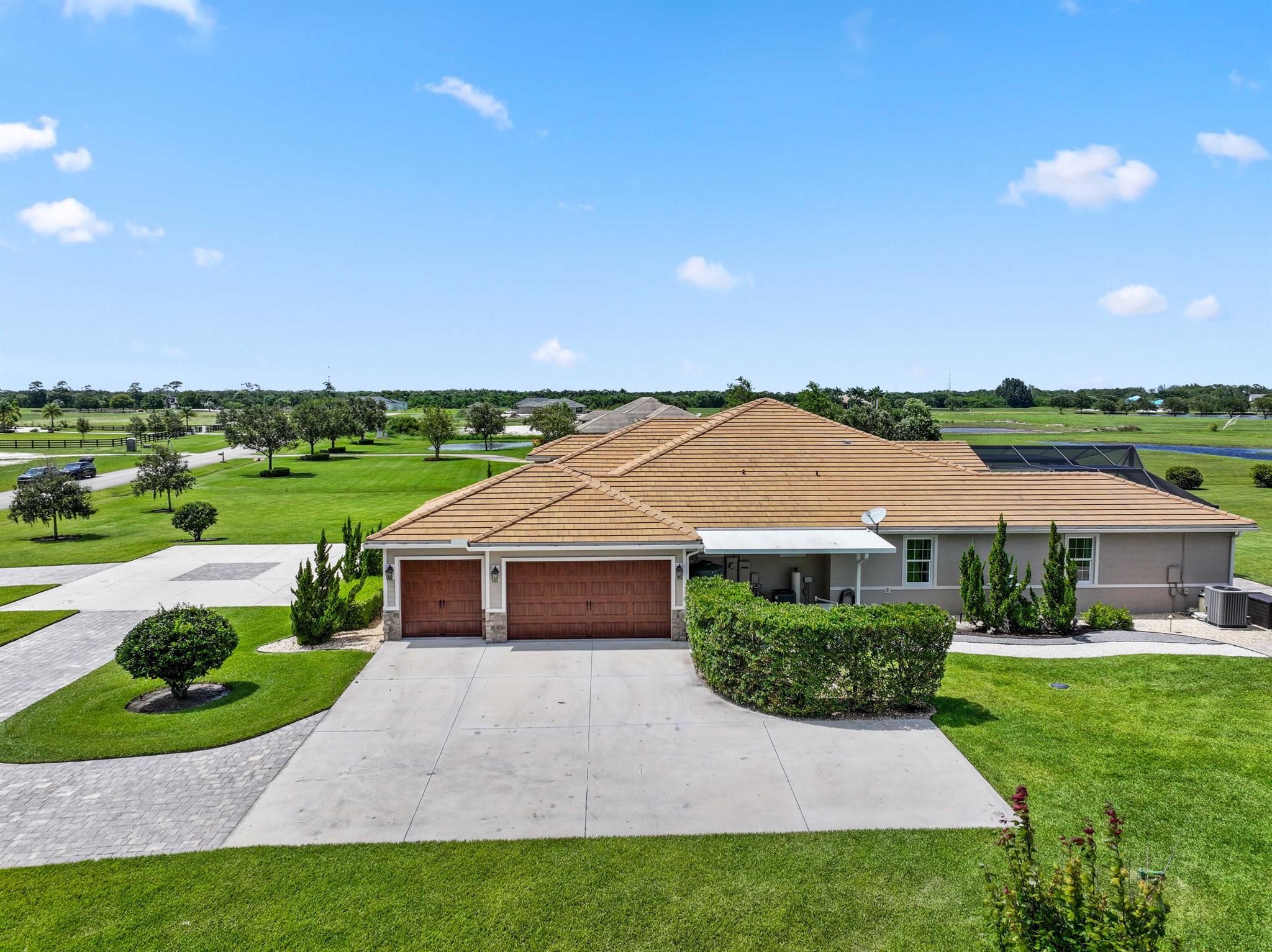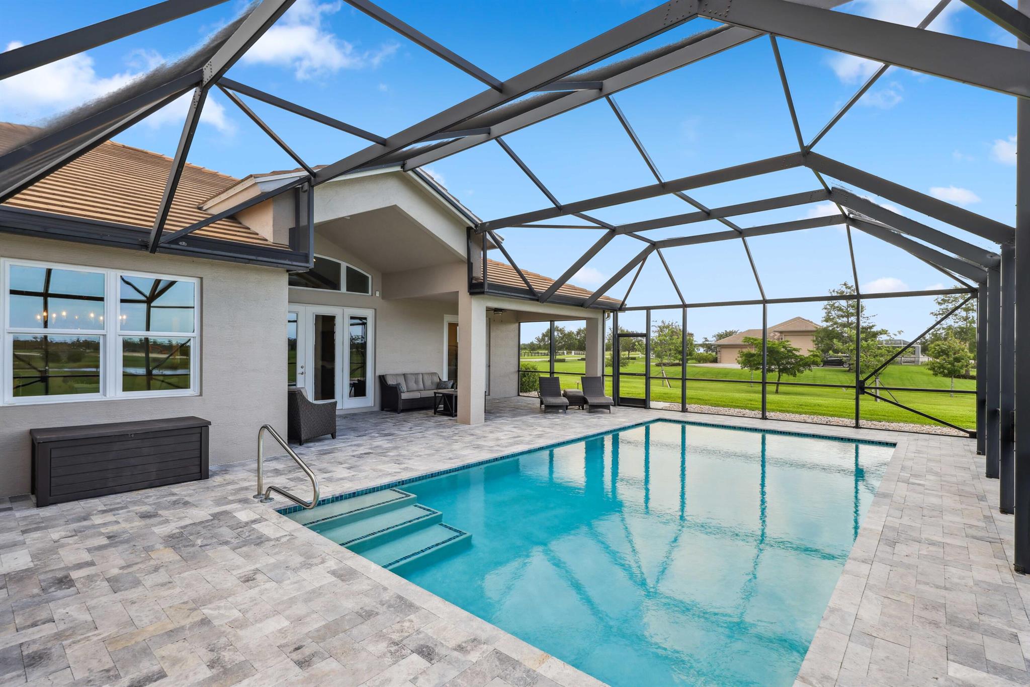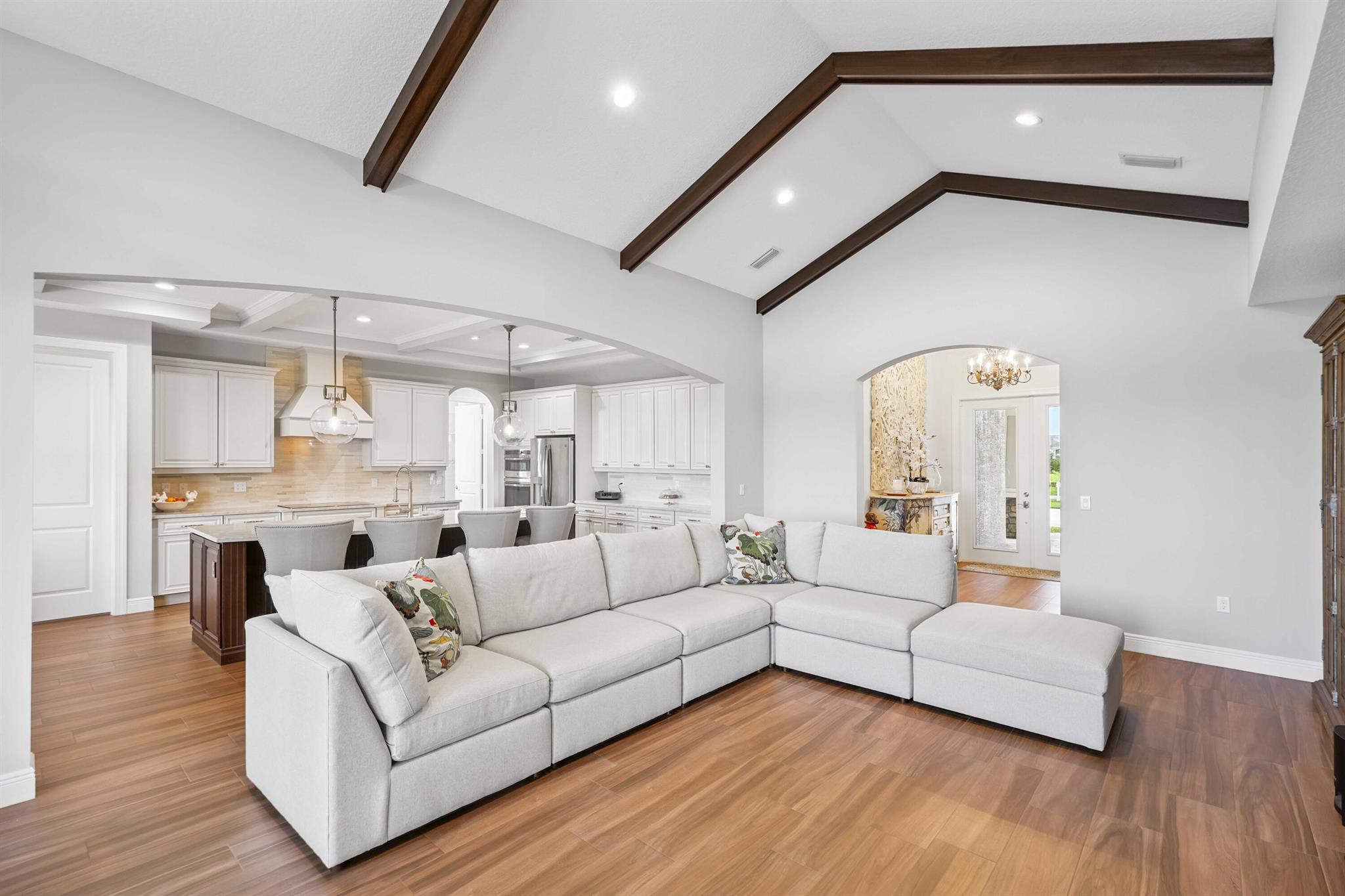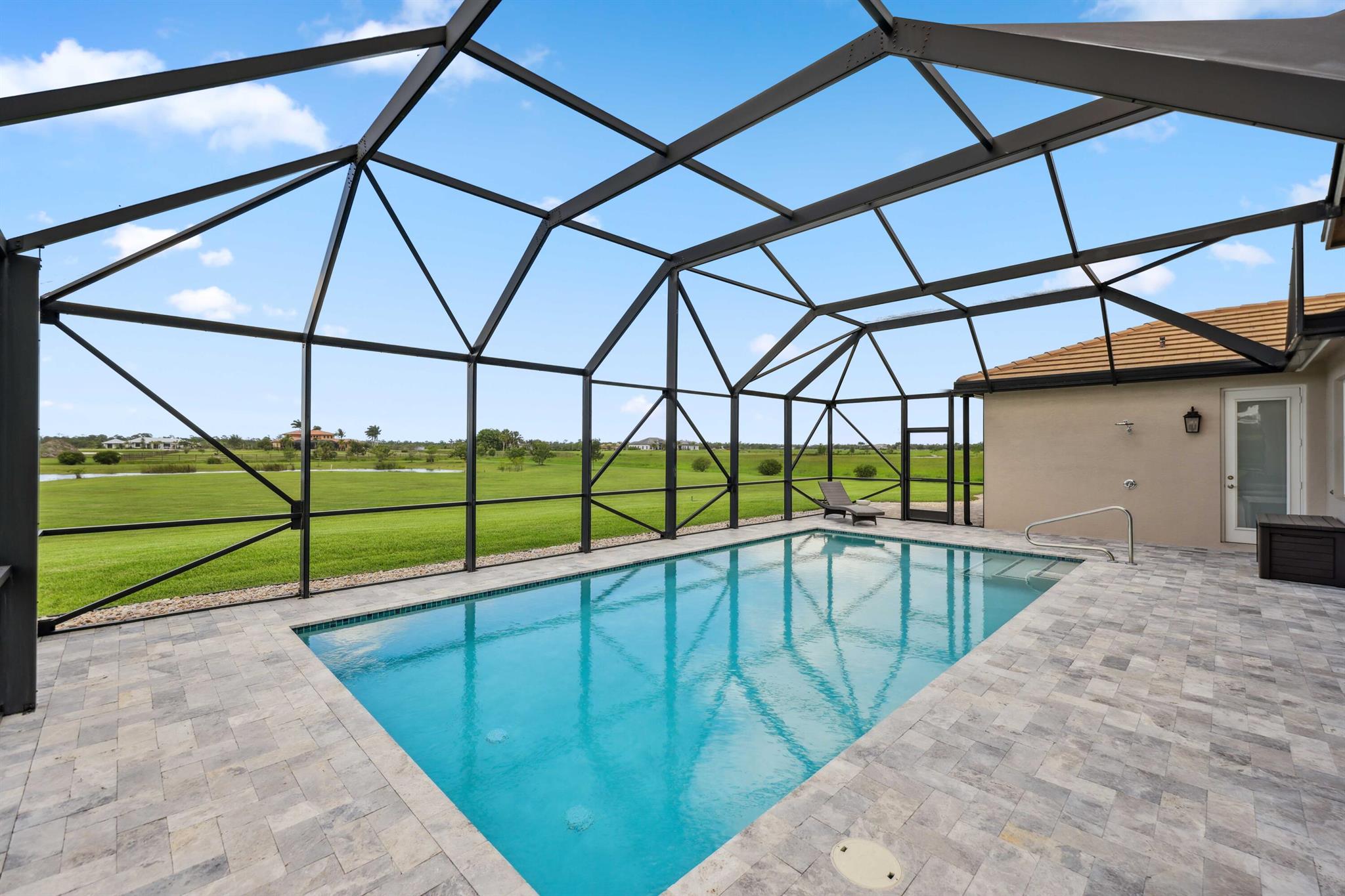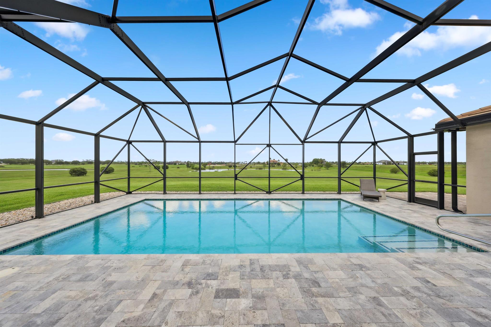 Welcome to estate living on 5 private acres in one of Martin County's most desirable neighborhoods. Built in 2019, this meticulously designed home has a flexible floor plan--currently featuring 3 bedrooms, an office, and a bonus room, with the option to easily create up to 5 bedrooms. The 3-way split design provides the perfect floor plan that is ideal for every buyer. You will experience the thoughtfully designed home from the moment you drive up. Enjoy volume ceilings and a great room with striking beams, plus a kitchen with a large island, pantry, and dining area perfect for entertaining. You will love your screened pool area overlooking the property. Energy-efficient features, impact glass, whole-house water filtration/generator, and extended 3-car garage. Equestrian friendly too.