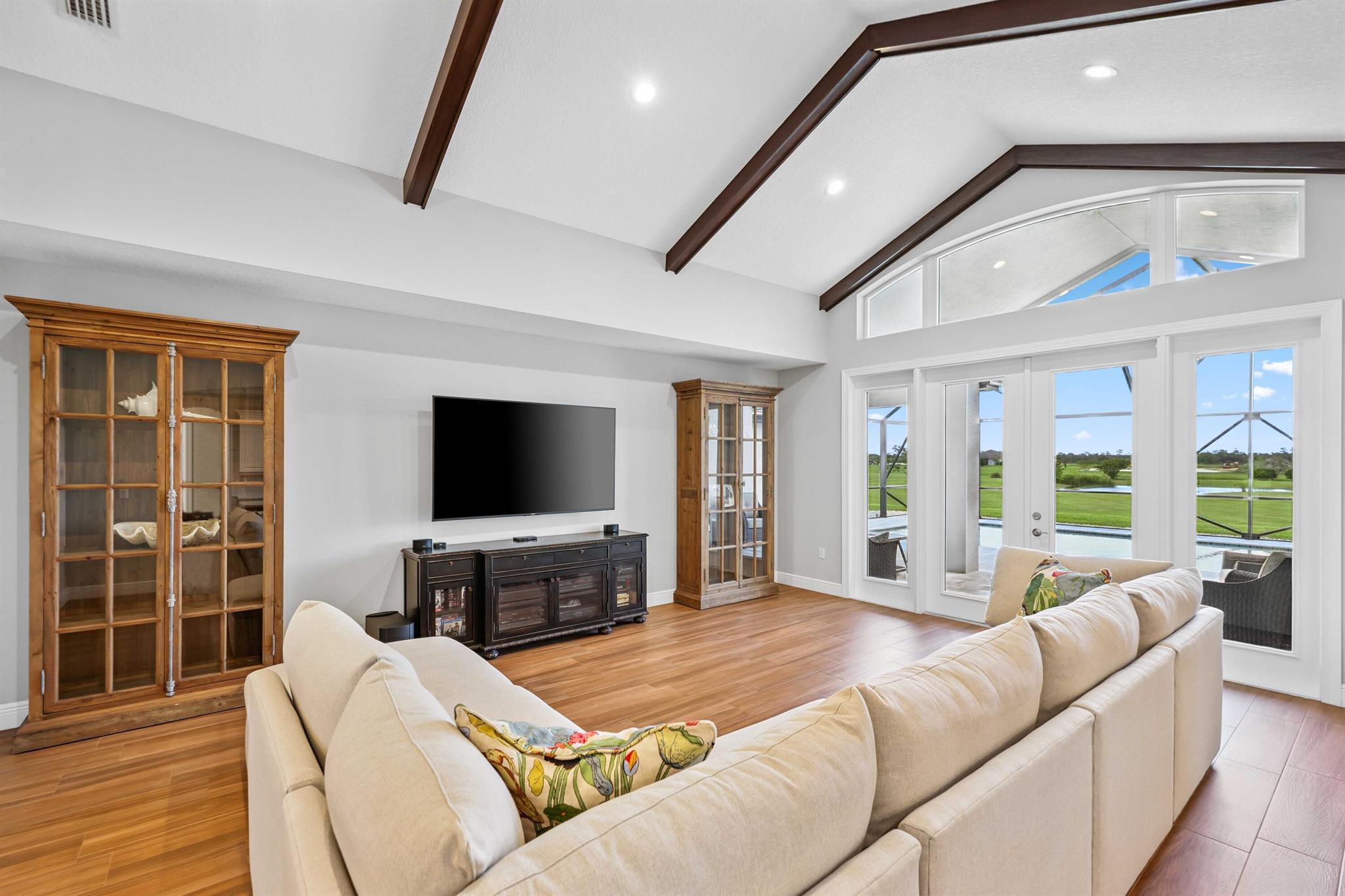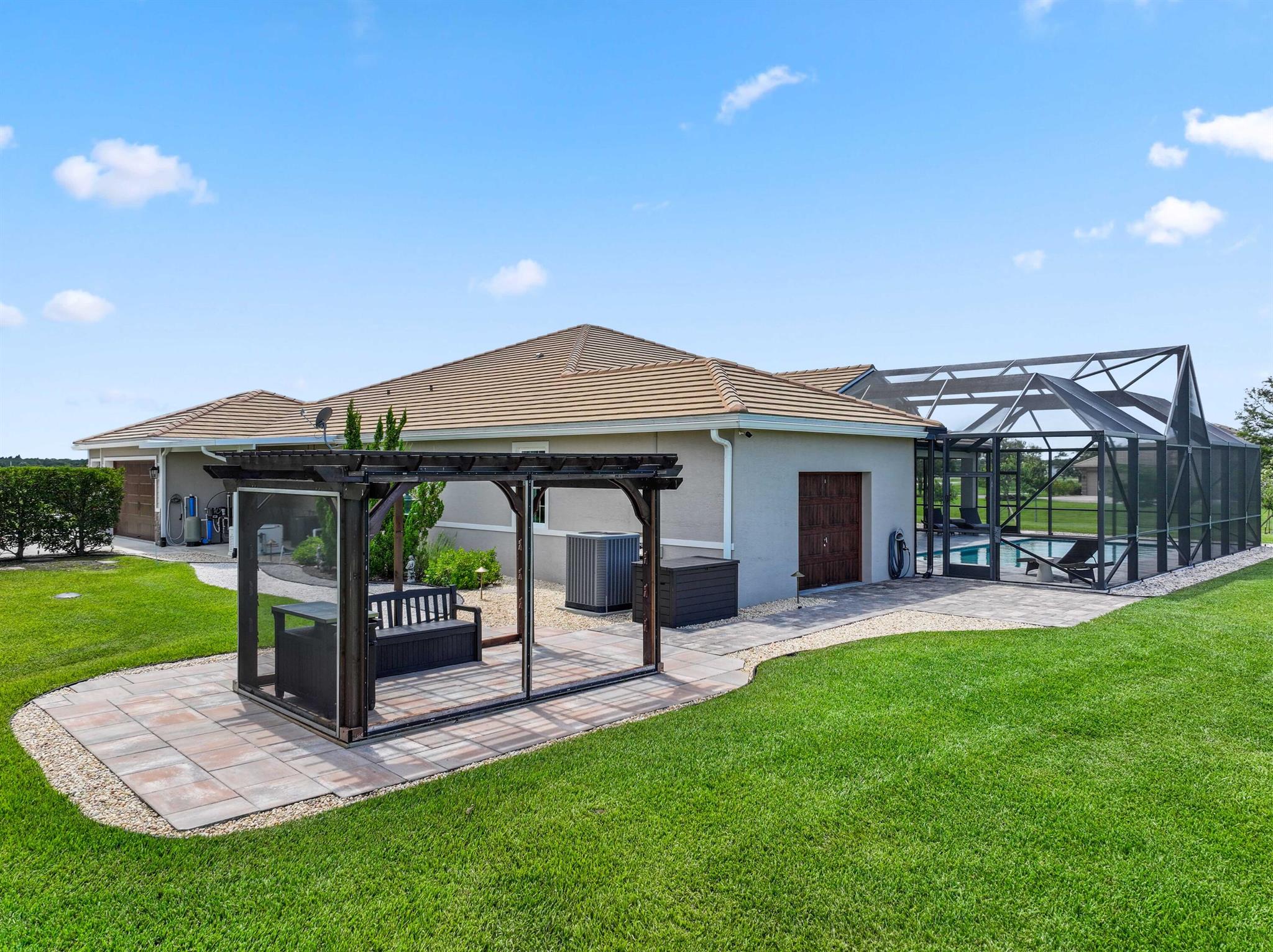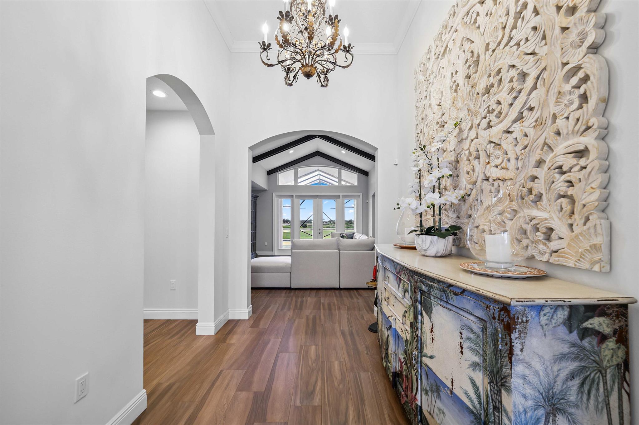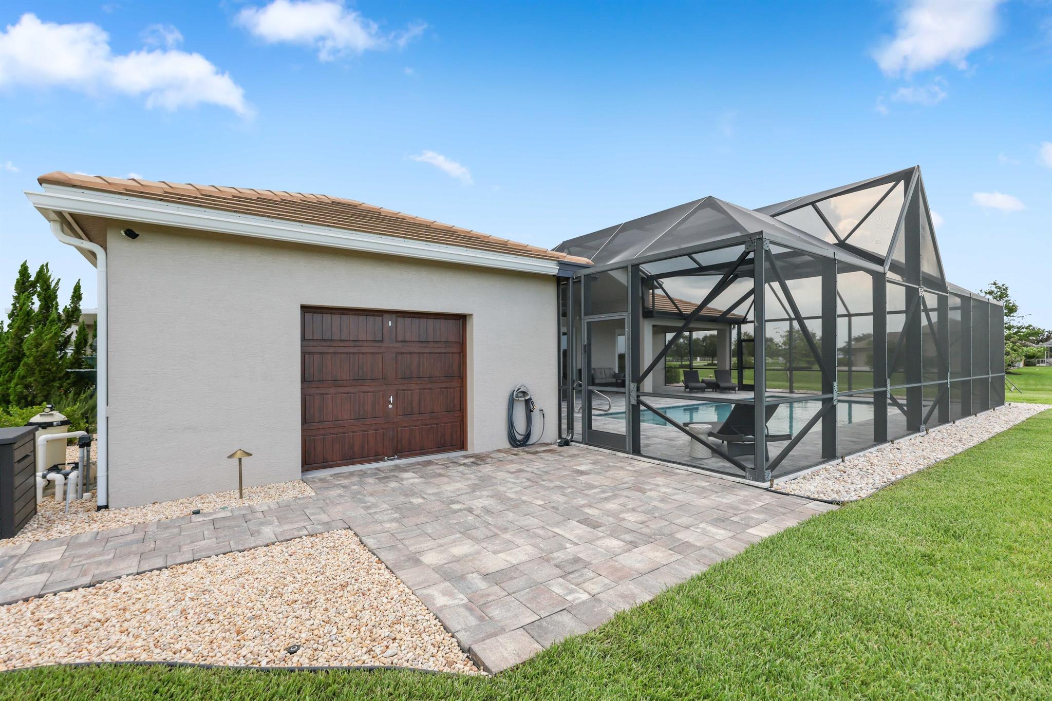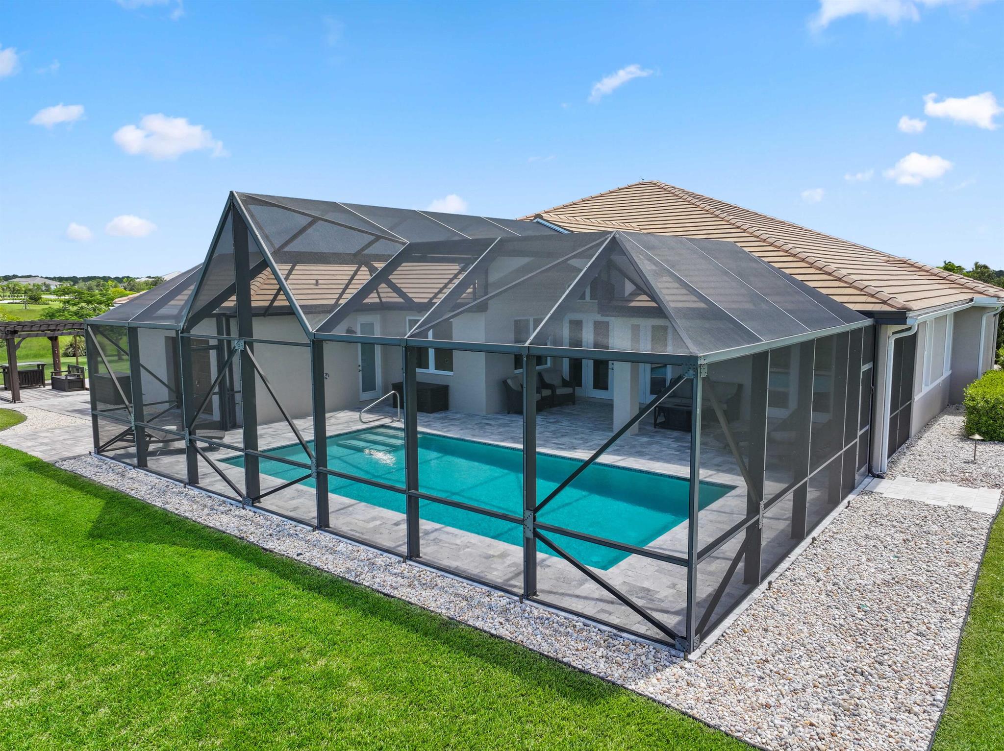 Welcome to estate living on 5 private acres in one of Martin County's most desirable neighborhoods. Built in 2019, this meticulously designed home has a flexible floor plan--currently featuring 3 bedrooms, an office, and a bonus room, with the option to easily create up to 5 bedrooms. The 3-way split design provides the perfect floor plan that is ideal for every buyer. You will experience the thoughtfully designed home from the moment you drive up. Enjoy volume ceilings and a great room with striking beams, plus a kitchen with a large island, pantry, and dining area perfect for entertaining. You will love your screened pool area overlooking the property. Energy-efficient features, impact glass, whole-house water filtration/generator, and extended 3-car garage. Equestrian friendly too.