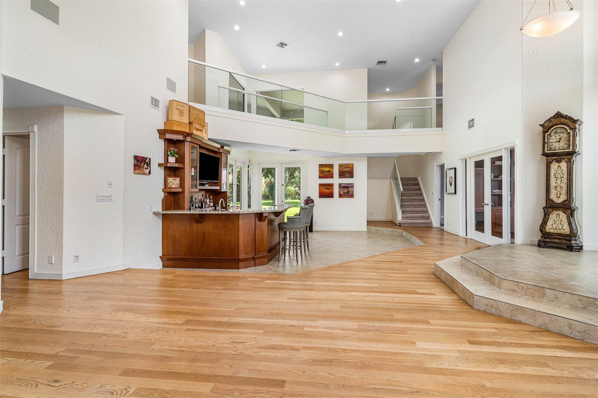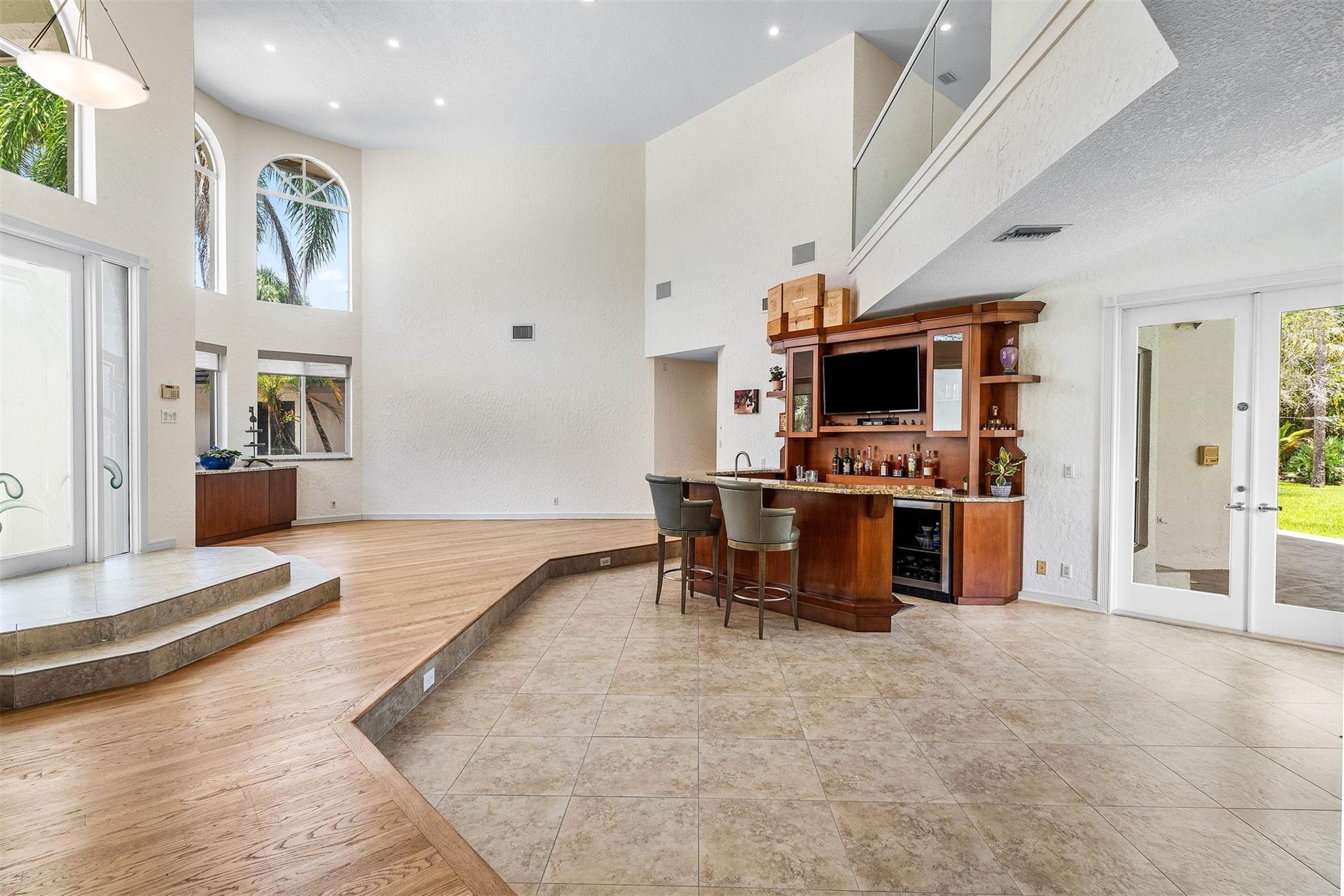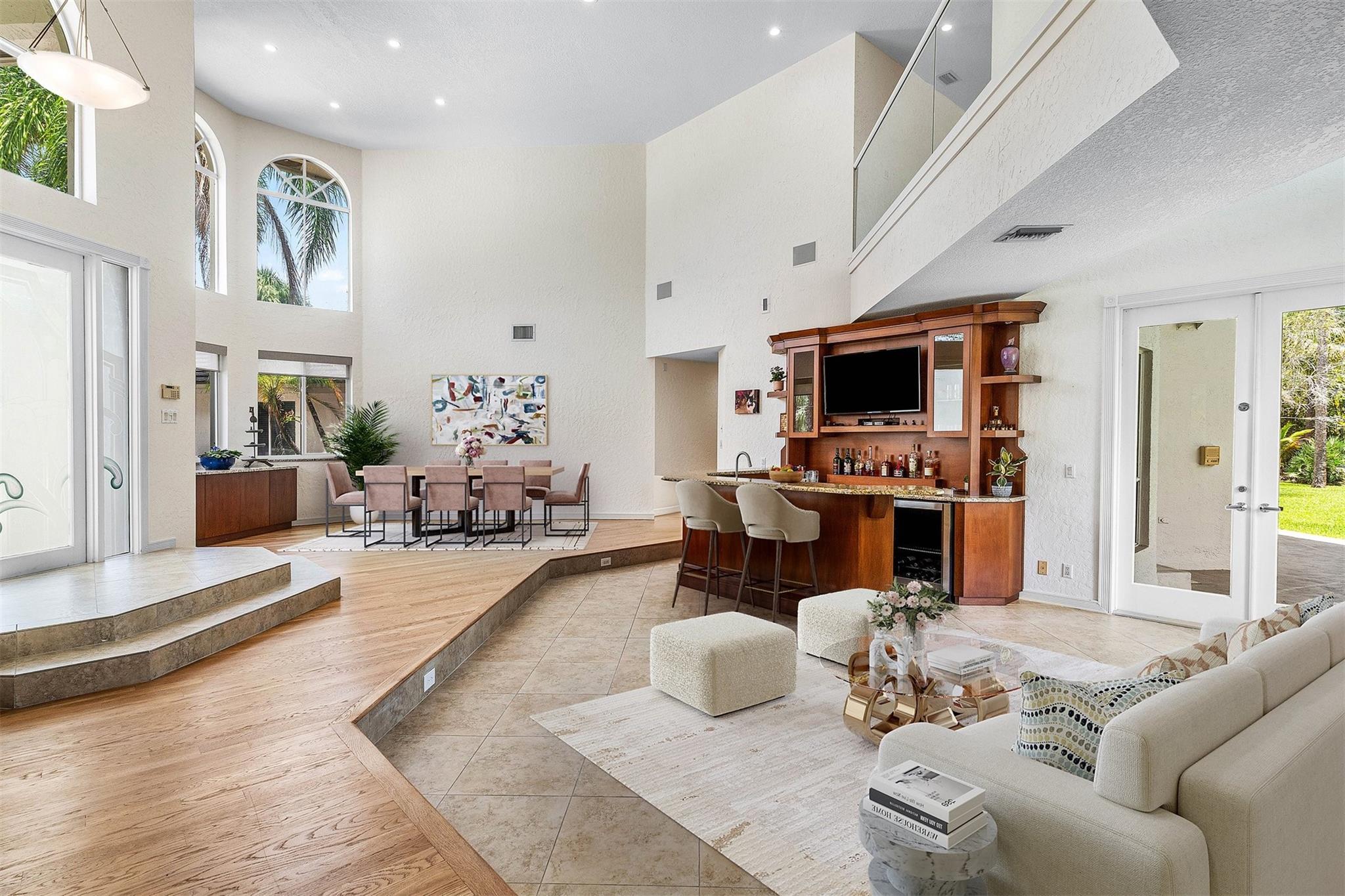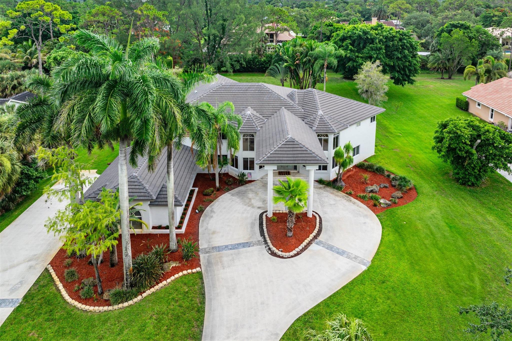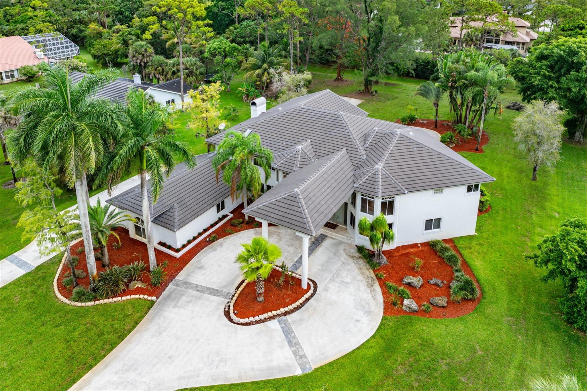 Beautifully Big! Impressive curb appeal with two long driveways, a porte cochere, sprawling lawn, & a 2020 flat tile roof. Inside, soaring two-story ceilings & walls of windows flood the home with natural light & tropical pool views. The stunning newer kitchen features sleek European-style cabinetry, quartz counters, Thermador appliances including a gas range, & glorious windows. The spacious primary suite offers a 2022 spa-inspired bath, office/den, sitting & dressing areas, a balcony over looking the grounds & an oversized closet. The backyard is a private oasis with a large pool, porch, serene outdoor living spaces & is perfect for enjoying family & friends. Other offerings: Fireplace, den, wine chiller, large secondary bedrooms with ensuite baths, bar, wood floors and so much more.