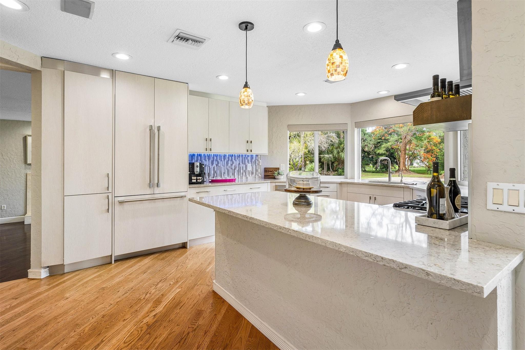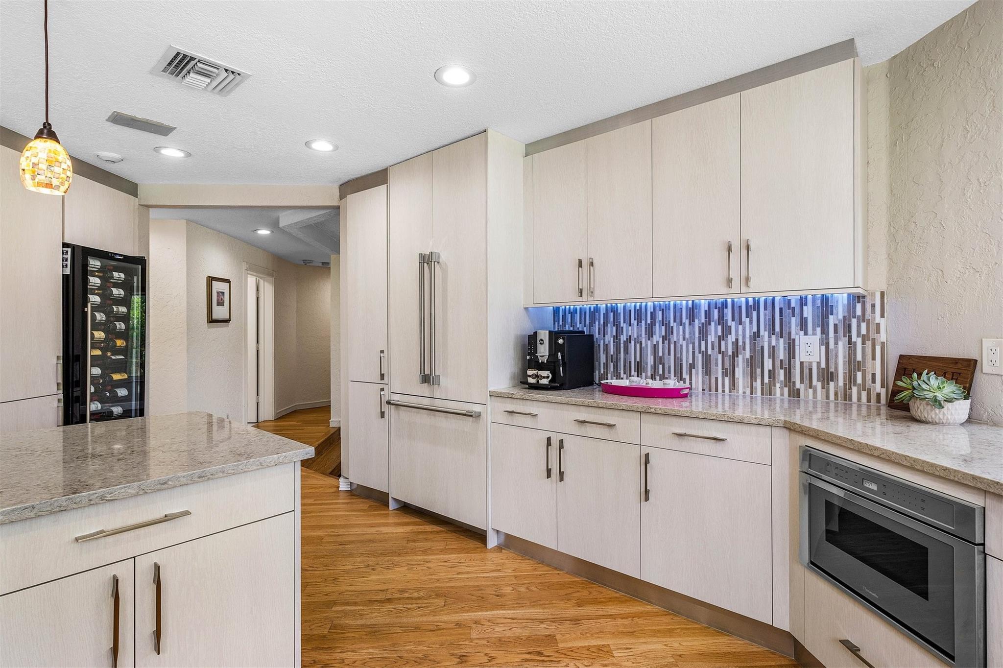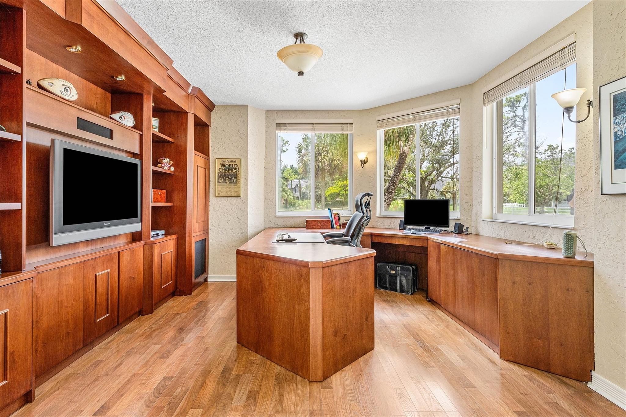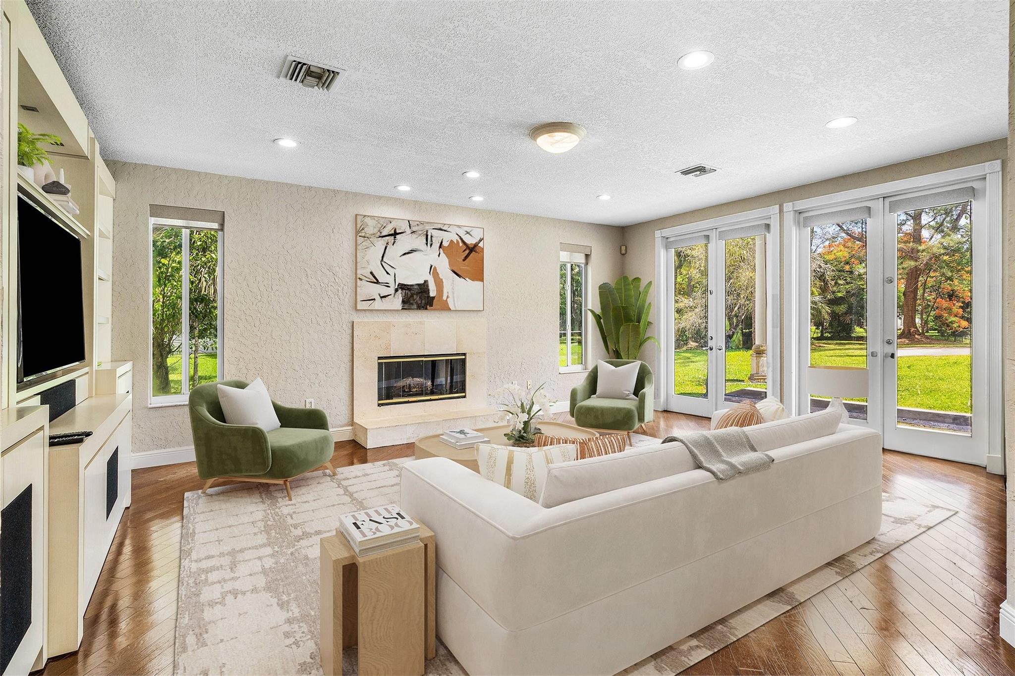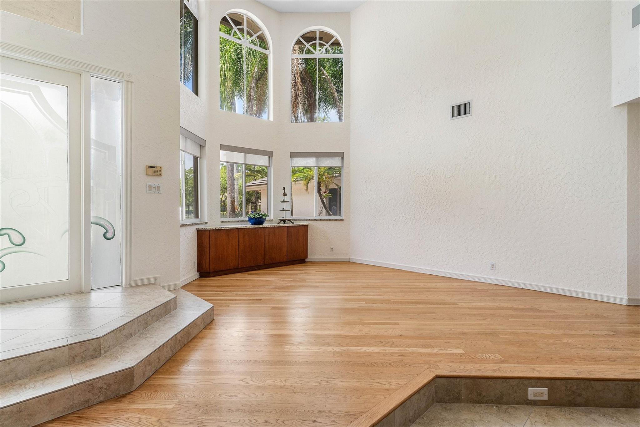 Beautifully Big! Impressive curb appeal with two long driveways, a porte cochere, sprawling lawn, & a 2020 flat tile roof. Inside, soaring two-story ceilings & walls of windows flood the home with natural light & tropical pool views. The stunning newer kitchen features sleek European-style cabinetry, quartz counters, Thermador appliances including a gas range, & glorious windows. The spacious primary suite offers a 2022 spa-inspired bath, office/den, sitting & dressing areas, a balcony over looking the grounds & an oversized closet. The backyard is a private oasis with a large pool, porch, serene outdoor living spaces & is perfect for enjoying family & friends. Other offerings: Fireplace, den, wine chiller, large secondary bedrooms with ensuite baths, bar, wood floors and so much more.
