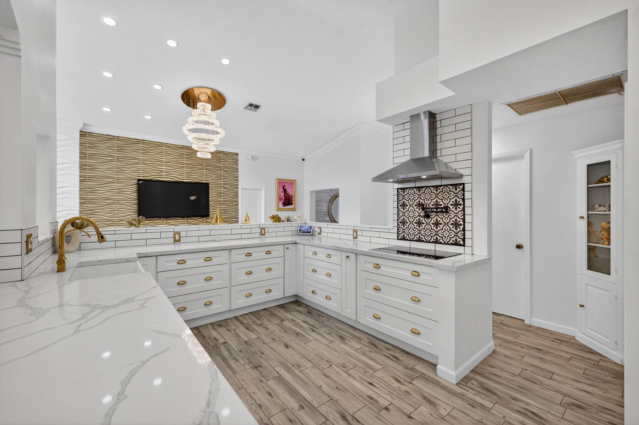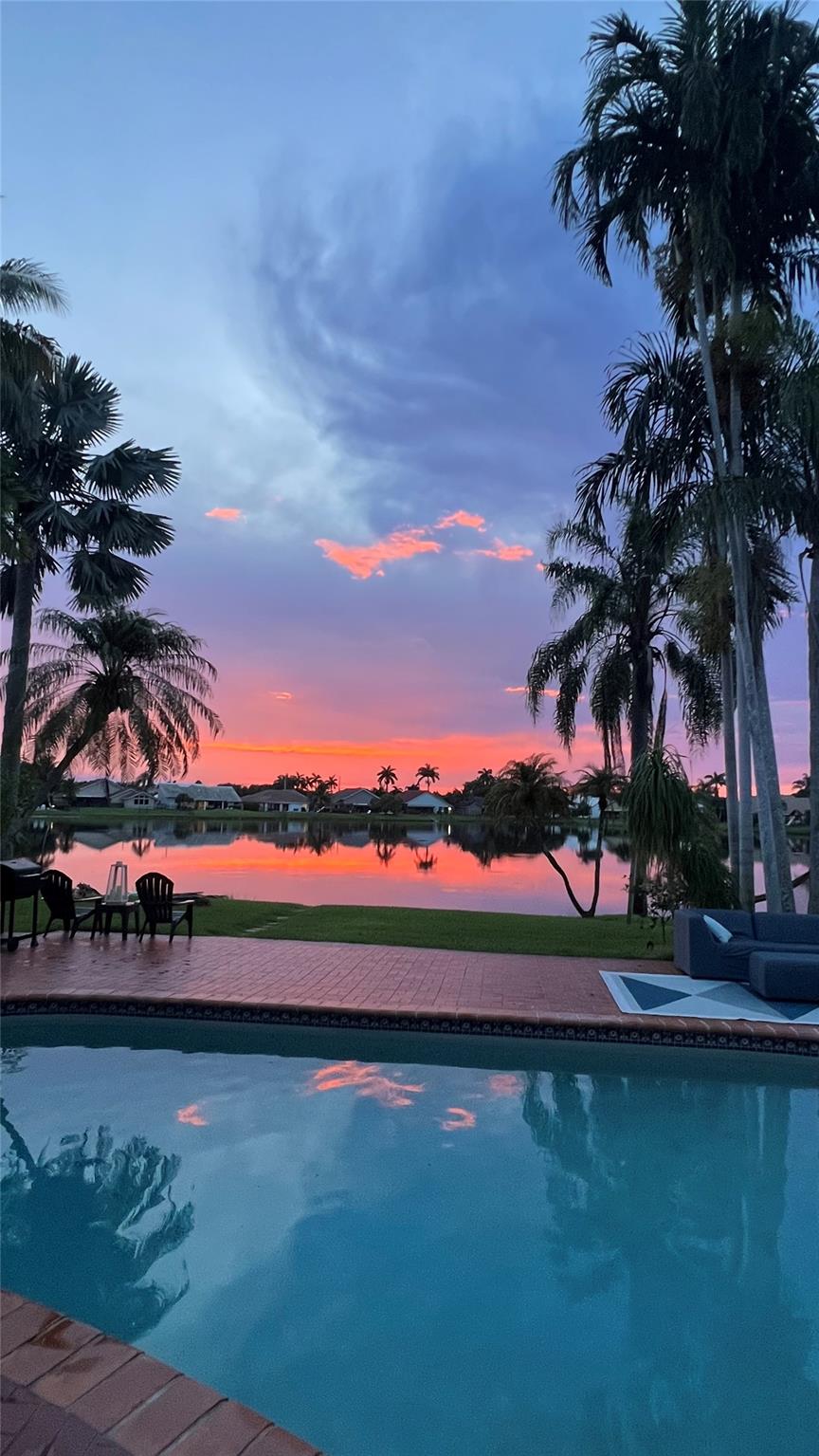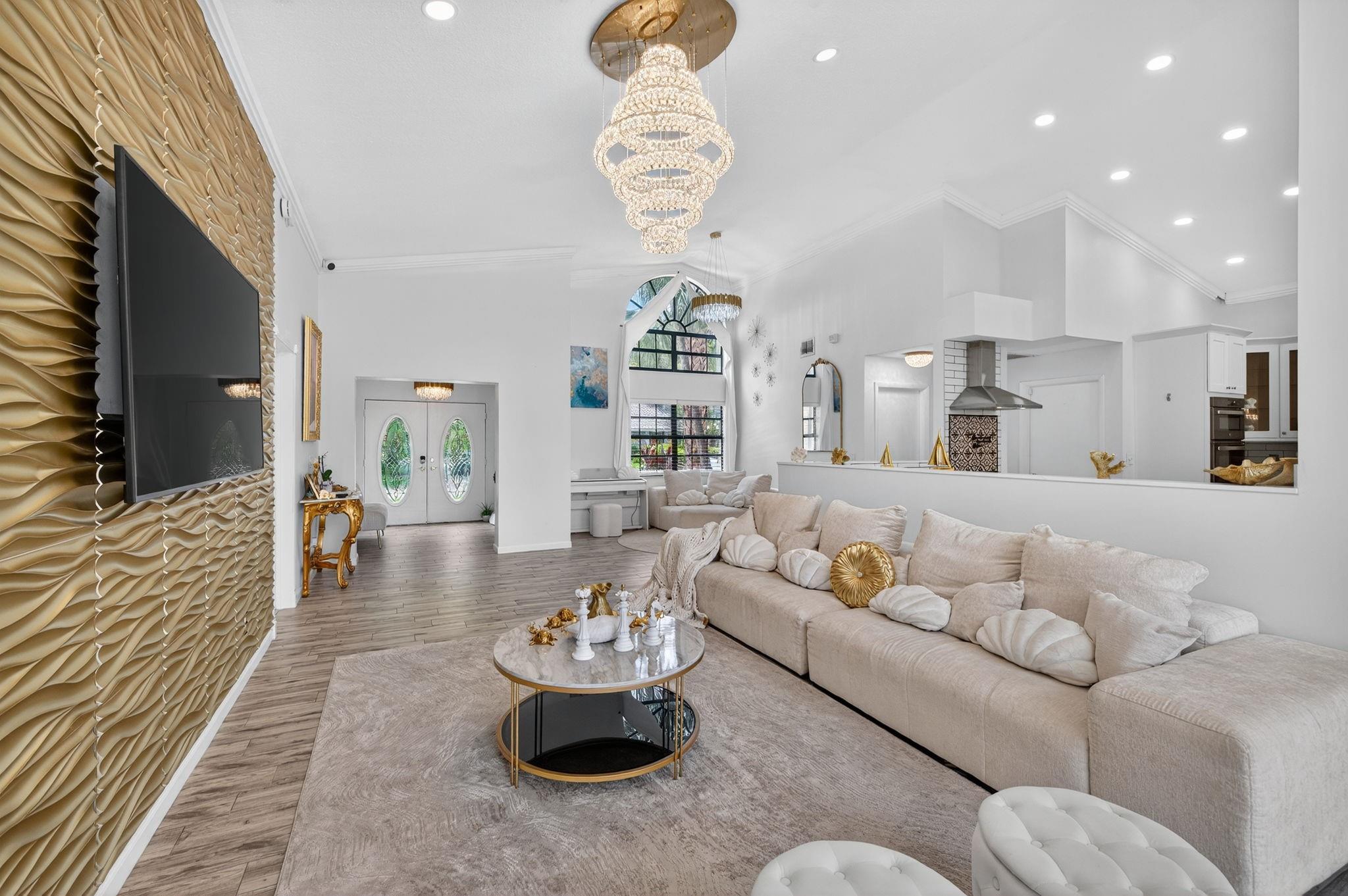 Desirable OAK KNOLL ESTATES! Lakeside living at its finest in this stunning 4 BR, 2 BA, 2-car garage split BR pool home, perfectly positioned for breathtaking sunset views over the water. Thoughtfully designed with elegance & comfort, it features a newly renovated all-white chef's kitchen with high-end appliances, custom cabinetry & gleaming countertops. Soaring 15 ft ceilings & modern LED lighting create an airy, sophisticated ambiance. 25k in real crystal lighting. The open concept flows to an outdoor oasis—sparkling pool & serene lakefront setting. Whether entertaining or unwinding, every space offers beauty, tranquility & refined detail. Roof 2008, AC 2014,new washer/dryer & water heater.