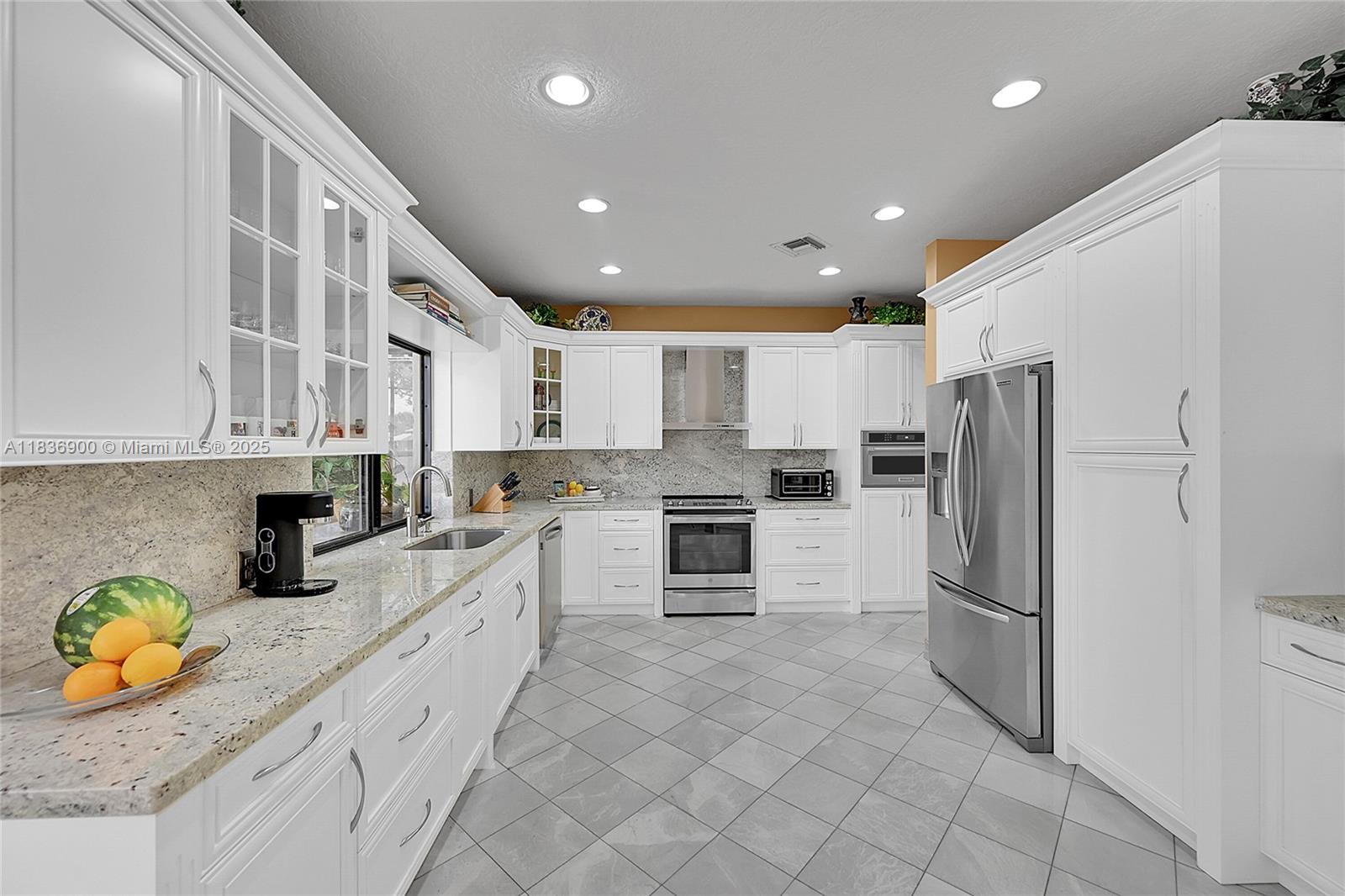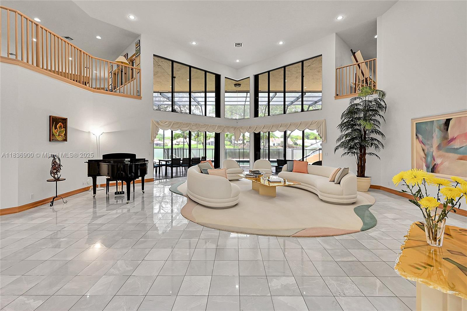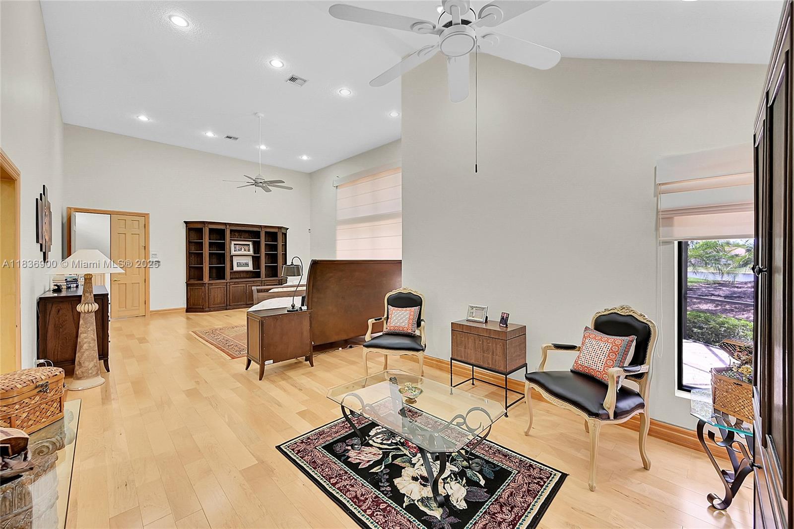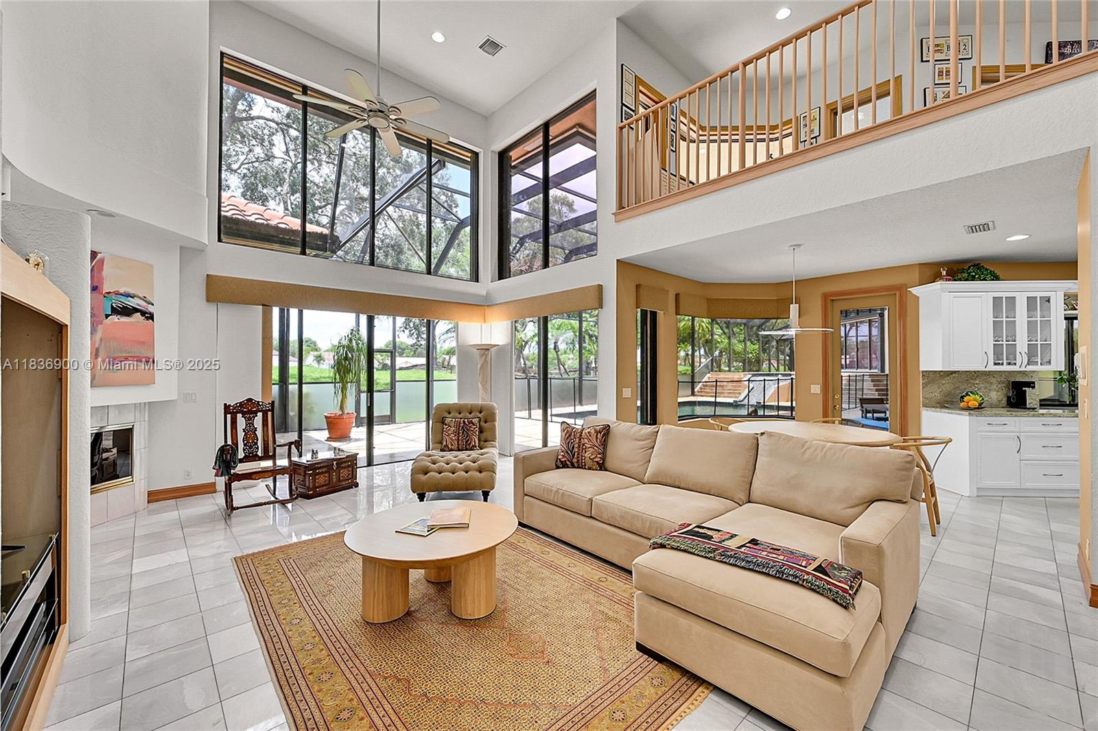 Custom 5500sf builder’s home that starts with 16' of panoramic golf & lake views from the sprawling entry with 21' ceilings! 4 Ensuites (3 on the main floor), 2 lofts, office & library with 16’ shelves & sliding ladder—the owner's favorite room! The white kitchen shines with full granite backsplash, stainless KitchenAid appliances, and endless storage that flows into a family room with fireplace, wet bar, & built-ins. Hardwood and marble floors, central vac, and plantation shutters throughout. Custom built closets! The owner’s wing is a retreat with a exercise and sitting room. Outdoors: travertine honed patio, outdoor cabinets for KT pass thru, tile-slide pool, privacy screen, and underground pool cleaning system. Elevated porch swing for amazing sunsets! Culdesac location feels private!