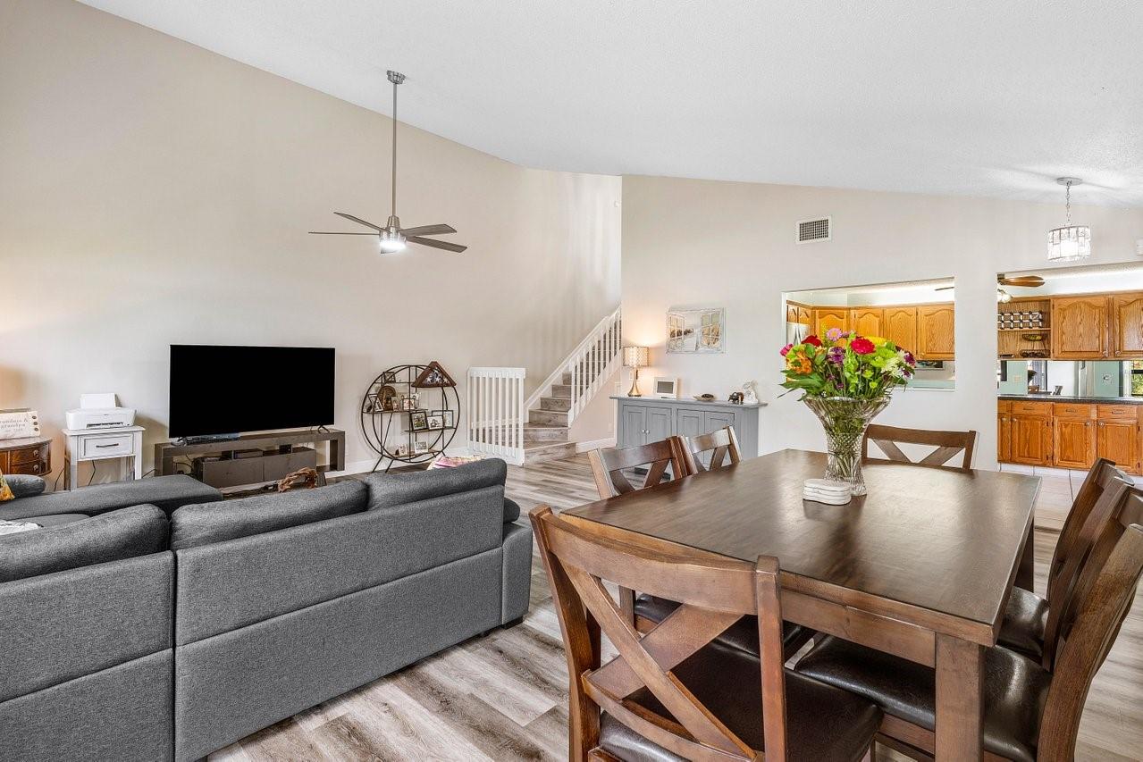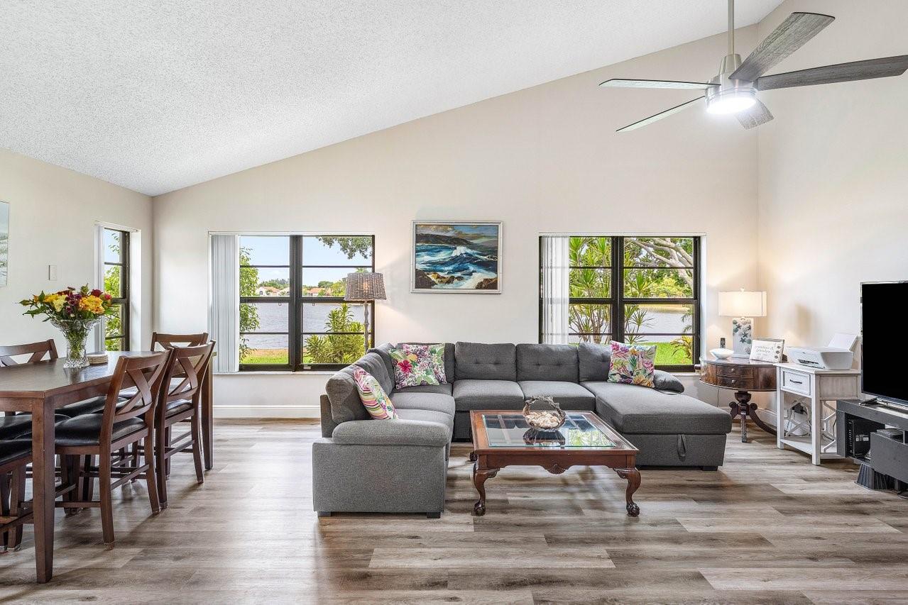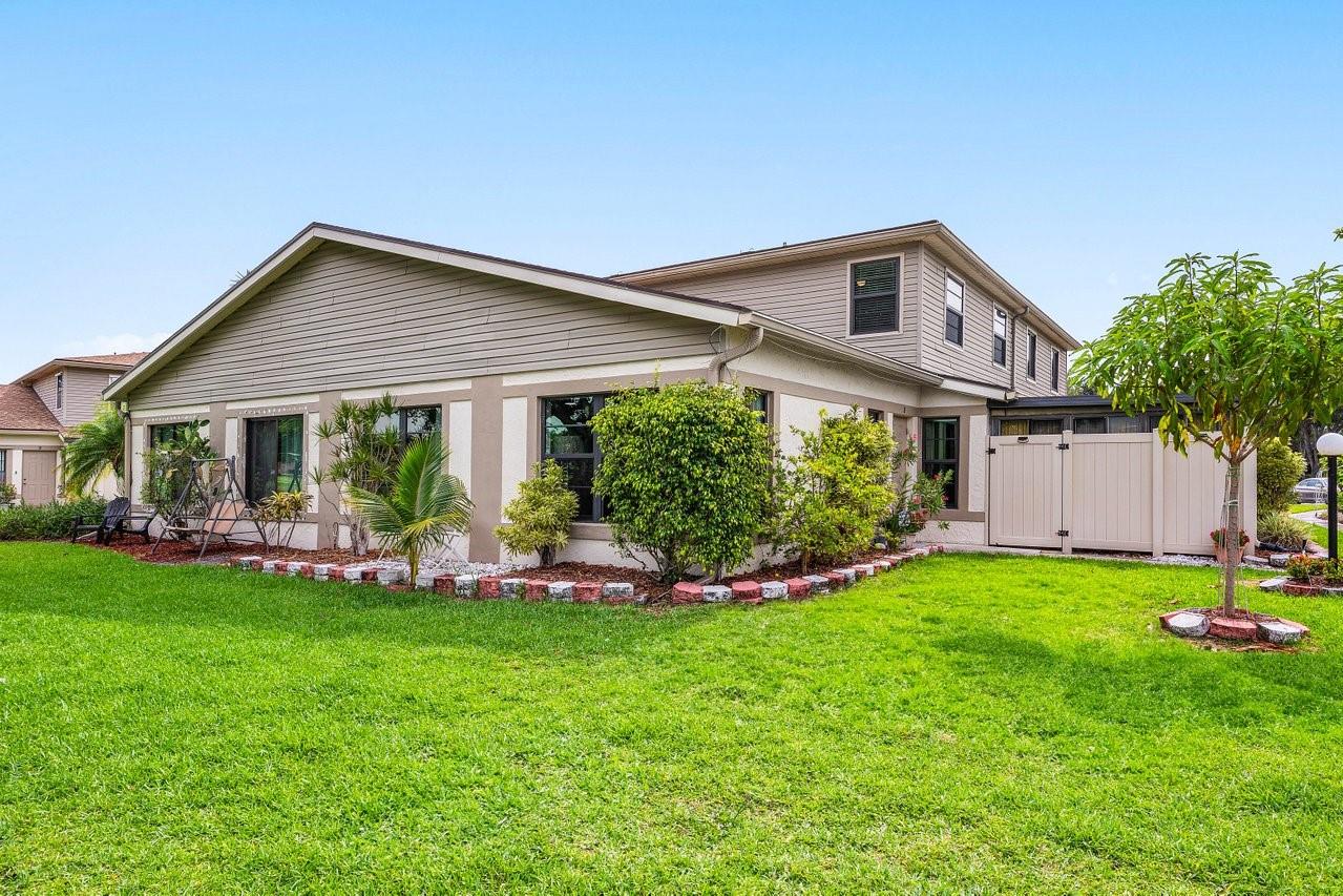 Exceptionally well kept, two-story townhome, 3-bedroom, 2.5-bathroom located in the desirable Lakeside Green community. This townhome offers a spacious open-concept layout with soaring vaulted ceilings & updated hurricane impact windows throughout. The main living & dining areas flow effortlessly into a enclosed lanai. The first-floor primary suite features a large walk-in closet, ensuite bath, and private sliding doors leading to lanai. Recent updates; tankless water heater(2024), new A/C unit(2022), roof replacement(2023), fresh interior paint & newer flooring. Enjoy resort-style amenities including two community pools, a clubhouse, fitness center, game room, tennis & badminton courts, playground, & scenic walking/bike trails. The HOA covers cable, exterior maintenance, & landscaping.