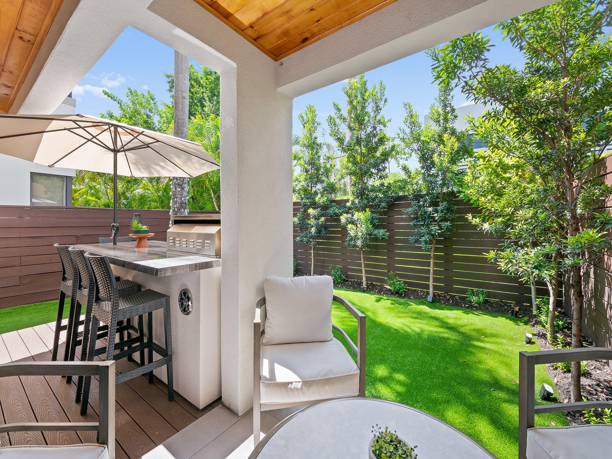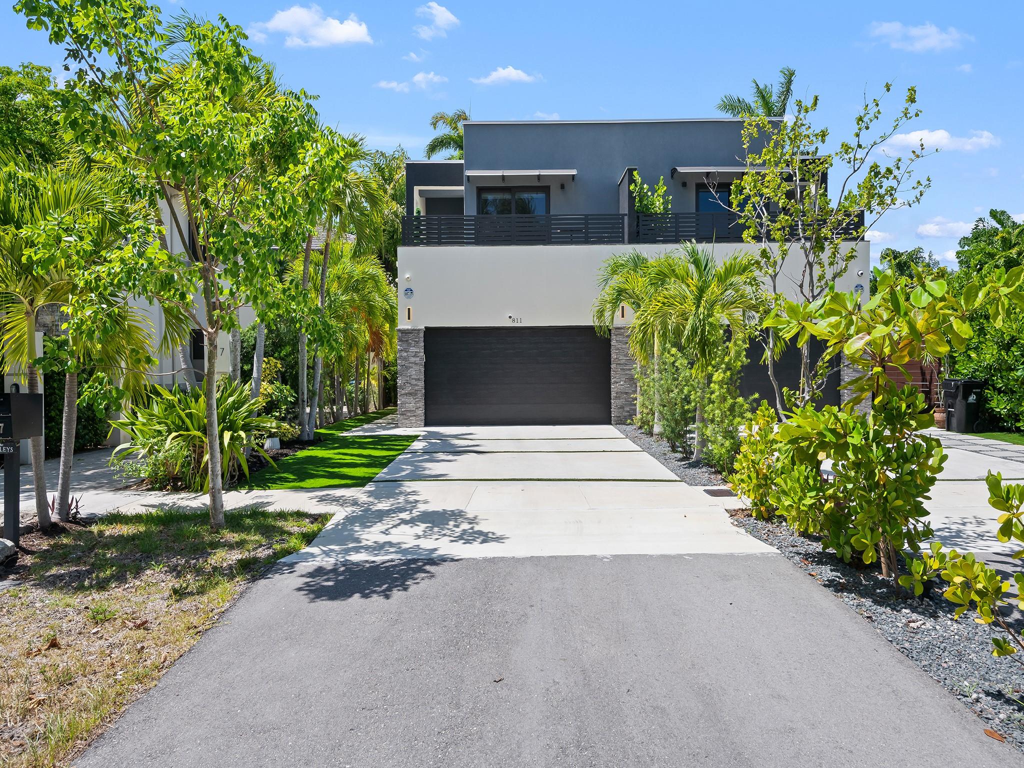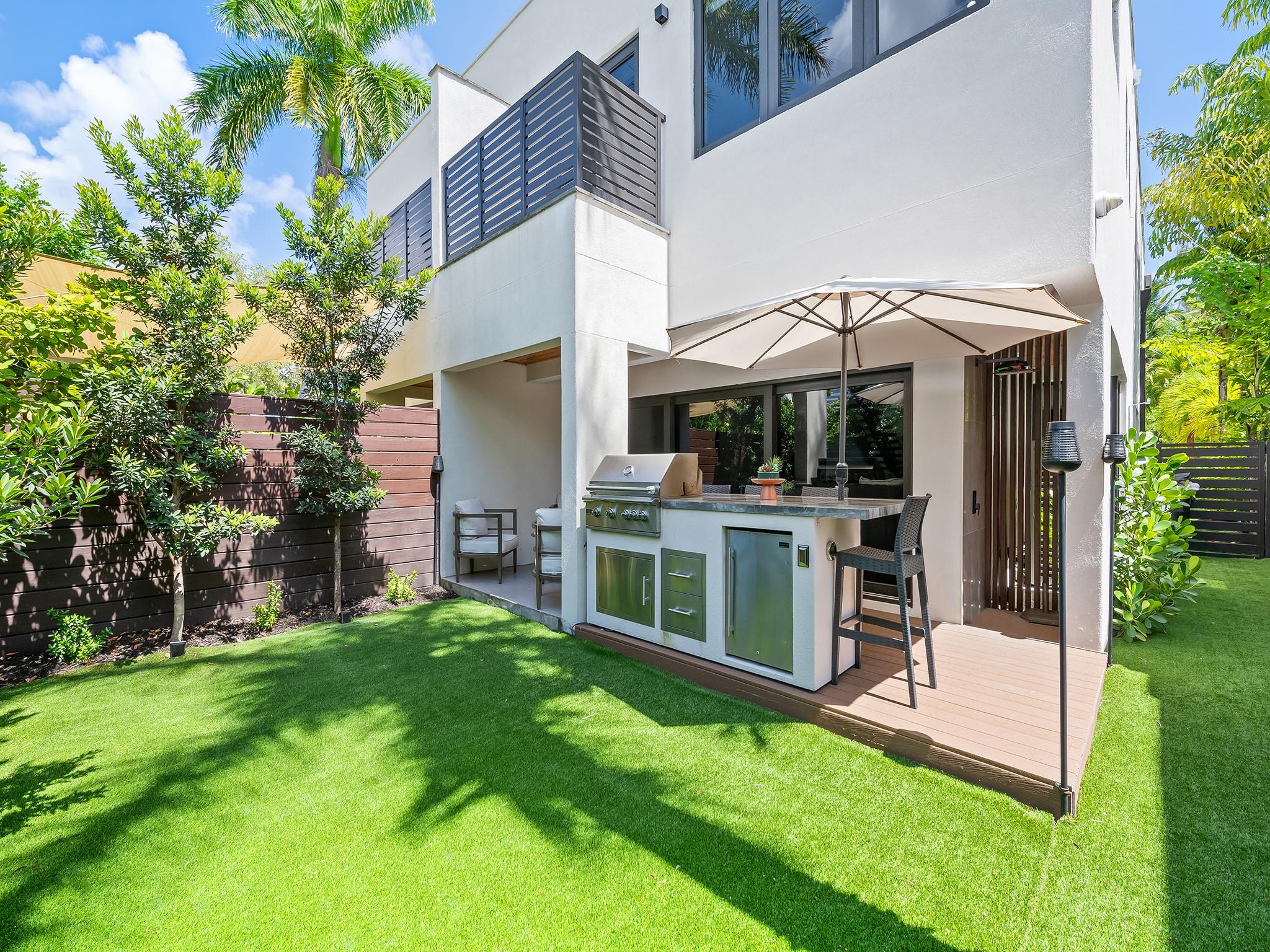 Tucked away at the confluence of 10th Street & the Tarpon River, this exquisite 3/2.5 townhome, completed in 2023 offers contemporary luxury & timeless design. NO HOA FEES. Situated in a serene neighborhood less than a mile from the heart of downtown Ft Lauderdale & iconic Las Olas Boulevard, this Fee Simple residence is a true gem. Soaring ceilings & vaulted kitchen windows reveal mature foliage & bathe the open-concept living space in natural light, highlighting custom cabinetry, refined architectural details, & sleek modern lines. Outside is perfect for entertaining with built-in summer kitchen island & artificial turf for easy maintenance. A spacious 2-car garage is complemented by additional parking for up to four vehicles, making this an exceptional offering in both form & function.