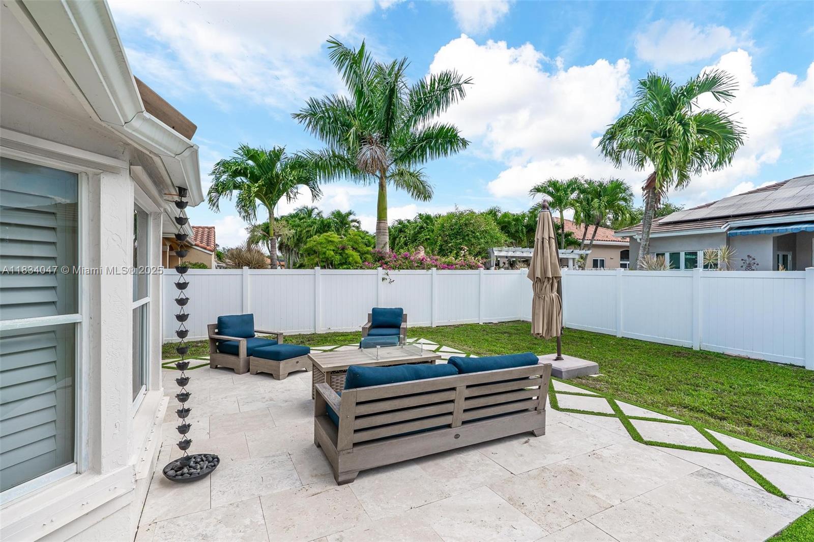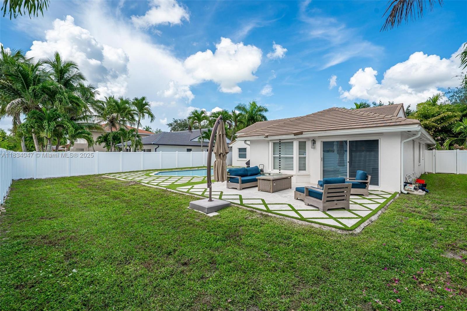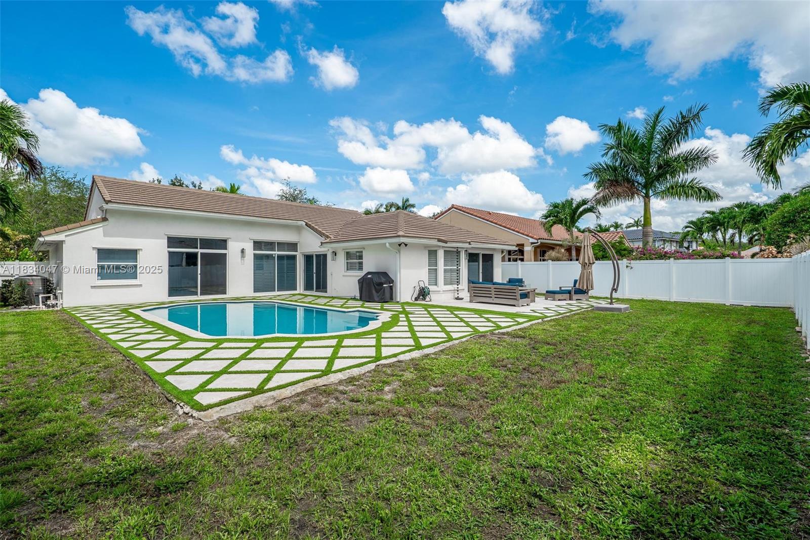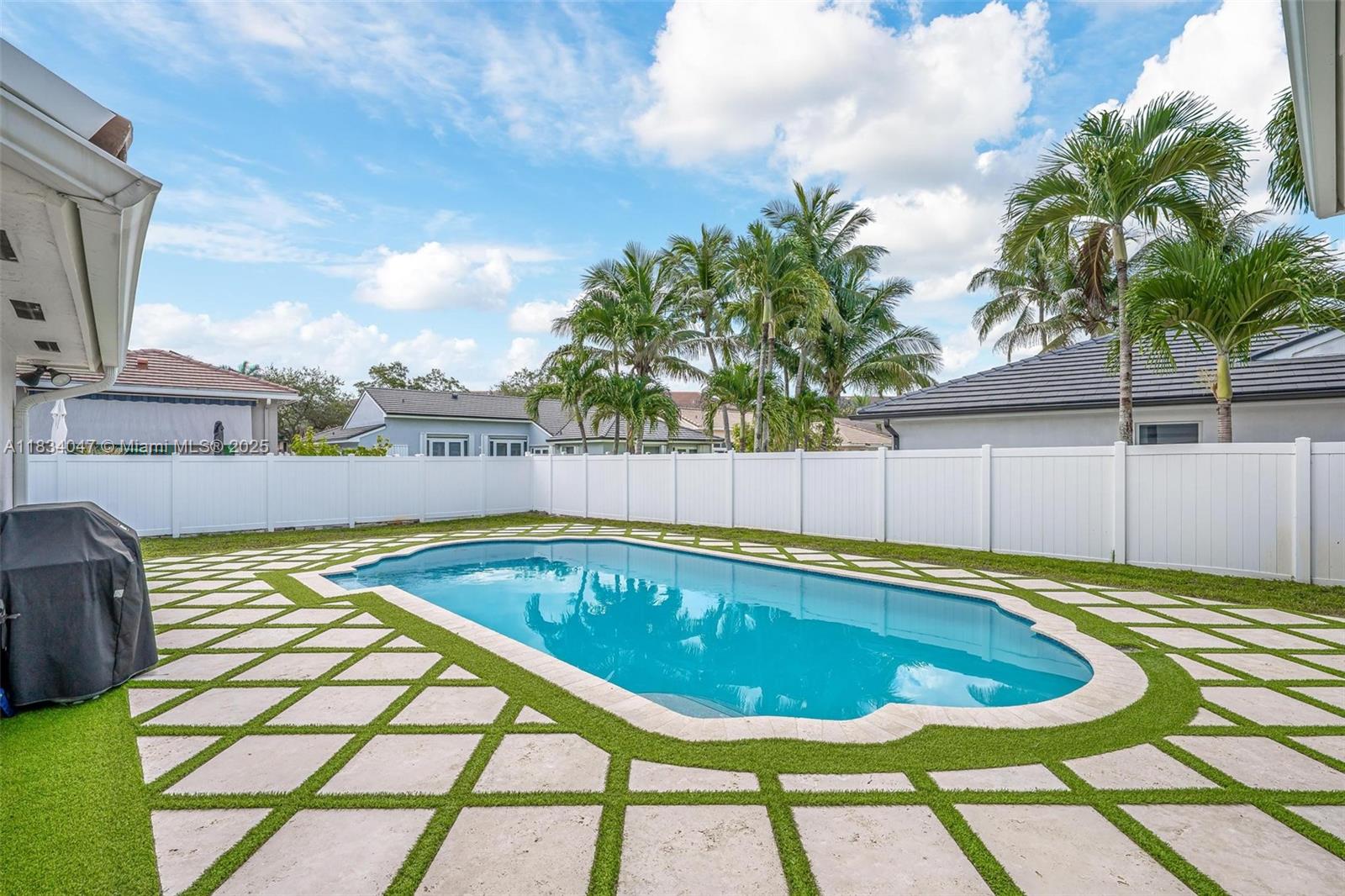 Standout 3-bedroom 2-bath pool home on an oversize lot, in the desirable Bristol Isle section of Huntington. The backyard is an entertainer's dream with a custom pool and diamond-design turf patio upgraded in 2022. The interior features a split-plan layout and vaulted ceilings allowing lots of light. Other highlights include a 2021 roof, freshly painted interior and exterior, plantation shutters, a PVC fence, a separate laundry room, and a large 2 car garage with additional storage area. Great walkable neighborhood with park and playground nearby. Conveniently located near top-rated schools, Memorial Hospital, Pembroke Gardens Mall, Miramar Regional Park, and I-75. Low HOA. Move quick on this one!