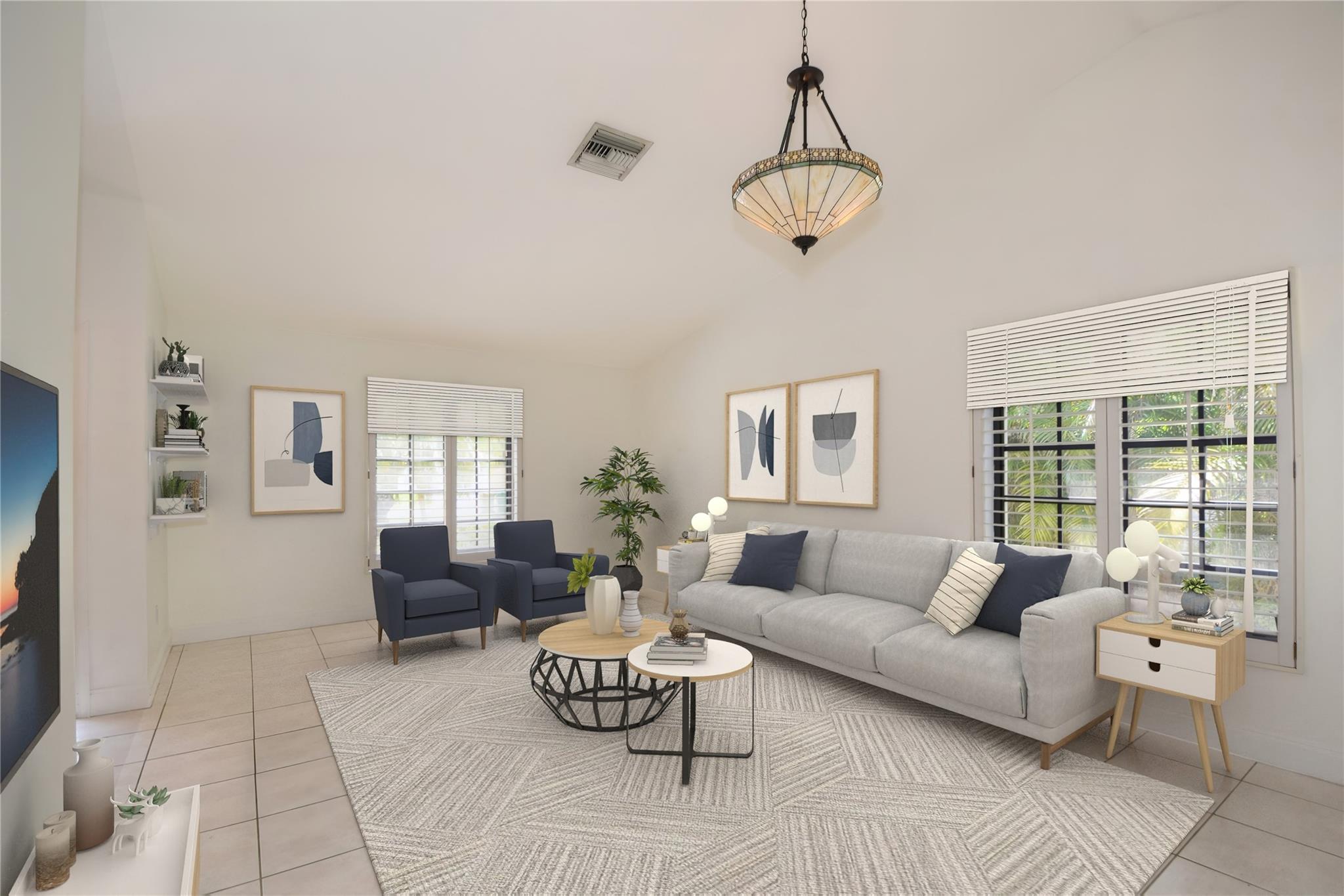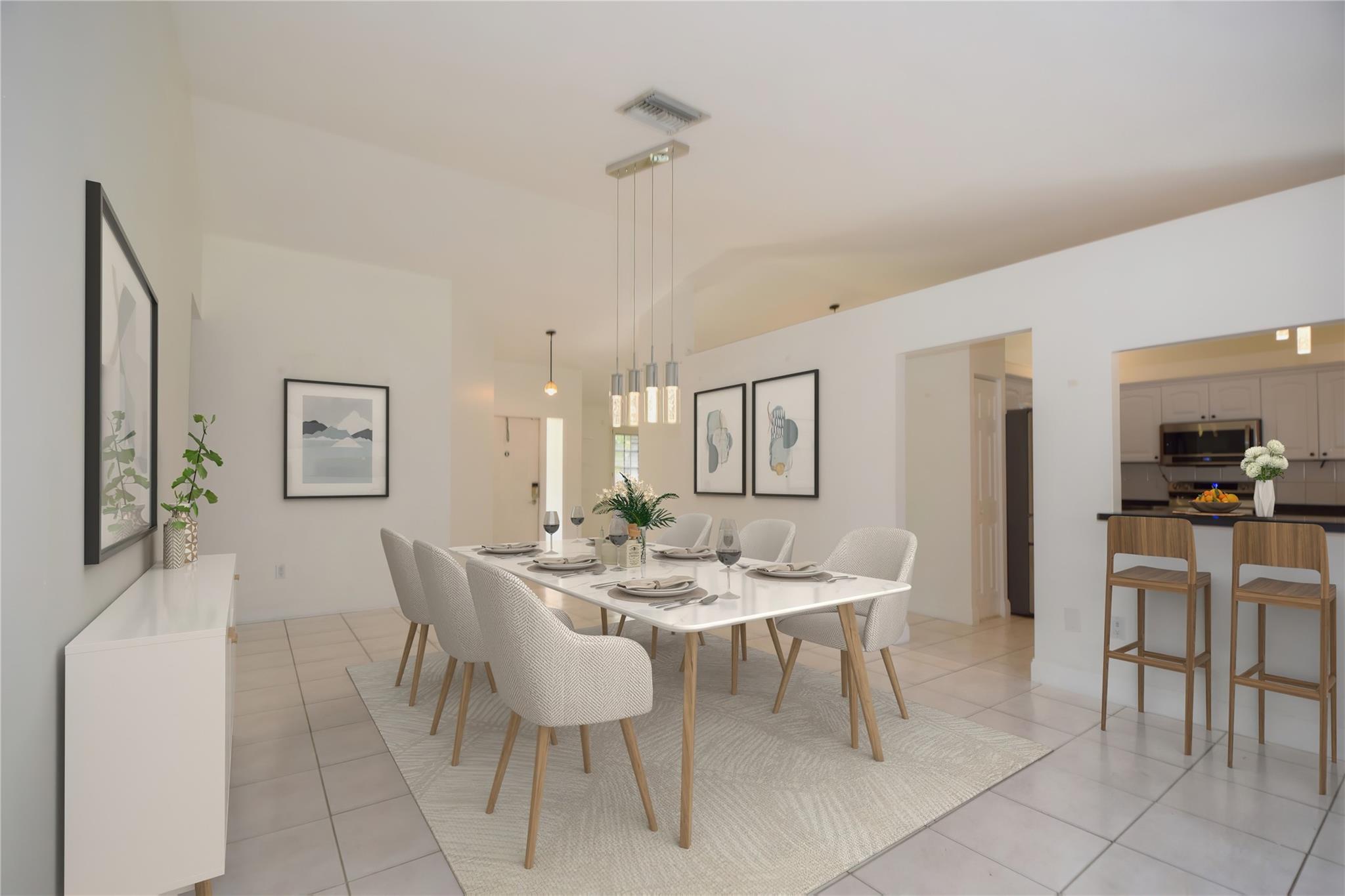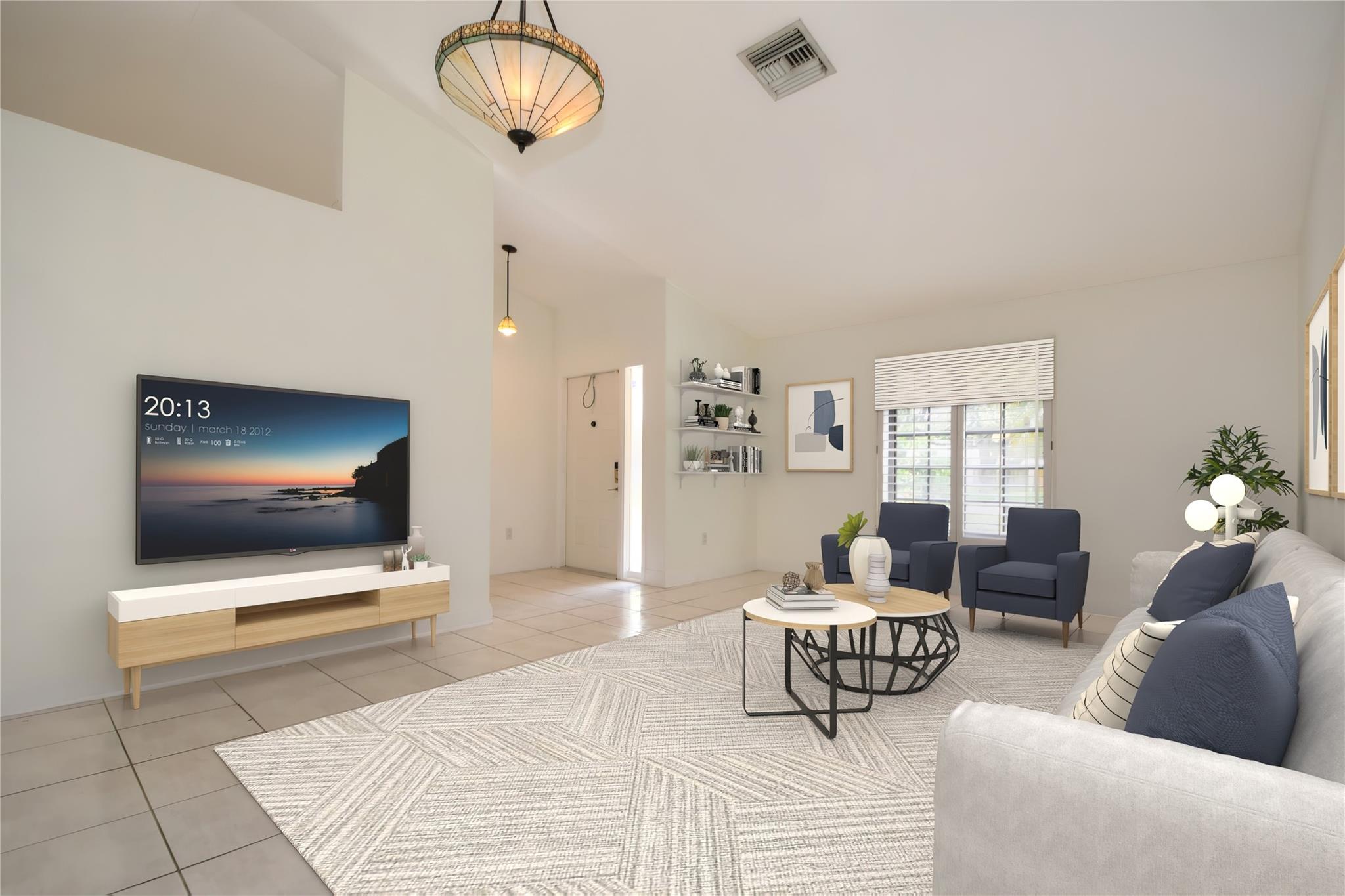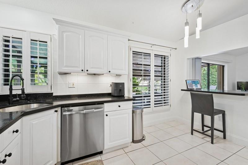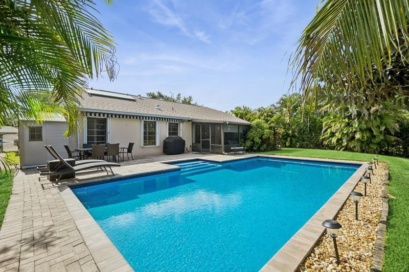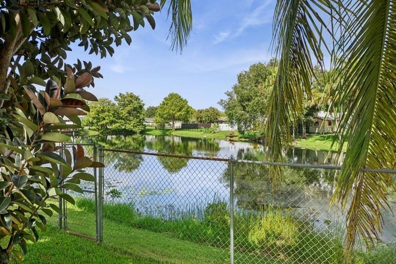Stunning 3 bed 2 bath home in desirable Orange Tree Lakes in Davie. Plantation shutters adorn all the windows in this spacious well-designed home w/cathedral ceilings in living and dining. Kitchen features newer Samsung appliances and breakfast bar. Primary suite features bath with dual sinks, tub shower, and walk-in closet. The second and third bedroom are good sized with good closet space. Guest bath. Full sized Maytag Washer and Dryer included. Spacious screened room off dining room leads to large sparkling saltwater pool with pavers and gate to access lake. Lovely awning, outdoor lights and shed complete the spacious back yard. Includes 2-car garage with some shelving and solar water heater. No HOA, You may park your RV and/or boat. Excellent school system. Lake water feeds sprinkler.