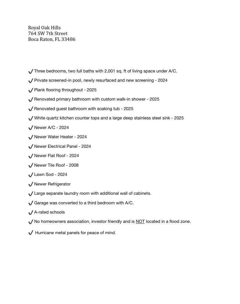 Amazing pool home, nestled in the highly desirable Royal Oak Hills community in East Boca Raton! This stylish 3-bedroom, 2-bathroom house features an open-concept floor-plan with newer plank flooring throughout. Step through double french doors into your private tropical backyard oasis, complete with a newly remodeled screened-in pool, perfect for relaxing or entertaining year-round and a fenced-in yard. NEWER: remodeled bathrooms, white quartz kitchen countertops, large deep sink, flat roof, a/c, w/h and electrical panel, for peace of mind. A spacious laundry room with an additional wall of storage. Garage was converted to a 3rd bedroom w/ac mini-split. Great location, A-rated schools, walk/bike to vibrant downtown Boca Raton, just over 1 mile to the beach.