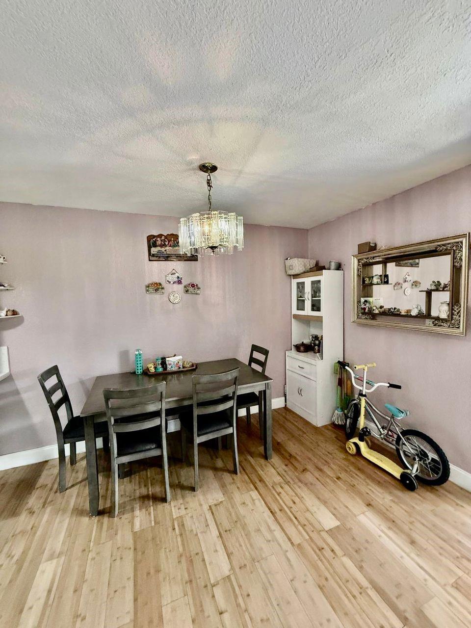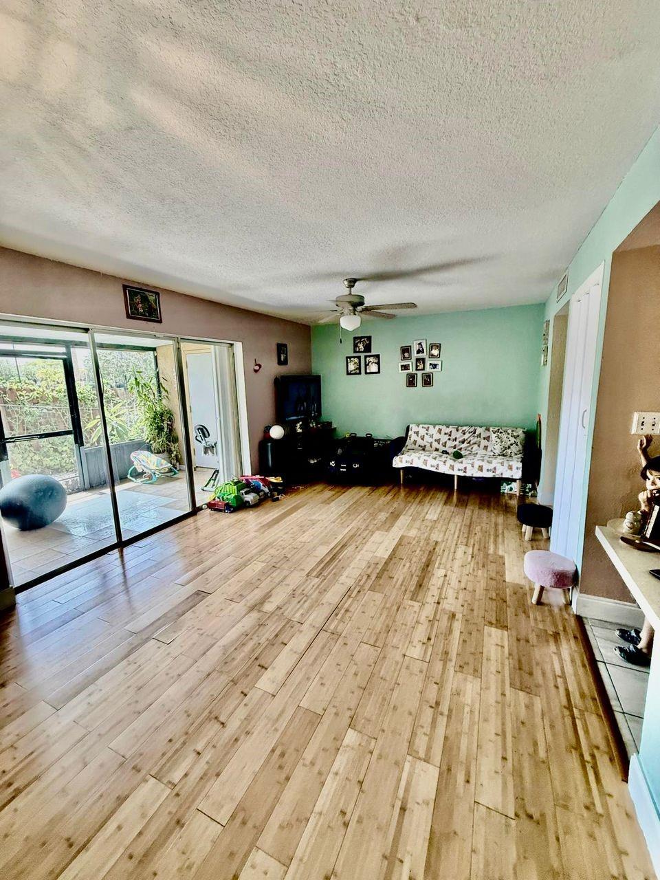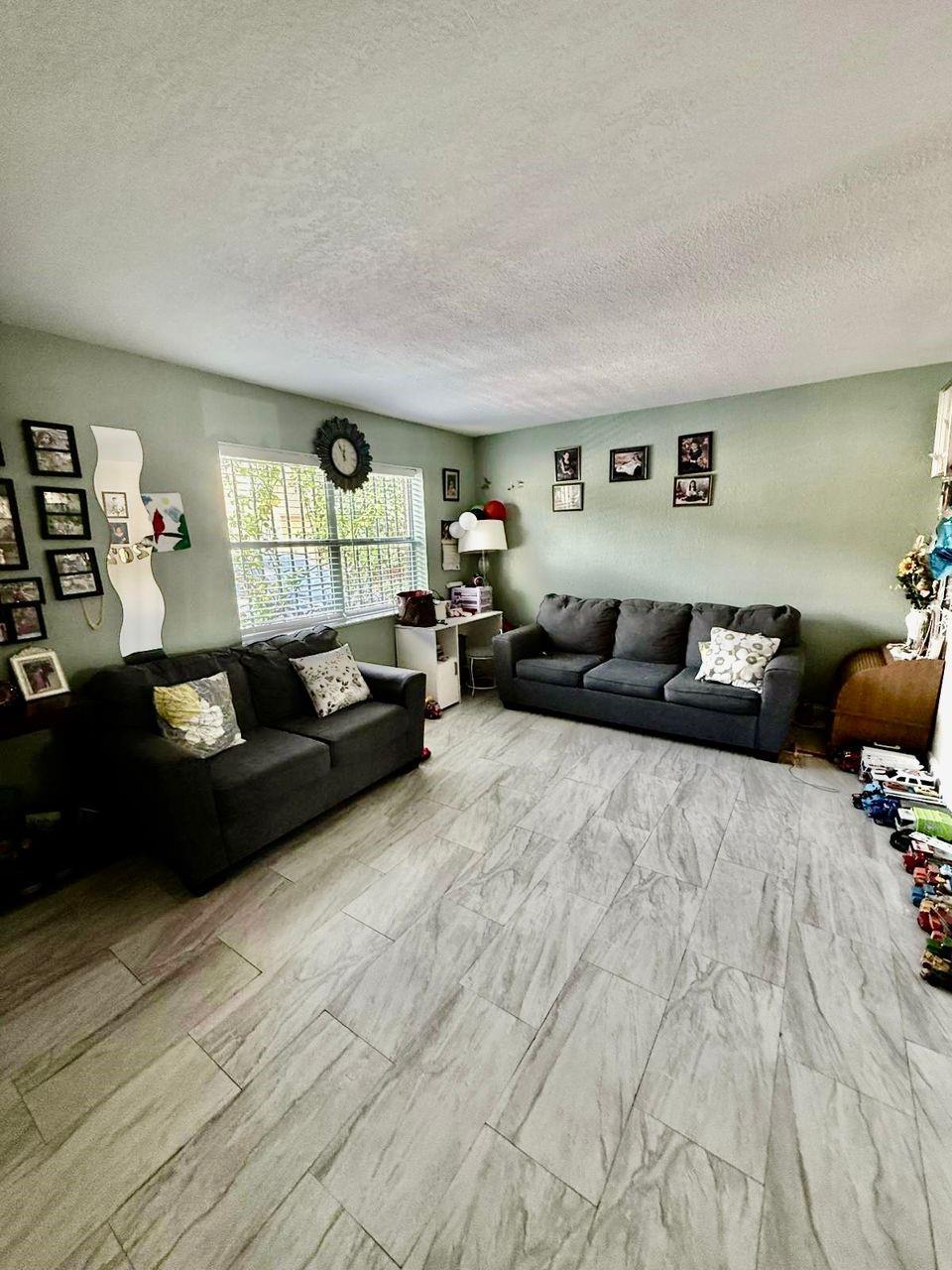 Spacious 3-bedroom, 2.5-bath two-story condo offering 1,428 sq ft of interior living space. The first level features a bright living and dining area, tile flooring, and a kitchen with updated countertops, cabinetry, and an extended serving bar. A half bath and laundry room are also located downstairs. Upstairs includes three bedrooms with wood-style flooring and two full bathrooms, including a tub/shower combo. The primary suite offers generous space and closet storage. Enjoy a screened-in patio and fully fenced garden area with outdoor access. Assigned parking included. Centrally located near schools, major roads, and shopping centers.