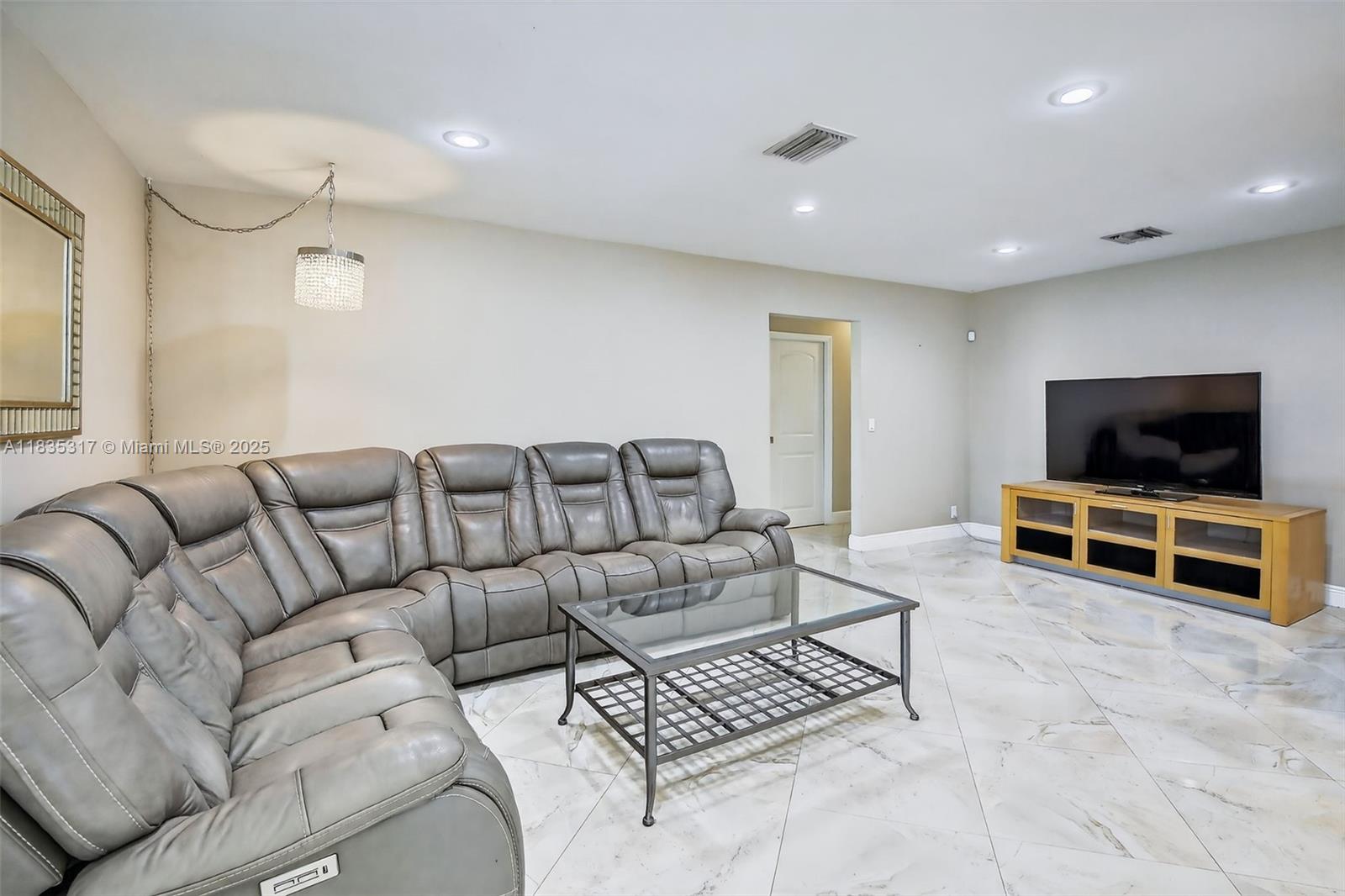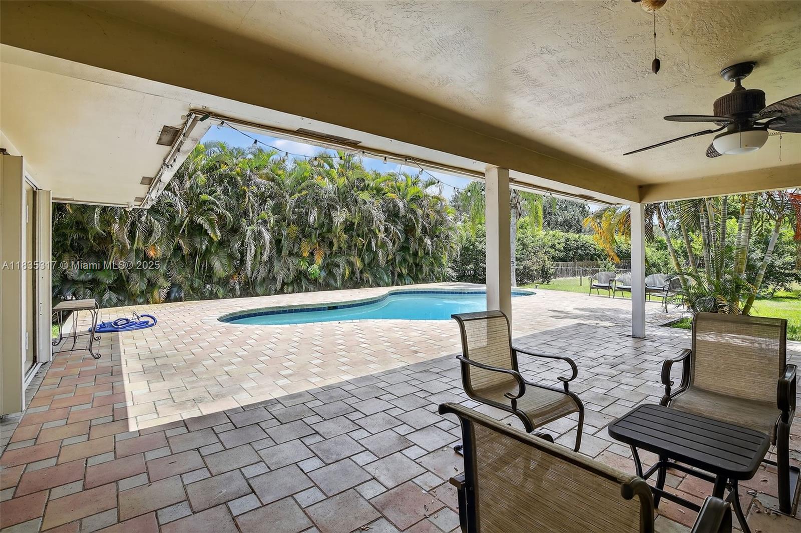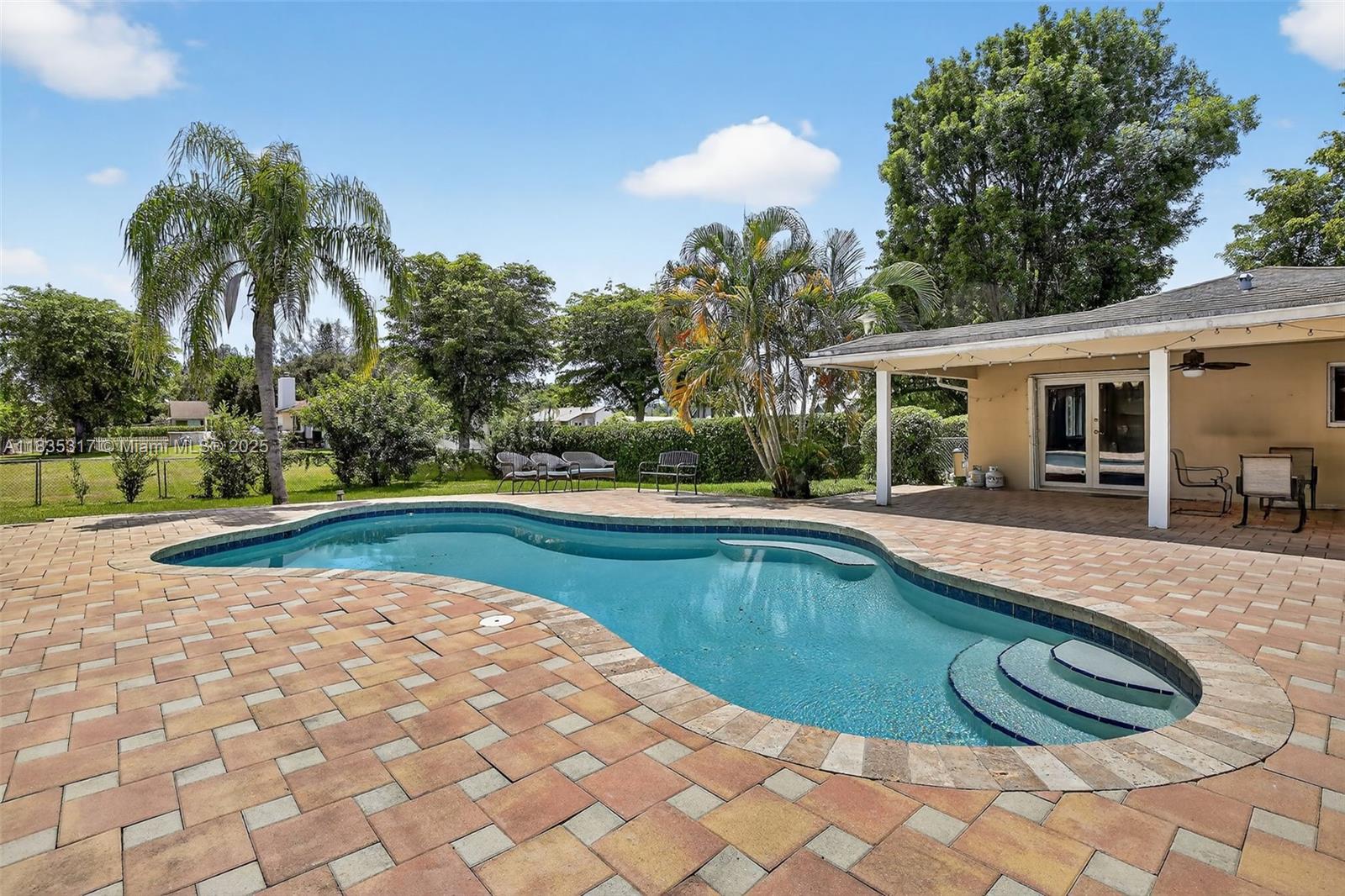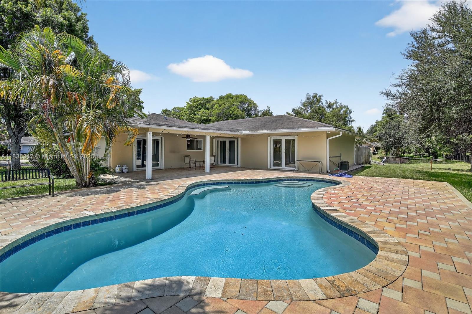 This great pool home in Davie is situated on a builder's acre in a private cul-de-sac. It features 3 bedrooms and 2 full bathrooms, a master bath with a frameless shower and a walk-in closet. This home offers porcelain tile flooring throughout. The updated kitchen boasts quartz countertops, a breakfast bar, and stainless steel appliances, and it seamlessly opens to both the living room and the family room. The spacious backyard includes a large stone paver deck and a covered patio surrounding a newly refinished free-form pool, all within a fully fenced yard. For added safety, the home is equipped with hurricane protection for all windows and doors. Conveniently located, this property is close to a variety of parks, dining, and entertainment options, and it lies within an A+ school district