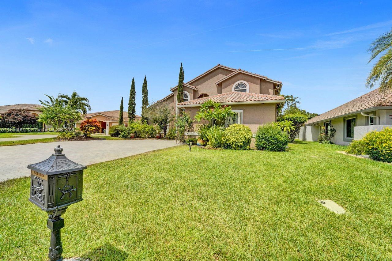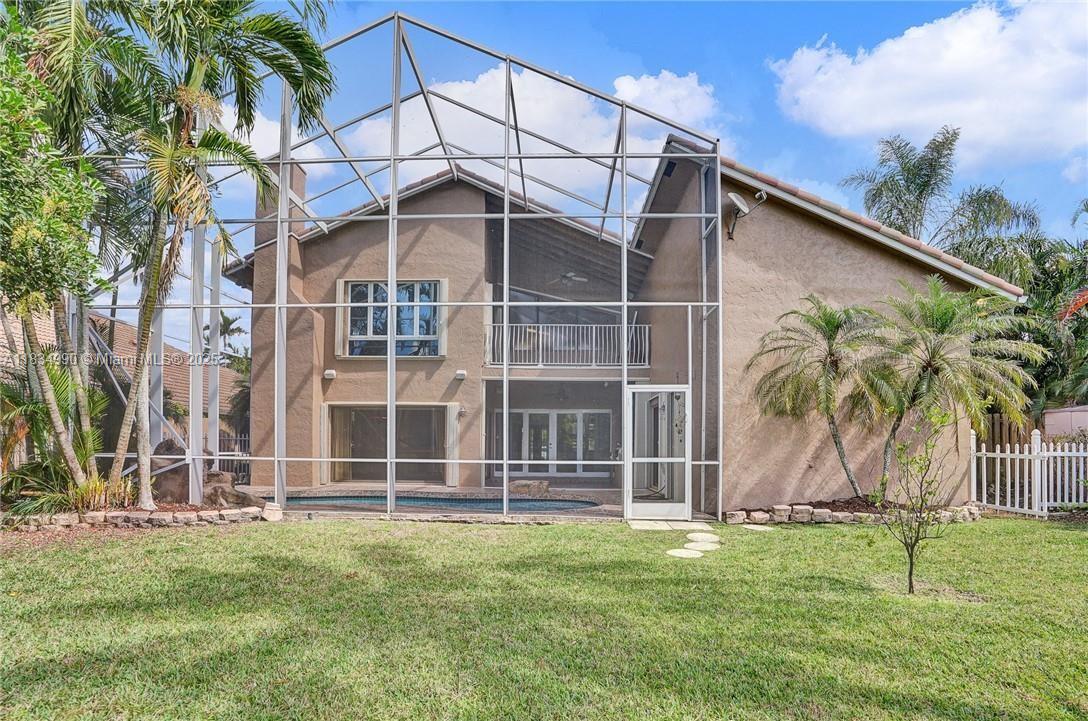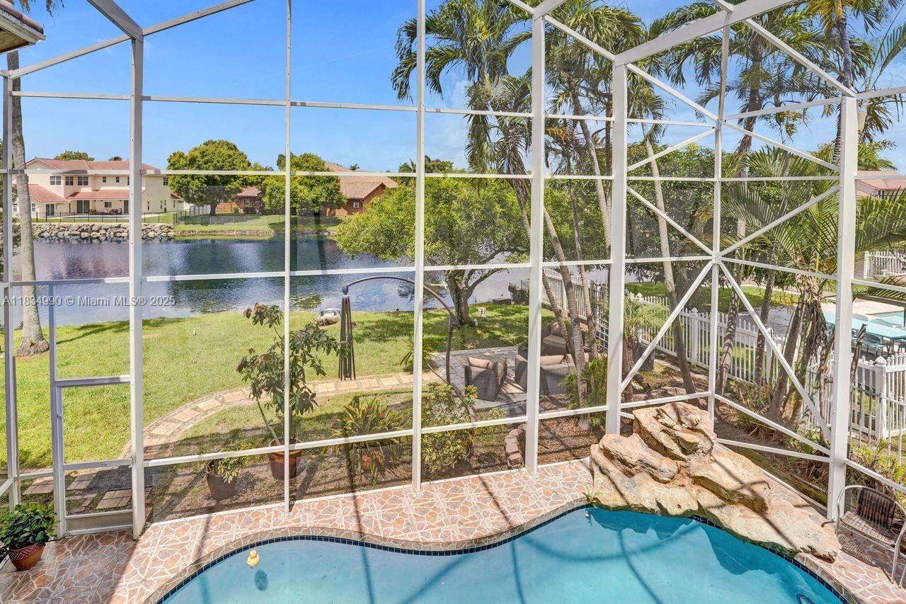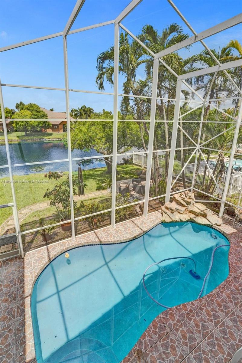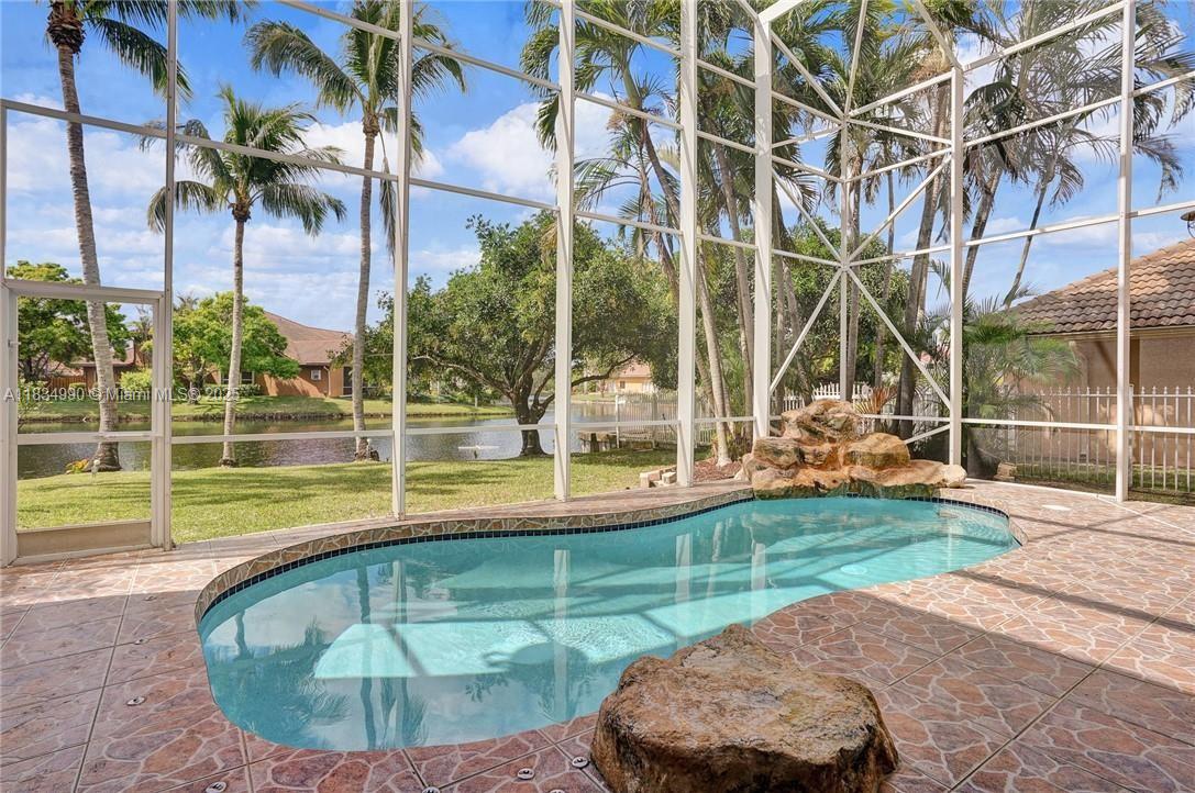 Tucked away on a quiet cul-de-sac in Jacaranda Cove, this stunning waterfront home offers a total of 3700 sq ft of elegant living on an expansive 11,200 sq ft lot. Featuring 5 bedrooms and 4.5 baths, including two spacious en suite master suites—one upstairs and one downstairs—this layout is ideal for multigenerational living. Enjoy soaring ceilings, abundant natural light, and open living areas. The main-level master opens to a screened patio with a 25-ft pool and waterfall. Highlights include some impact windows, accordion shutters, a newer A/C (2019), a loft, and an open and spacious kitchen with a granite island…Discover this rare gem before it's gone…