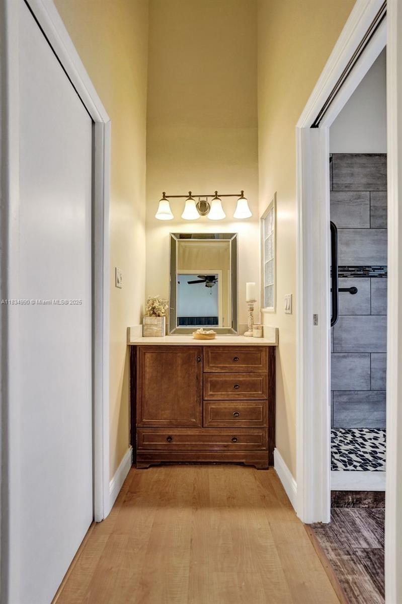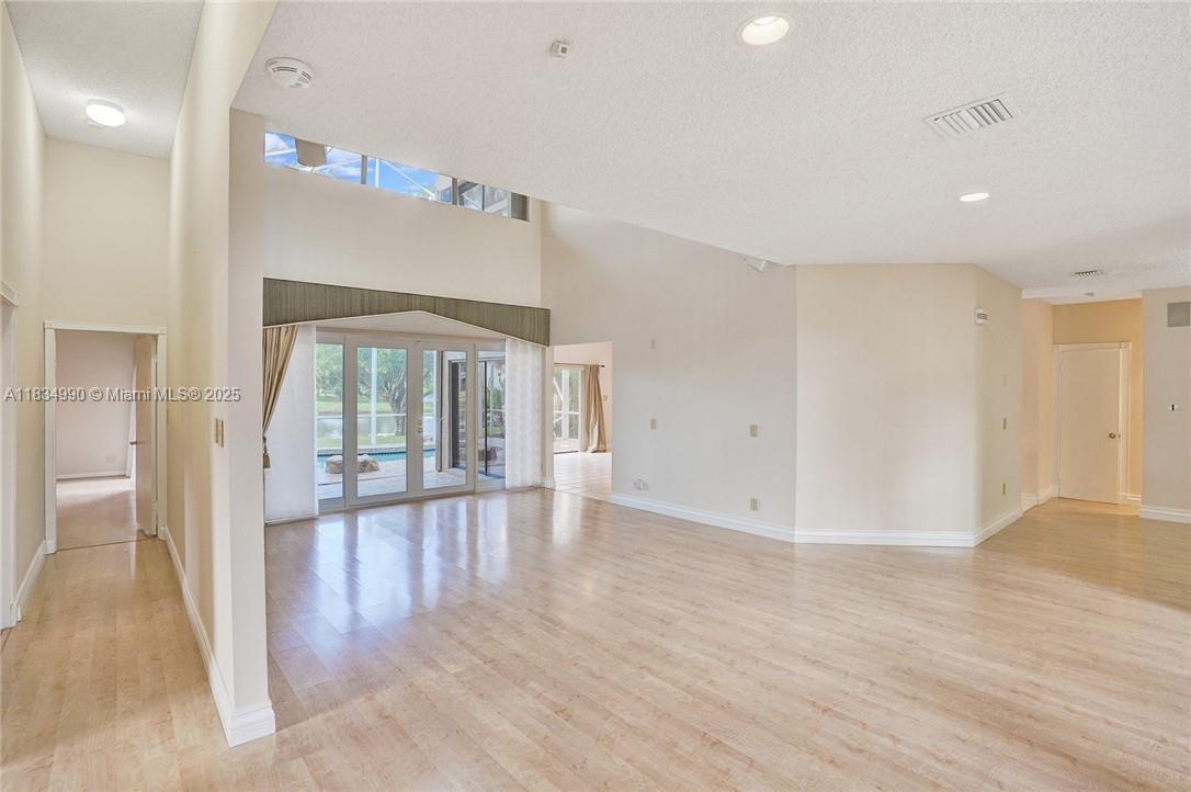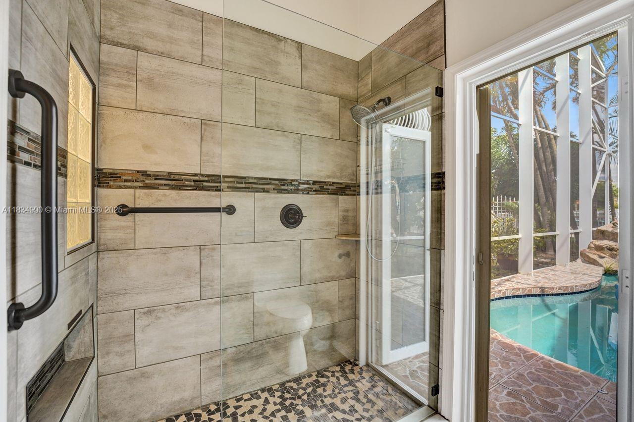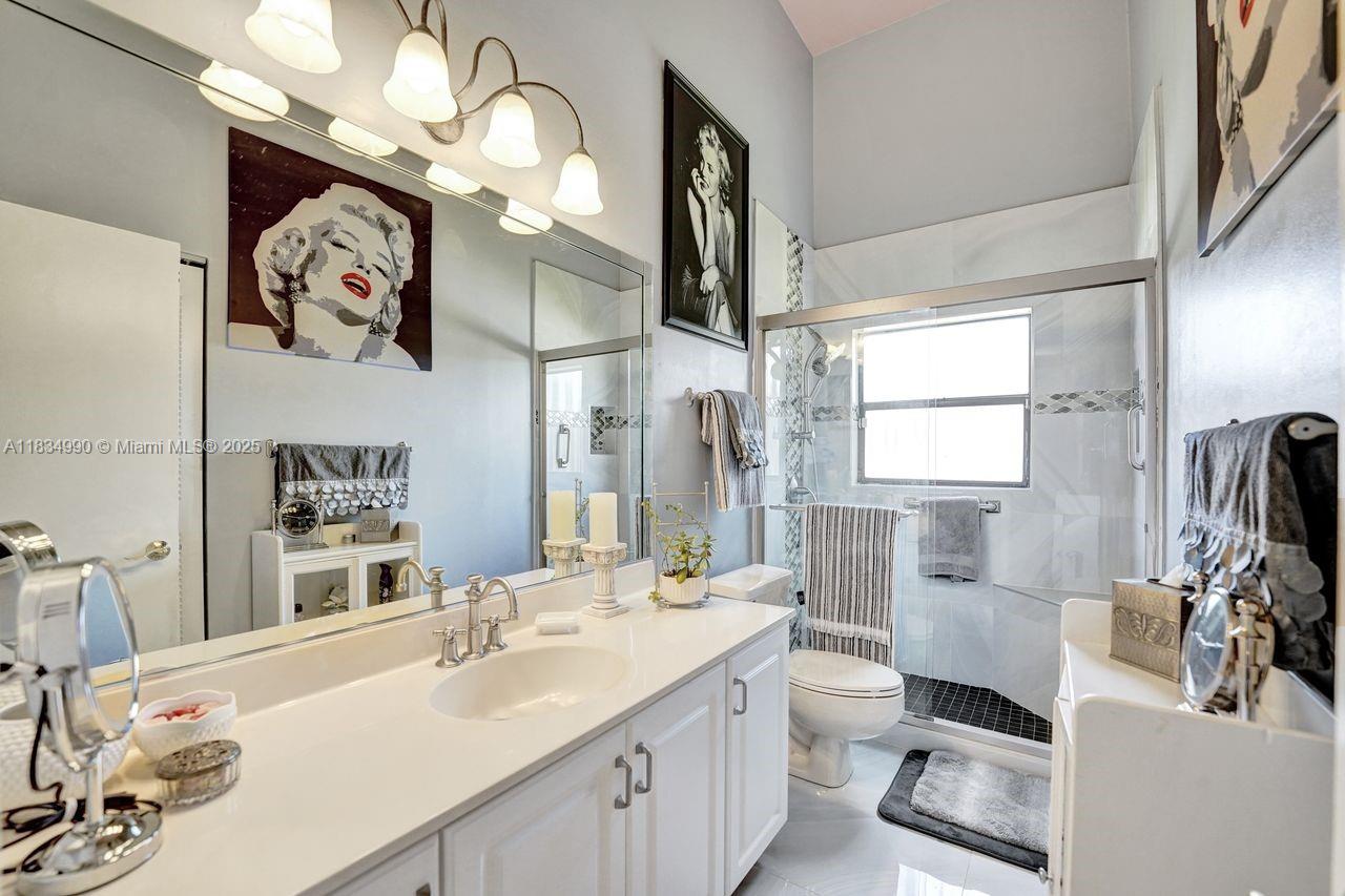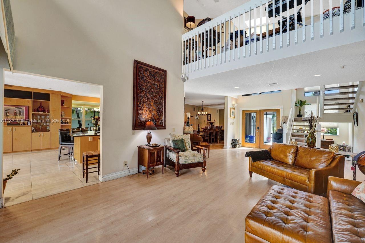 Tucked away on a quiet cul-de-sac in Jacaranda Cove, this stunning waterfront home offers a total of 3700 sq ft of elegant living on an expansive 11,200 sq ft lot. Featuring 5 bedrooms and 4.5 baths, including two spacious en suite master suites—one upstairs and one downstairs—this layout is ideal for multigenerational living. Enjoy soaring ceilings, abundant natural light, and open living areas. The main-level master opens to a screened patio with a 25-ft pool and waterfall. Highlights include some impact windows, accordion shutters, a newer A/C (2019), a loft, and an open and spacious kitchen with a granite island…Discover this rare gem before it's gone…